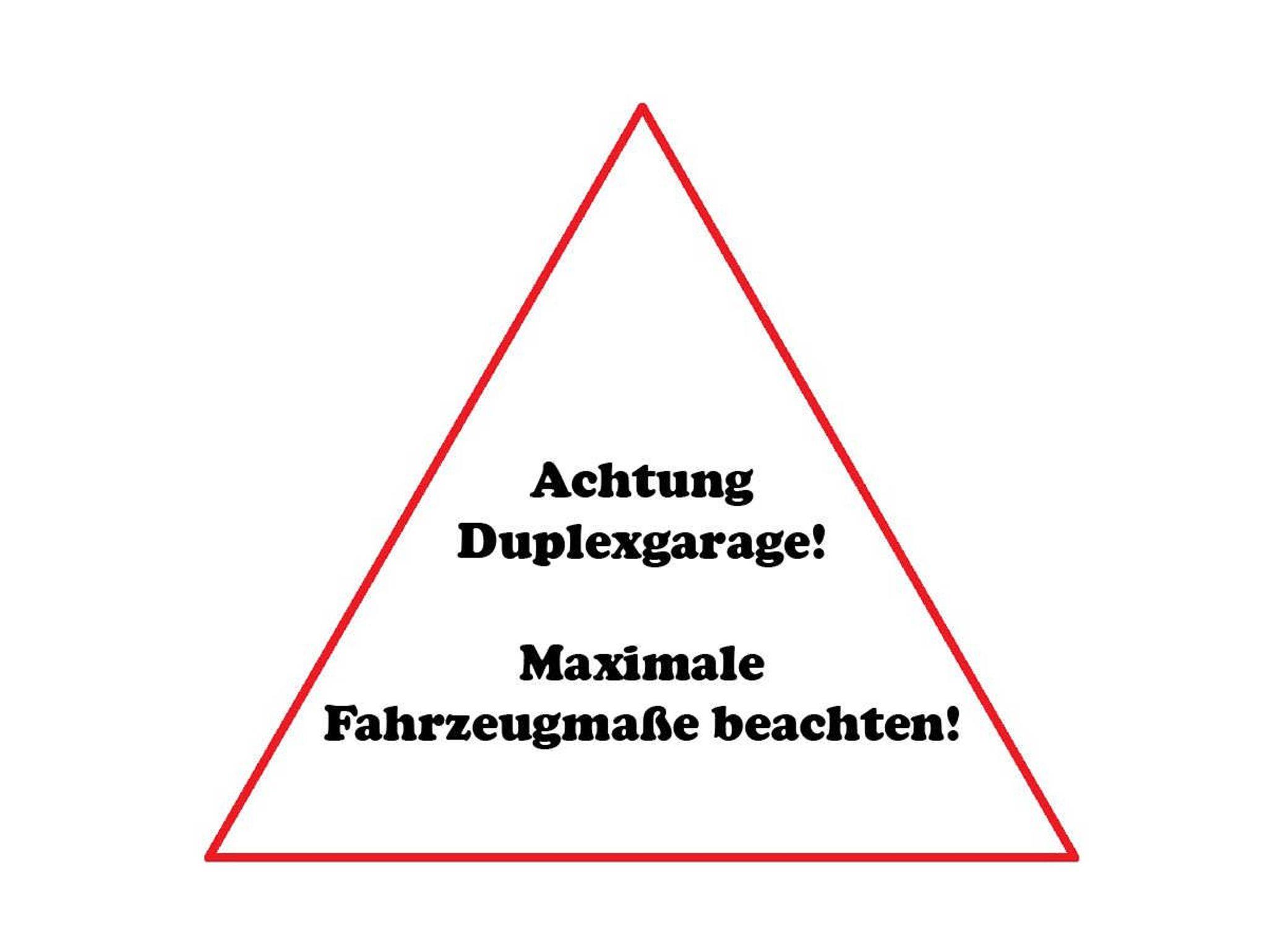 Es ist zu beachten, dass der zur Wohnung zugehörige Parkplatz eine Duplexgarage ist. Maximale Maße des Fahrzeuges wie folgt: Max. 1,50 m Autohöhe, max. 2 t Gewicht,max. Autolänge 5 m, Mindestbodenfreiheit vorne 22,2 cm, mitte 14,0 cm, hinten 27,5 cm.