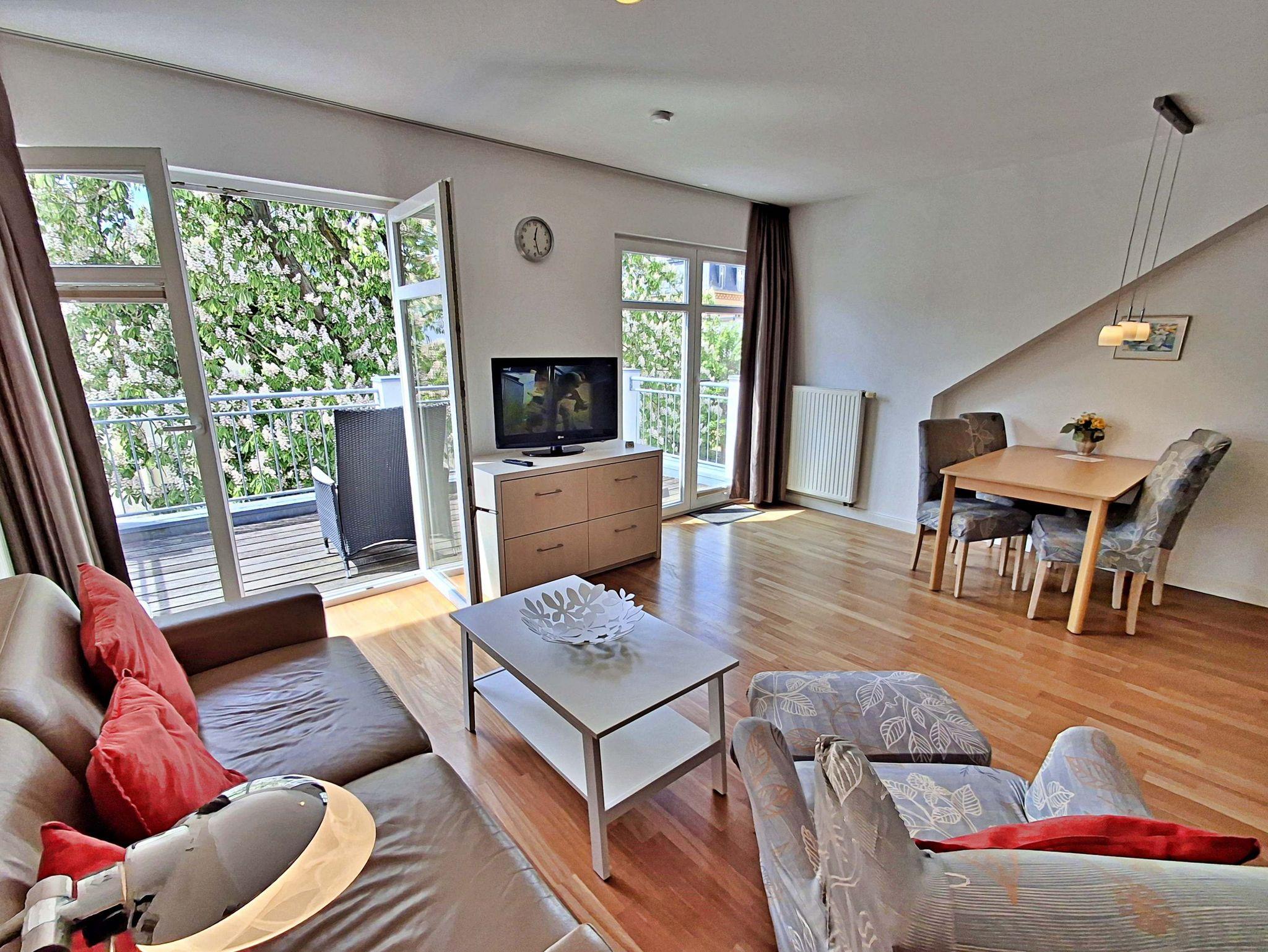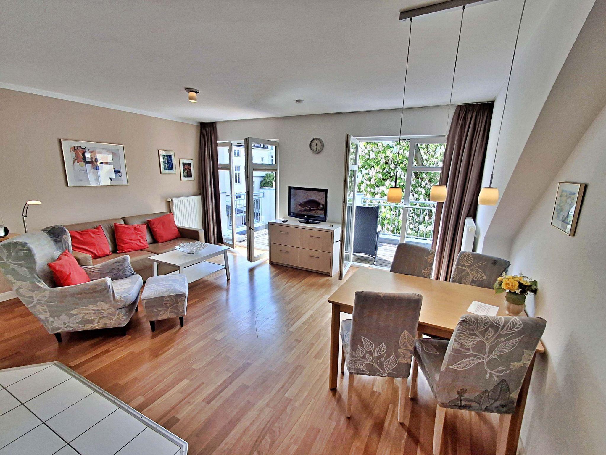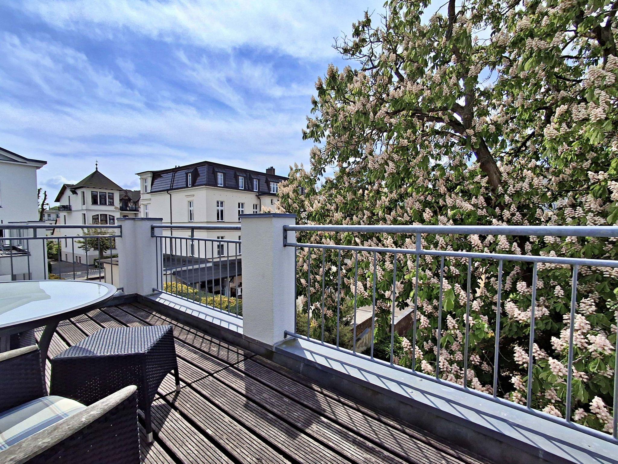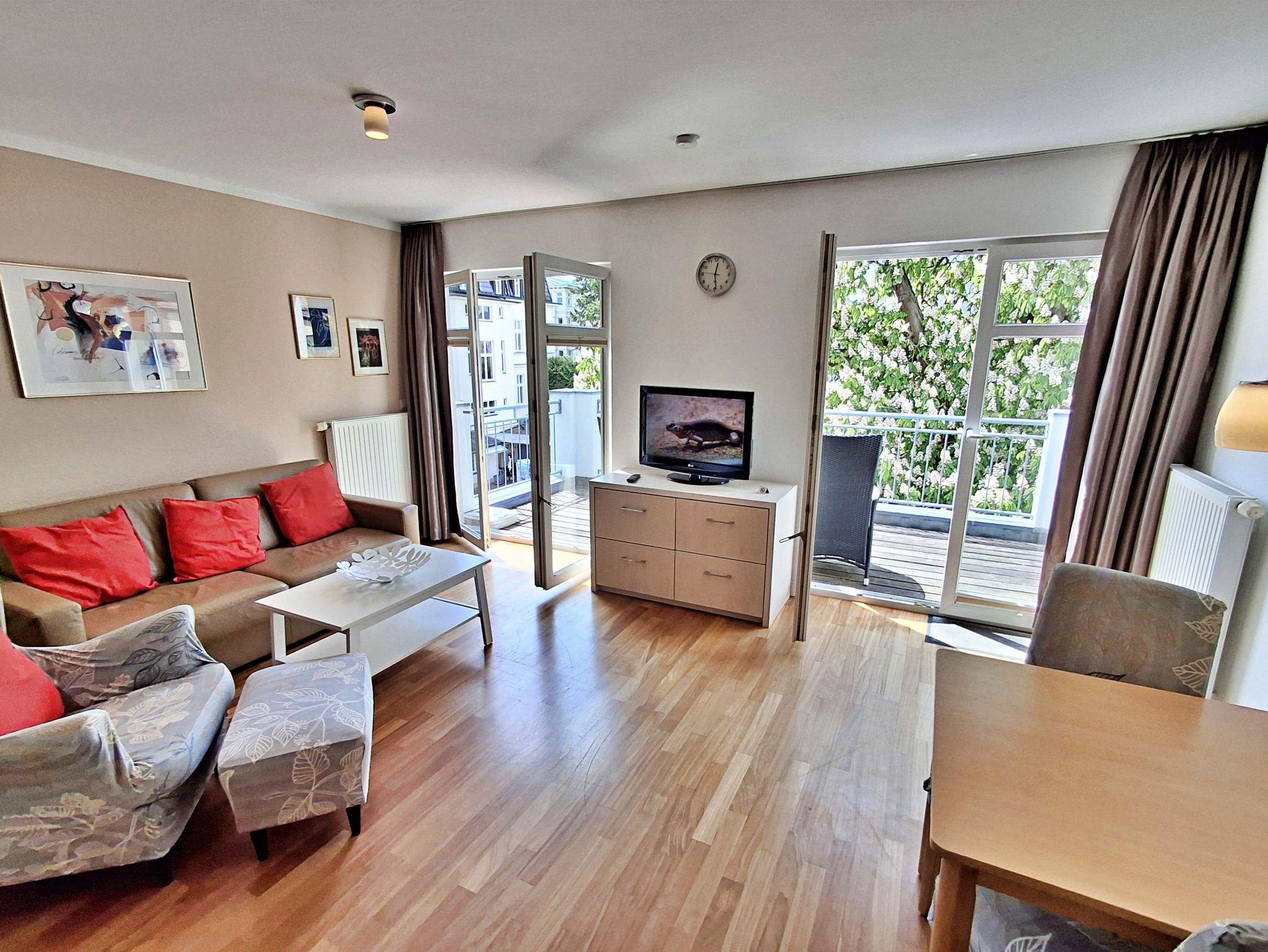 Die gemütliche 2-Zimmer-Wohnung Seeschwalbe im 3. Obergeschoss mit Balkon für max. 3 Erwachsene und 1 Kind bis 8 Jahre befindet im Nebengebäude der stilvoll restaurierten Villa Ahlbeck - nur wenige Schritte von der Promenade und dem Strand entfernt. Im Wohnbereich befinden sich neben der Couch auch ein Sessel mit passendem Fußhocker sowie ein Esstisch mit 4 Stühlen, der genügend Platz für 4 Personen bietet. Das Highlight der Wohnung ist der großzügige Balkon in West-Ausrichtung, wo Sie bei schönem Wetter bereits morgens Ihren Kaffee genießen oder den Abend bei einem Glas Wein ausklingen lassen können. Die moderne Küchenzeile mit Ceranherd, Backofen, Geschirrspüler, Mikrowelle, Kaffeemaschine, Wasserkocher und Toaster lässt keine Wünsche offen. Für die Unterhaltung sorgen ein Flachbild-TV, Radio-CD-Player und kostenfreies W-LAN. Das Schlafzimmer verfügt über ein Doppelbett und das Badezimmer hat DU/WC.
