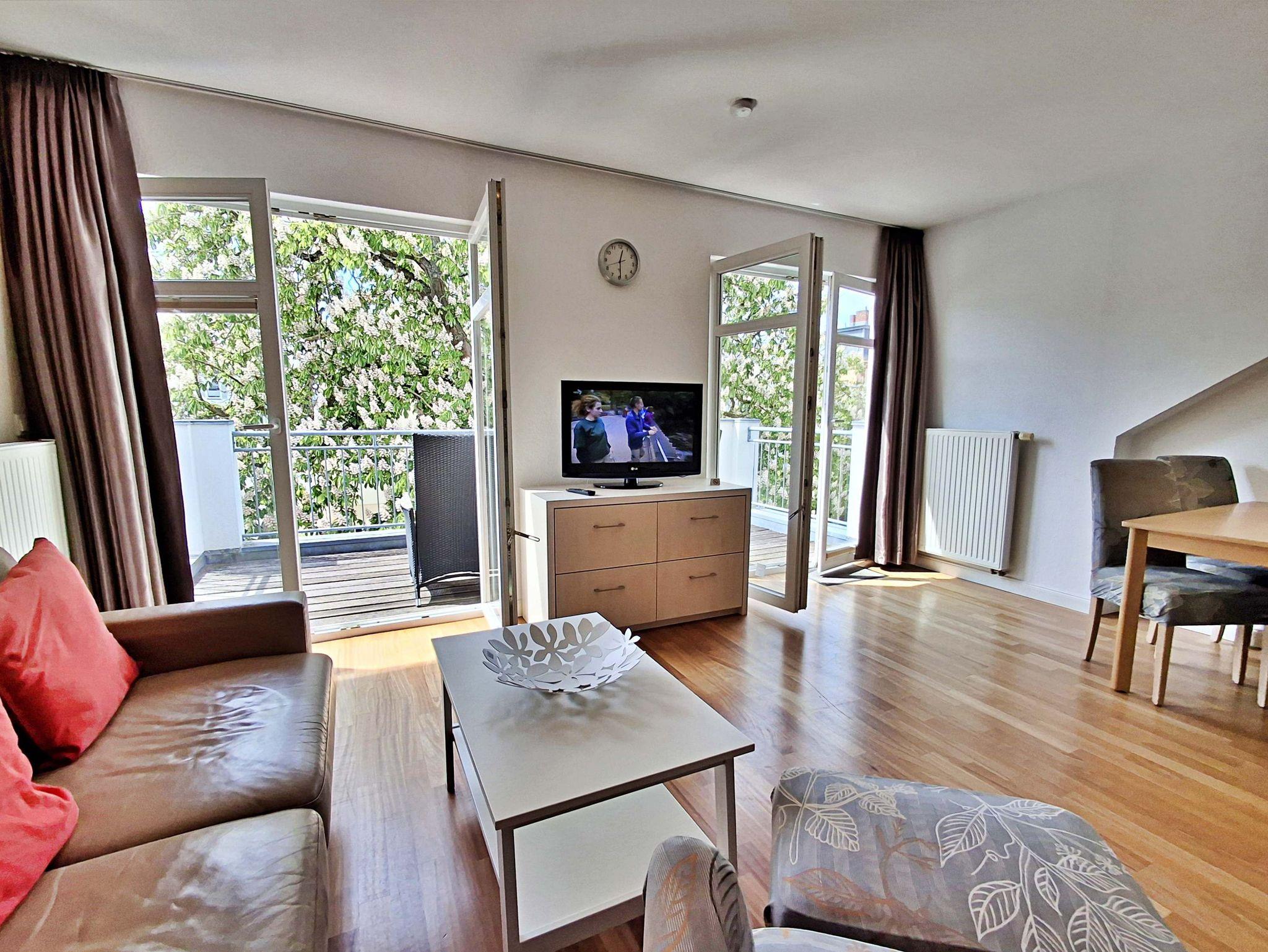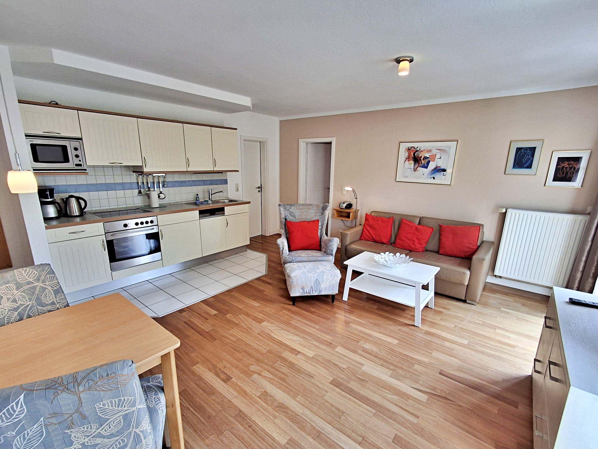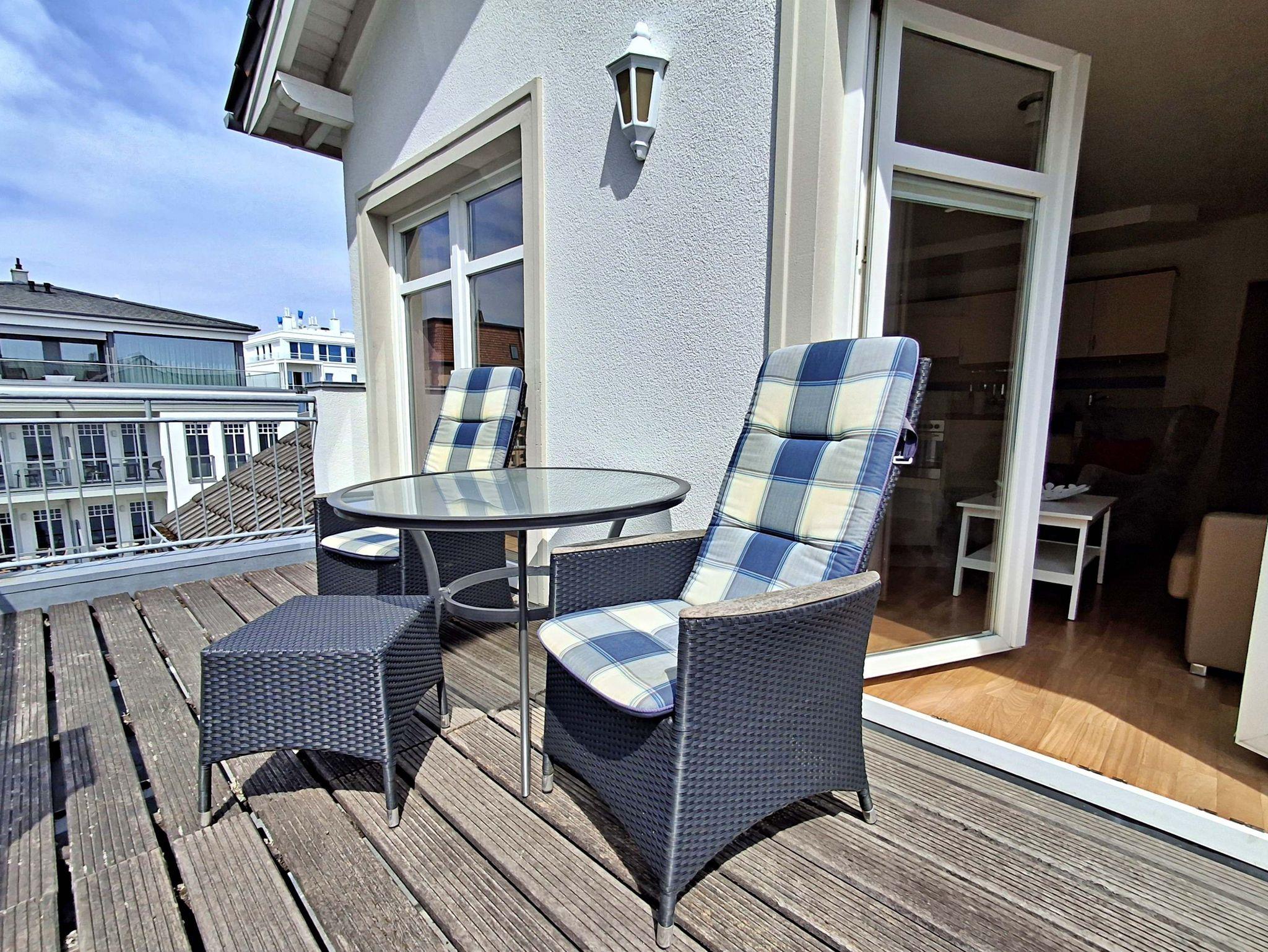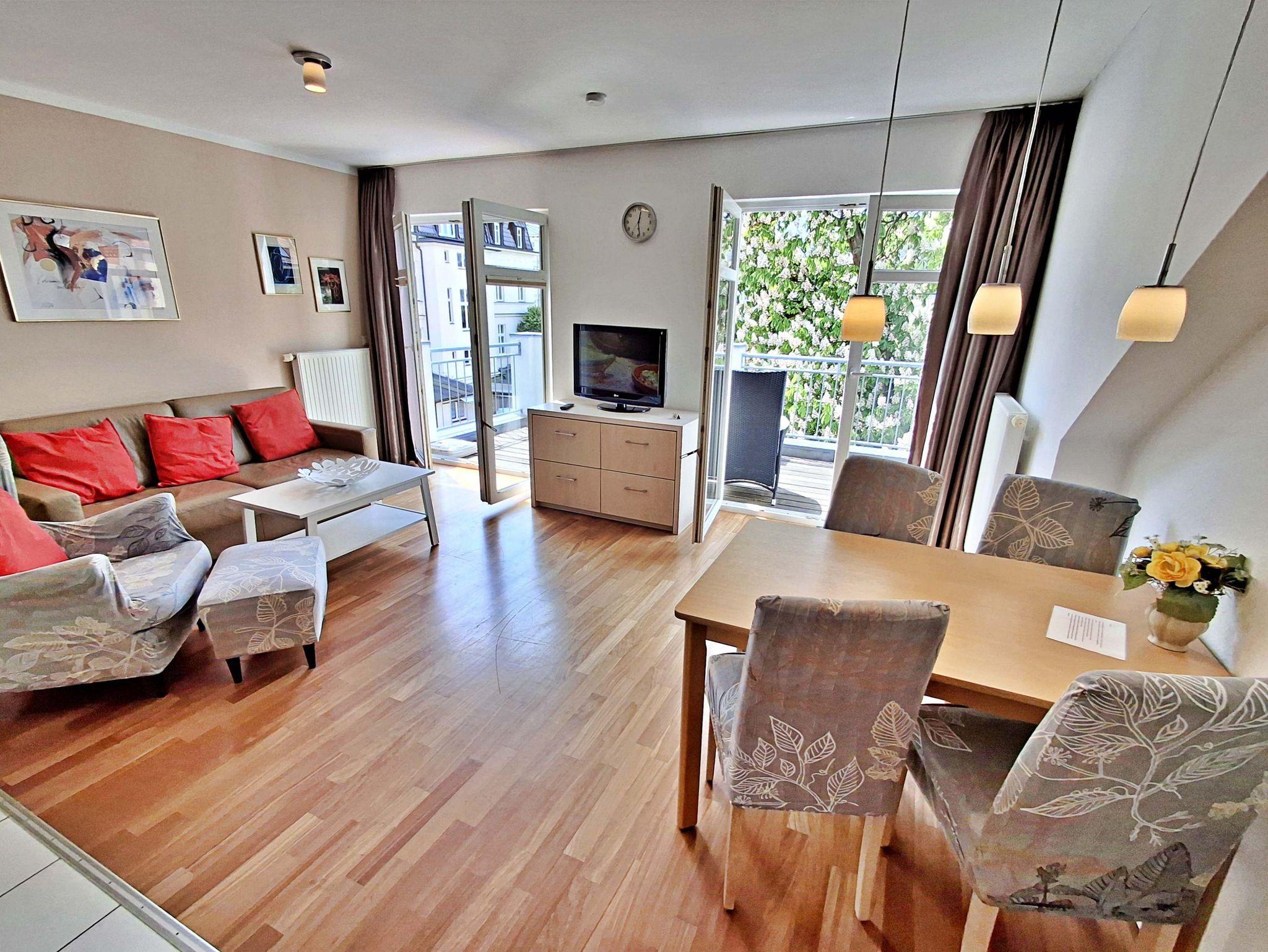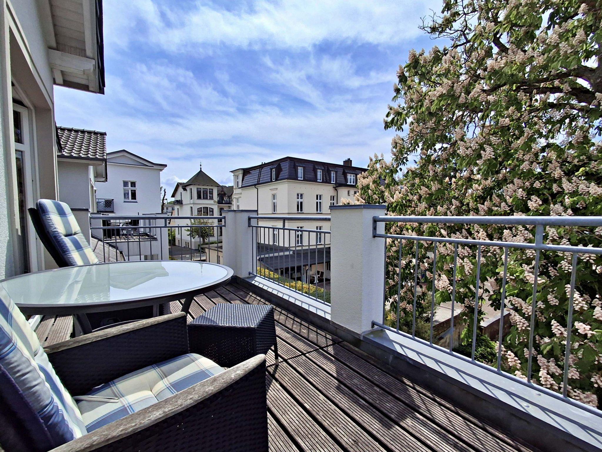 Die gemütliche 2-Zimmer-Wohnung Seeschwalbe im 3. Obergeschoss mit Balkon für max. 3 Erwachsene und 1 Kind bis 8 Jahre befindet im Nebengebäude der stilvoll restaurierten Villa Ahlbeck - nur wenige Schritte von der Promenade und dem Strand entfernt. Im Wohnbereich befinden sich neben der Couch auch ein Sessel mit passendem Fußhocker sowie ein Esstisch mit 4 Stühlen, der genügend Platz für 4 Personen bietet. Das Highlight der Wohnung ist der großzügige Balkon in West-Ausrichtung, wo Sie bei schönem Wetter bereits morgens Ihren Kaffee genießen oder den Abend bei einem Glas Wein ausklingen lassen können. Die moderne Küchenzeile mit Ceranherd, Backofen, Geschirrspüler, Mikrowelle, Kaffeemaschine, Wasserkocher und Toaster lässt keine Wünsche offen. Für die Unterhaltung sorgen ein Flachbild-TV, Radio-CD-Player und kostenfreies W-LAN. Das Schlafzimmer verfügt über ein Doppelbett und das Badezimmer hat DU/WC.