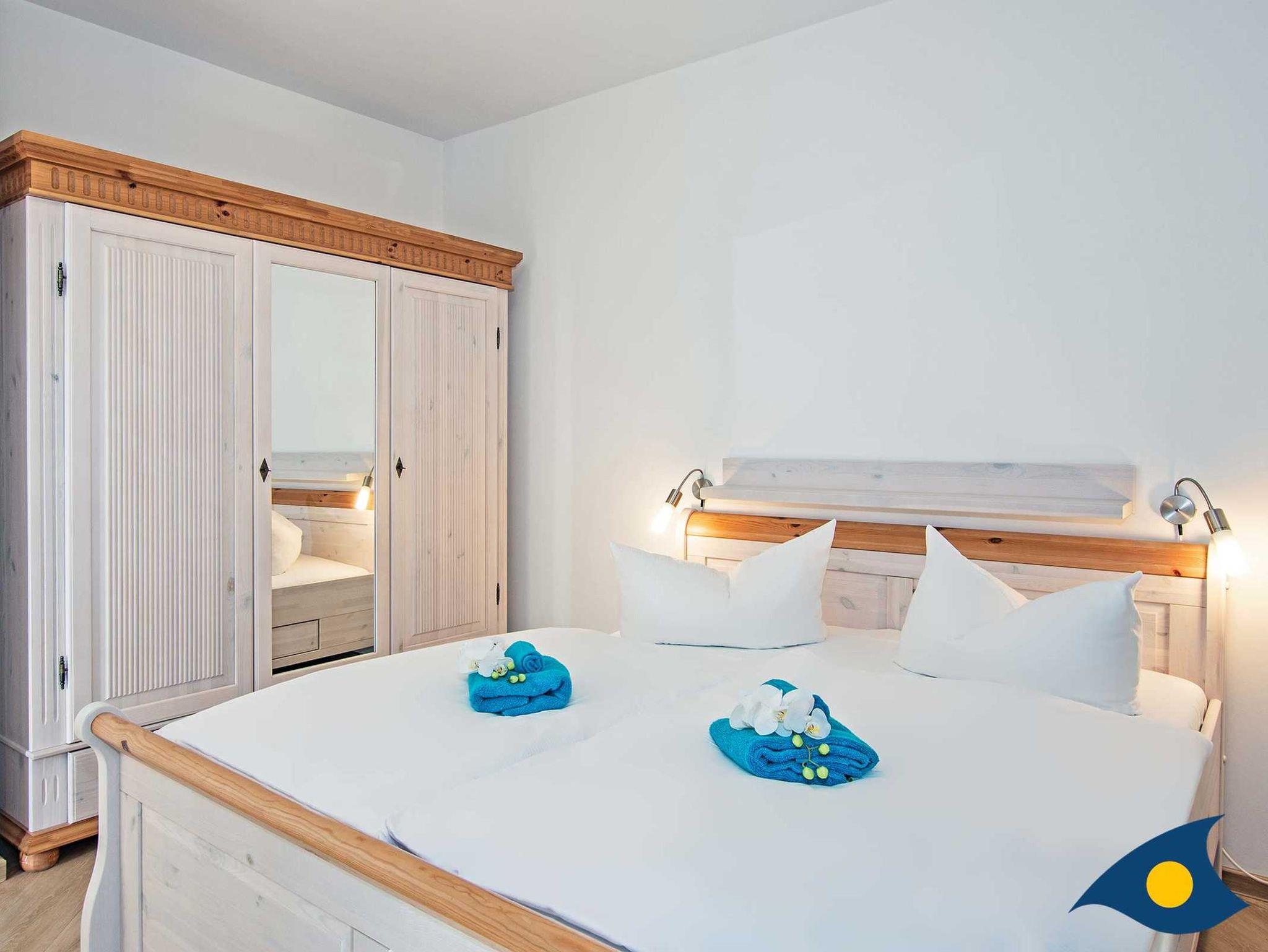 Das Schlafzimmer mit dem großen und gemütlichen Doppelbett sorgt für erholsamen Schlaf nach einem erlebnisreichen Urlaubstag. Auch von hieraus gelangen Sie auf den 13 m² großen, möblierten Balkon.Der Kleiderschrank bietet genügend Platz für Ihre Urlaubsgarderobe.