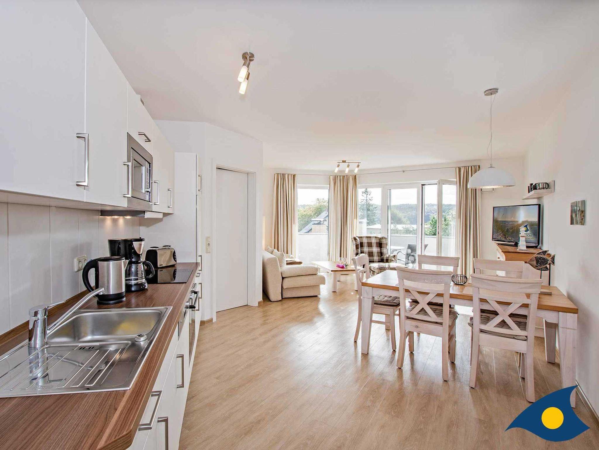 Der helle, geräumige Wohnraum mit der integrierten Küchenzeile bildet den Mittelpunkt des Appartements. Durch den Zugang zum Balkon und die bodentiefen Fenster genießen Sie von dem bequemen Sofa einen herrlichen Blick von der 2. Etage aus.