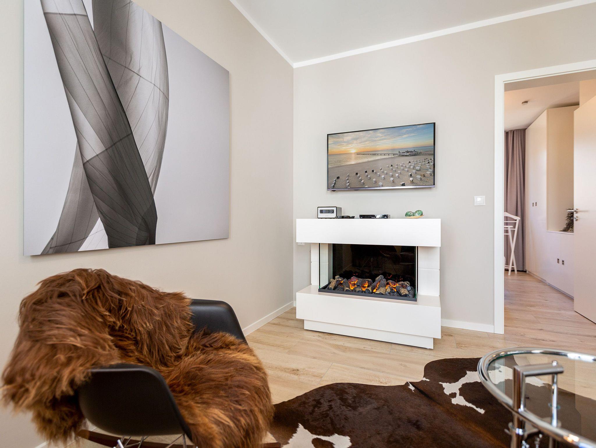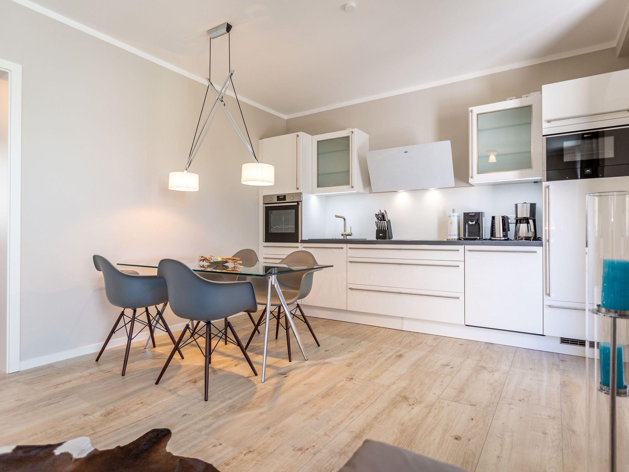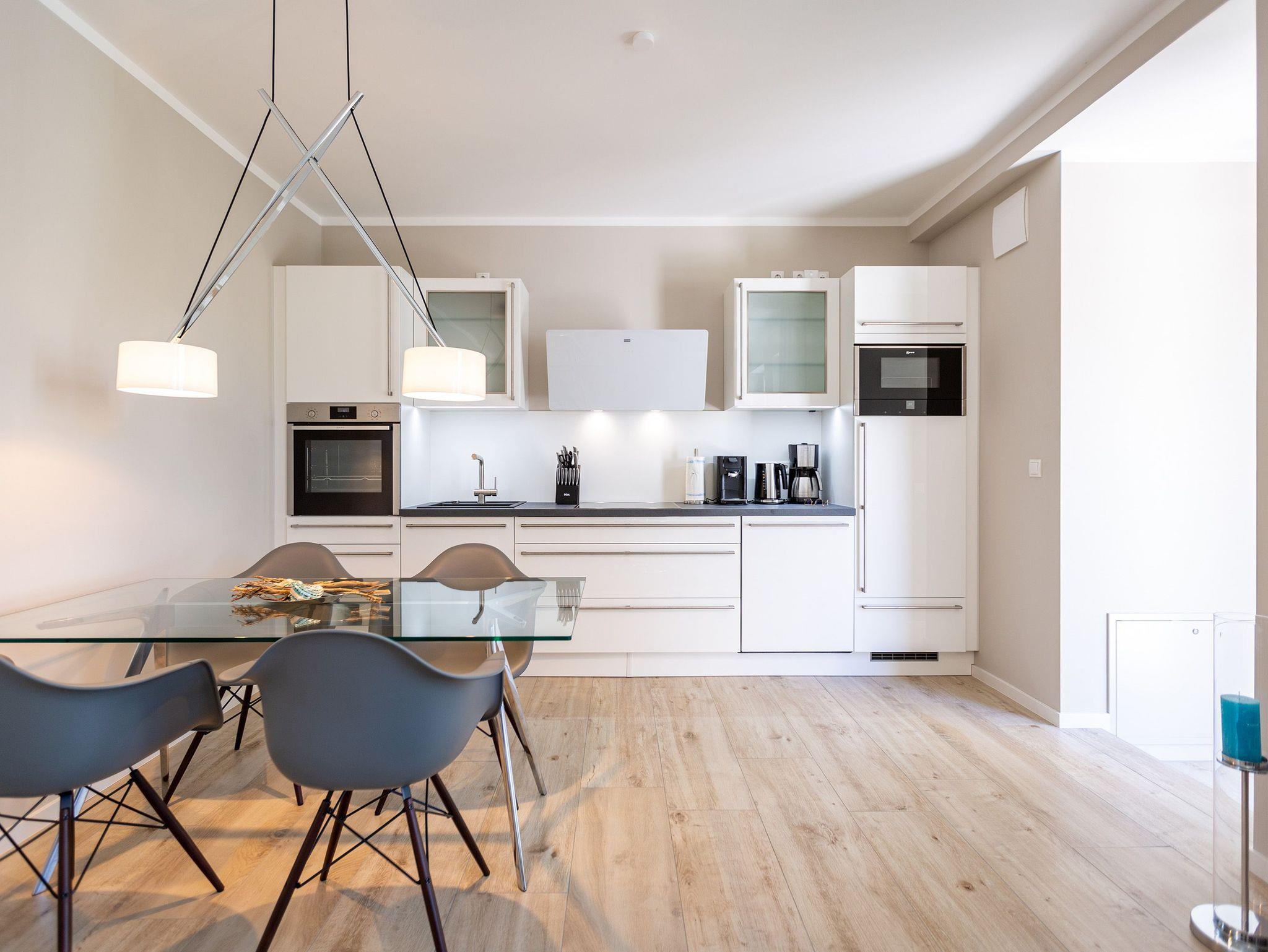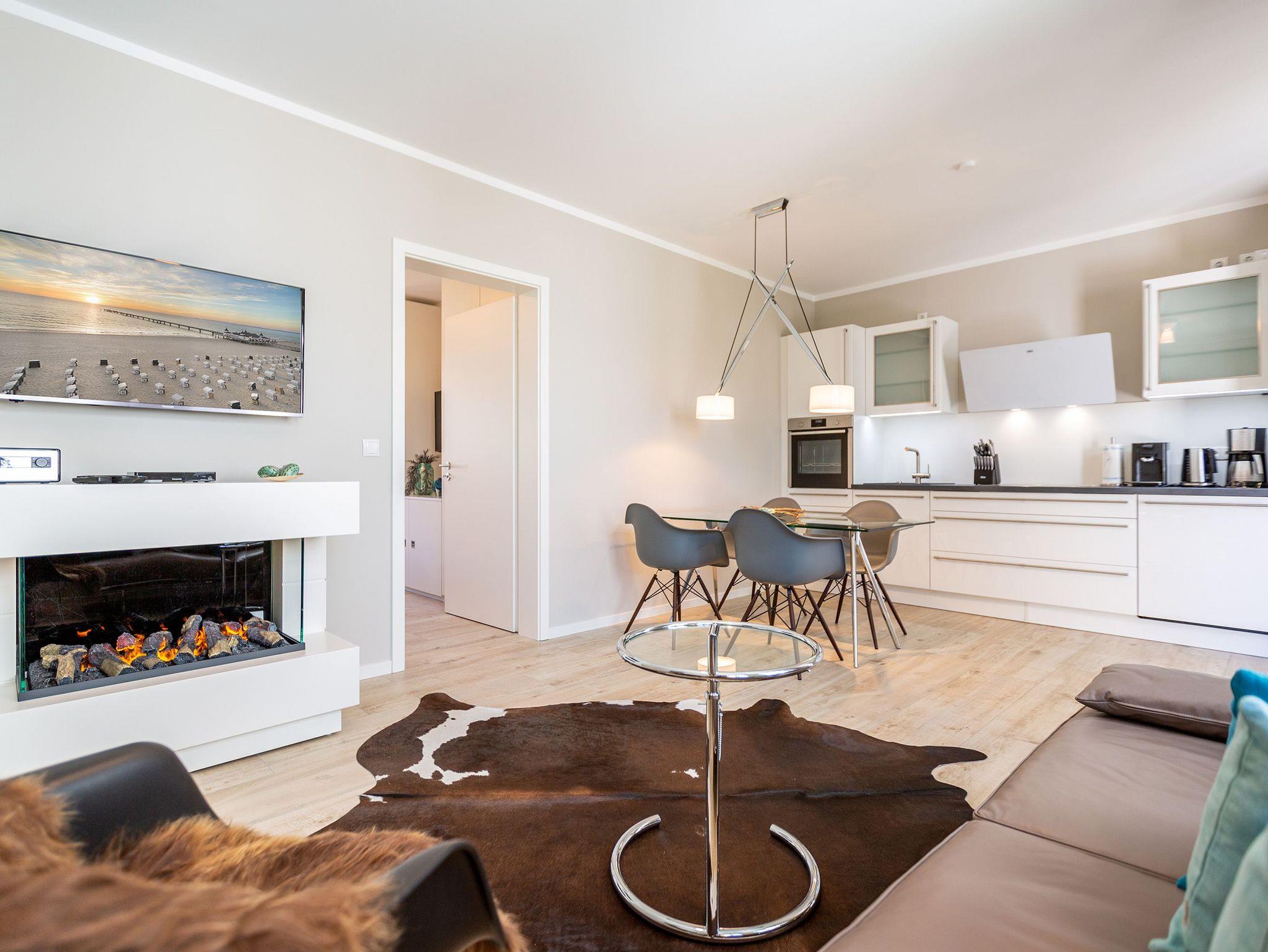 Wunderbar hell ist es in diesem 53 Quadratmeter großen Urlaubsparadies. Denn die Fenster lassen viel Licht in die Zwei-Zimmer-Wohnung hinein. Das verleiht ihr eine luftig leichte Atmosphäre. Für zwei Personen plus Kleinkind (im Kinderreisebett) und Vierbeiner ist dieses Domizil im Erdgeschoss das ideale Wohlfühlzuhause für eine entspannte Ostseeauszeit. Das Interieur wurde von einem Innenarchitekten konzipiert. Ausgewählte Designmöbel wie das Cassina-Sofa von Le Corbusier oder der Schalen-Schaukelstuhl sorgen im Wohnzimmer für stilvolle Eleganz. Ein großer Elektrokamin per Fernbedienung versprüht ein ein gemütliches Ambiente. Kalte Füße gehören Dank einer Fußbodenheizung der Vergangenheit an. Es gibt einen Flat-TV ( 43 Zoll). Das WLAN kann kostenfrei genutzt werden. Zum Wohnzimmer gehört außerdem eine offene Küche. Sie ist topmodern und mit allem ausgestattet, was Sie brauchen: Mikrowelle, Induktionsherd, Geschirrspüler, Senseo Kaffeemaschine? Töpfe, Pfannen und Geschirr finden Sie in den Schränken. Vom Wohnzimmer aus können Sie auf eine sonnenüberflutete Terrasse hinaustreten. Hier können Sie es sich beim Sonnenbaden auf der Liege oder beim Open Air-Frühstück im Strandkorb so richtig gut gehen lassen. Auch das Schlafzimmer besitzt viel Gemütlichkeit. Ein bequemes Boxspringdoppelbett schenkt Ihnen erholsame Träume. In den Schränken gibt es reichlich Ablageflächen. Das Bad verfügt über Dusche und WC. Natürlich ist ein Föhn vorhanden. Handtücher liegen bereit und das Bett ist bei Anreise bezogen. Im Keller befindet sich ein Fahrradraum und für Ihr Auto ist in der Tiefgarage ein Stellplatz reserviert.