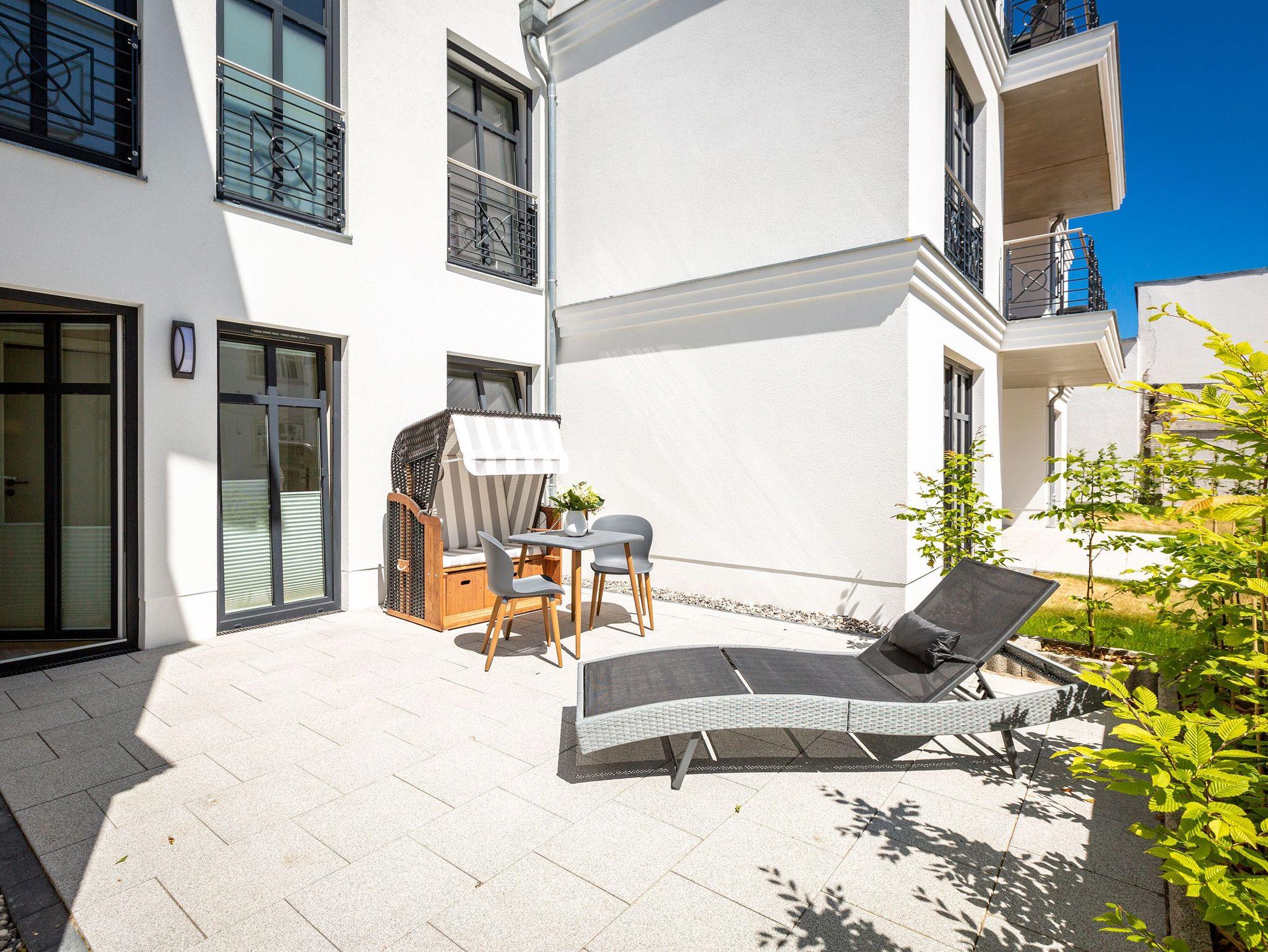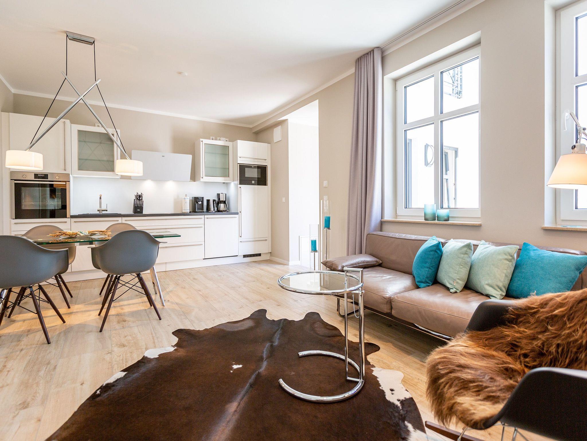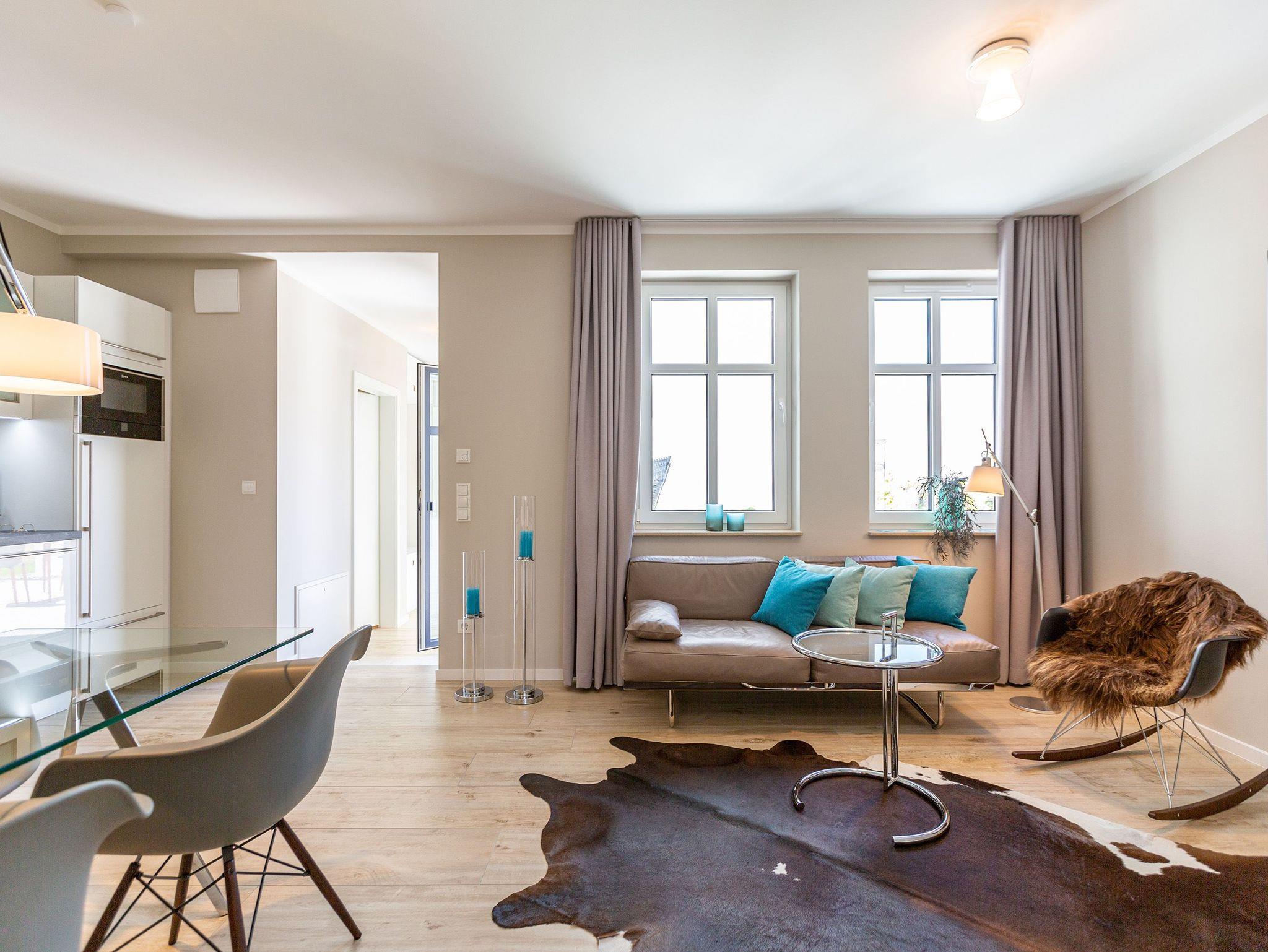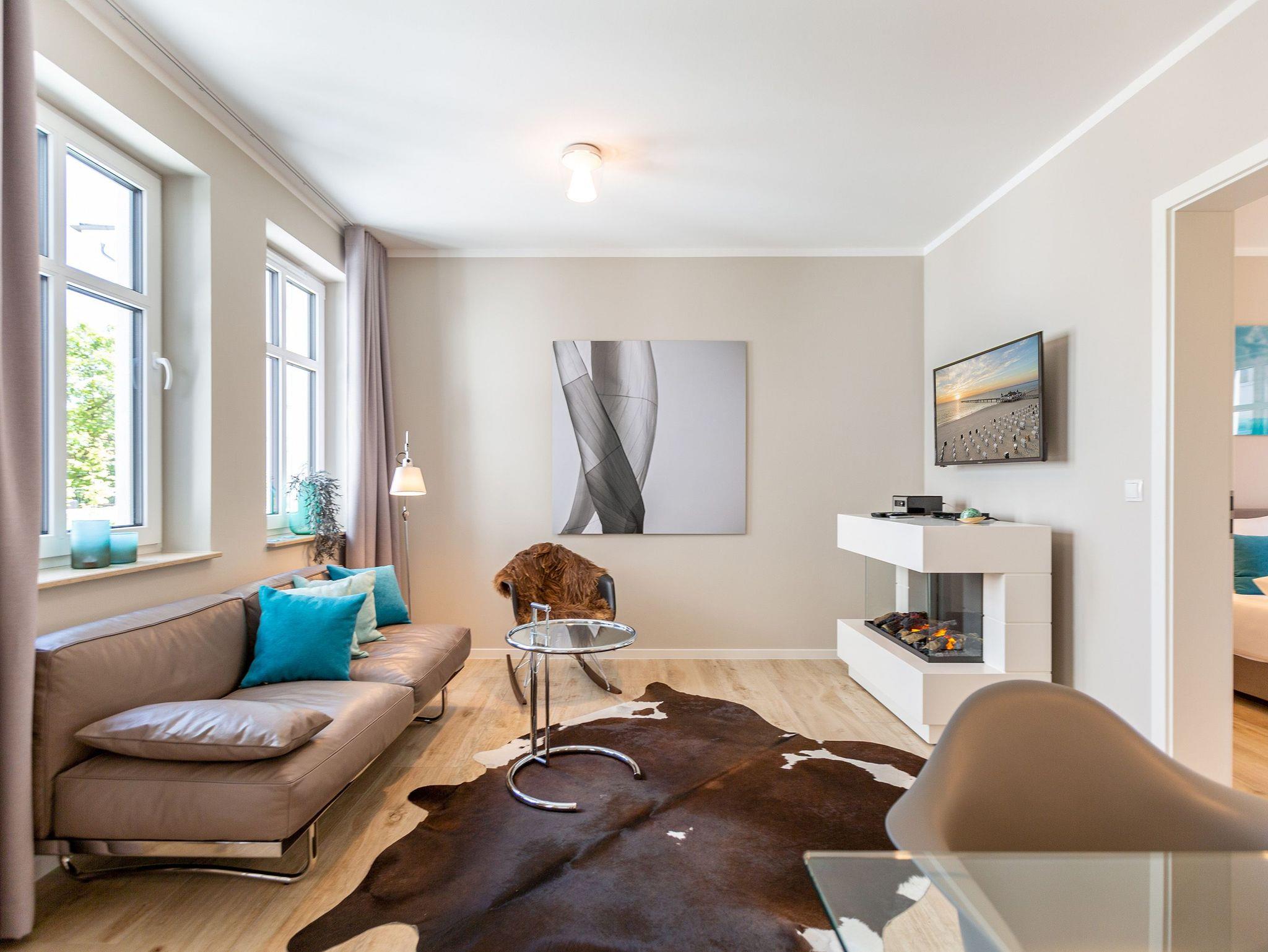 Wunderbar hell ist es in diesem 53 Quadratmeter großen Urlaubsparadies. Denn die Fenster lassen viel Licht in die Zwei-Zimmer-Wohnung hinein. Das verleiht ihr eine luftig leichte Atmosphäre. Für zwei Personen plus Kleinkind (im Kinderreisebett) und Vierbeiner ist dieses Domizil im Erdgeschoss das ideale Wohlfühlzuhause für eine entspannte Ostseeauszeit. Das Interieur wurde von einem Innenarchitekten konzipiert. Ausgewählte Designmöbel wie das Cassina-Sofa von Le Corbusier oder der Schalen-Schaukelstuhl sorgen im Wohnzimmer für stilvolle Eleganz. Ein großer Elektrokamin per Fernbedienung versprüht ein ein gemütliches Ambiente. Kalte Füße gehören Dank einer Fußbodenheizung der Vergangenheit an. Es gibt einen Flat-TV ( 43 Zoll). Das WLAN kann kostenfrei genutzt werden. Zum Wohnzimmer gehört außerdem eine offene Küche. Sie ist topmodern und mit allem ausgestattet, was Sie brauchen: Mikrowelle, Induktionsherd, Geschirrspüler, Senseo Kaffeemaschine? Töpfe, Pfannen und Geschirr finden Sie in den Schränken. Vom Wohnzimmer aus können Sie auf eine sonnenüberflutete Terrasse hinaustreten. Hier können Sie es sich beim Sonnenbaden auf der Liege oder beim Open Air-Frühstück im Strandkorb so richtig gut gehen lassen. Auch das Schlafzimmer besitzt viel Gemütlichkeit. Ein bequemes Boxspringdoppelbett schenkt Ihnen erholsame Träume. In den Schränken gibt es reichlich Ablageflächen. Das Bad verfügt über Dusche und WC. Natürlich ist ein Föhn vorhanden. Handtücher liegen bereit und das Bett ist bei Anreise bezogen. Im Keller befindet sich ein Fahrradraum und für Ihr Auto ist in der Tiefgarage ein Stellplatz reserviert.