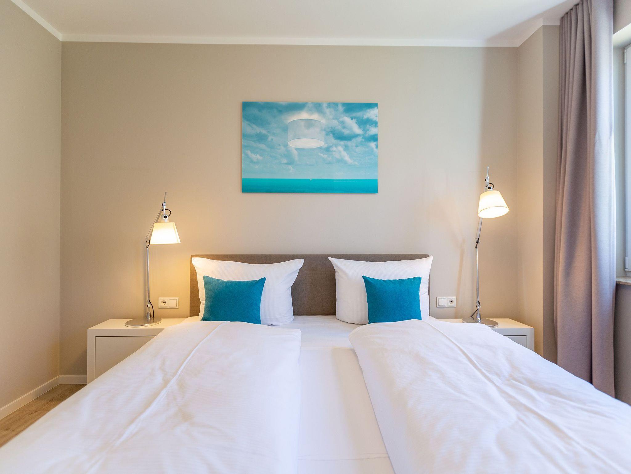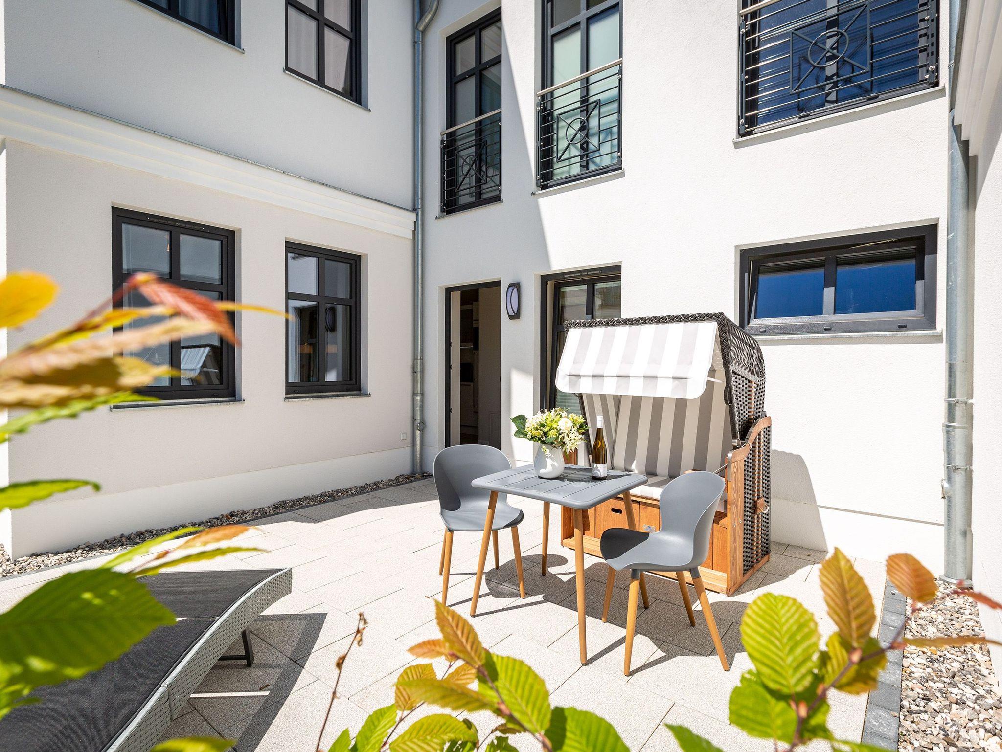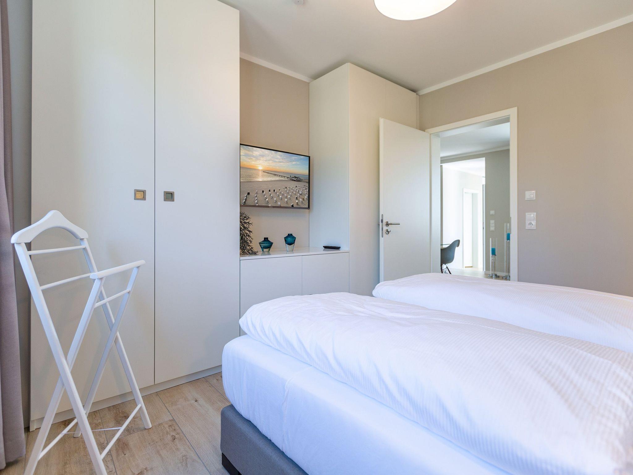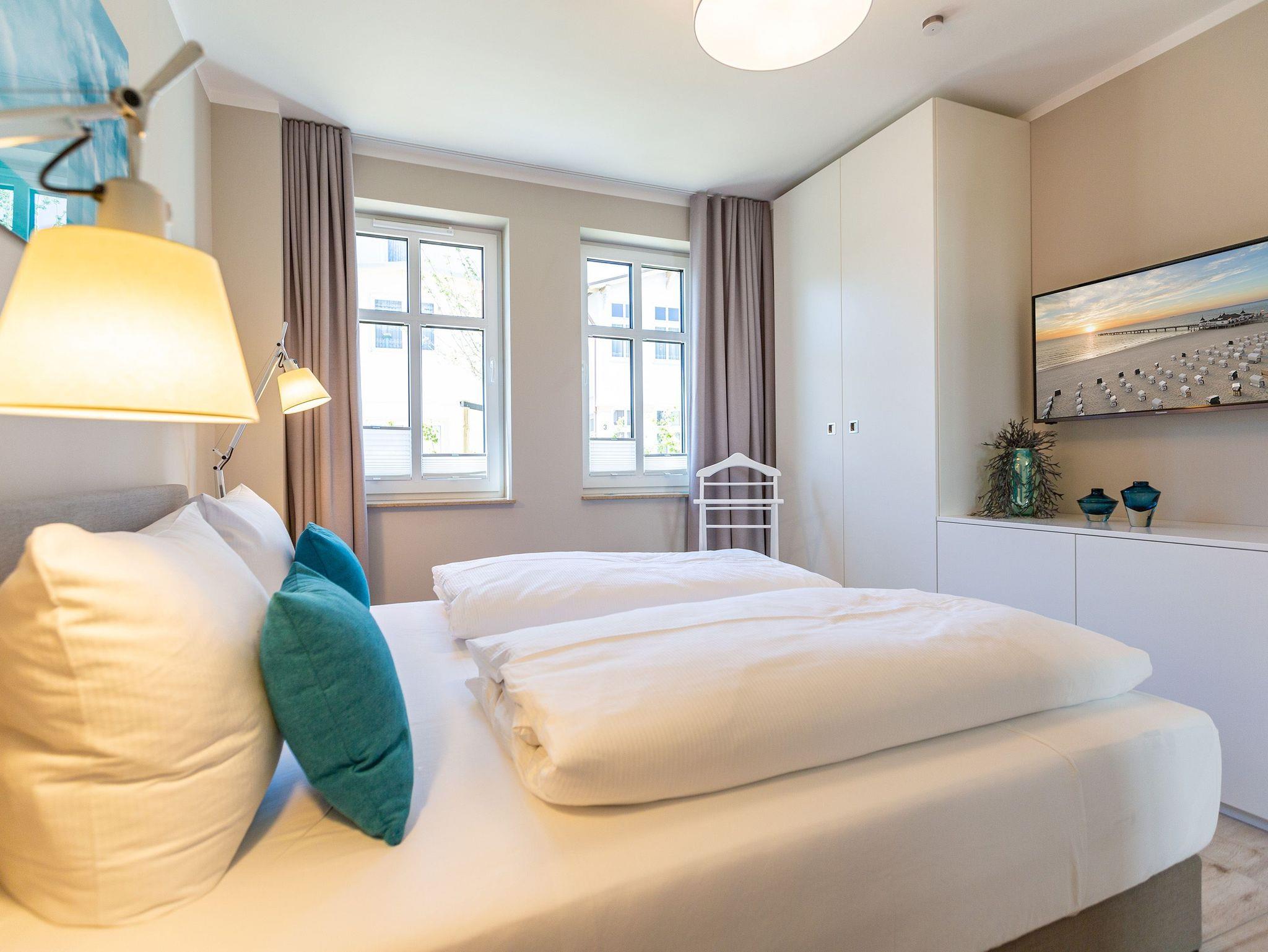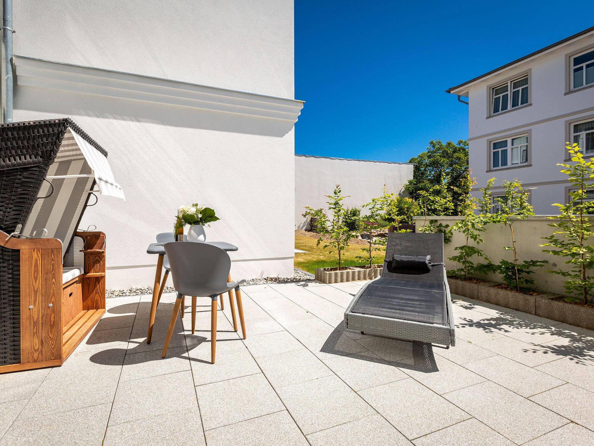Wunderbar hell ist es in diesem 53 Quadratmeter großen Urlaubsparadies. Denn die Fenster lassen viel Licht in die Zwei-Zimmer-Wohnung hinein. Das verleiht ihr eine luftig leichte Atmosphäre. Für zwei Personen plus Kleinkind (im Kinderreisebett) und Vierbeiner ist dieses Domizil im Erdgeschoss das ideale Wohlfühlzuhause für eine entspannte Ostseeauszeit. Das Interieur wurde von einem Innenarchitekten konzipiert. Ausgewählte Designmöbel wie das Cassina-Sofa von Le Corbusier oder der Schalen-Schaukelstuhl sorgen im Wohnzimmer für stilvolle Eleganz. Ein großer Elektrokamin per Fernbedienung versprüht ein ein gemütliches Ambiente. Kalte Füße gehören Dank einer Fußbodenheizung der Vergangenheit an. Es gibt einen Flat-TV ( 43 Zoll). Das WLAN kann kostenfrei genutzt werden. Zum Wohnzimmer gehört außerdem eine offene Küche. Sie ist topmodern und mit allem ausgestattet, was Sie brauchen: Mikrowelle, Induktionsherd, Geschirrspüler, Senseo Kaffeemaschine? Töpfe, Pfannen und Geschirr finden Sie in den Schränken. Vom Wohnzimmer aus können Sie auf eine sonnenüberflutete Terrasse hinaustreten. Hier können Sie es sich beim Sonnenbaden auf der Liege oder beim Open Air-Frühstück im Strandkorb so richtig gut gehen lassen. Auch das Schlafzimmer besitzt viel Gemütlichkeit. Ein bequemes Boxspringdoppelbett schenkt Ihnen erholsame Träume. In den Schränken gibt es reichlich Ablageflächen. Das Bad verfügt über Dusche und WC. Natürlich ist ein Föhn vorhanden. Handtücher liegen bereit und das Bett ist bei Anreise bezogen. Im Keller befindet sich ein Fahrradraum und für Ihr Auto ist in der Tiefgarage ein Stellplatz reserviert.