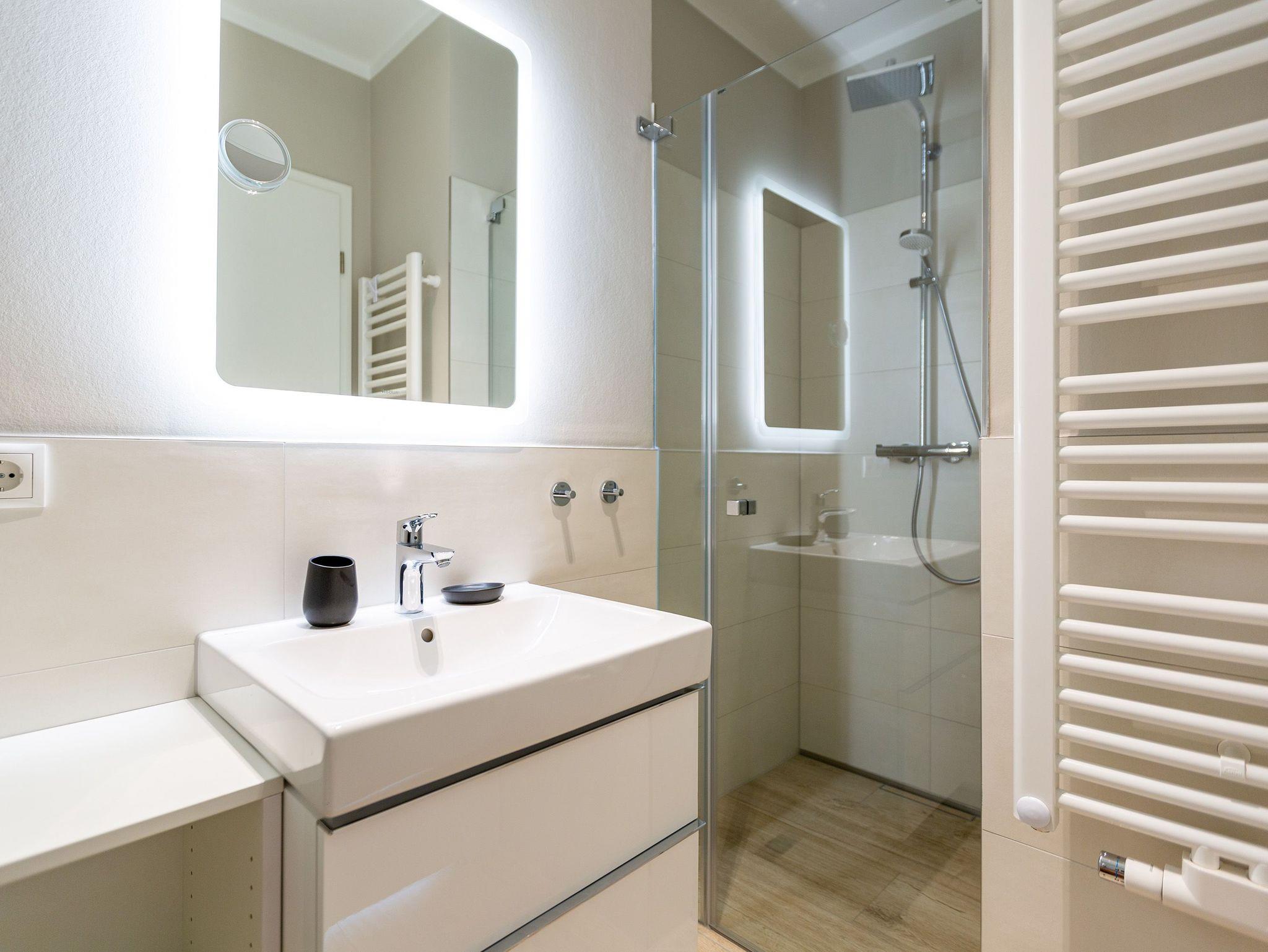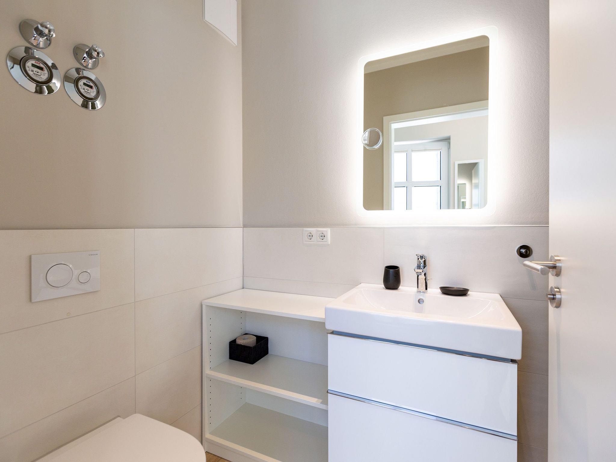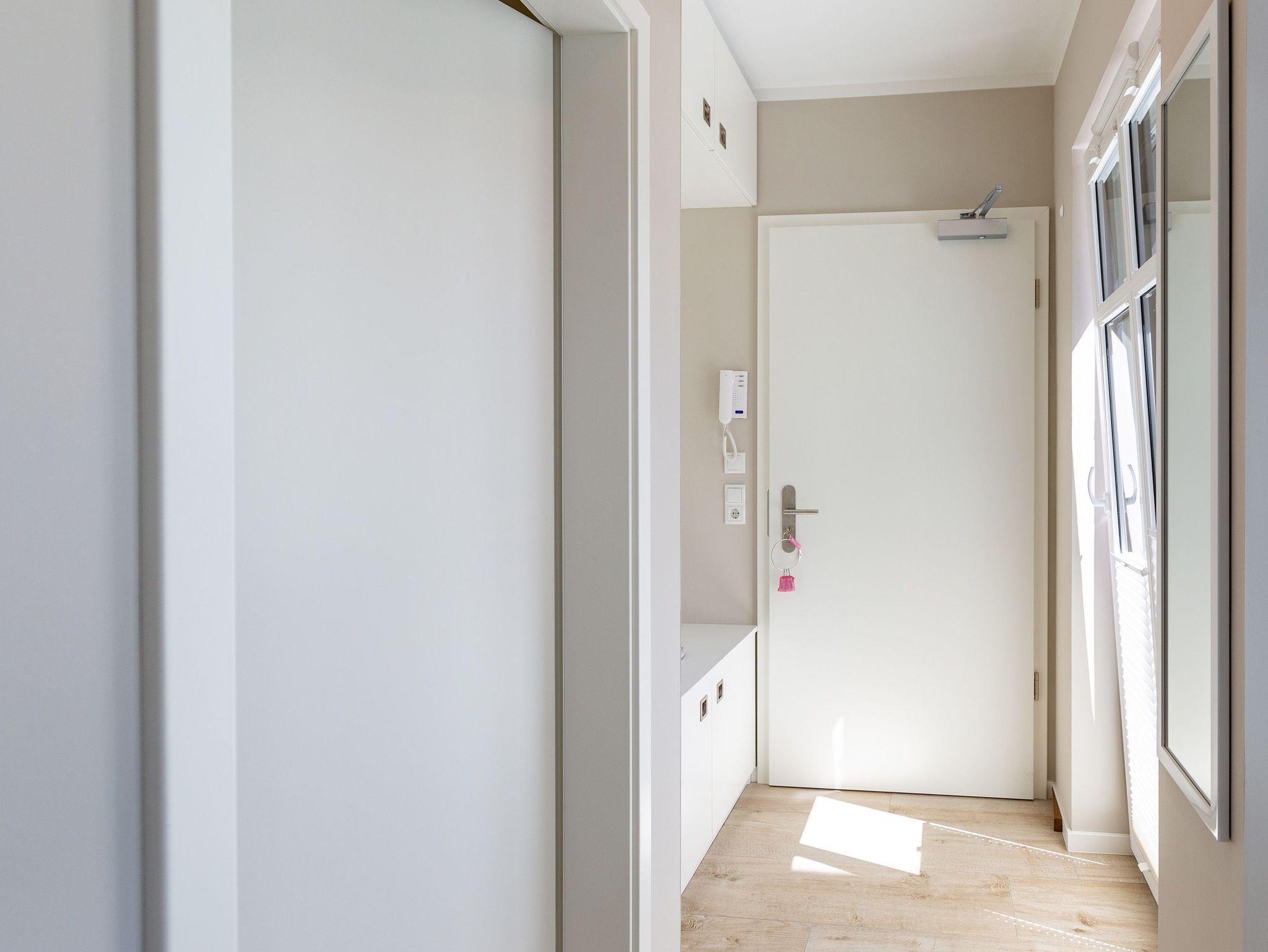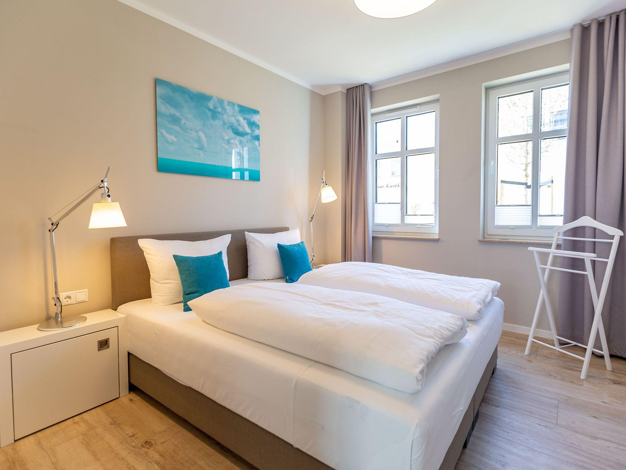 Wunderbar hell ist es in diesem 53 Quadratmeter großen Urlaubsparadies. Denn die Fenster lassen viel Licht in die Zwei-Zimmer-Wohnung hinein. Das verleiht ihr eine luftig leichte Atmosphäre. Für zwei Personen plus Kleinkind (im Kinderreisebett) und Vierbeiner ist dieses Domizil im Erdgeschoss das ideale Wohlfühlzuhause für eine entspannte Ostseeauszeit. Das Interieur wurde von einem Innenarchitekten konzipiert. Ausgewählte Designmöbel wie das Cassina-Sofa von Le Corbusier oder der Schalen-Schaukelstuhl sorgen im Wohnzimmer für stilvolle Eleganz. Ein großer Elektrokamin per Fernbedienung versprüht ein ein gemütliches Ambiente. Kalte Füße gehören Dank einer Fußbodenheizung der Vergangenheit an. Es gibt einen Flat-TV ( 43 Zoll). Das WLAN kann kostenfrei genutzt werden. Zum Wohnzimmer gehört außerdem eine offene Küche. Sie ist topmodern und mit allem ausgestattet, was Sie brauchen: Mikrowelle, Induktionsherd, Geschirrspüler, Senseo Kaffeemaschine? Töpfe, Pfannen und Geschirr finden Sie in den Schränken. Vom Wohnzimmer aus können Sie auf eine sonnenüberflutete Terrasse hinaustreten. Hier können Sie es sich beim Sonnenbaden auf der Liege oder beim Open Air-Frühstück im Strandkorb so richtig gut gehen lassen. Auch das Schlafzimmer besitzt viel Gemütlichkeit. Ein bequemes Boxspringdoppelbett schenkt Ihnen erholsame Träume. In den Schränken gibt es reichlich Ablageflächen. Das Bad verfügt über Dusche und WC. Natürlich ist ein Föhn vorhanden. Handtücher liegen bereit und das Bett ist bei Anreise bezogen. Im Keller befindet sich ein Fahrradraum und für Ihr Auto ist in der Tiefgarage ein Stellplatz reserviert.