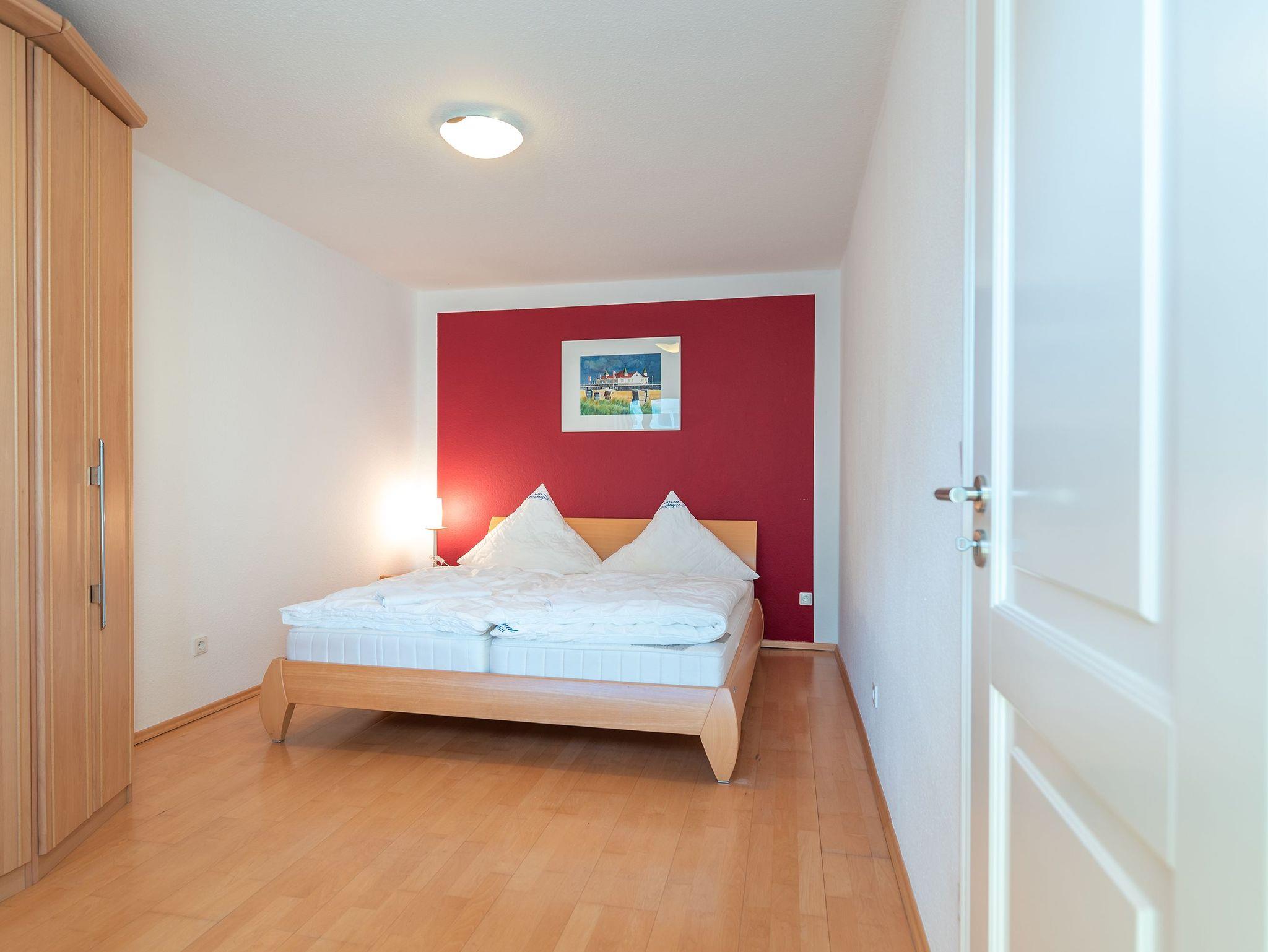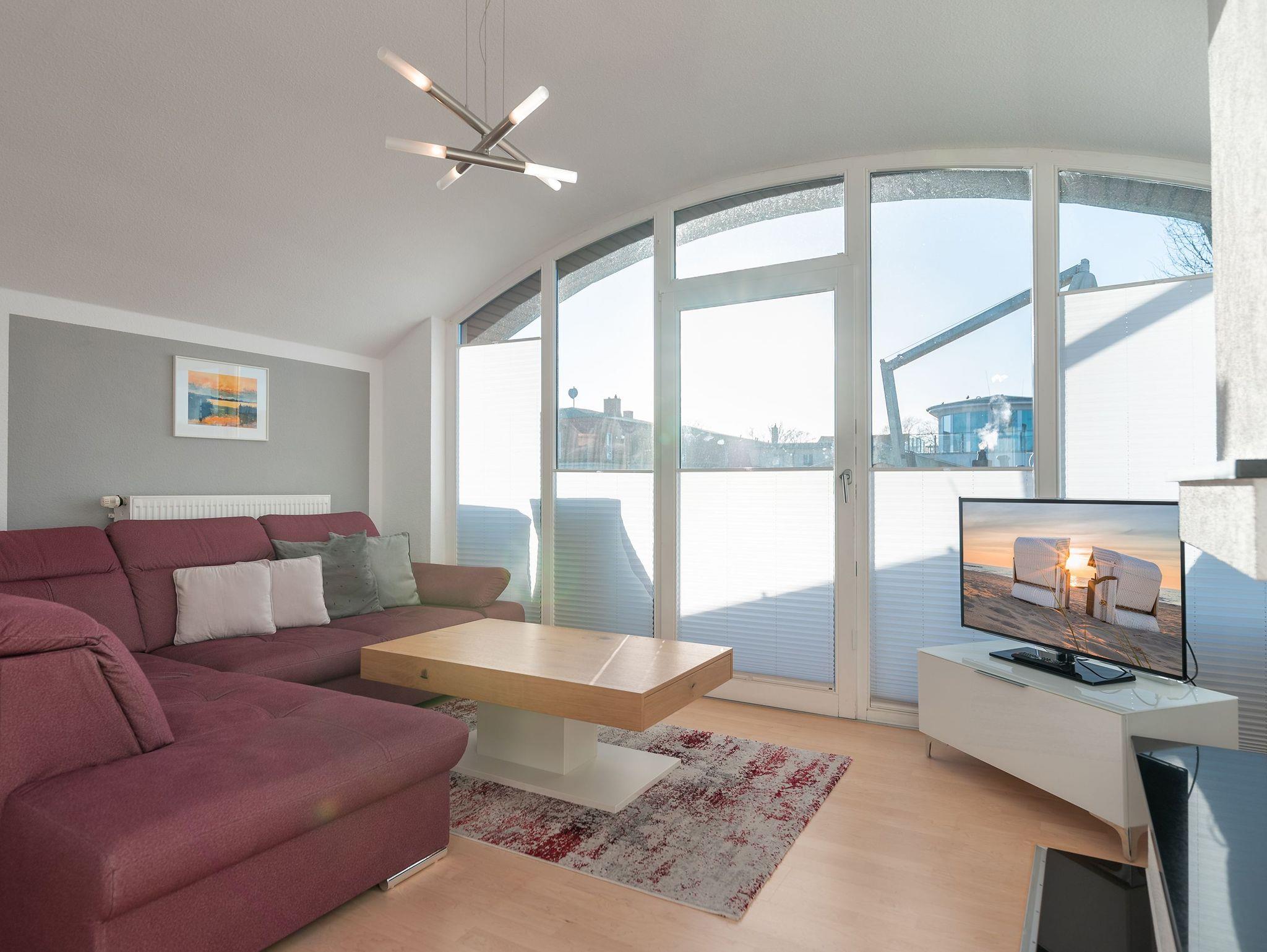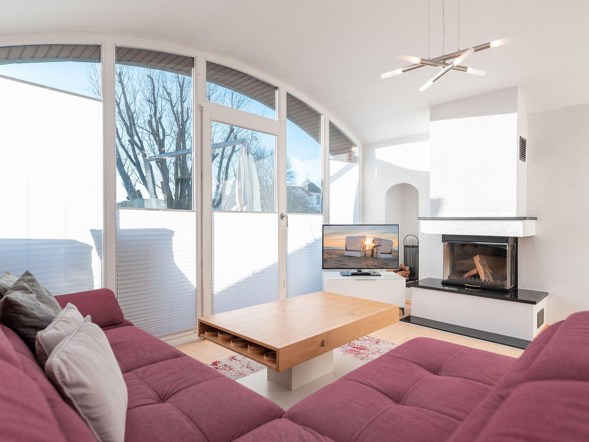 Eine Wendeltreppe führt Sie ins Dachgeschoss, wo sich das Wohnzimmer mit einem einladenden Kamin und einer gemütlichen Couchecke mit Flat-TV befindet. Genießen Sie entspannte Stunden auf der sonnigen, möblierten Terrasse, die den perfekten Rahmen für unvergessliche Urlaubsmomente bietet und von wo aus Sie ebenfalls den seitlichen Meerblick bewundern können. Das zweite Badezimmer im Dachgeschoss verfügt über eine Dusche, einen Waschtisch/WC und eine einladende Badewanne. Das angrenzende, zweite Schlafzimmer mit Doppelbett unter der charakteristischen Dachschräge verspricht ruhige Nächte.