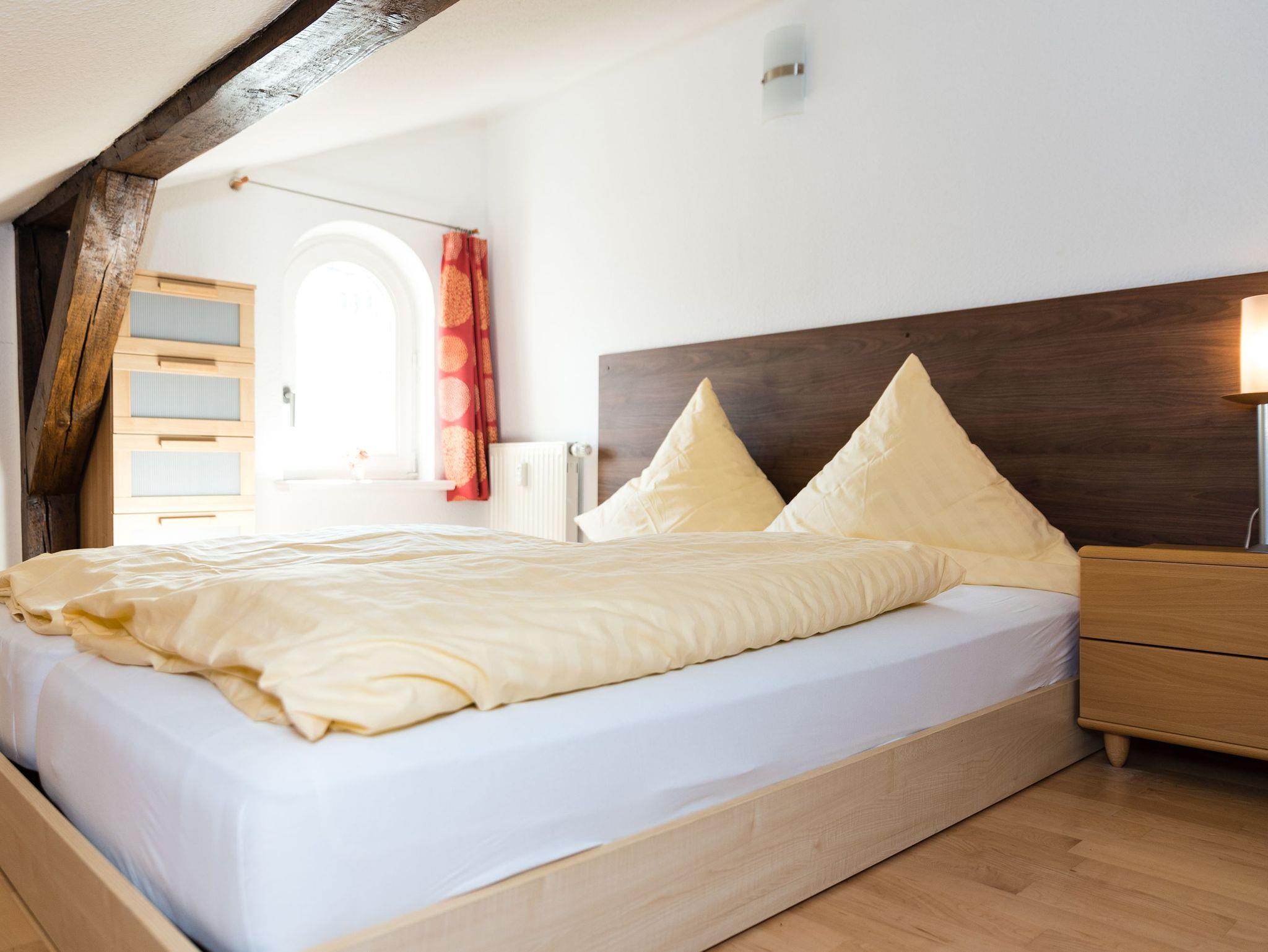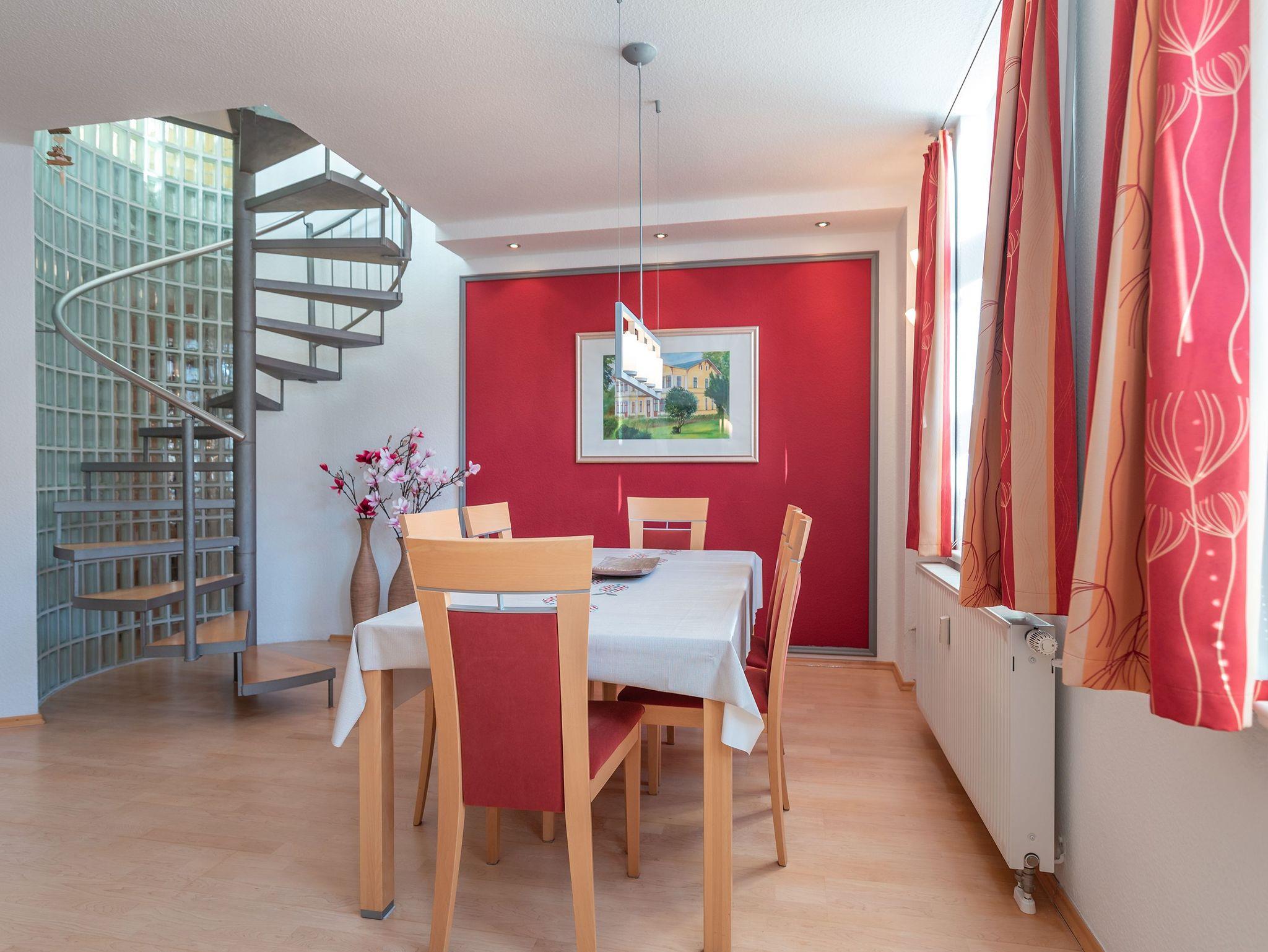 Diese großzügige Galeriewohnung, gelegen im 1. Obergeschoss und Dachgeschoss der Villa, ist ein wahres Juwel für jeden Urlauber. Im 1. Obergeschoss lädt ein großes Schlafzimmer mit komfortablem Doppelbett zum Träumen ein, während die offene, voll ausgestattete Küche mit einem Esstisch für sechs Personen zum gemeinsamen Kochen und Genießen einlädt. Ein modernes Badezimmer mit Dusche rundet die Ausstattung auf dieser Etage ab.