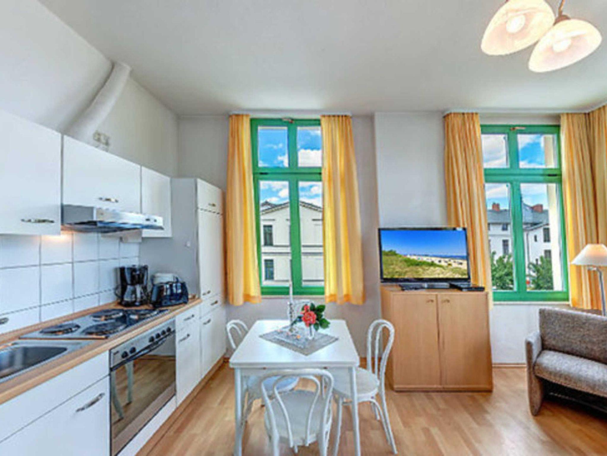 Das gemütliche 2-Zimmer-Appartement Nr. 8 befindet sich im ersten Obergeschoss der Villa Ostseewart. Es verfügt über ein separates Schlafzimmer mit einem Doppelbett und einen Wohnbereich mit einer Doppelschlafcouch, auf welcher Aufbettungen für die dritte und vierte Person vorgenommen werden können. Die voll ausgestattete Küchenzeile mit Kaffeemaschine, Wasserkocher, Toaster, Backofen und Geschirrspüler sowie einem Essplatz ist in den geräumigen Wohnbereich integriert. Das Bad ist mit Dusche und WC ausgestattet, darüber hinaus gibt es ein separates Gäste-WC und einen möblierten Balkon. Ein Pkw-Stellplatz steht Ihnen auf dem Grundstück kostenfrei zur Verfügung und Ihre Fahrräder können Sie ebenfalls auf dem Grundstück in einem separaten Abstellraum unterbringen. Alle Wohnungen in der Villa Ostseewarte haben passwortgeschütztem DSL-WLAN Internetzugang (gerätegebunden, Euro 1,50 pro Tag und Gerät). Ein FAHRSTUHL wurde nachträglich eingebaut. Eine Waschmaschine können Sie gegen Gebühr gern nutzen (Münzgerät).