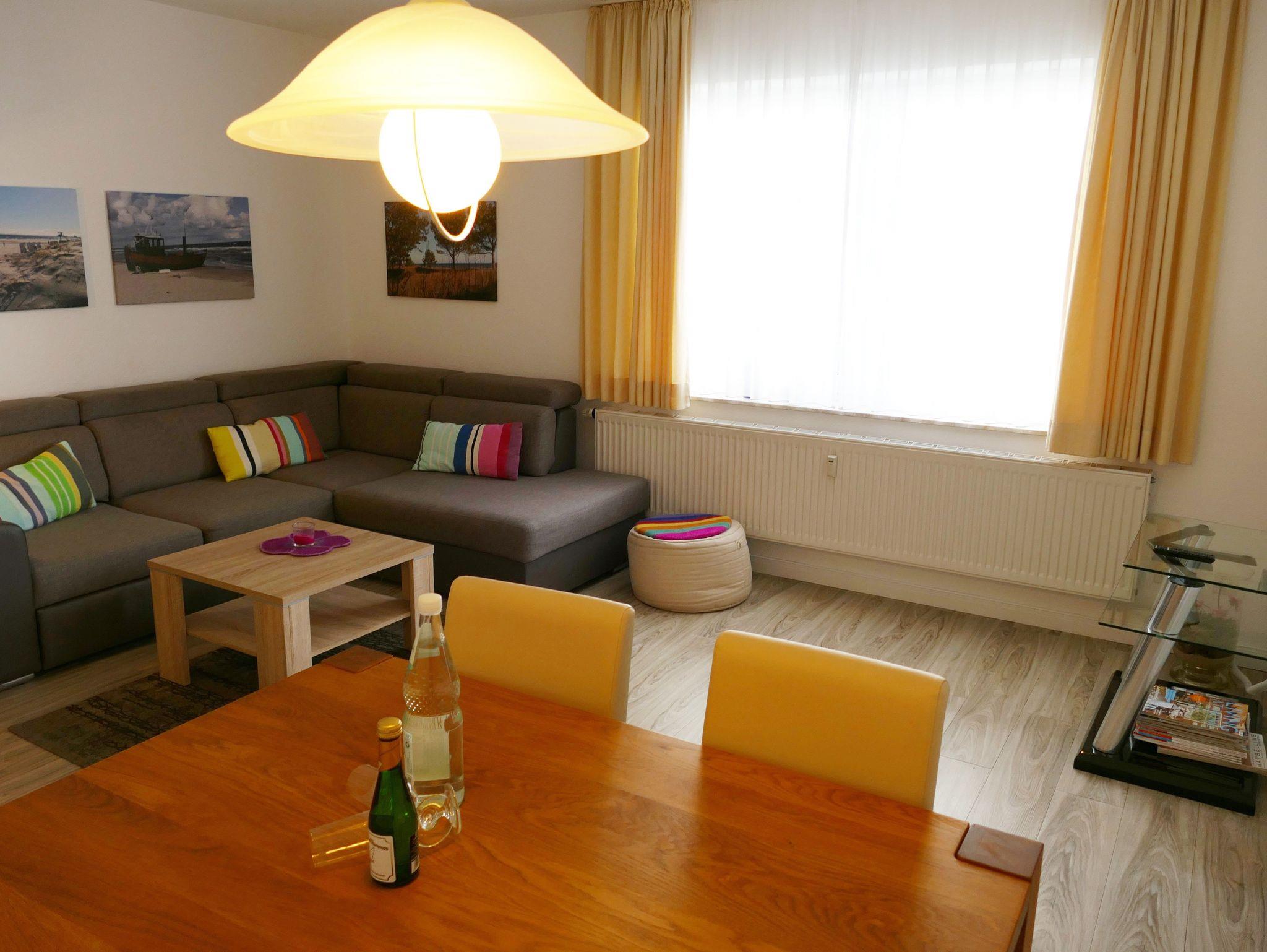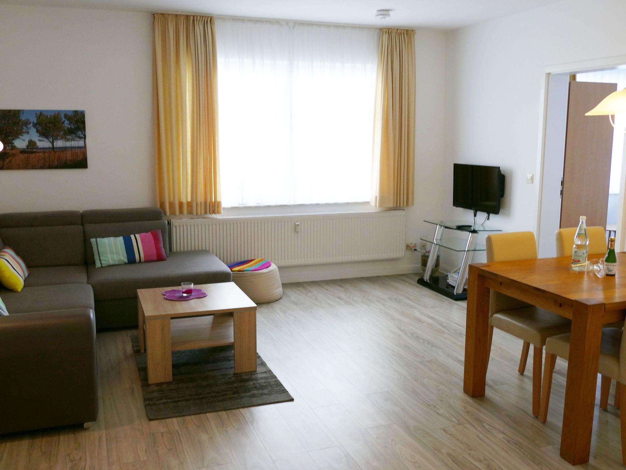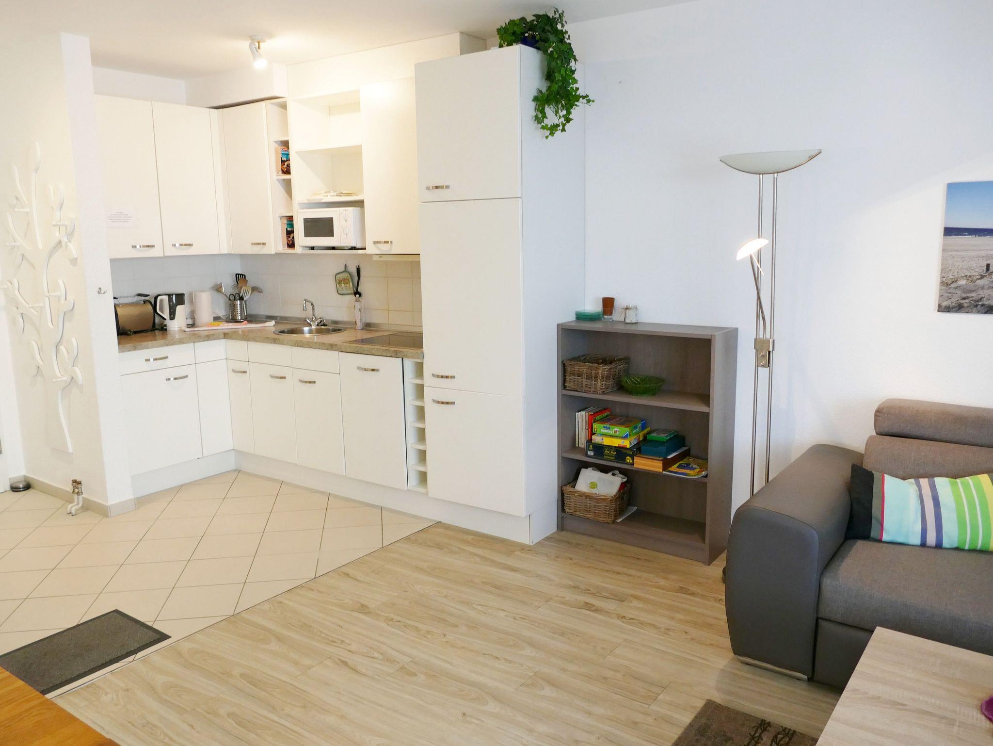 Mit 45 qm eignet sich die Erdgeschosswohnung ideal für bis zu 3 Urlauber zzgl. einem Kleinkind. Sie gliedert sich in ein Wohnzimmer mit Essbereich und offener Küche sowie ein Schlafzimmer mit Doppelbett und ein Duschbad. Das Sofa im Wohnzimmer lässt sich im Handumdrehen zu einer Schlafgelegenheit für eine dritte Person umfunktionieren (Liegefläche ca. 1,40 m x 2,00 m). Über dem Esstisch präsentiert sich Usedom auf einer Landkarte, sodass Sie bei der Planung für den nächsten Tag Ihr Ausflugsziel leicht verorten können. Die Badausstattung umfasst Dusche und WC hinter einer Tür von 69 cm Durchgangsbreite.