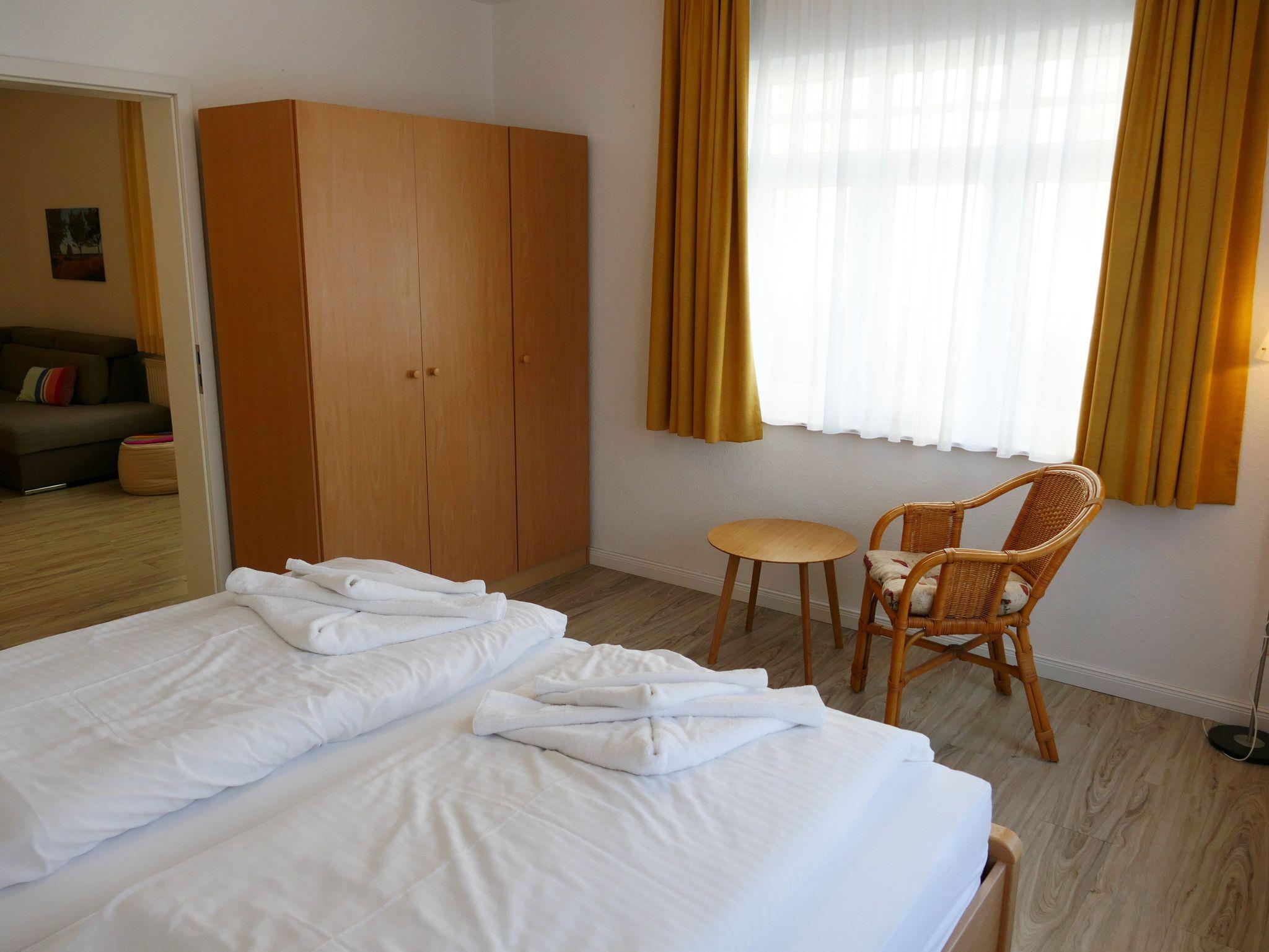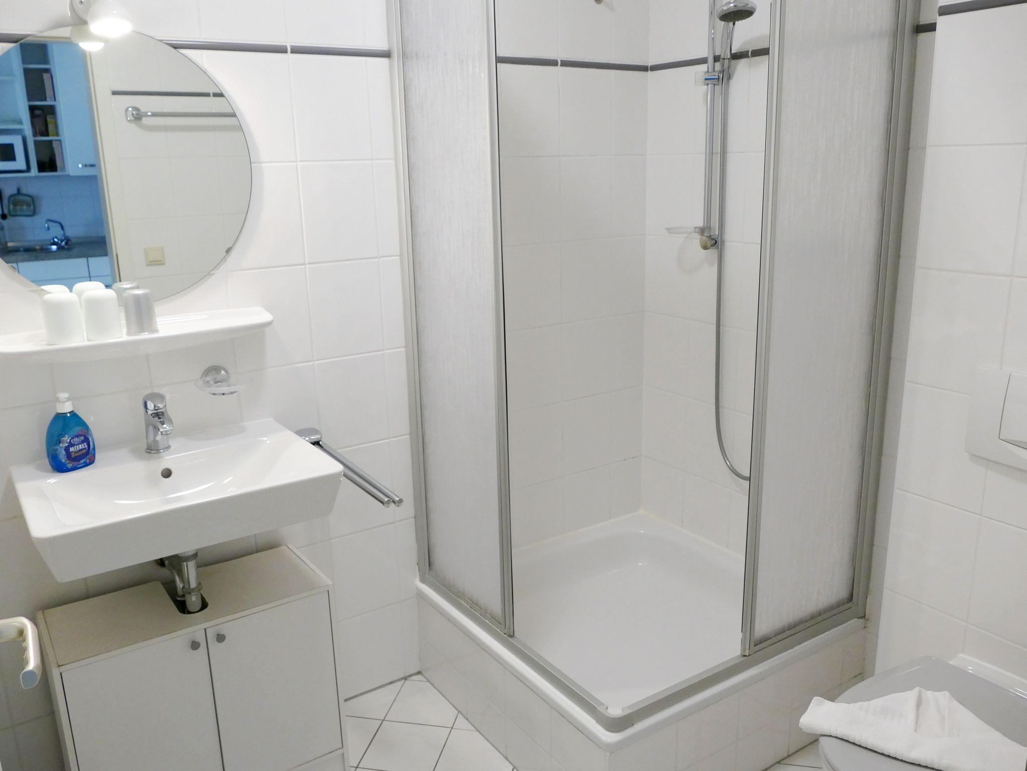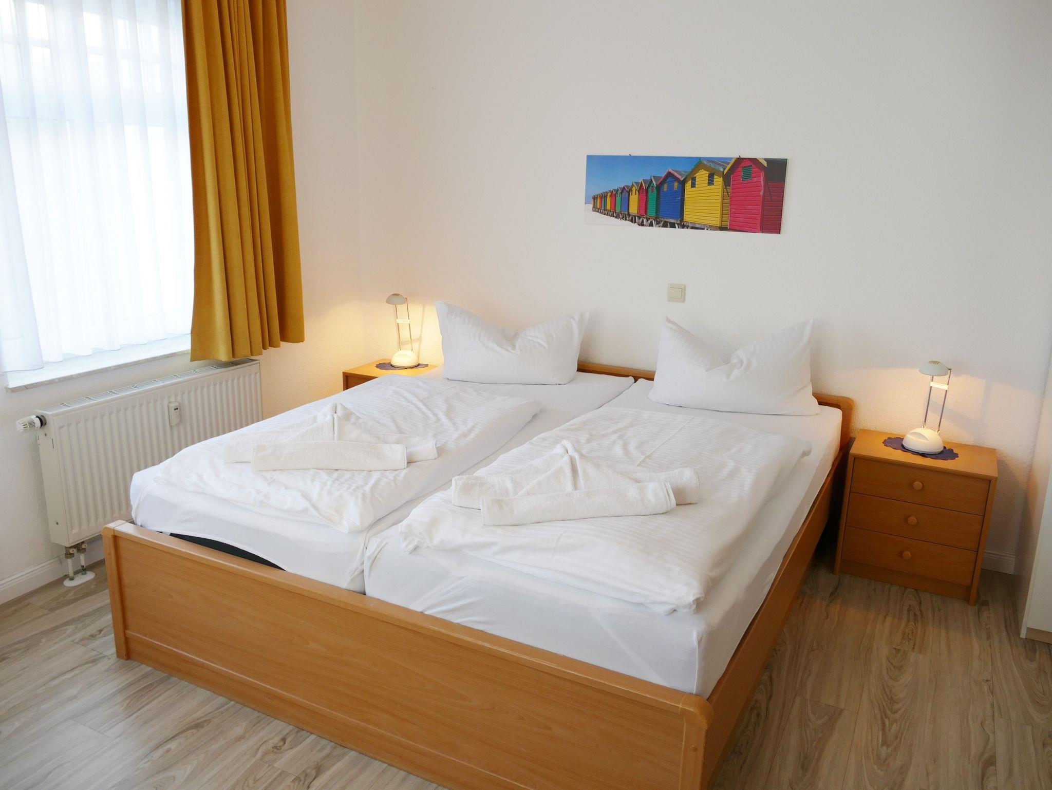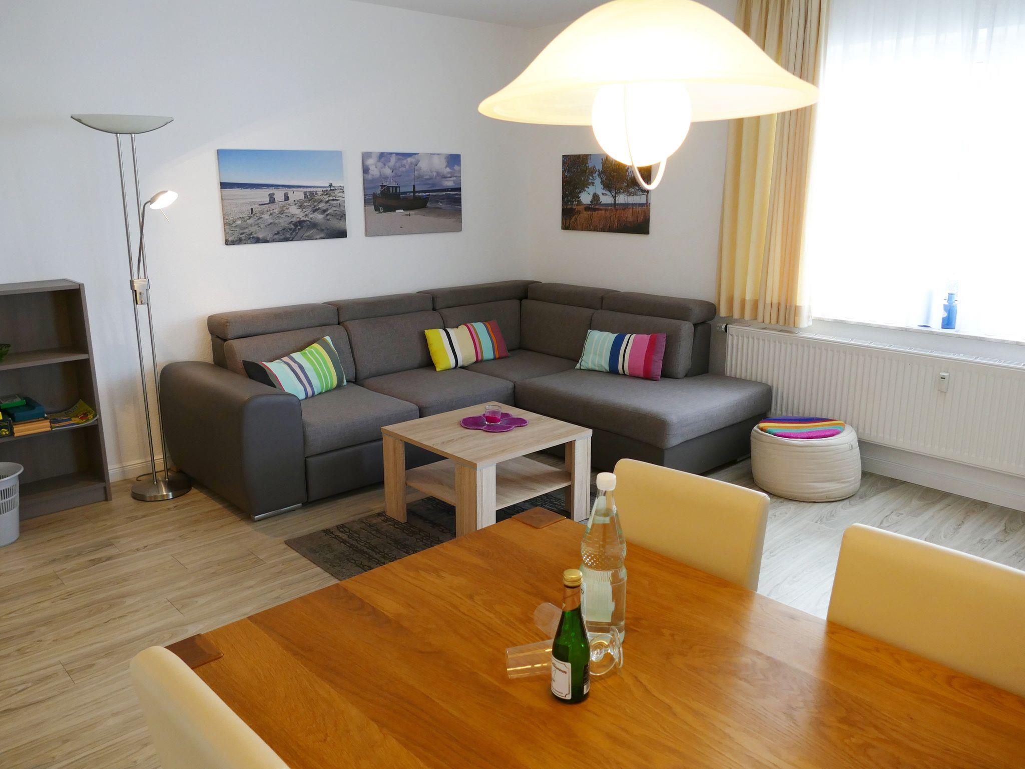 Mit 45 qm eignet sich die Erdgeschosswohnung ideal für bis zu 3 Urlauber zzgl. einem Kleinkind. Sie gliedert sich in ein Wohnzimmer mit Essbereich und offener Küche sowie ein Schlafzimmer mit Doppelbett und ein Duschbad. Das Sofa im Wohnzimmer lässt sich im Handumdrehen zu einer Schlafgelegenheit für eine dritte Person umfunktionieren (Liegefläche ca. 1,40 m x 2,00 m). Über dem Esstisch präsentiert sich Usedom auf einer Landkarte, sodass Sie bei der Planung für den nächsten Tag Ihr Ausflugsziel leicht verorten können. Die Badausstattung umfasst Dusche und WC hinter einer Tür von 69 cm Durchgangsbreite.
