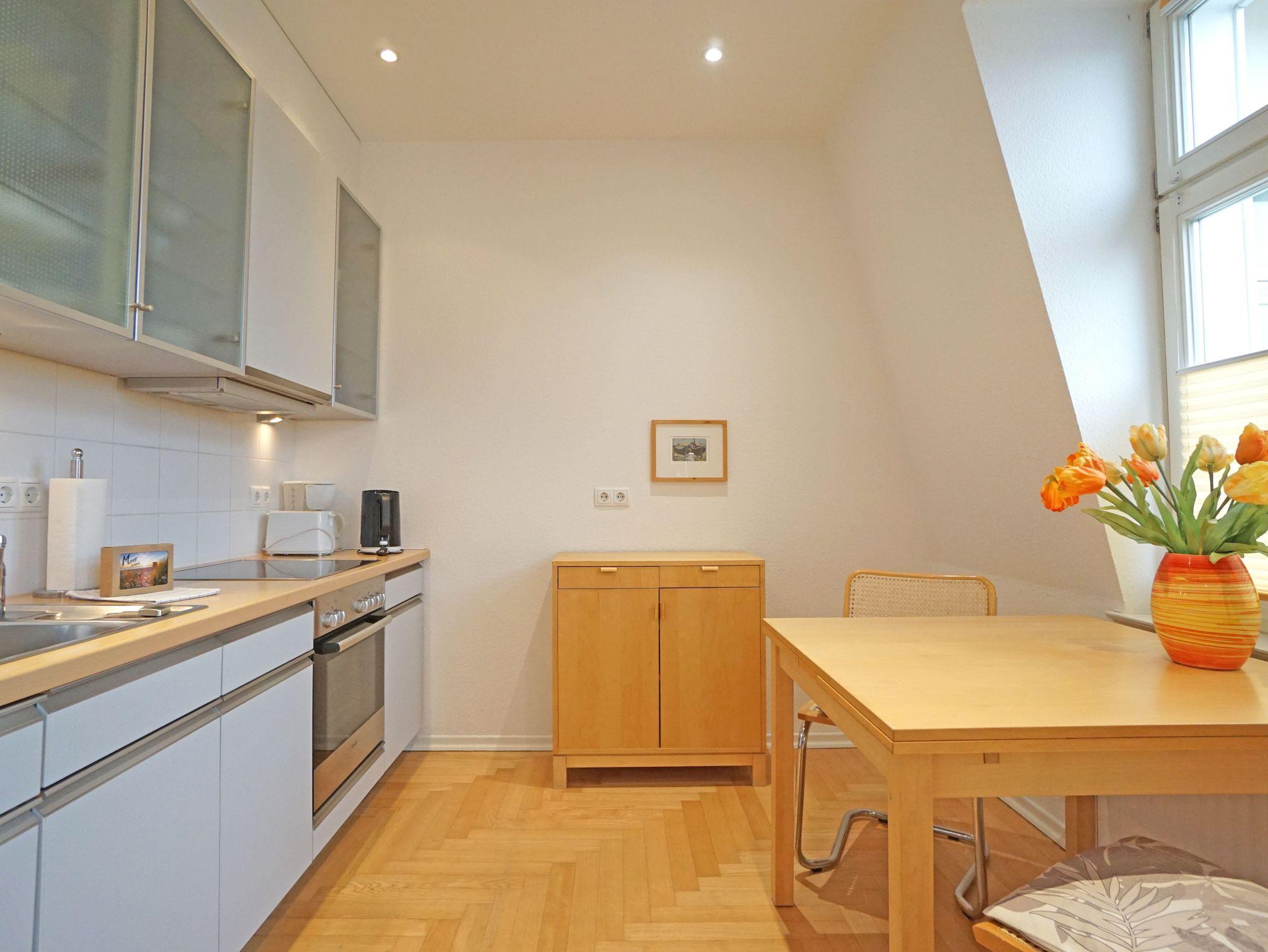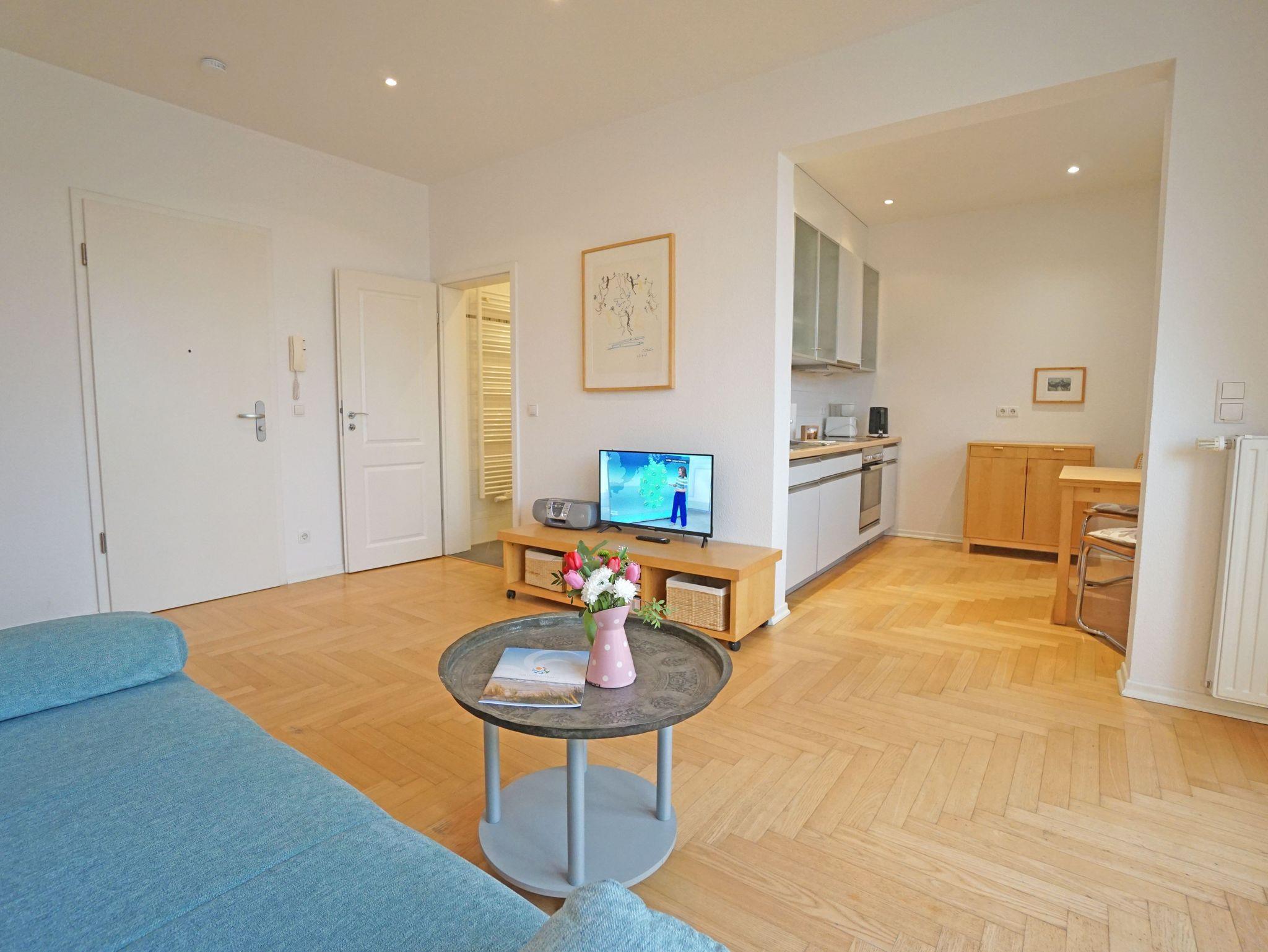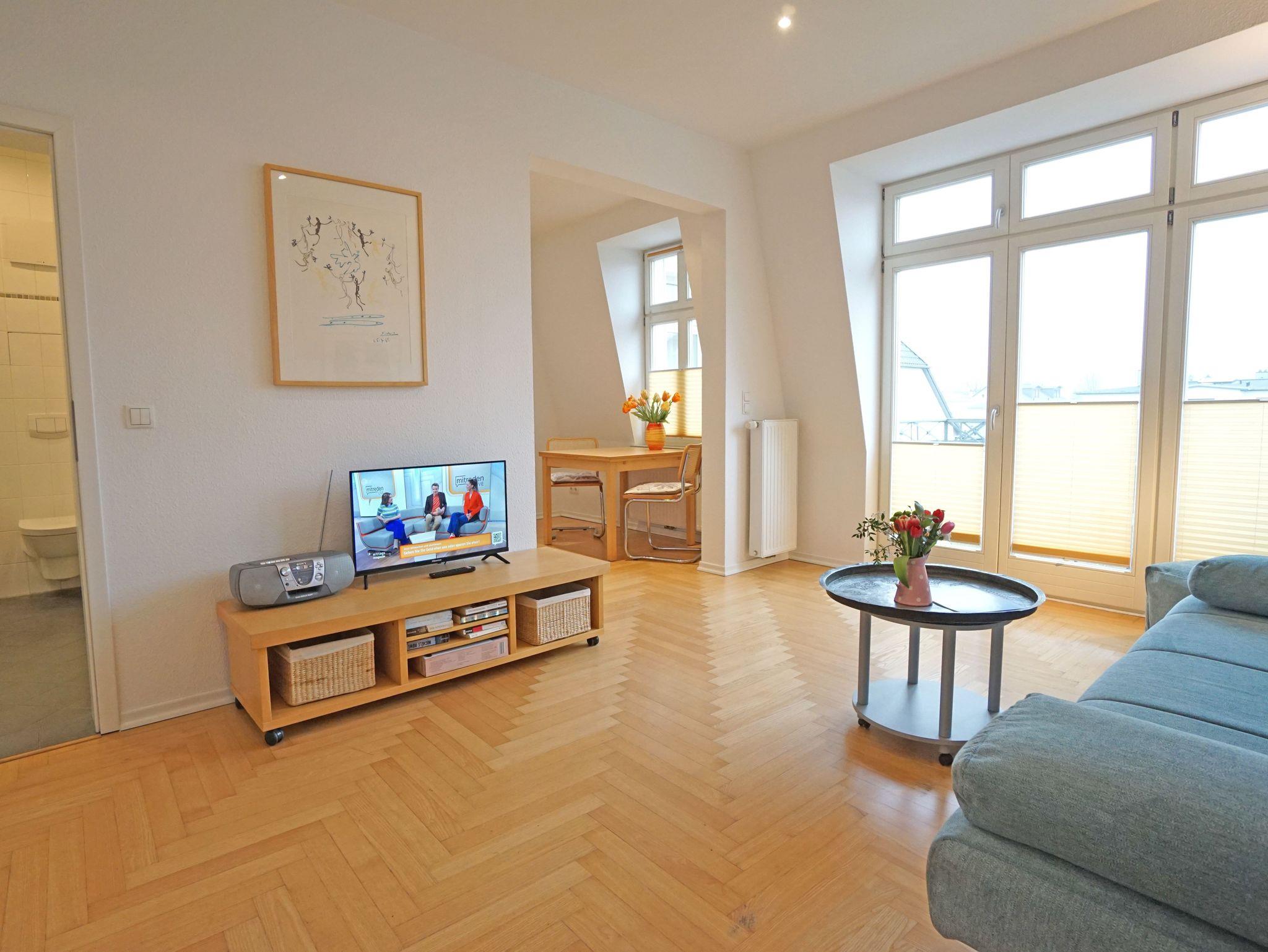 Die großzügige und modern eingerichtete 2-Zimmer Nichtraucherwohnung (42m²) liegt im obersten Stockwerk (2. Etage)der 2005 restaurierten Villa Quisisana. Die Wohnung verfügt über ein Schlafzimmer mit Doppelbett und einen sonnigen Balkon in Südwestlage. Im großen Wohnzimmer befindet sich eine komplett eingerichtete Küchenzeile, ein Essplatz sowie eine Sitzgruppe mit einer Schlafcouch (Liegefläche:1,20m).