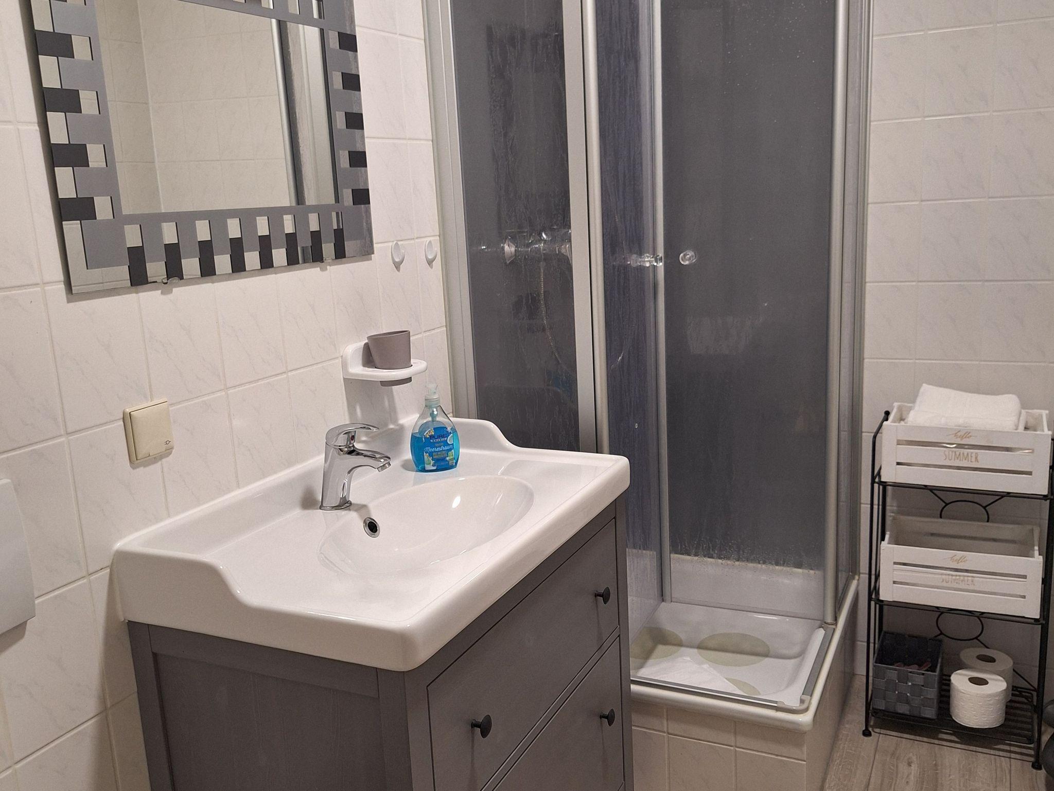 Kleiderschrank,Das Bad ist mit Dusche und WC sowie beheitzbaren Handtuchhalter ausgestattet.
