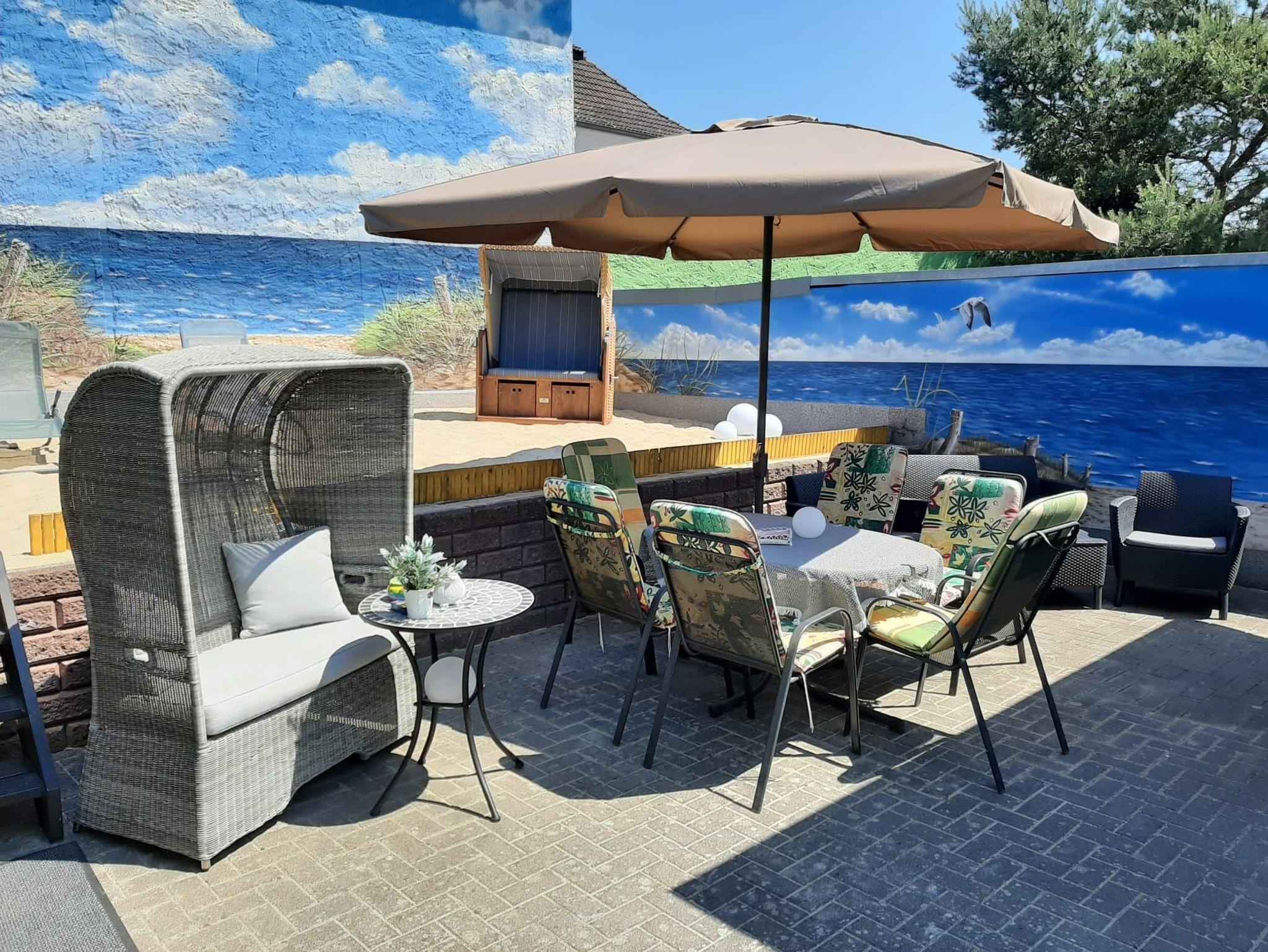 Eine große Terrasse mit zwei Strandkörben ,
