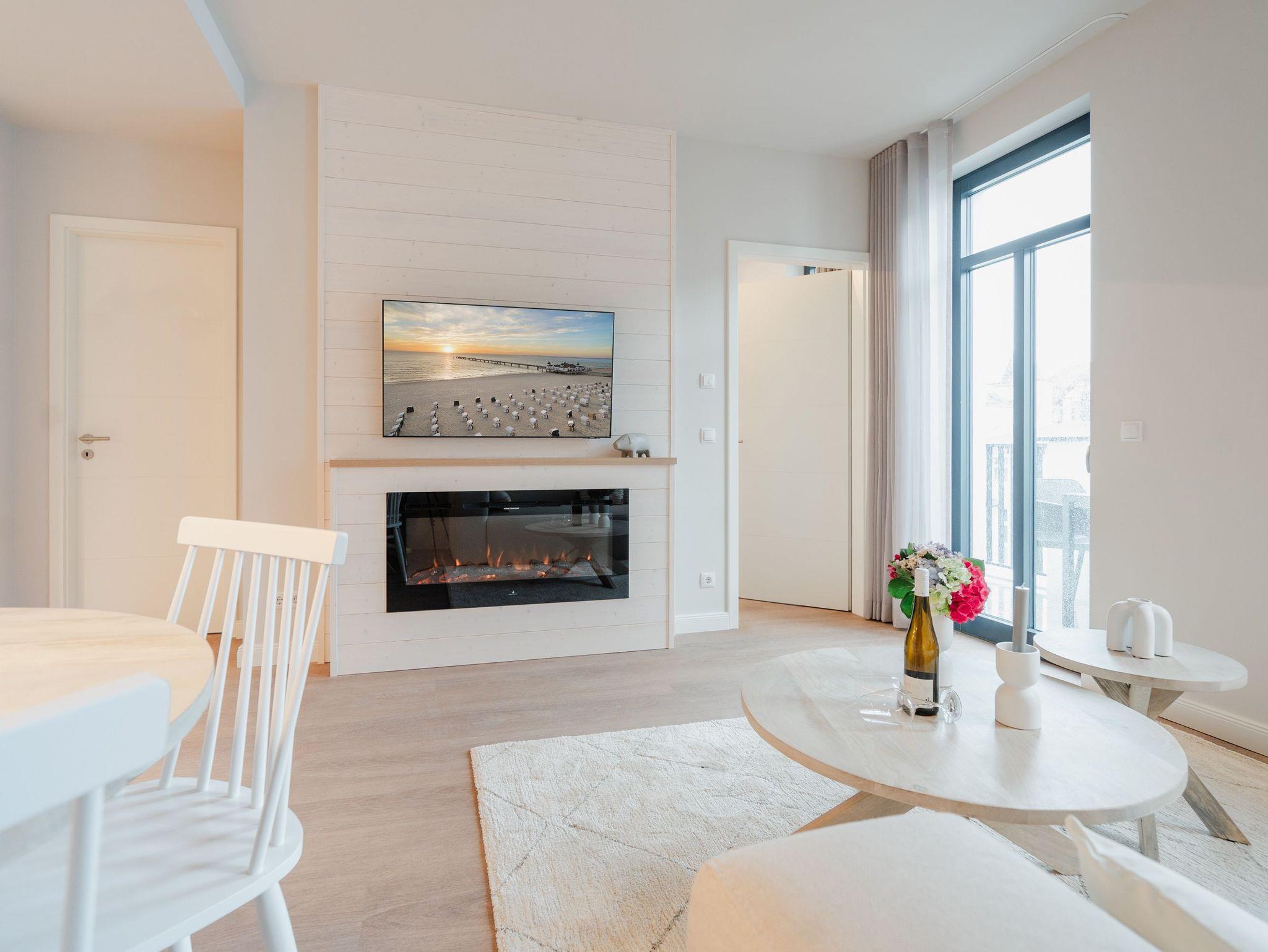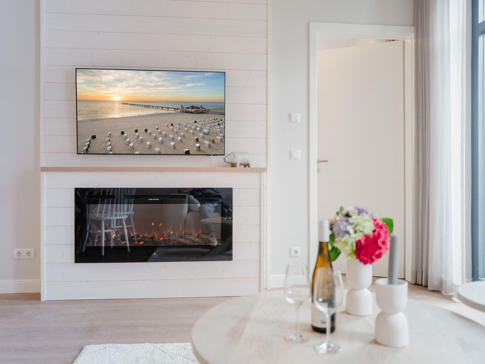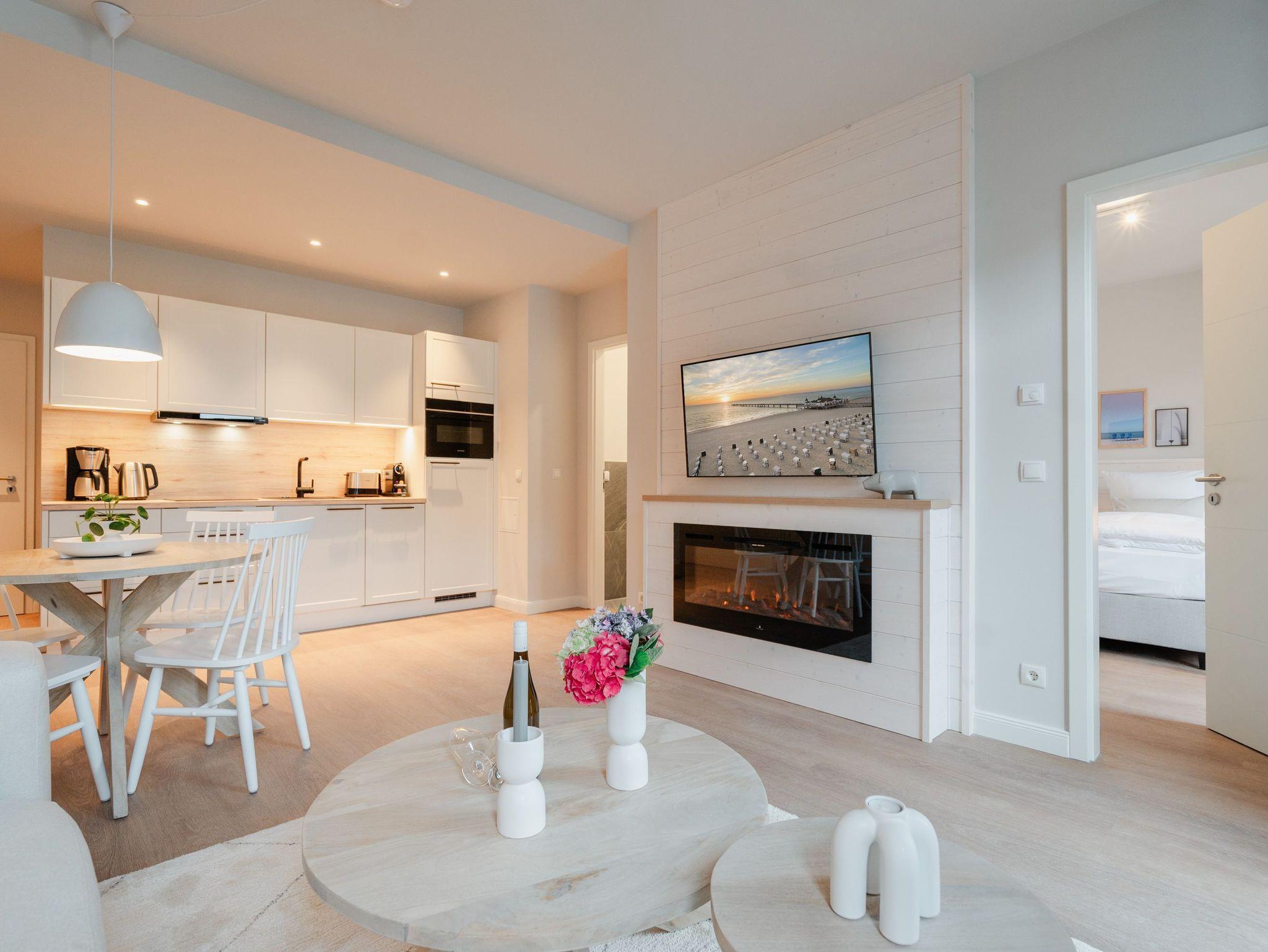 Modernes Wohndesign empfängt Sie auf den 48 Quadratmetern dieses wunderschönen 2-Raum-Appartements im zweiten Obergeschoss. Sie wünschen sich nichts sehnlicher, als einmal für ein paar Tage den Alltag hinter sich zu lassen und den Kopf bei einer frischen Meeresbrise auszuschalten? Für 2 Personen ist dieses Appartement ein kleines Urlaubsparadies. Das gesamte Wohnkonzept ist perfekt auf Ihre Bedürfnisse abgestimmt. Harmonie und Wohlfühlen stehen an oberster Stelle. Hochwertige Möbel, helle Naturtöne und mit viel Liebe ausgesuchte Accessoires ? hier ist alles exklusiv auf Wohlgefühl ausgerichtet. Denn wir wollen, dass Sie sich rundum gut aufgehoben fühlen. Der offene Wohn- und Essbereich lädt zum Verweilen ein und ist mit einer voll ausgestatteten Küchenzeile mit hochwertigen Siemens-Elektrogeräten ausgestattet, darunter ein Backofen, eine Spülmaschine und ein 3-Zonen-Induktionsherd. Am schönen Esstisch können Sie genießen, reden, spielen oder einfach zusammensitzen. Gleiches gilt für das gemütliche Sofa, das dazu einlädt, sich zurückzulehnen und einen spannenden Film auf dem 50-Zoll-Flachbildfernseher zu schauen. Der Elektro-Kamin schafft auch an lauen Sommerabenden eine urige Atmosphäre, denn er gibt keine Wärme ab, dafür aber umso mehr Gemütlichkeit. Sowohl vom Wohnzimmer als auch vom Schlafzimmer aus haben Sie einen Zugang auf den Nord-West-Balkon mit seitlichem Blick zur Ostsee. Genießen Sie in den bequemen Gartenmöbeln entspannte Stunden mit Meeresrauschen. Ein komfortables Boxspringdoppelbett (1,80m x 2,00m) sorgt im Schlafzimmer für erholsame Schlummerstunden. Auch hier befindet sich ein 43-Zoll-Flachbildfernseher. Ein Kleiderschrank und eine Kommode bieten ausreichend Stauraum. Im Tageslichtbad spendet eine Dusche Erfrischung von den Urlaubsaktivitäten. Außerdem ist das Bad mit einem WC und einen Waschtisch ausgestattet. Ihr Auto können Sie auf dem zum Appartement gehörenden PKW-Stellplatz in der Tiefgarage abstellen. Und jetzt? Wartet Ihr Urlaubsdomizil nur noch auf Ihre vorfreudige Ankunft.