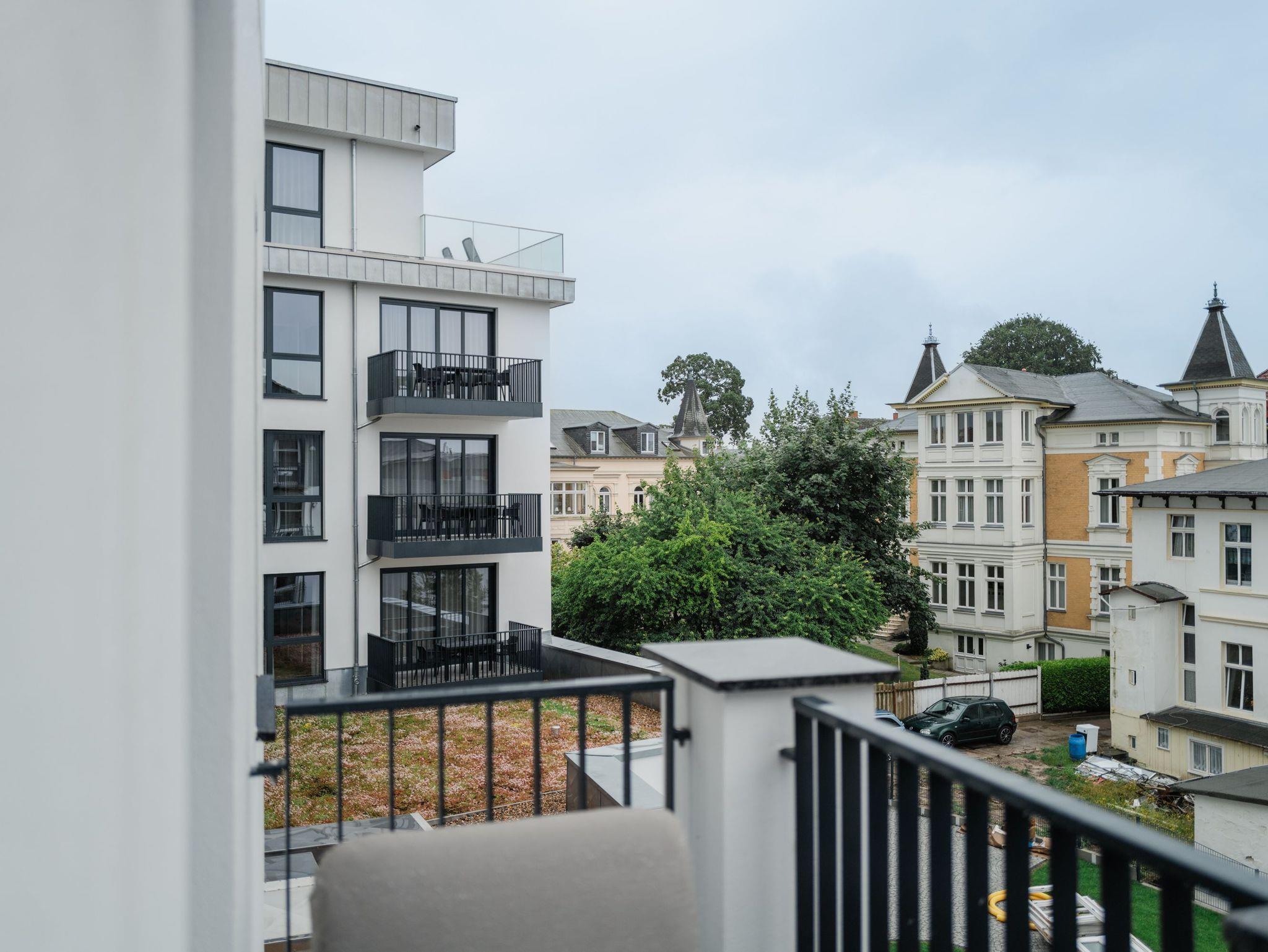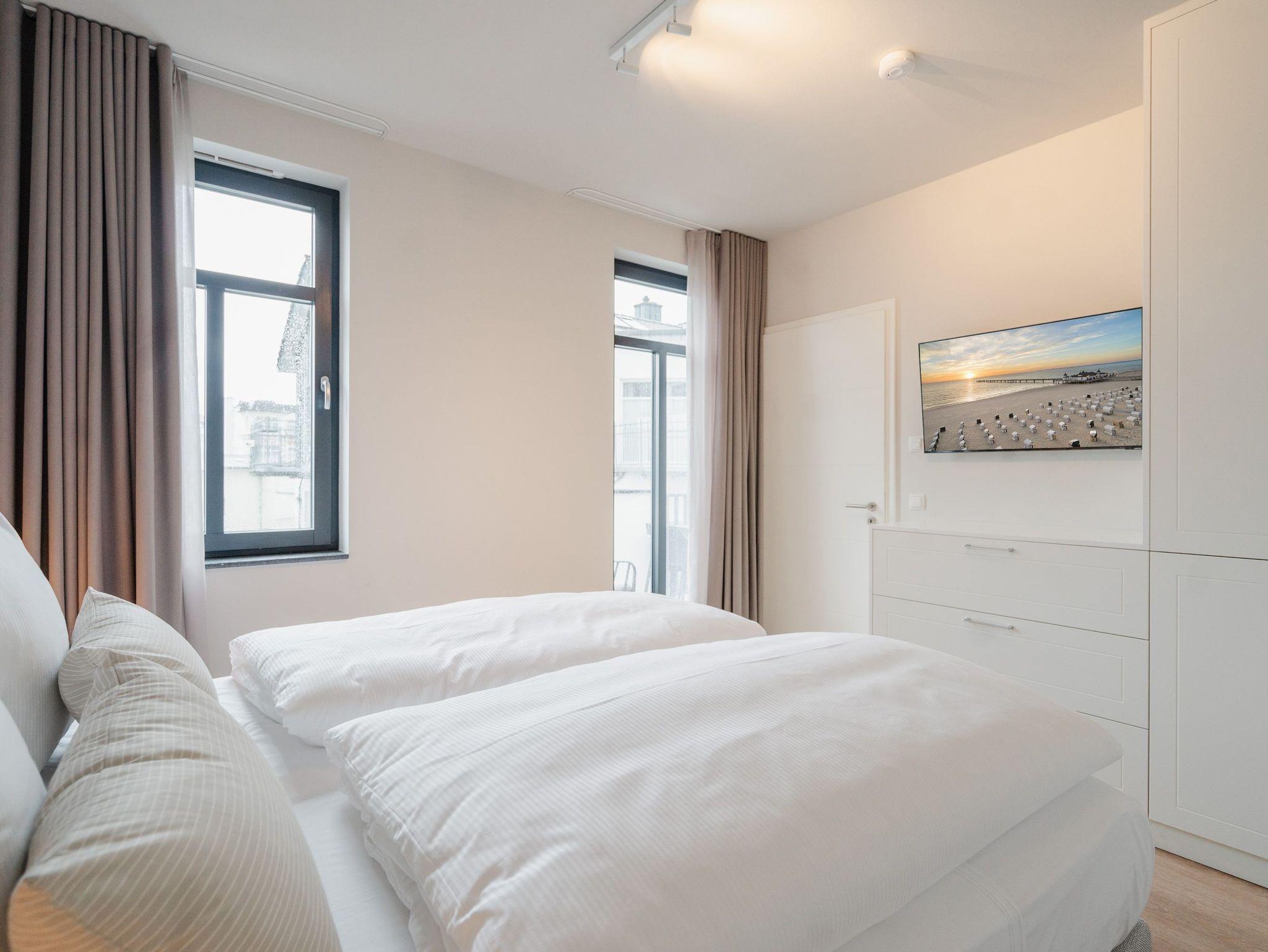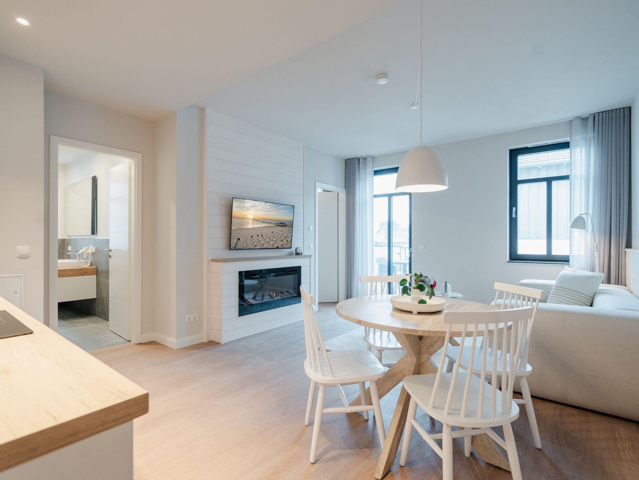 Modernes Wohndesign empfängt Sie auf den 48 Quadratmetern dieses wunderschönen 2-Raum-Appartements im zweiten Obergeschoss. Sie wünschen sich nichts sehnlicher, als einmal für ein paar Tage den Alltag hinter sich zu lassen und den Kopf bei einer frischen Meeresbrise auszuschalten? Für 2 Personen ist dieses Appartement ein kleines Urlaubsparadies. Das gesamte Wohnkonzept ist perfekt auf Ihre Bedürfnisse abgestimmt. Harmonie und Wohlfühlen stehen an oberster Stelle. Hochwertige Möbel, helle Naturtöne und mit viel Liebe ausgesuchte Accessoires ? hier ist alles exklusiv auf Wohlgefühl ausgerichtet. Denn wir wollen, dass Sie sich rundum gut aufgehoben fühlen. Der offene Wohn- und Essbereich lädt zum Verweilen ein und ist mit einer voll ausgestatteten Küchenzeile mit hochwertigen Siemens-Elektrogeräten ausgestattet, darunter ein Backofen, eine Spülmaschine und ein 3-Zonen-Induktionsherd. Am schönen Esstisch können Sie genießen, reden, spielen oder einfach zusammensitzen. Gleiches gilt für das gemütliche Sofa, das dazu einlädt, sich zurückzulehnen und einen spannenden Film auf dem 50-Zoll-Flachbildfernseher zu schauen. Der Elektro-Kamin schafft auch an lauen Sommerabenden eine urige Atmosphäre, denn er gibt keine Wärme ab, dafür aber umso mehr Gemütlichkeit. Sowohl vom Wohnzimmer als auch vom Schlafzimmer aus haben Sie einen Zugang auf den Nord-West-Balkon mit seitlichem Blick zur Ostsee. Genießen Sie in den bequemen Gartenmöbeln entspannte Stunden mit Meeresrauschen. Ein komfortables Boxspringdoppelbett (1,80m x 2,00m) sorgt im Schlafzimmer für erholsame Schlummerstunden. Auch hier befindet sich ein 43-Zoll-Flachbildfernseher. Ein Kleiderschrank und eine Kommode bieten ausreichend Stauraum. Im Tageslichtbad spendet eine Dusche Erfrischung von den Urlaubsaktivitäten. Außerdem ist das Bad mit einem WC und einen Waschtisch ausgestattet. Ihr Auto können Sie auf dem zum Appartement gehörenden PKW-Stellplatz in der Tiefgarage abstellen. Und jetzt? Wartet Ihr Urlaubsdomizil nur noch auf Ihre vorfreudige Ankunft.