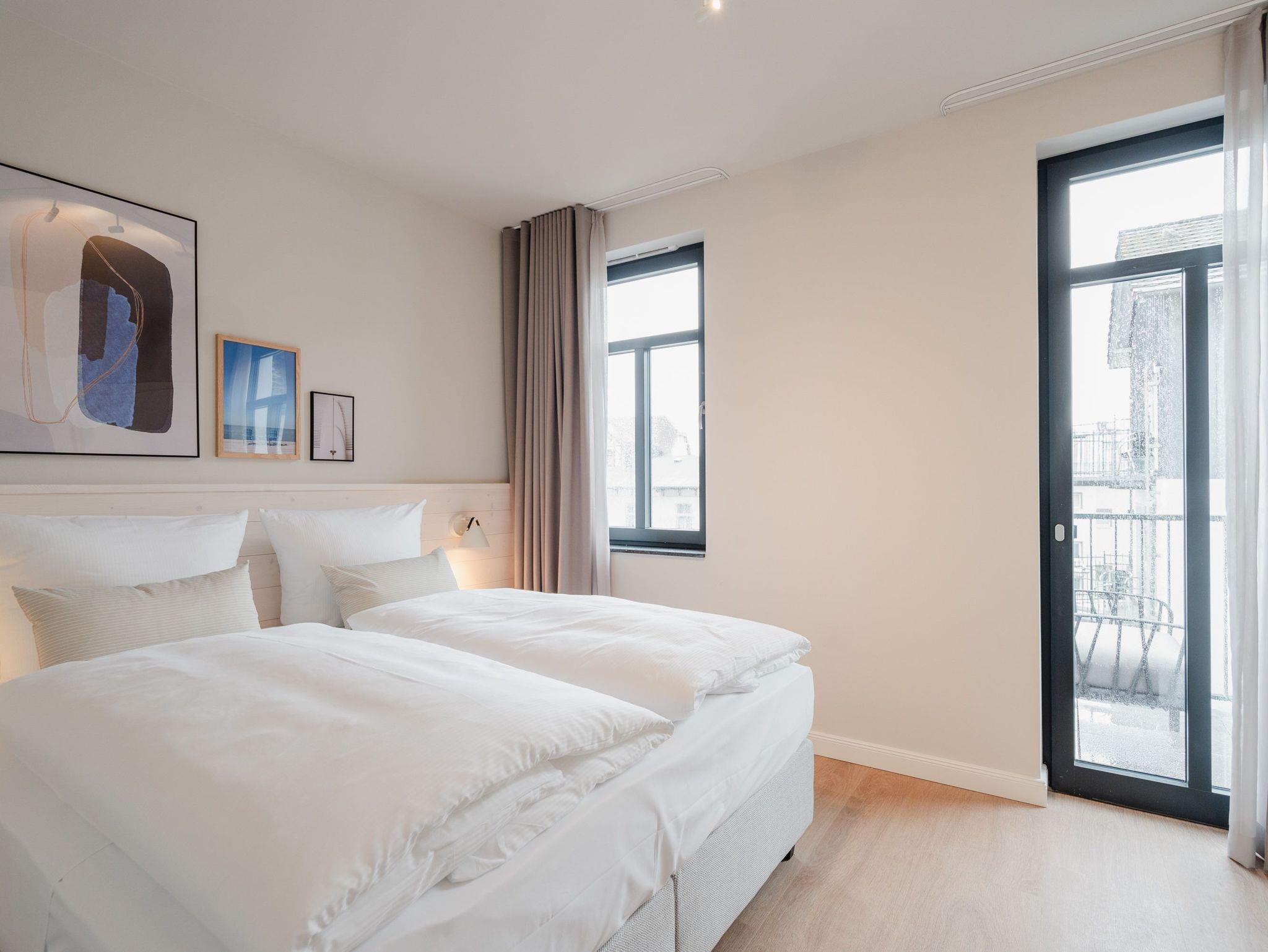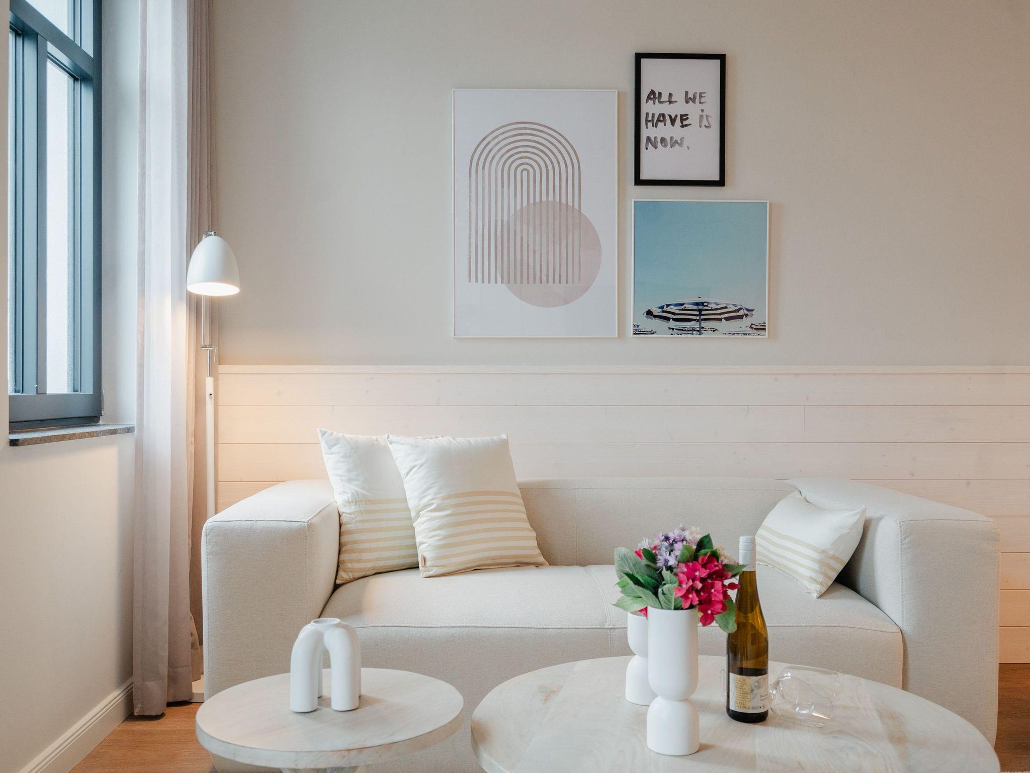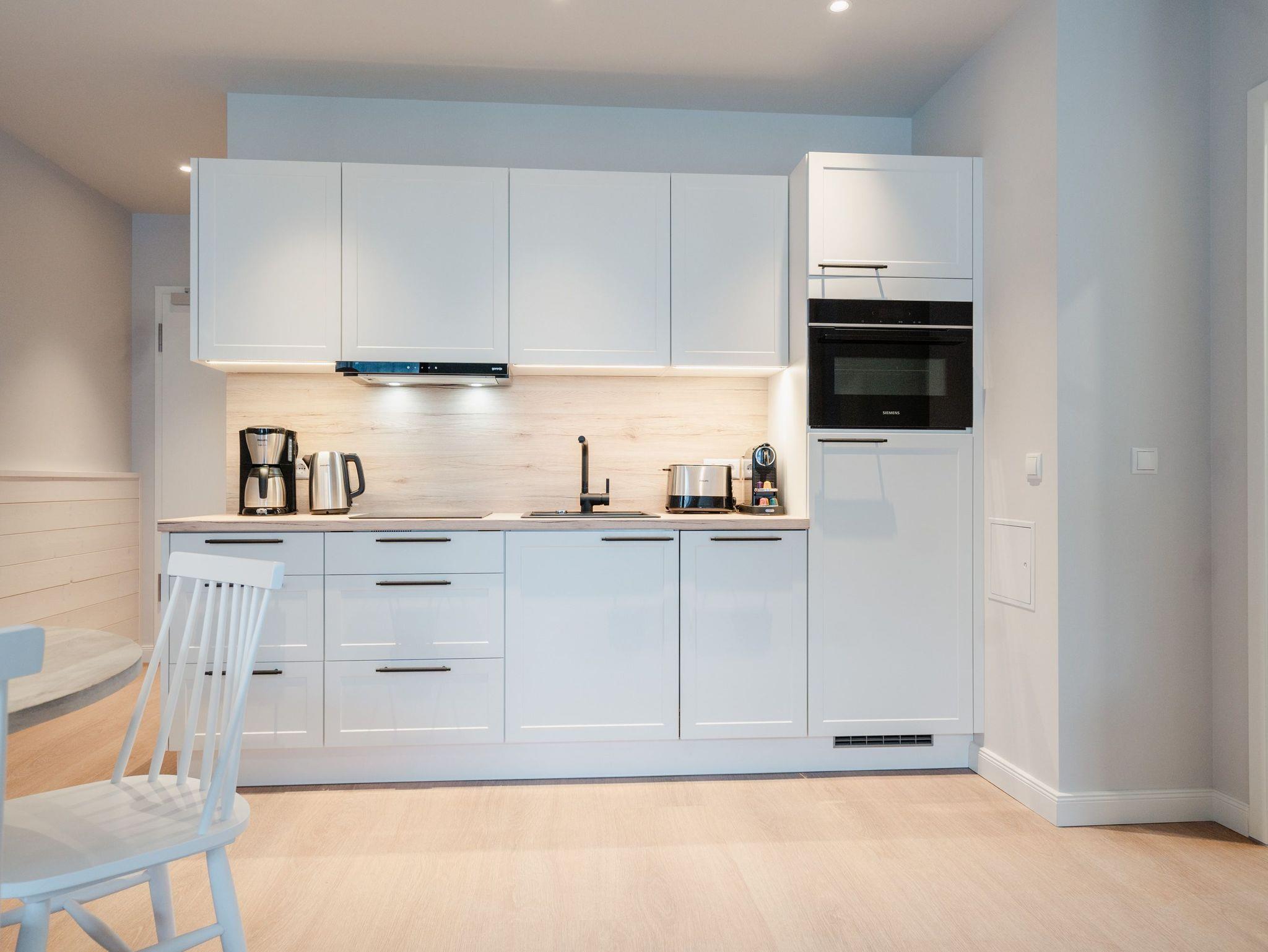 Modernes Wohndesign empfängt Sie auf den 48 Quadratmetern dieses wunderschönen 2-Raum-Appartements im zweiten Obergeschoss. Sie wünschen sich nichts sehnlicher, als einmal für ein paar Tage den Alltag hinter sich zu lassen und den Kopf bei einer frischen Meeresbrise auszuschalten? Für 2 Personen ist dieses Appartement ein kleines Urlaubsparadies. Das gesamte Wohnkonzept ist perfekt auf Ihre Bedürfnisse abgestimmt. Harmonie und Wohlfühlen stehen an oberster Stelle. Hochwertige Möbel, helle Naturtöne und mit viel Liebe ausgesuchte Accessoires hier ist alles exklusiv auf Wohlgefühl ausgerichtet. Denn wir wollen, dass Sie sich rundum gut aufgehoben fühlen. Der offene Wohn- und Essbereich lädt zum Verweilen ein und ist mit einer voll ausgestatteten Küchenzeile mit hochwertigen Siemens-Elektrogeräten ausgestattet, darunter ein Backofen, eine Spülmaschine und ein 3-Zonen-Induktionsherd. Am schönen Esstisch können Sie genießen, reden, spielen oder einfach zusammensitzen. Gleiches gilt für das gemütliche Sofa, das dazu einlädt, sich zurückzulehnen und einen spannenden Film auf dem 50-Zoll-Flachbildfernseher zu schauen. Der Elektro-Kamin schafft auch an lauen Sommerabenden eine urige Atmosphäre, denn er gibt keine Wärme ab, dafür aber umso mehr Gemütlichkeit. Sowohl vom Wohnzimmer als auch vom Schlafzimmer aus haben Sie einen Zugang auf den Nord-West-Balkon mit seitlichem Blick zur Ostsee. Genießen Sie in den bequemen Gartenmöbeln entspannte Stunden mit Meeresrauschen. Ein komfortables Boxspringdoppelbett (1,80m x 2,00m) sorgt im Schlafzimmer für erholsame Schlummerstunden. Auch hier befindet sich ein 43-Zoll-Flachbildfernseher. Ein Kleiderschrank und eine Kommode bieten ausreichend Stauraum. Im Tageslichtbad spendet eine Dusche Erfrischung von den Urlaubsaktivitäten. Außerdem ist das Bad mit einem WC und einen Waschtisch ausgestattet. Ihr Auto können Sie auf dem zum Appartement gehörenden PKW-Stellplatz in der Tiefgarage abstellen. Und jetzt? Wartet Ihr Urlaubsdomizil nur noch auf Ihre vorfreudige Ankunft.