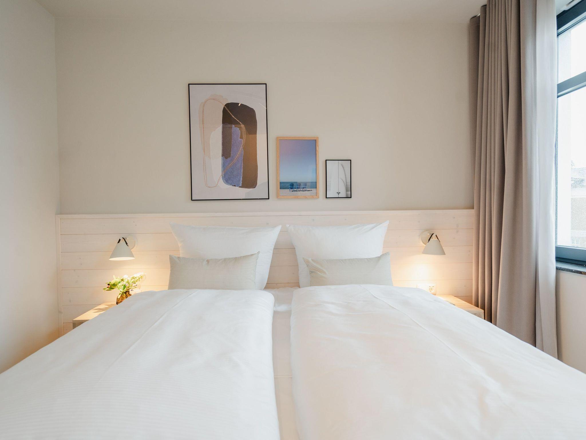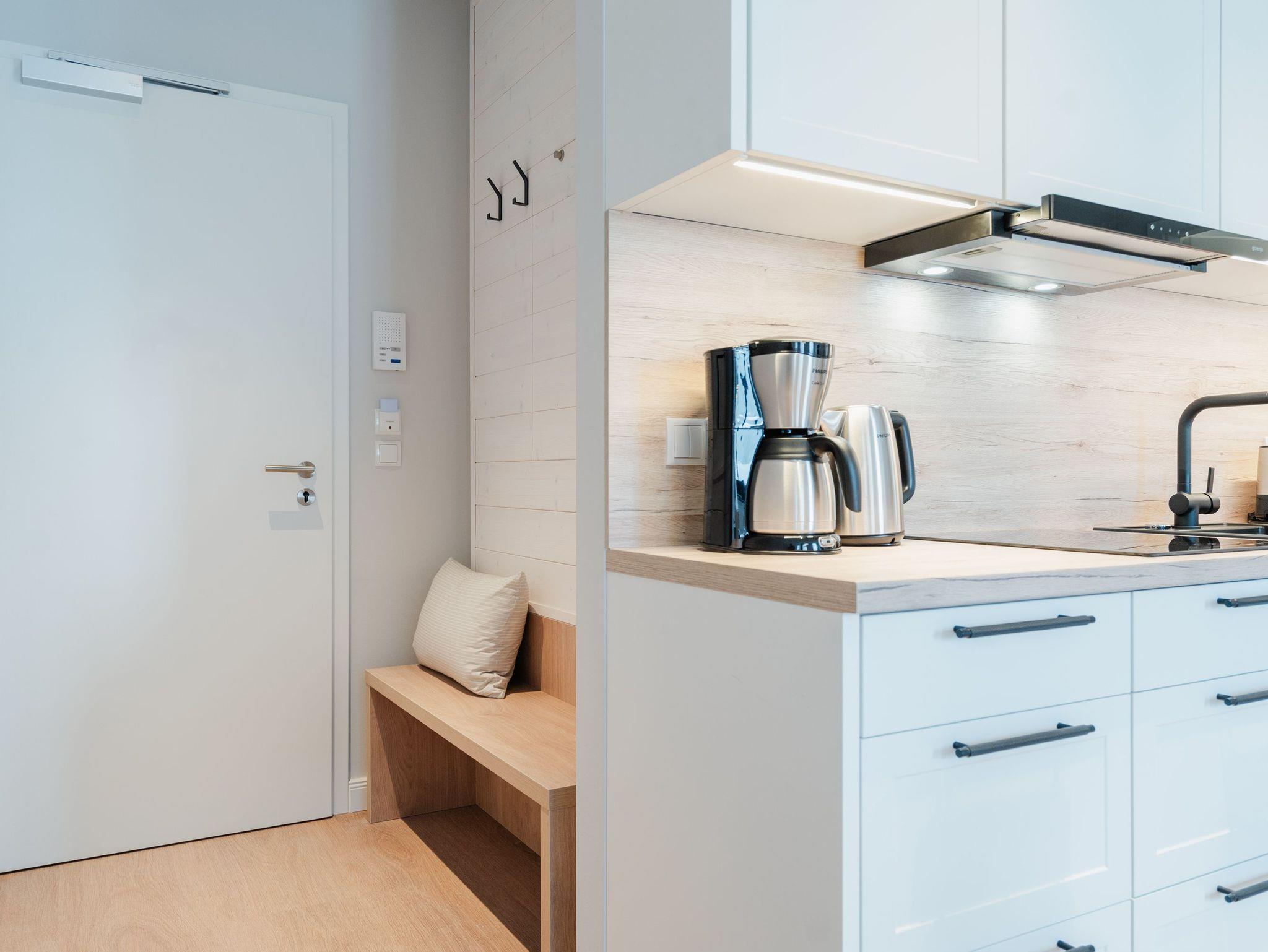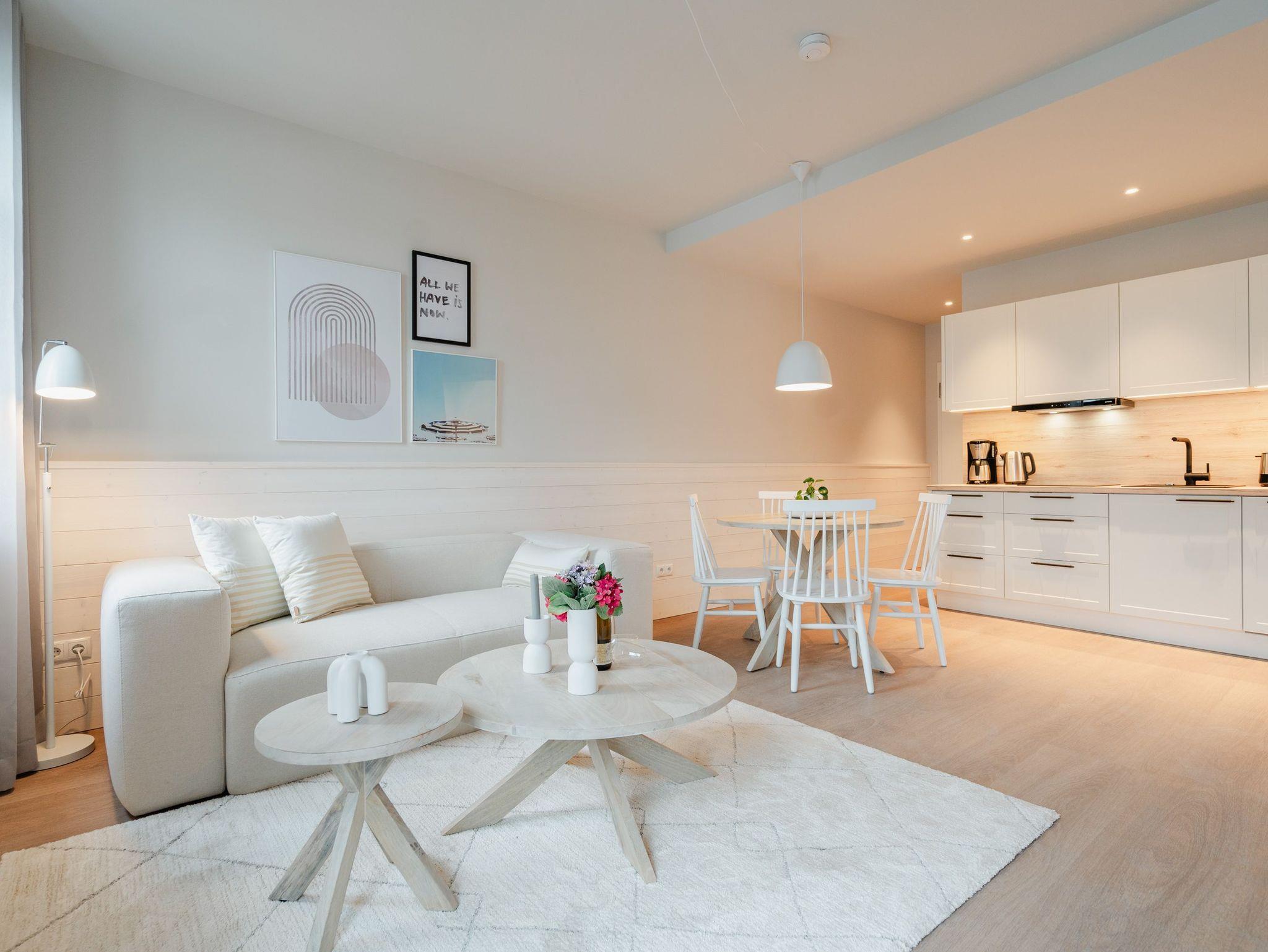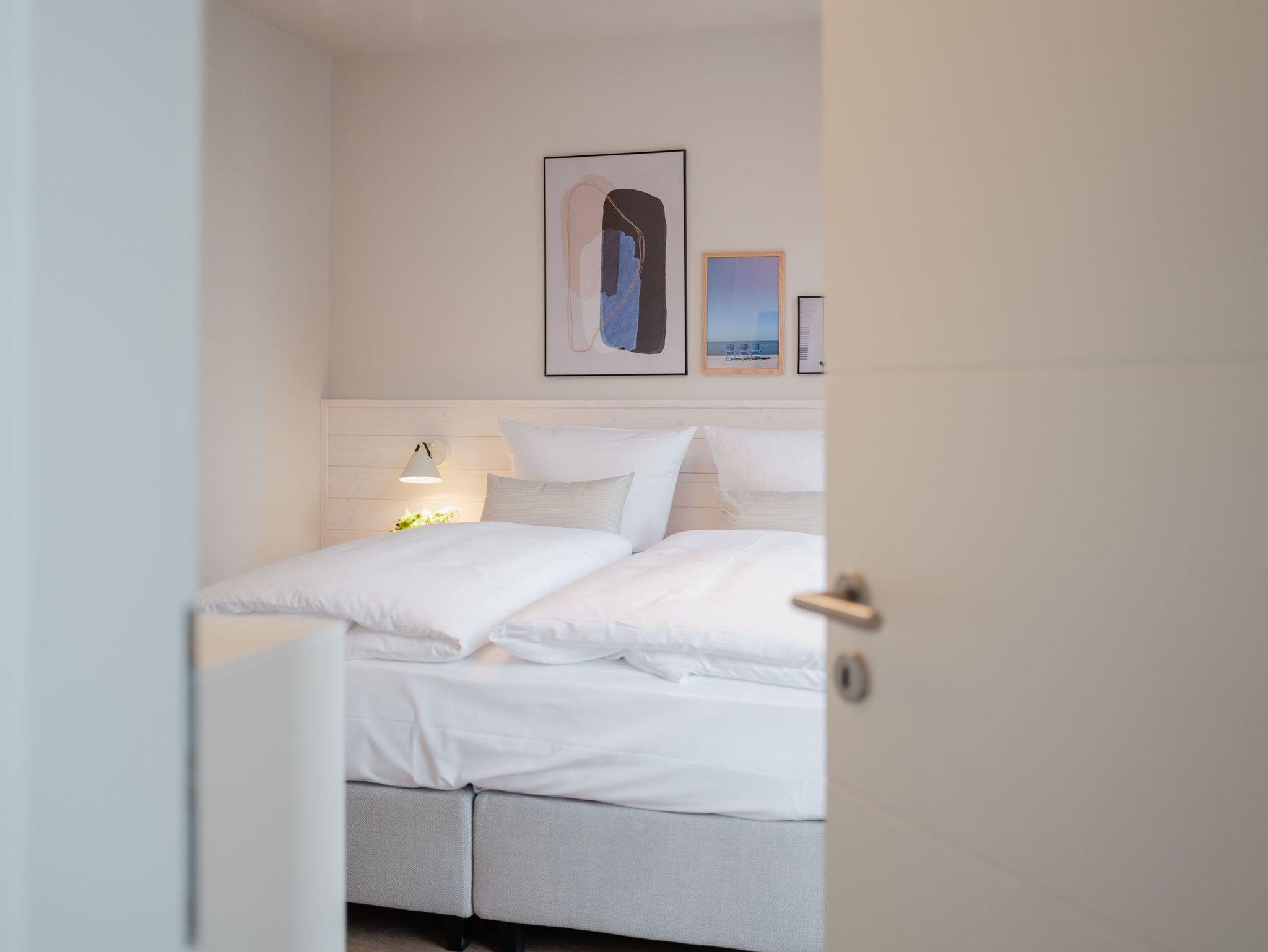 Modernes Wohndesign empfängt Sie auf den 48 Quadratmetern dieses wunderschönen 2-Raum-Appartements im zweiten Obergeschoss. Sie wünschen sich nichts sehnlicher, als einmal für ein paar Tage den Alltag hinter sich zu lassen und den Kopf bei einer frischen Meeresbrise auszuschalten? Für 2 Personen ist dieses Appartement ein kleines Urlaubsparadies. Das gesamte Wohnkonzept ist perfekt auf Ihre Bedürfnisse abgestimmt. Harmonie und Wohlfühlen stehen an oberster Stelle. Hochwertige Möbel, helle Naturtöne und mit viel Liebe ausgesuchte Accessoires hier ist alles exklusiv auf Wohlgefühl ausgerichtet. Denn wir wollen, dass Sie sich rundum gut aufgehoben fühlen. Der offene Wohn- und Essbereich lädt zum Verweilen ein und ist mit einer voll ausgestatteten Küchenzeile mit hochwertigen Siemens-Elektrogeräten ausgestattet, darunter ein Backofen, eine Spülmaschine und ein 3-Zonen-Induktionsherd. Am schönen Esstisch können Sie genießen, reden, spielen oder einfach zusammensitzen. Gleiches gilt für das gemütliche Sofa, das dazu einlädt, sich zurückzulehnen und einen spannenden Film auf dem 50-Zoll-Flachbildfernseher zu schauen. Der Elektro-Kamin schafft auch an lauen Sommerabenden eine urige Atmosphäre, denn er gibt keine Wärme ab, dafür aber umso mehr Gemütlichkeit. Sowohl vom Wohnzimmer als auch vom Schlafzimmer aus haben Sie einen Zugang auf den Nord-West-Balkon mit seitlichem Blick zur Ostsee. Genießen Sie in den bequemen Gartenmöbeln entspannte Stunden mit Meeresrauschen. Ein komfortables Boxspringdoppelbett (1,80m x 2,00m) sorgt im Schlafzimmer für erholsame Schlummerstunden. Auch hier befindet sich ein 43-Zoll-Flachbildfernseher. Ein Kleiderschrank und eine Kommode bieten ausreichend Stauraum. Im Tageslichtbad spendet eine Dusche Erfrischung von den Urlaubsaktivitäten. Außerdem ist das Bad mit einem WC und einen Waschtisch ausgestattet. Ihr Auto können Sie auf dem zum Appartement gehörenden PKW-Stellplatz in der Tiefgarage abstellen. Und jetzt? Wartet Ihr Urlaubsdomizil nur noch auf Ihre vorfreudige Ankunft.
