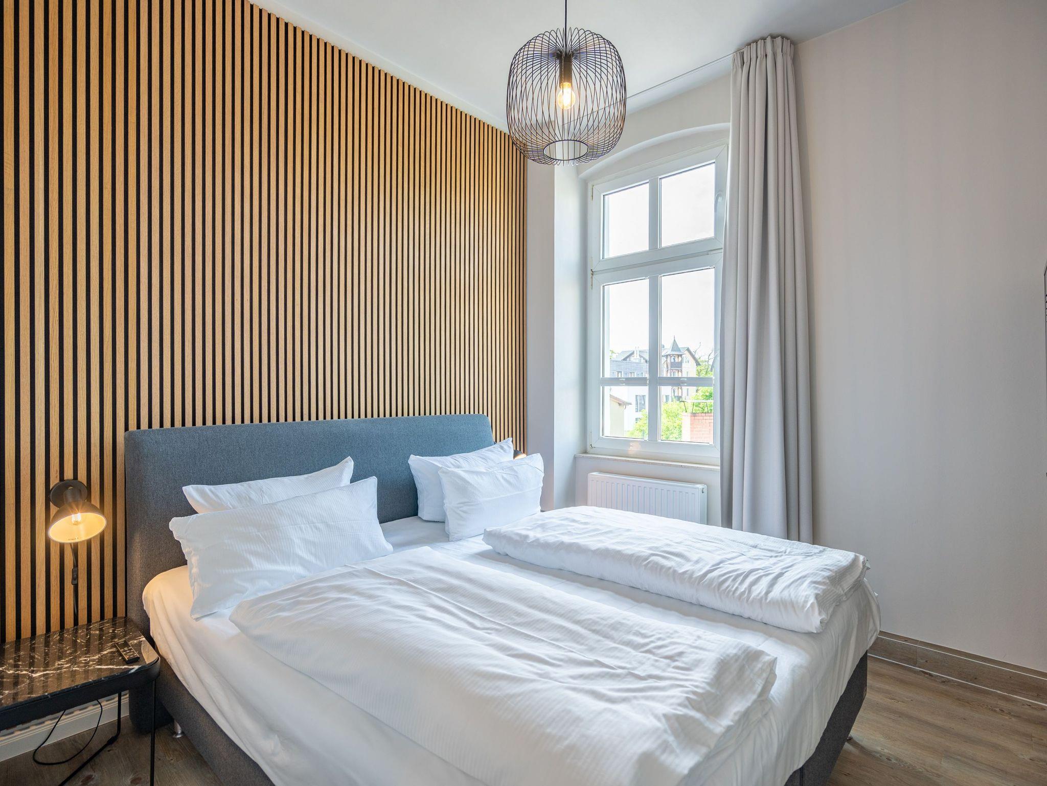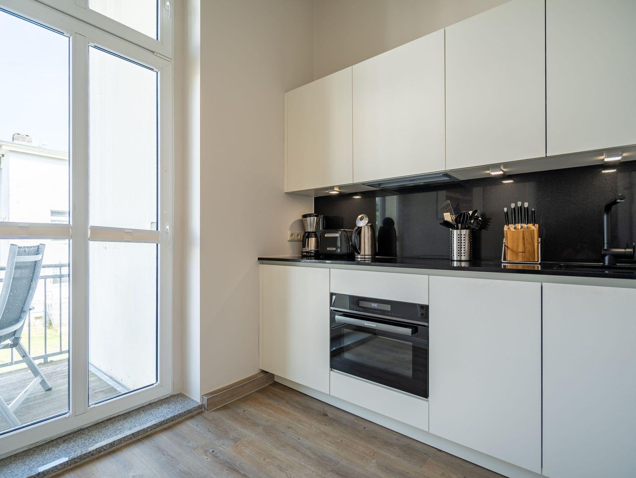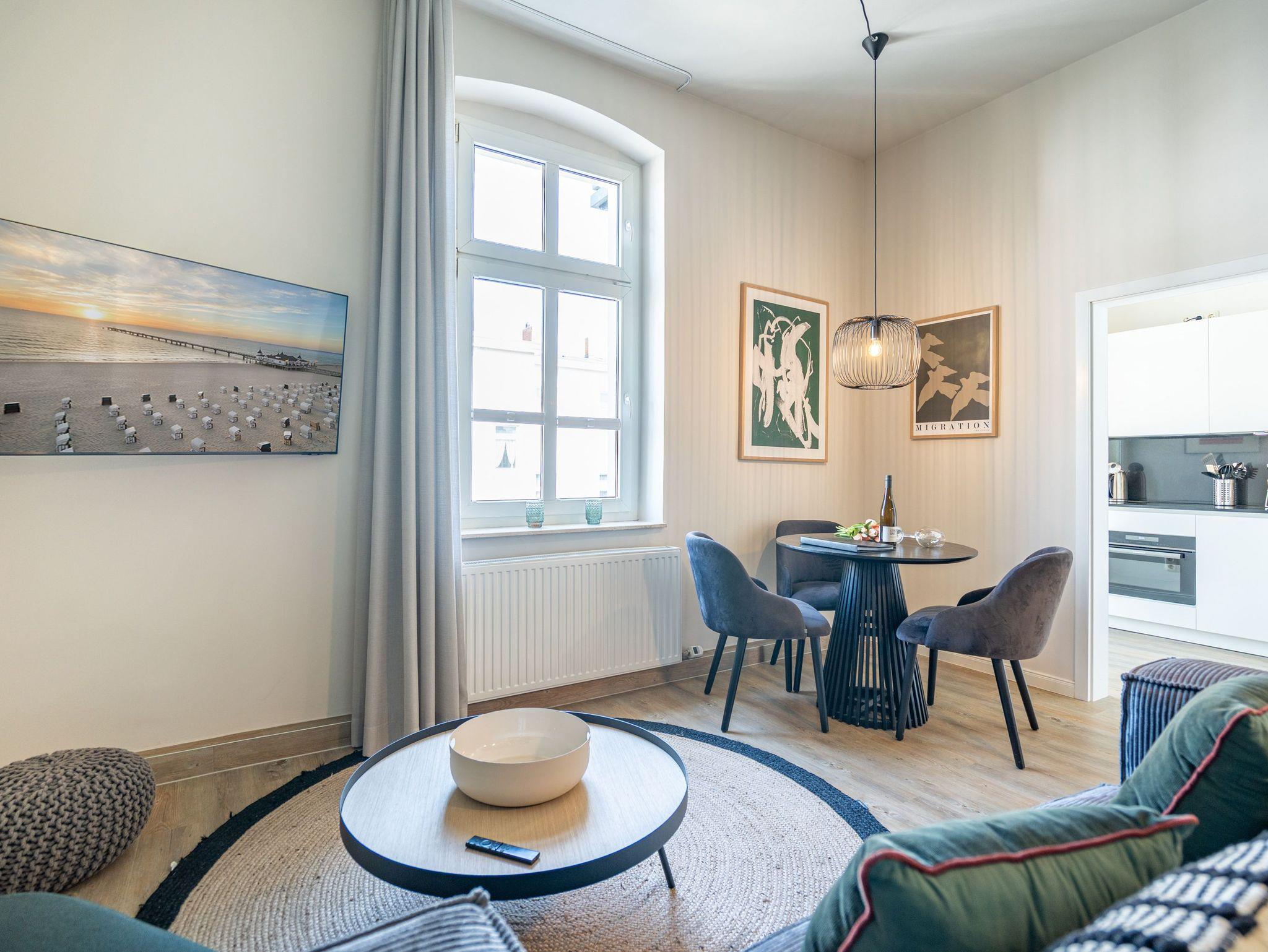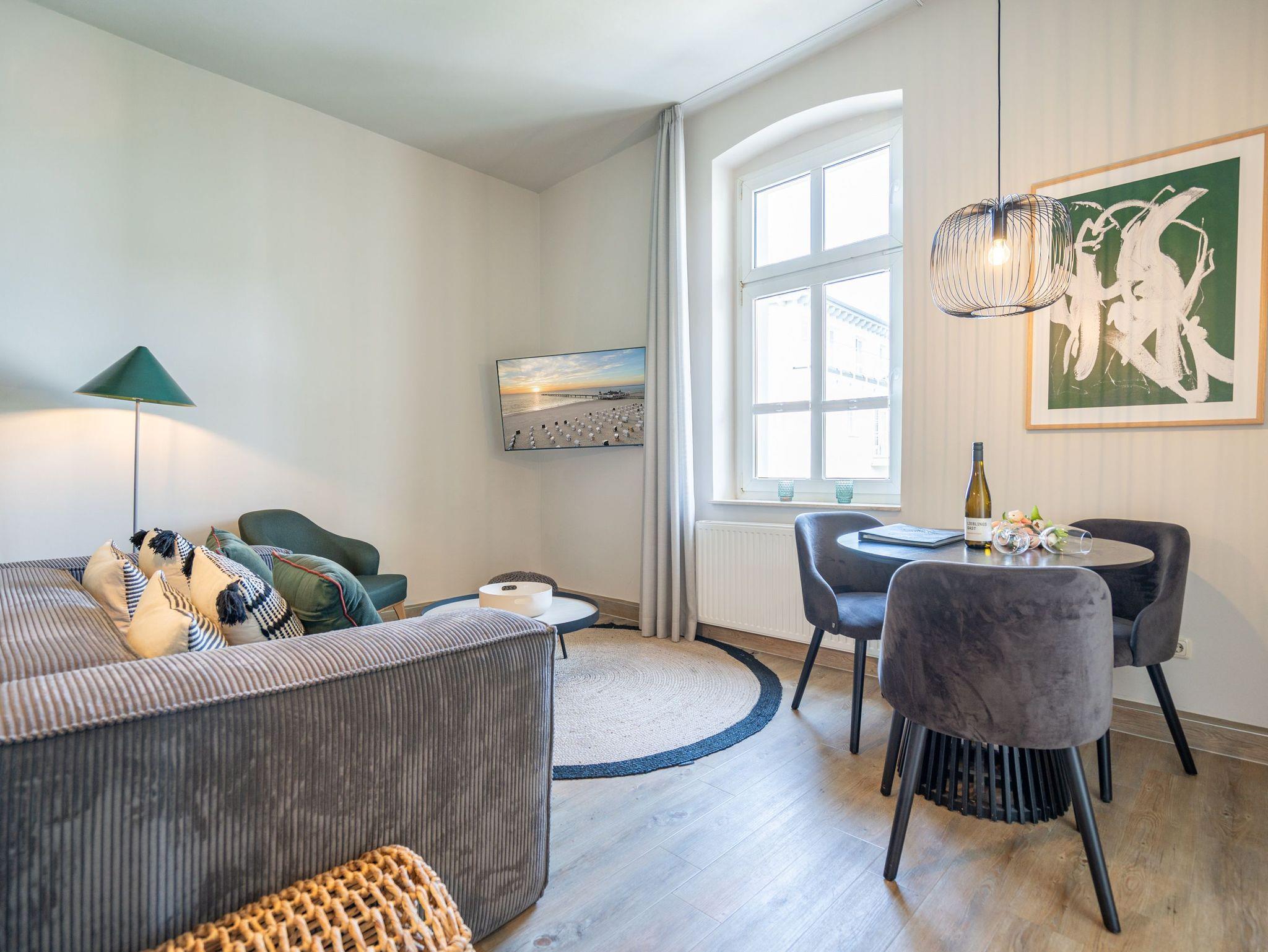 Diese stilvolle 2-Raum-Ferienwohnung (36 qm) für 2 Personen befindet sich im 1. Obergeschoss und liegt zur Nord-West-Seite. Der Wohnbereich bietet eine gemütliche Couch, einen Flachbildfernseher und einen ansprechenden Essplatz. Die separate Küche ist komplett ausgestattet und bietet Zugang zu einem kleinen Balkon, der nach Nord-Westen ausgerichtet ist. Im Schlafzimmer befindet sich ein komfortables Boxspringdoppelbett (1,80 m x 2,00 m), ein Kleiderregal und ein weiterer Flachbildfernseher. Das innenliegende Bad ist mit einer Dusche, Waschtisch und einer Toilette ausgestattet. Ein PKW-Stellplatz steht in der Tiefgarage neben dem Gebäude zur Verfügung. Darüber hinaus können Sie das WLAN kostenfrei nutzen.