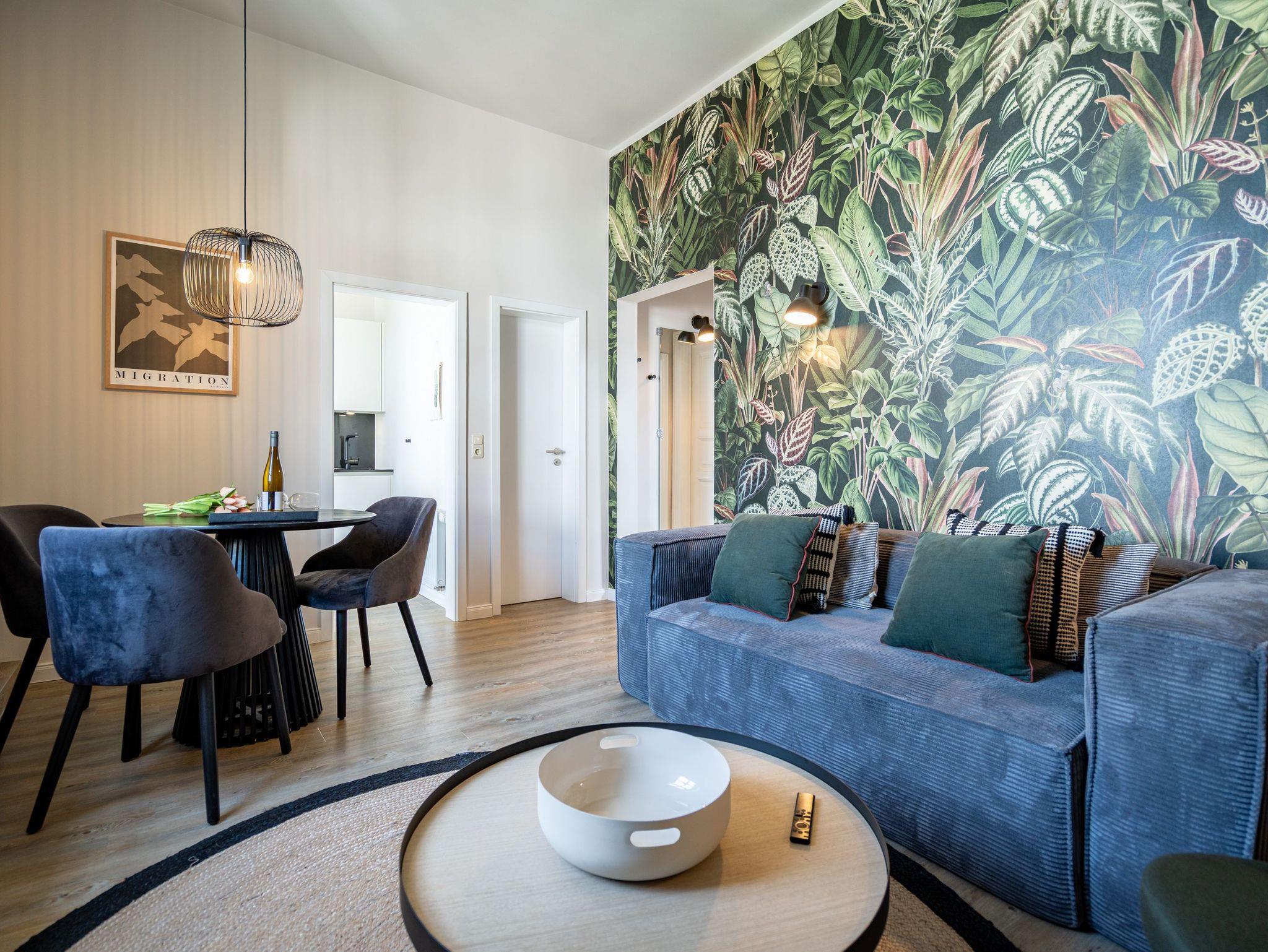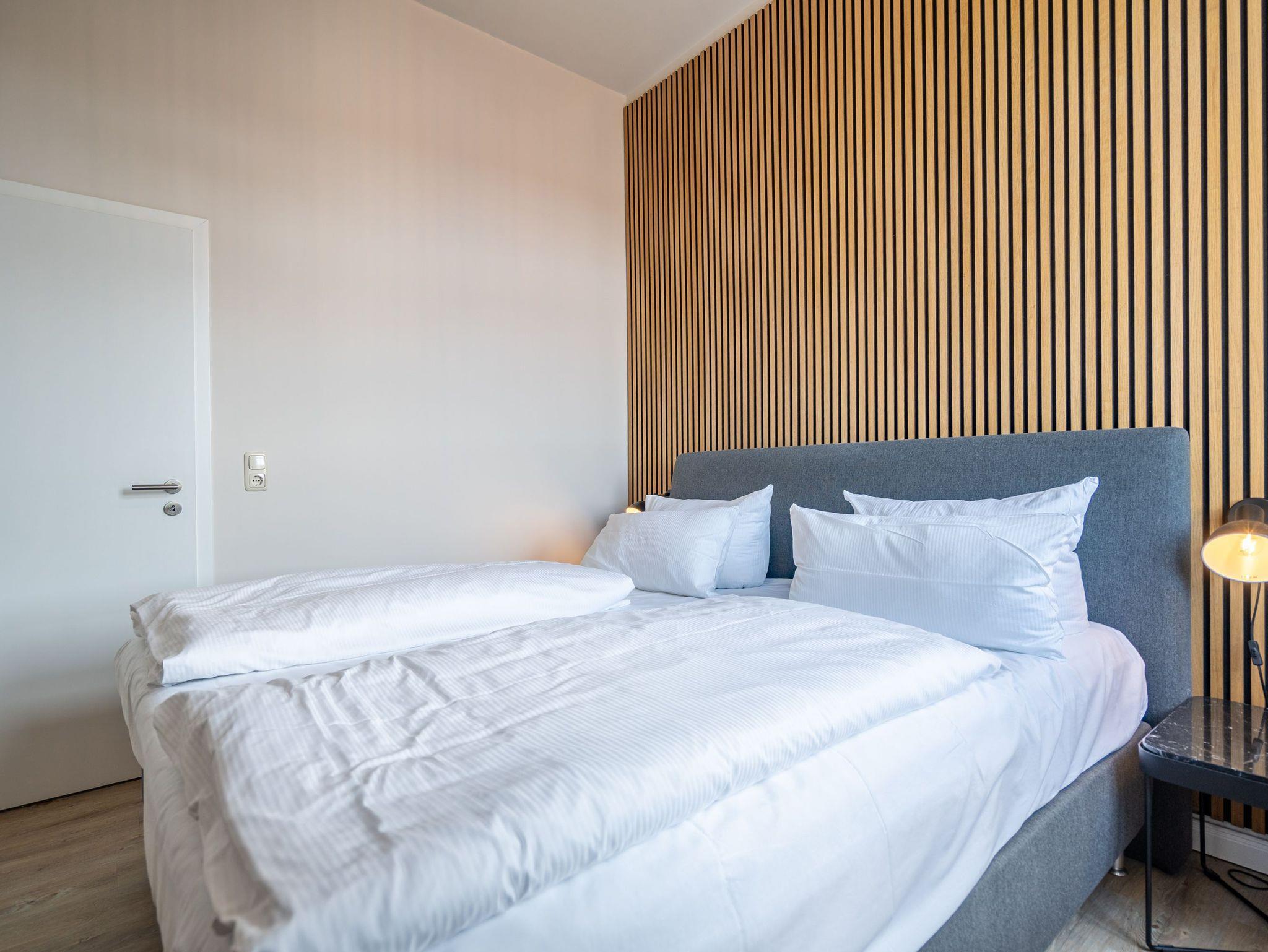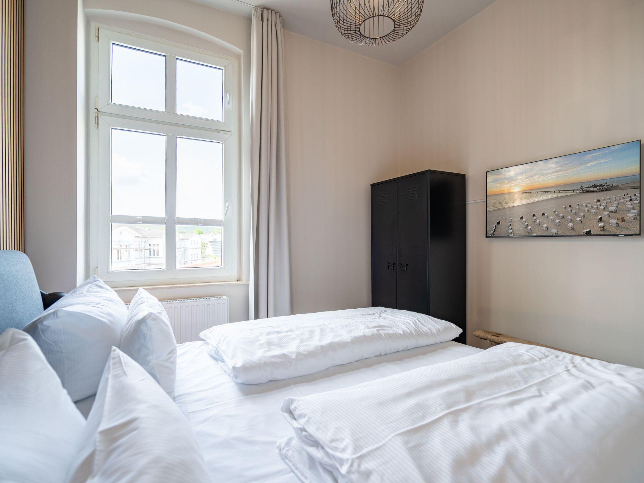 Diese stilvolle 2-Raum-Ferienwohnung (36 qm) für 2 Personen befindet sich im 1. Obergeschoss und liegt zur Nord-West-Seite. Der Wohnbereich bietet eine gemütliche Couch, einen Flachbildfernseher und einen ansprechenden Essplatz. Die separate Küche ist komplett ausgestattet und bietet Zugang zu einem kleinen Balkon, der nach Nord-Westen ausgerichtet ist. Im Schlafzimmer befindet sich ein komfortables Boxspringdoppelbett (1,80 m x 2,00 m), ein Kleiderregal und ein weiterer Flachbildfernseher. Das innenliegende Bad ist mit einer Dusche, Waschtisch und einer Toilette ausgestattet. Ein PKW-Stellplatz steht in der Tiefgarage neben dem Gebäude zur Verfügung. Darüber hinaus können Sie das WLAN kostenfrei nutzen.