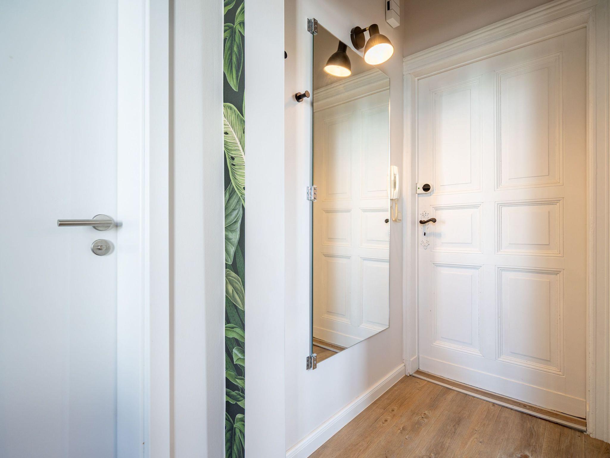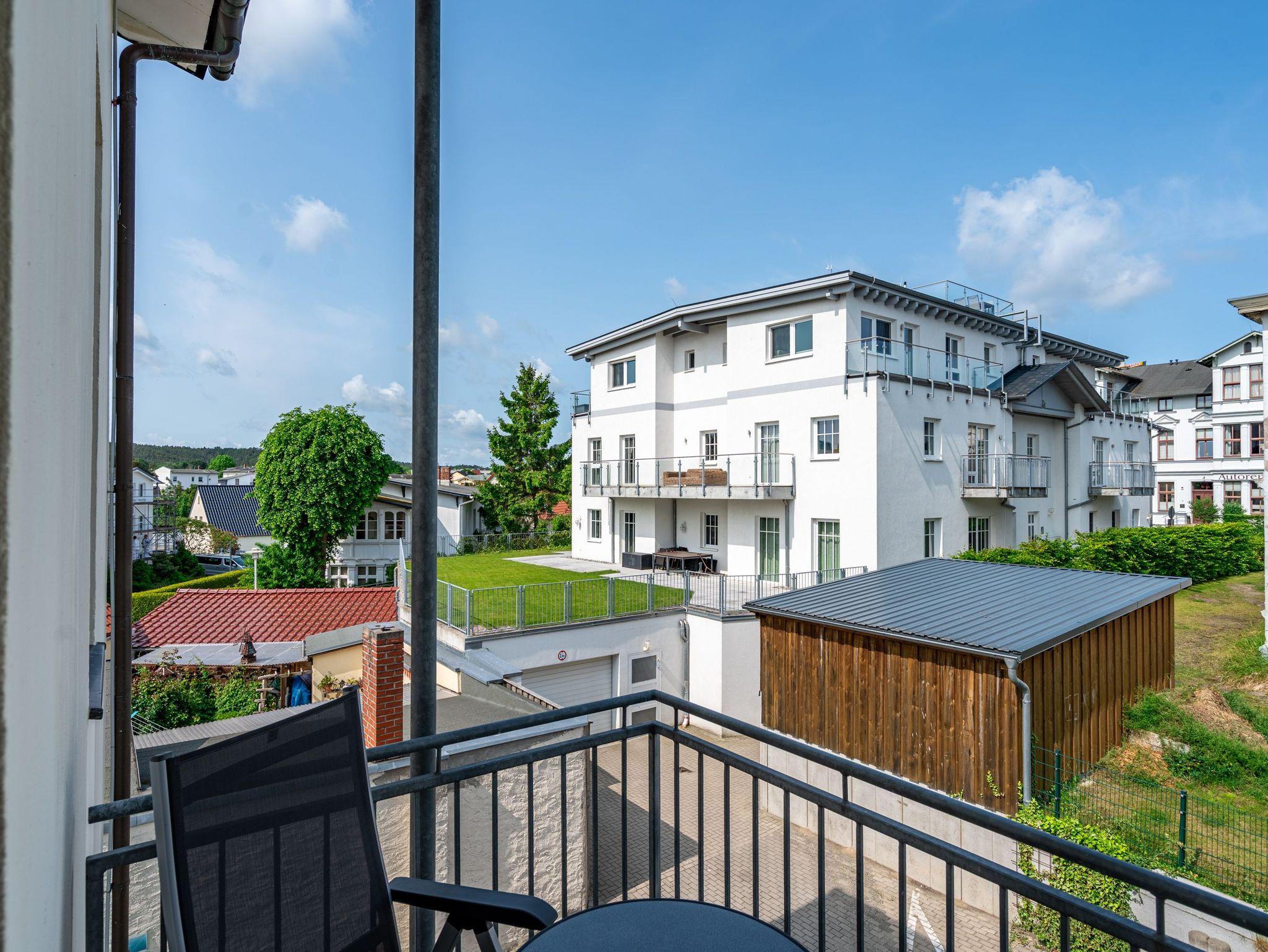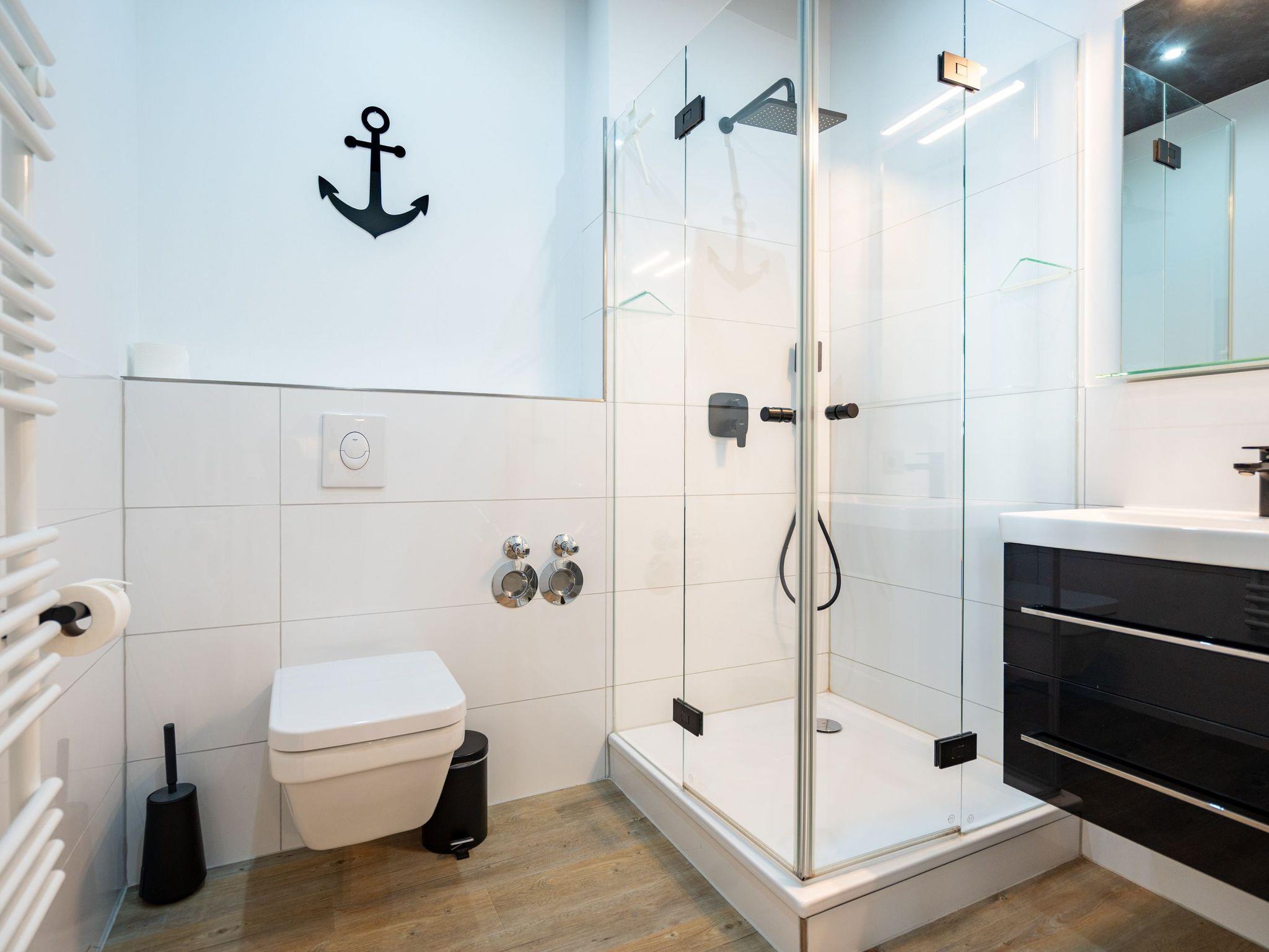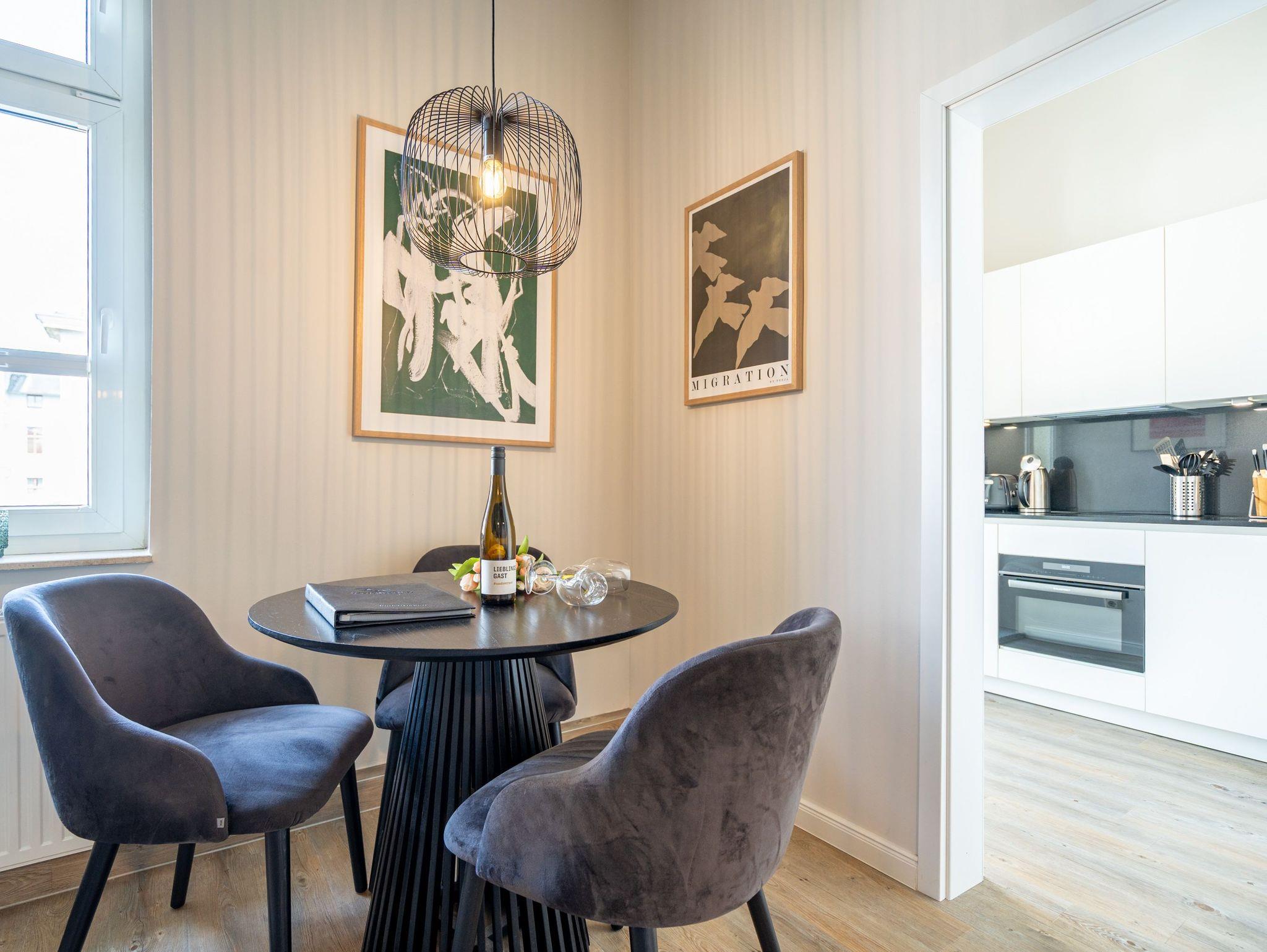 Diese stilvolle 2-Raum-Ferienwohnung (36 qm) für 2 Personen befindet sich im 1. Obergeschoss und liegt zur Nord-West-Seite. Der Wohnbereich bietet eine gemütliche Couch, einen Flachbildfernseher und einen ansprechenden Essplatz. Die separate Küche ist komplett ausgestattet und bietet Zugang zu einem kleinen Balkon, der nach Nord-Westen ausgerichtet ist. Im Schlafzimmer befindet sich ein komfortables Boxspringdoppelbett (1,80 m x 2,00 m), ein Kleiderregal und ein weiterer Flachbildfernseher. Das innenliegende Bad ist mit einer Dusche, Waschtisch und einer Toilette ausgestattet. Ein PKW-Stellplatz steht in der Tiefgarage neben dem Gebäude zur Verfügung. Darüber hinaus können Sie das WLAN kostenfrei nutzen.