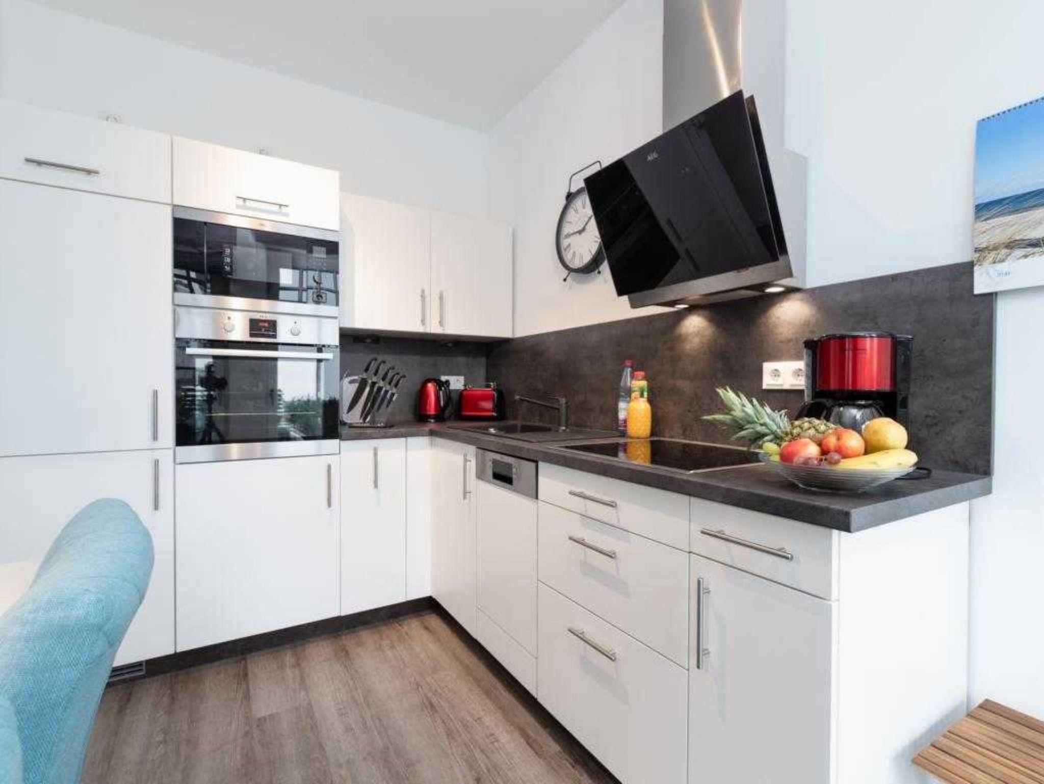 Die moderne 3-Raum-Raumwohnung mit 68 qm bietet Platz für 4 Personen und ist Richtung Garten ausgerichet. Sie verfügt über einen hellen Wohn-Essbereich mit gemütliche große Couch, Flat-TV und Elektrokamin sowie offener, voll ausgestatteter Küche. Die beiden modern eingerichteten Schlafzimmer sind mit Doppelbetten und Flat-TV ausgestattet. Das geräumige Bad verfügt über Dusche und WC sowie eine finnische Sauna. Ein separates Gäste-WC ist ebenfalls vorhanden. Die komplette Wohnung ist mit Fußbodenheizung ausgestattet.