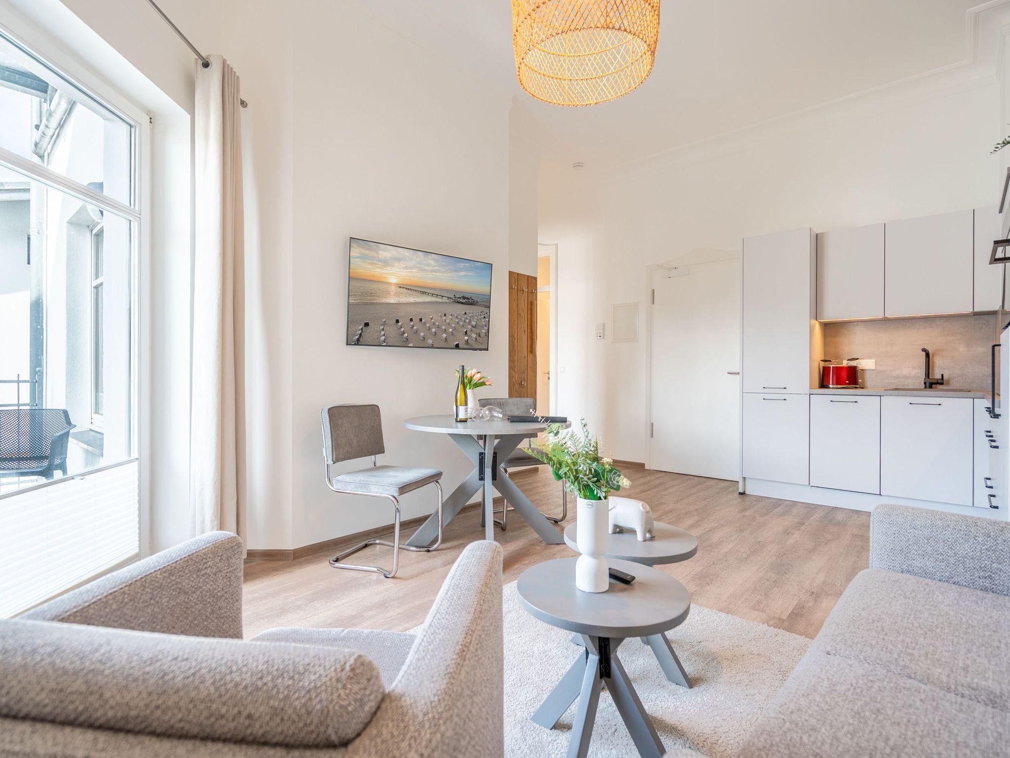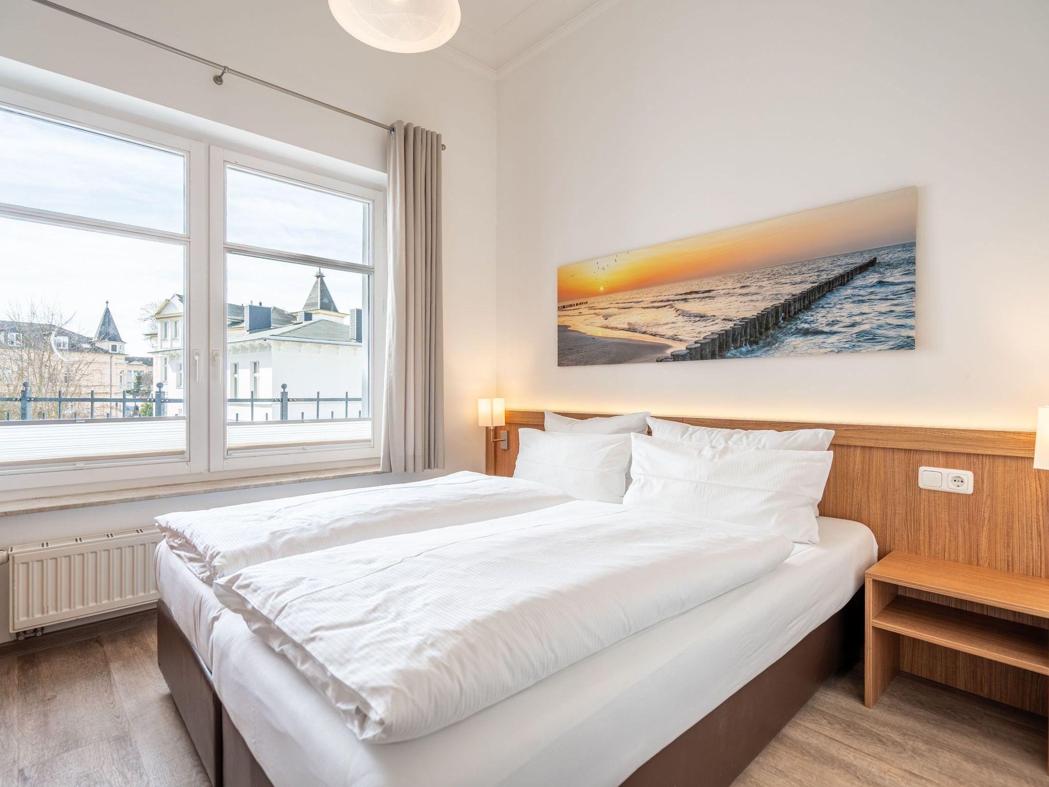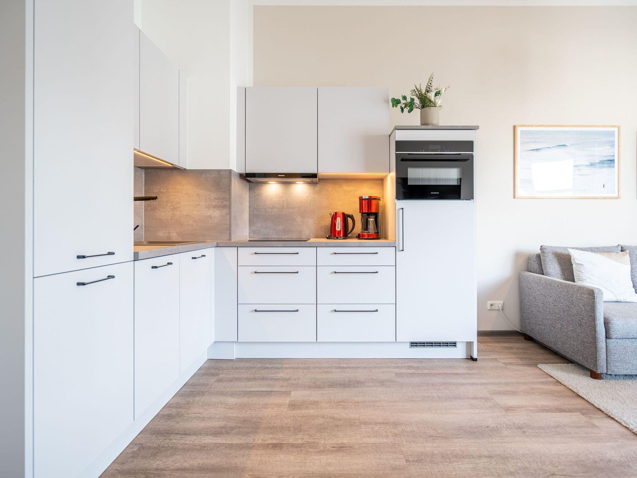 Die 2-Raum-Ferienwohnung Nr. C04 in der Villa Seedüwel bietet auf 38 qm Platz für zwei Personen und befindet sich im 1. Obergeschoss. Der offene Wohnbereich umfasst eine Küchenzeile mit einem Induktionskochfeld, einer Mikrowelle und einem Kühlschrank mit Gefrierfach. Ein Essplatz für zwei Personen, eine gemütliche Sitzgruppe und ein Flat-TV runden den Wohnbereich ab. Vom Wohnbereich aus gelangen Sie auf den ca. 4 qm großen West-Balkon, wo Sie entspannen können. Das Schlafzimmer ist mit einem Doppelbett (1,60 m x 2,00 m) und einem Kleiderschrank ausgestattet. Das innenliegende Bad verfügt über eine Dusche und ein Waschbecken, zudem gibt es ein separates WC. Ein Stellplatz in der Tiefgarage ( Einfahrthöhe 2,03m) des benachbarten Hauses „Strandterrasse“ ist für Sie reserviert. WLAN steht Ihnen kostenfrei zur Verfügung.