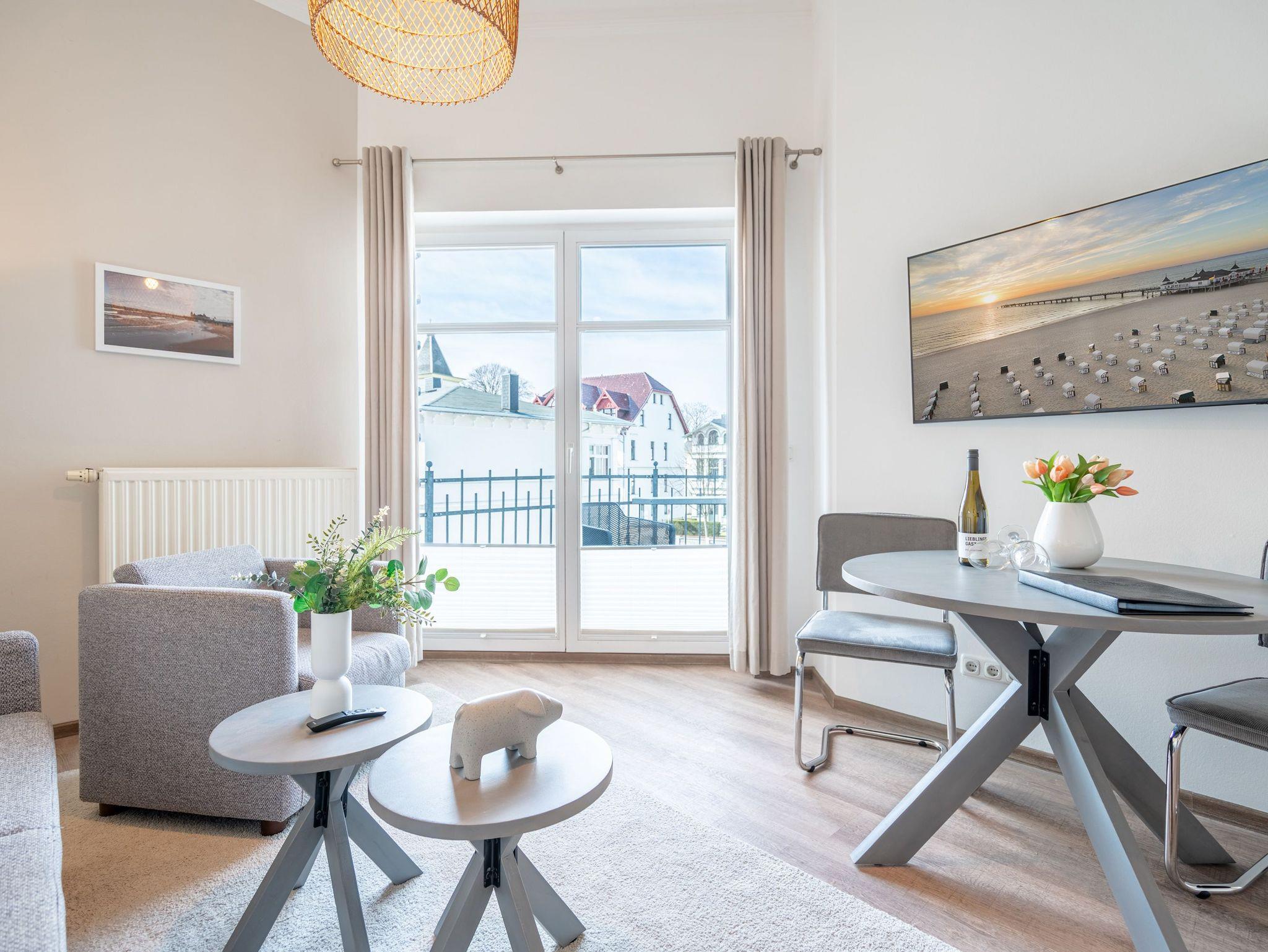 Die 2-Raum-Ferienwohnung Nr. C04 in der Villa Seedüwel bietet auf 38 qm Platz für zwei Personen und befindet sich im 1. Obergeschoss. Der offene Wohnbereich umfasst eine Küchenzeile mit einem Induktionskochfeld, einer Mikrowelle und einem Kühlschrank mit Gefrierfach. Ein Essplatz für zwei Personen, eine gemütliche Sitzgruppe und ein Flat-TV runden den Wohnbereich ab. Vom Wohnbereich aus gelangen Sie auf den ca. 4 qm großen West-Balkon, wo Sie entspannen können. Das Schlafzimmer ist mit einem Doppelbett (1,60 m x 2,00 m) und einem Kleiderschrank ausgestattet. Das innenliegende Bad verfügt über eine Dusche und ein Waschbecken, zudem gibt es ein separates WC. Ein Stellplatz in der Tiefgarage ( Einfahrthöhe 2,03m) des benachbarten Hauses ?Strandterrasse? ist für Sie reserviert. WLAN steht Ihnen kostenfrei zur Verfügung.
