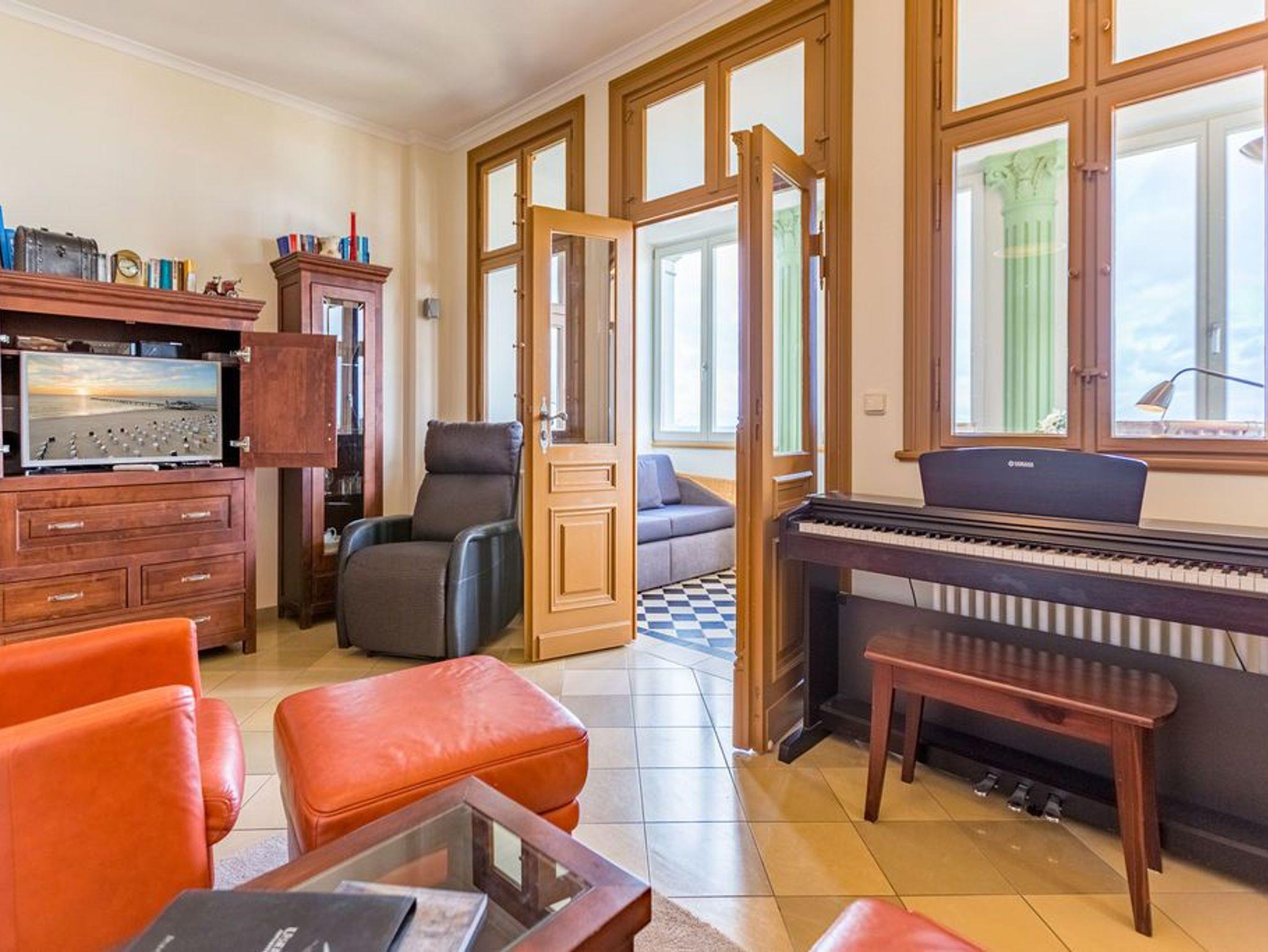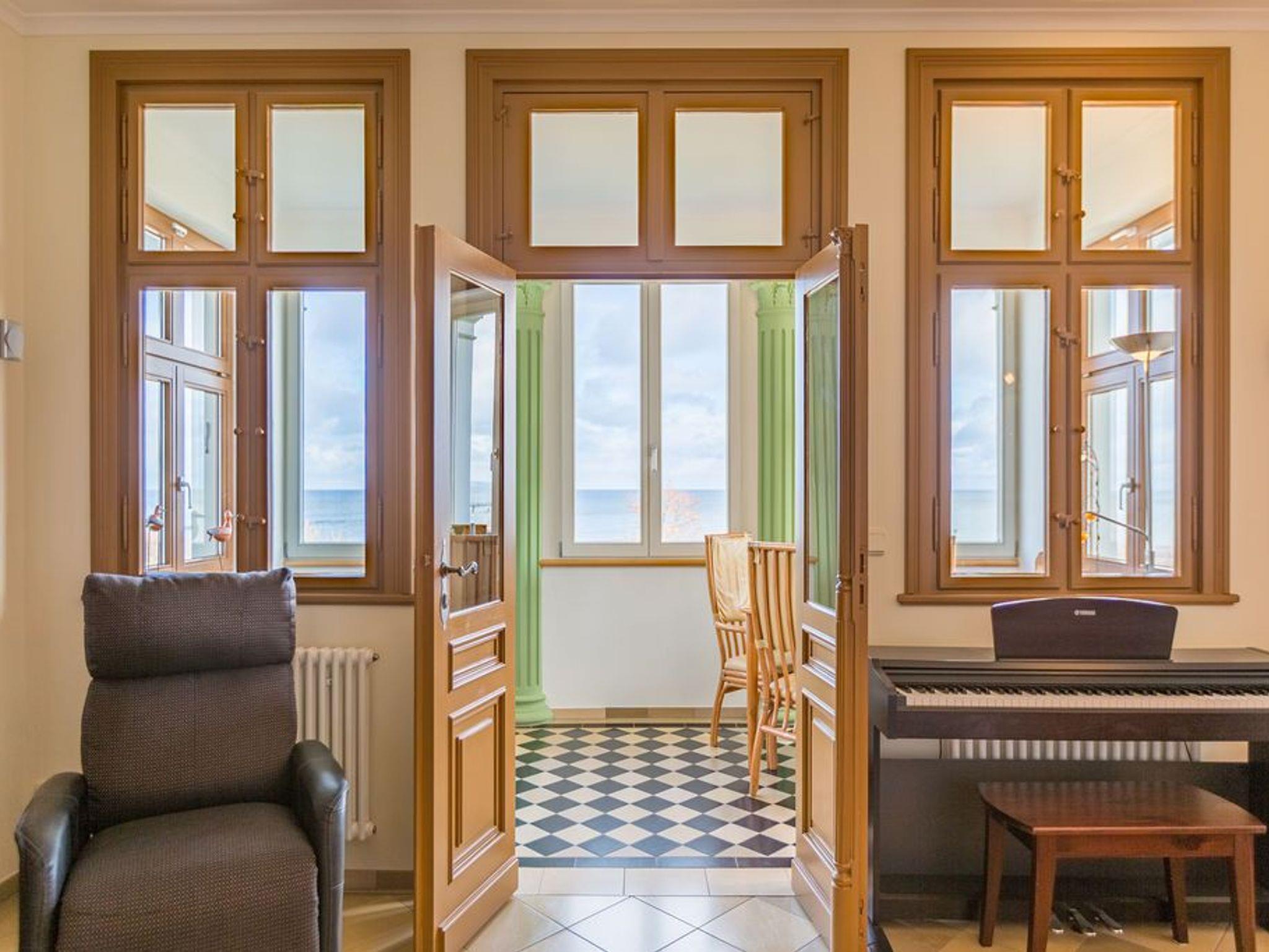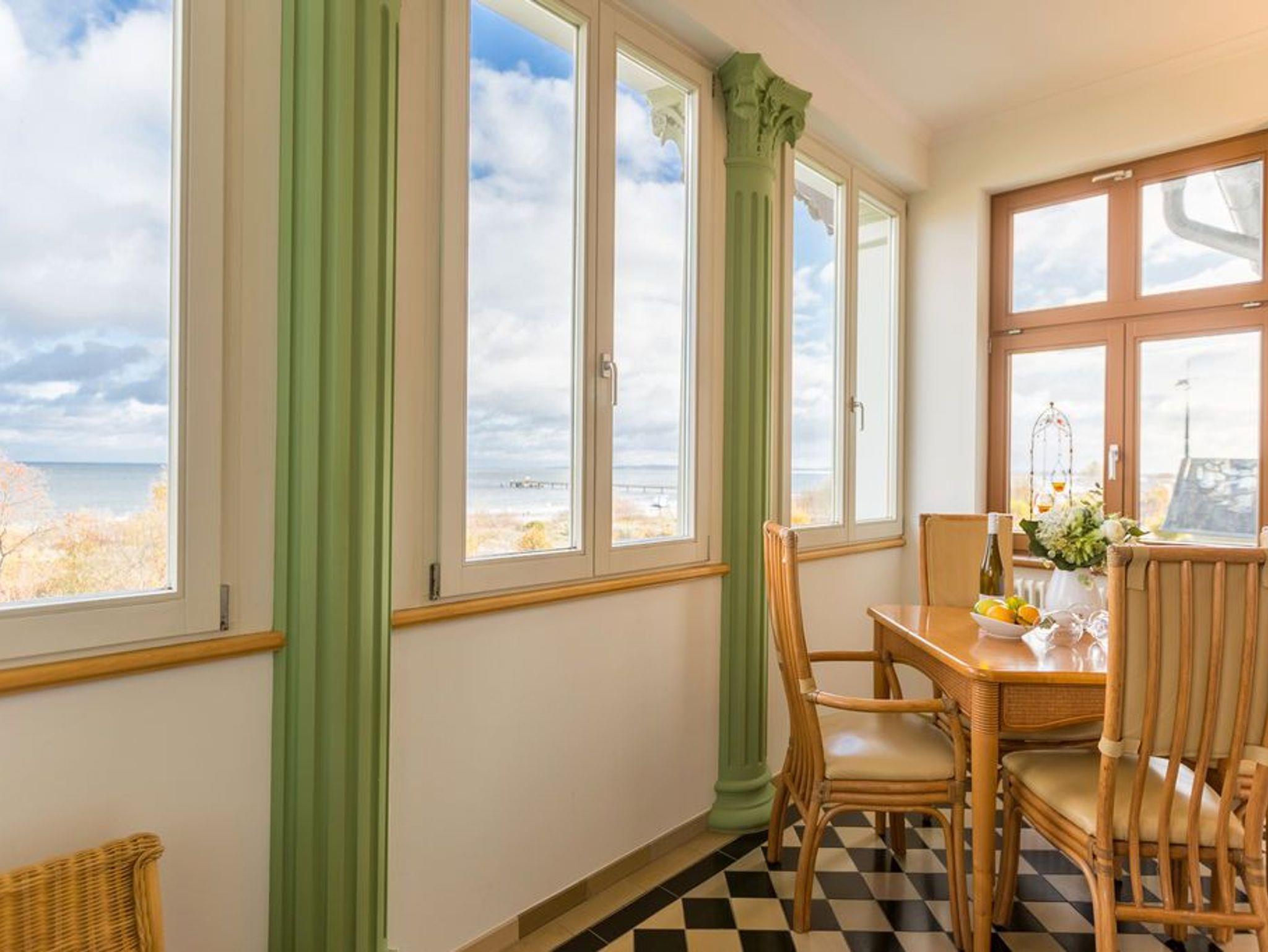 Genießen Sie den fantastischen Meerblick. Entspannen Sie in Räumen mit geschmackvoller Möblierung. Zur Wohnung gehören ein gemütlicher Wohnbereich mit TV und E-Klavier, eine komplett ausgestattete Küchenzeile, eine verglaste Veranda mit Essplatz und bequemer Couch, von der Sie durch die großen Fensterfronten direkten Blick auf die Ostsee genießen. Ein Schlafzimmer mit Doppelbett bietet Platz für zwei Personen und ein Kleinkind. Auf Wunsch stellen wir für unsere kleinen Gäste ein Kinderreisebett (ohne zusätzliche Matratze [&] Bettzeug) und einen Kinderhochstuhl ( gegen einen Aufpreis) zur Verfügung. Für Ihren Komfort sind die Betten bei der Anreise bezogen und Handtücher liegen bereit (Erstausstattung). Das WLAN-Netz kann kostenfrei genutzt werden.
