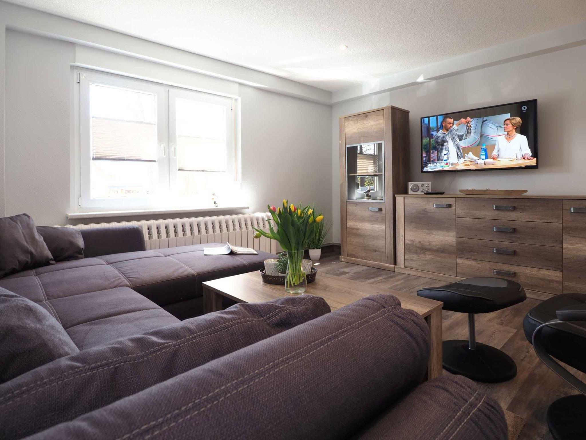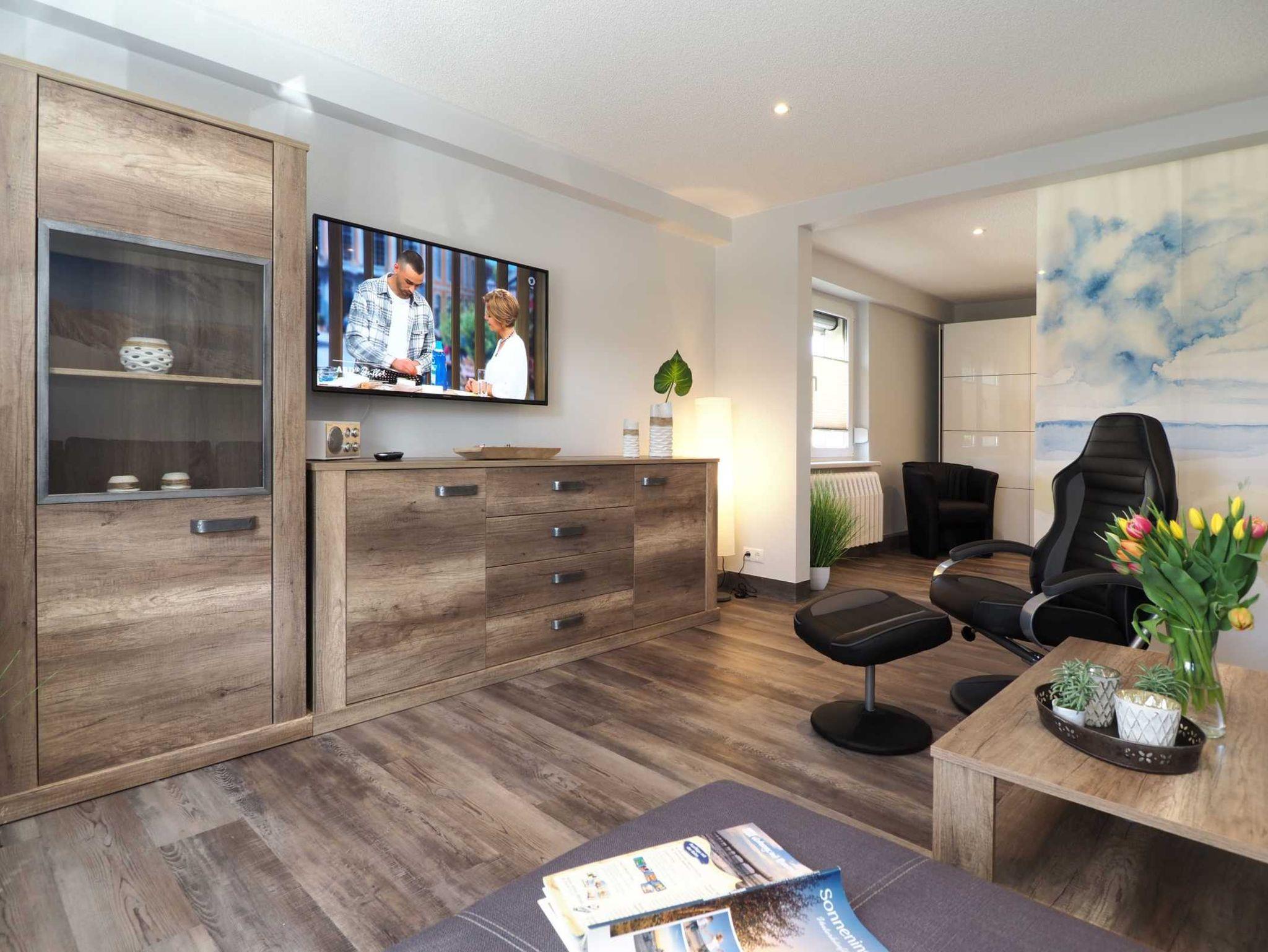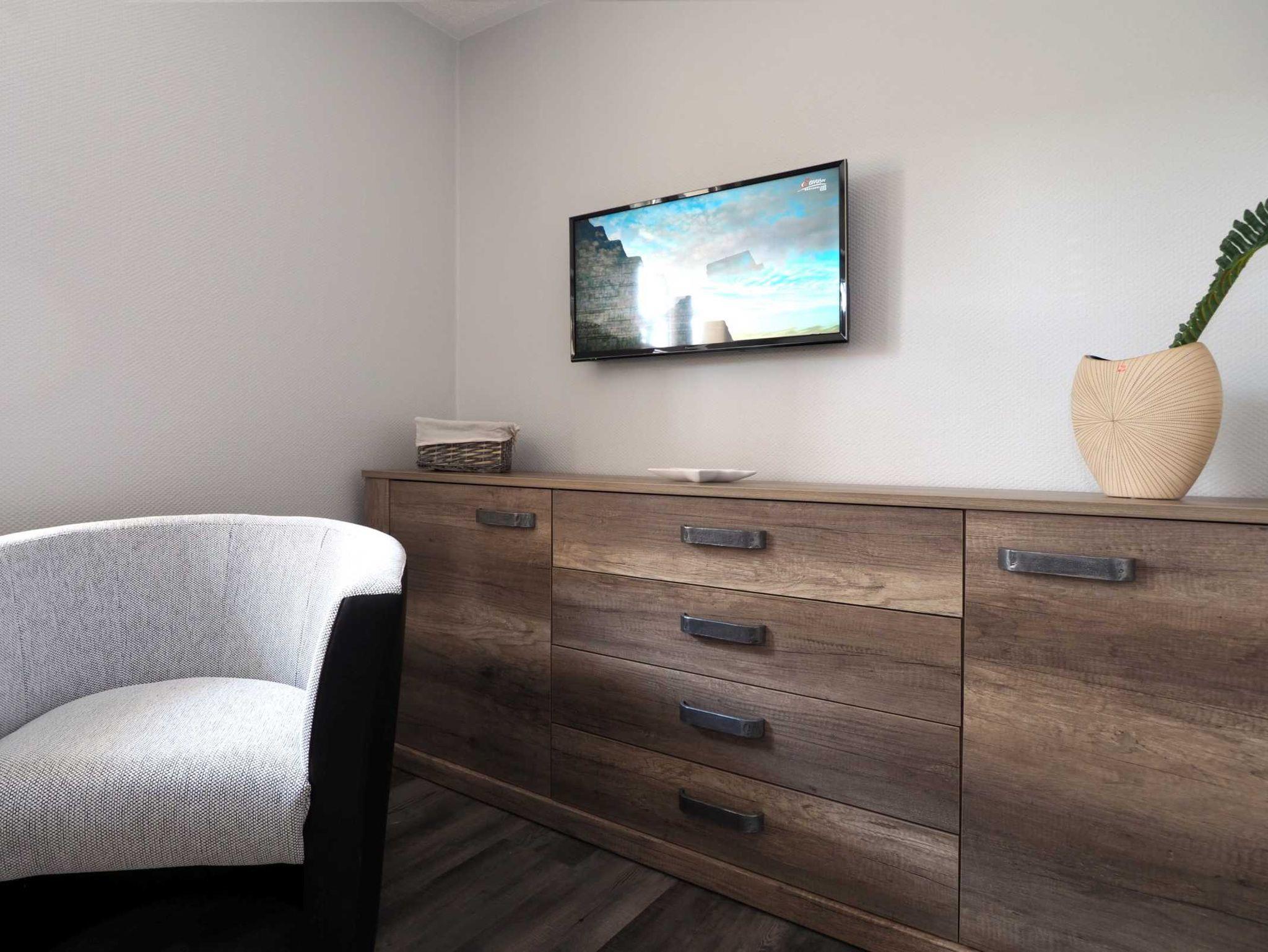 - Wohnbereich mit Flachbildfernseher und bequemer Couch