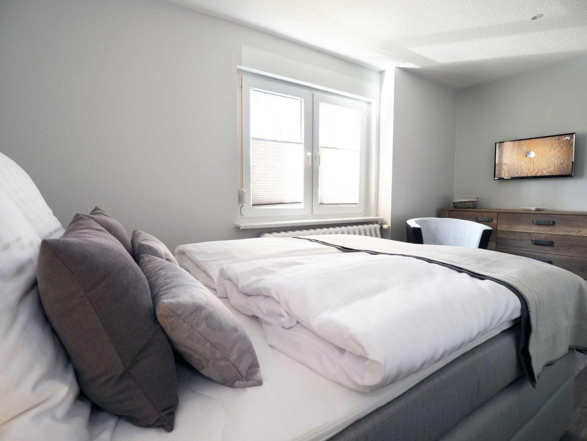 Im angrenzenden Schlafzimmer mit einem Doppelbett (180 x 200cm/getrennte Matratzen) können im Kleiderschrank Ihre persönlichen Dinge unterbringen. Auf der Schlafcouch im Wohnzimmer haben Sie besten Sitz- und Schlafkomfort für die 3. Person.