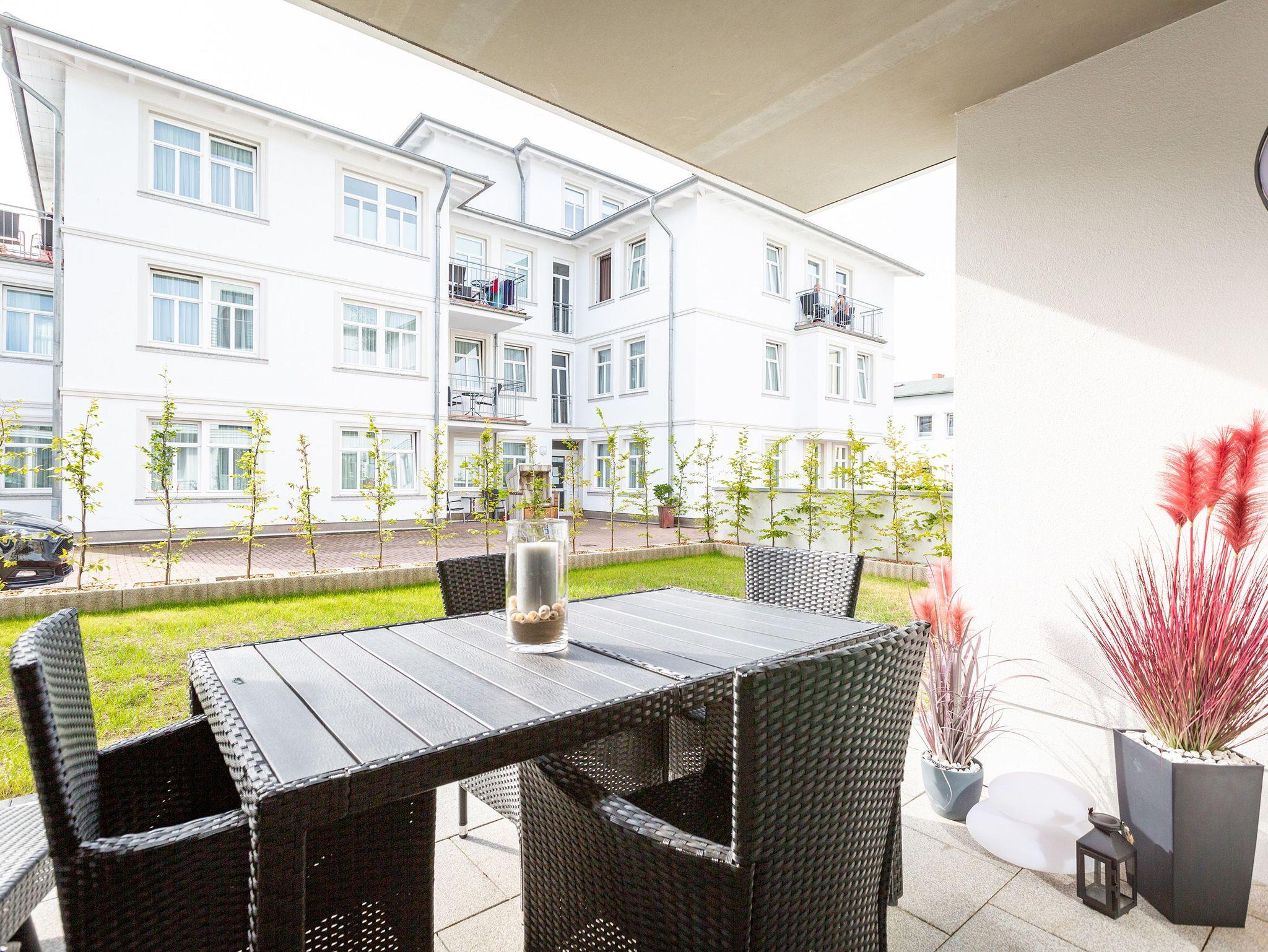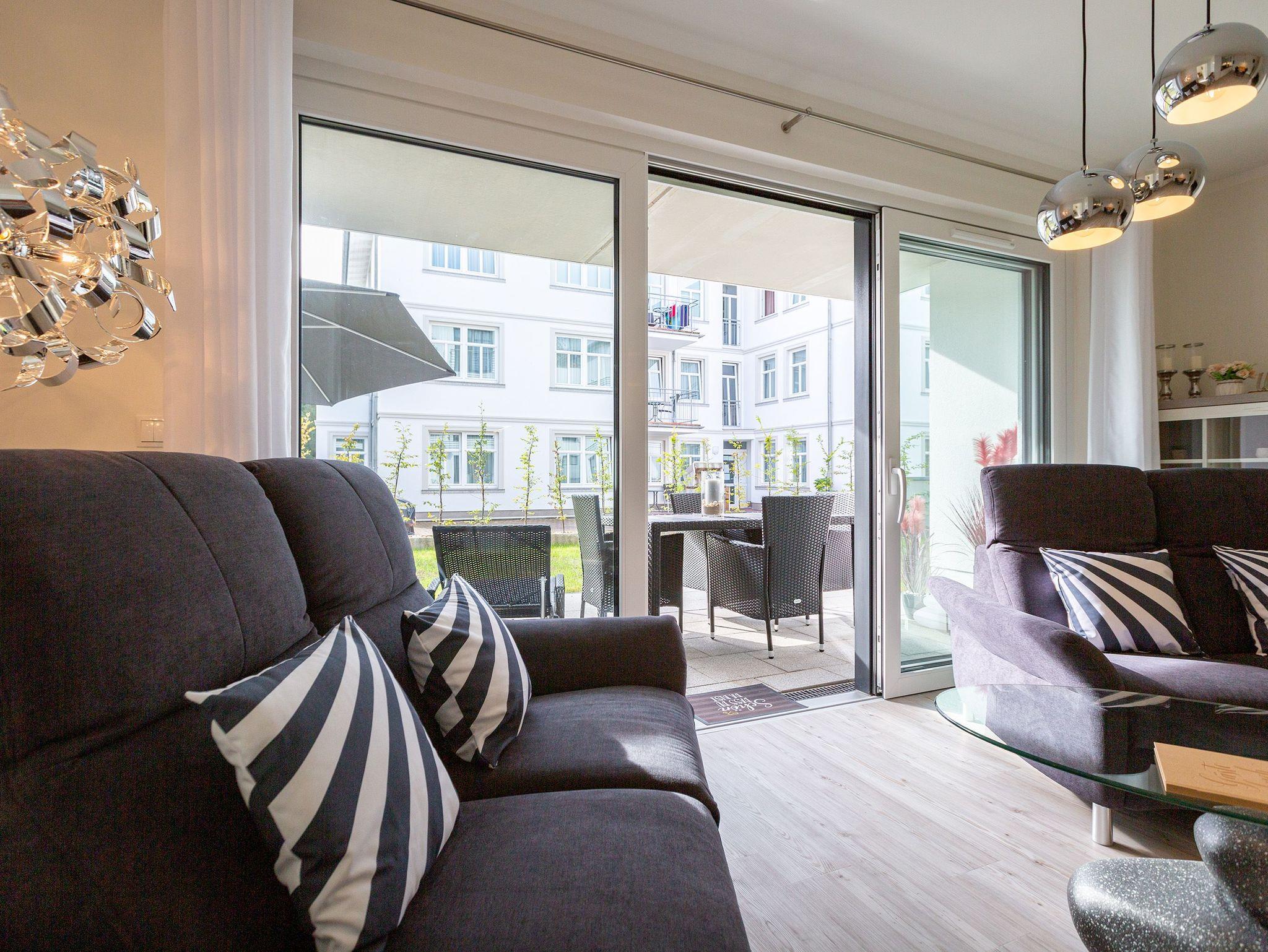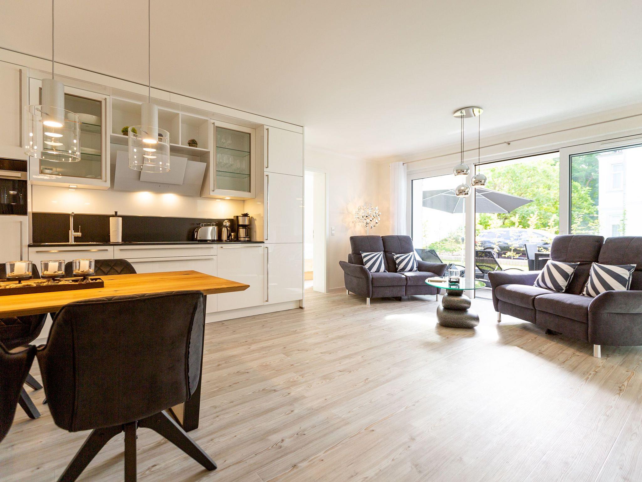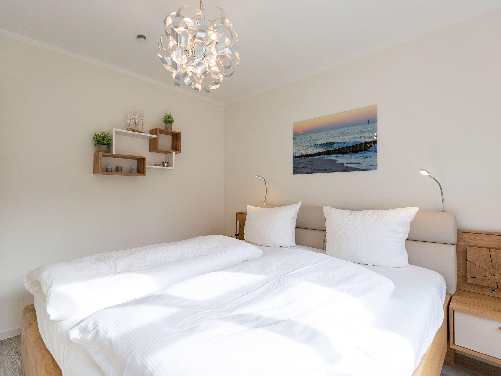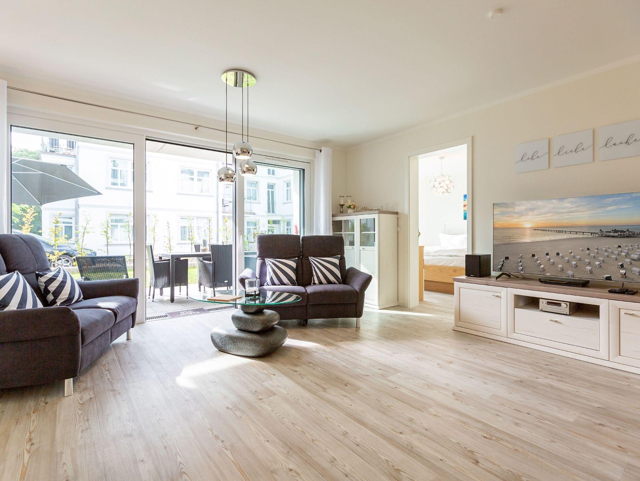 Der Urlaub kann kommen. Denn in diesem Dreizimmer-Appartement im Erdgeschoss des Quartiers Frohsinn werden Urlaubsträume wahr. Bis zu vier Personen und ein Kleinkind (im Kinderreisebett) werden sich hier auf den geräumigen 76 Quadratmetern rundum wohlfühlen. Modernes Design, viel Gemütlichkeit und alles, was man für einen erholsamen Urlaub an der Ostsee braucht, werden Sie hier vorfinden. Das große und helle Wohnzimmer ist mit einer bequemen Sitzlandschaft ausgestattet. Es hat einen Flat-TV, einen DVD- und einen CD-Player sowie einen Essplatz mit Holztisch und vier urigen Stühlen. Durch die Fußbodenheizung ist das Appartement an kühleren Tagen angenehm warm. Auch für diejenigen, die sonst eher zu Eisfüssen neigen. Eine große Sonnenterrasse (Süd-Ost-Ausrichtung) mit Gartenmöbeln, Sonnenliegen und Sonnenschirm lädt zum Entspannen an der frischen Luft ein. Es geht doch nichts über ein Frühstück unter freiem Himmel. Eine hochwertig ausgestattete Küchenzeile öffnet sich zum Wohnzimmer hin. Ob Herd, Spülmaschine, Mikrowelle, Toaster, Kaffeemaschine oder Wasserkocher ? es ist alles vorhanden. Auch edles Geschirr und ausreichend Pfannen und Töpfe finden Sie in den Schränken vor. Die beiden Schlafzimmer warten mit jeweils einem traumhaften Doppelbett (1,80 m x 2,00 m) und einem Flat-TV auf. Hier finden Sie garantiert den erholsamen Schlaf, nach dem Sie sich sehnen. Die Betten sind bei der Anreise bereits bezogen. Ihr Urlaubsdomizil verfügt über zwei Bäder. Das eine Bad hat eine Dusche, einen Waschtisch, ein WC und eine Infrarotsauna ? die schonendere Variante der Sauna. Sie kurbelt den Stoffwechsel an und lindert Beschwerden wie Muskelverspannungen und Entzündungen. Also nichts wie rein in die eigene, private Wellnessoase. Das zweite Bad verfügt ebenfalls über Dusche, Waschtisch und WC sowie über eine Waschmaschine. Handtücher liegen bereit. In der Tiefgarage ist ein Stellplatz zu der Wohnung reserviert. Es gibt einen separaten Fahrradraum im Keller. Das WLAN im Appartement kann kostenfrei genutzt werden.
