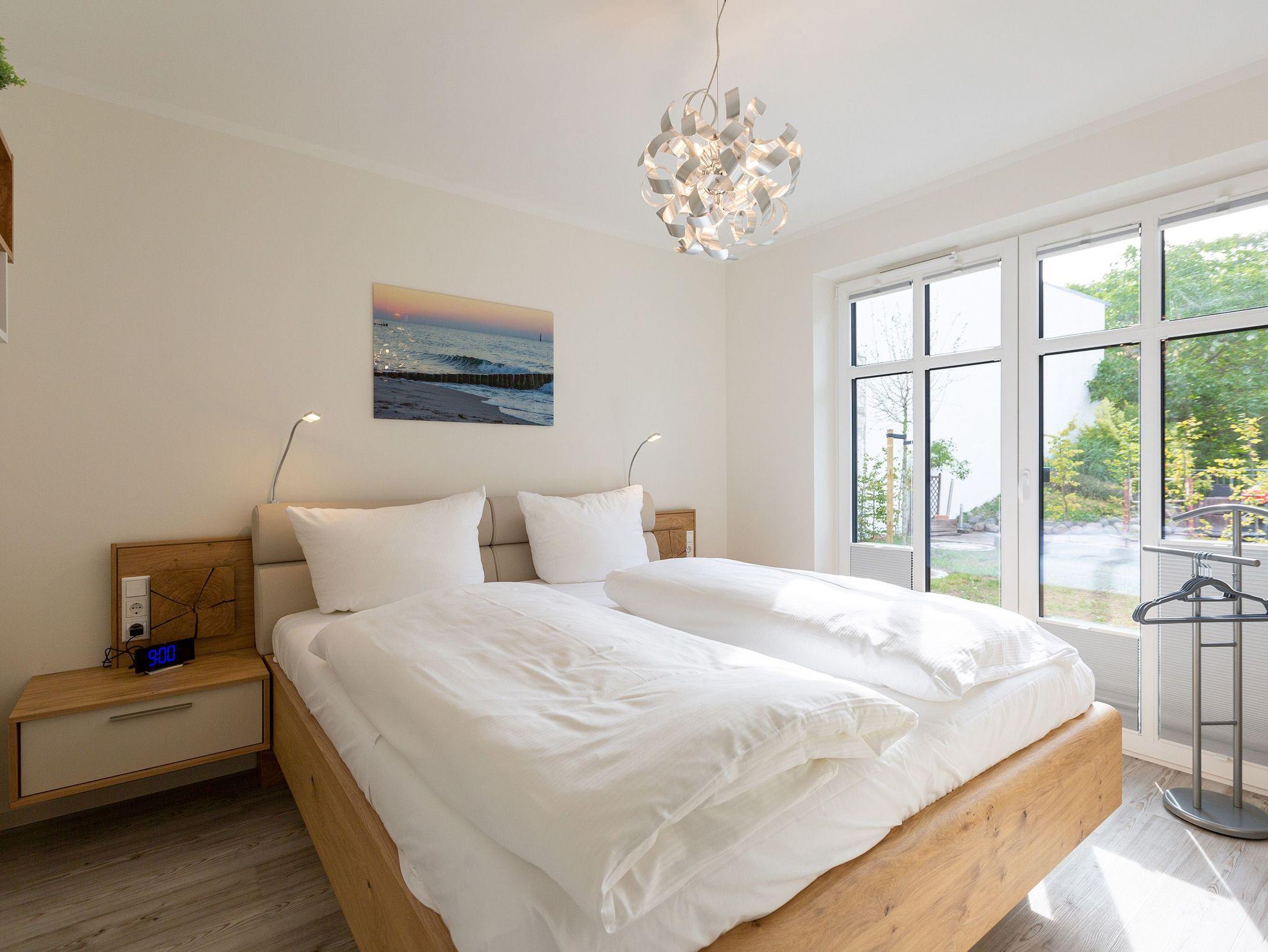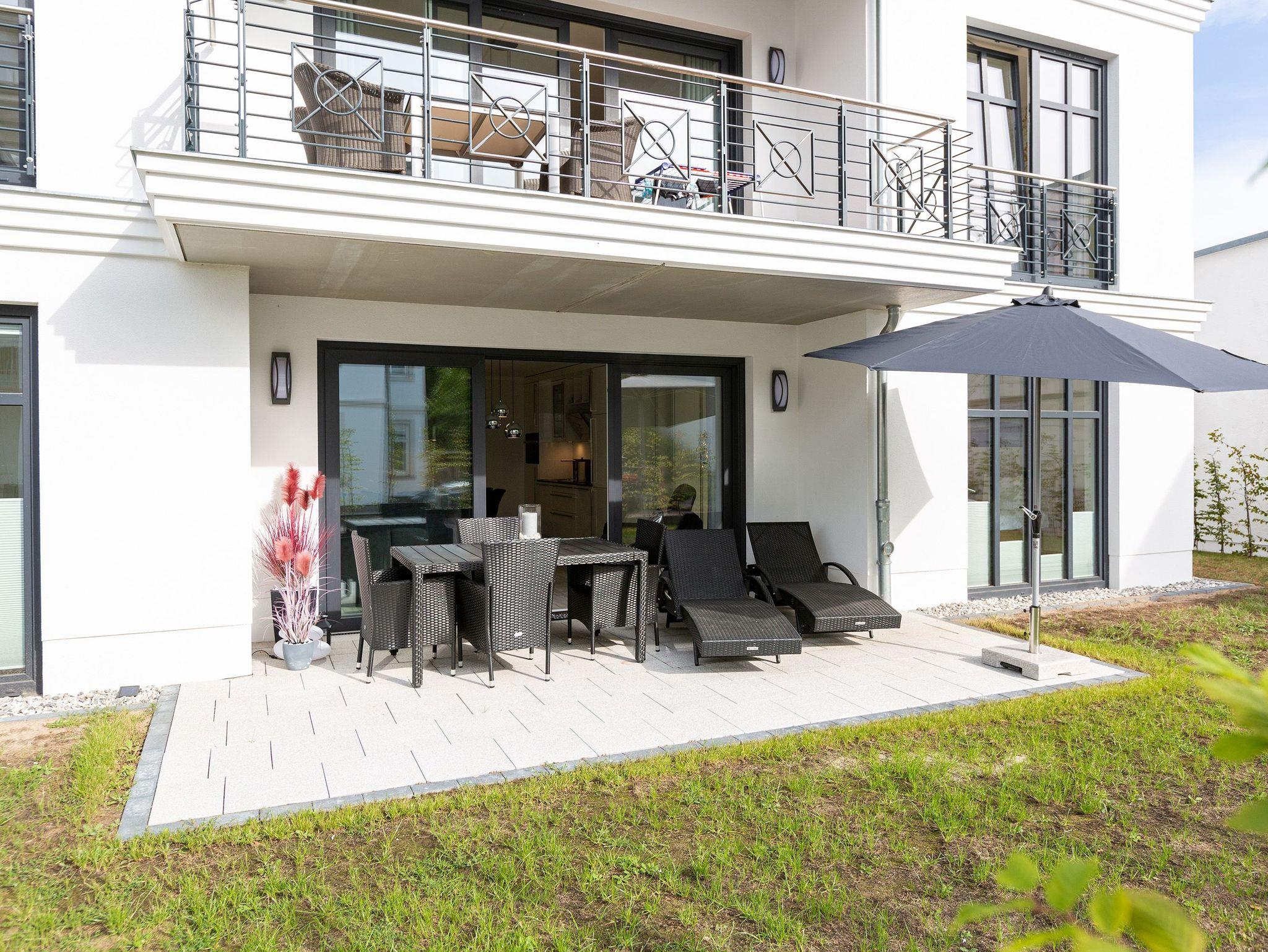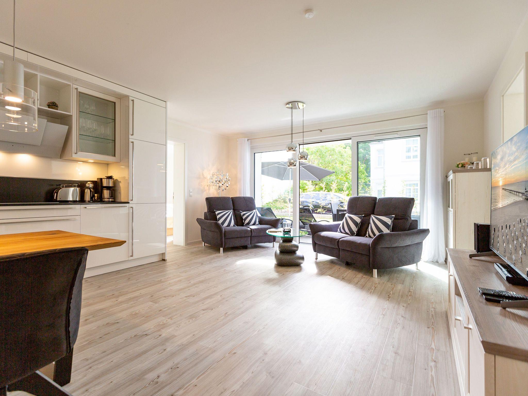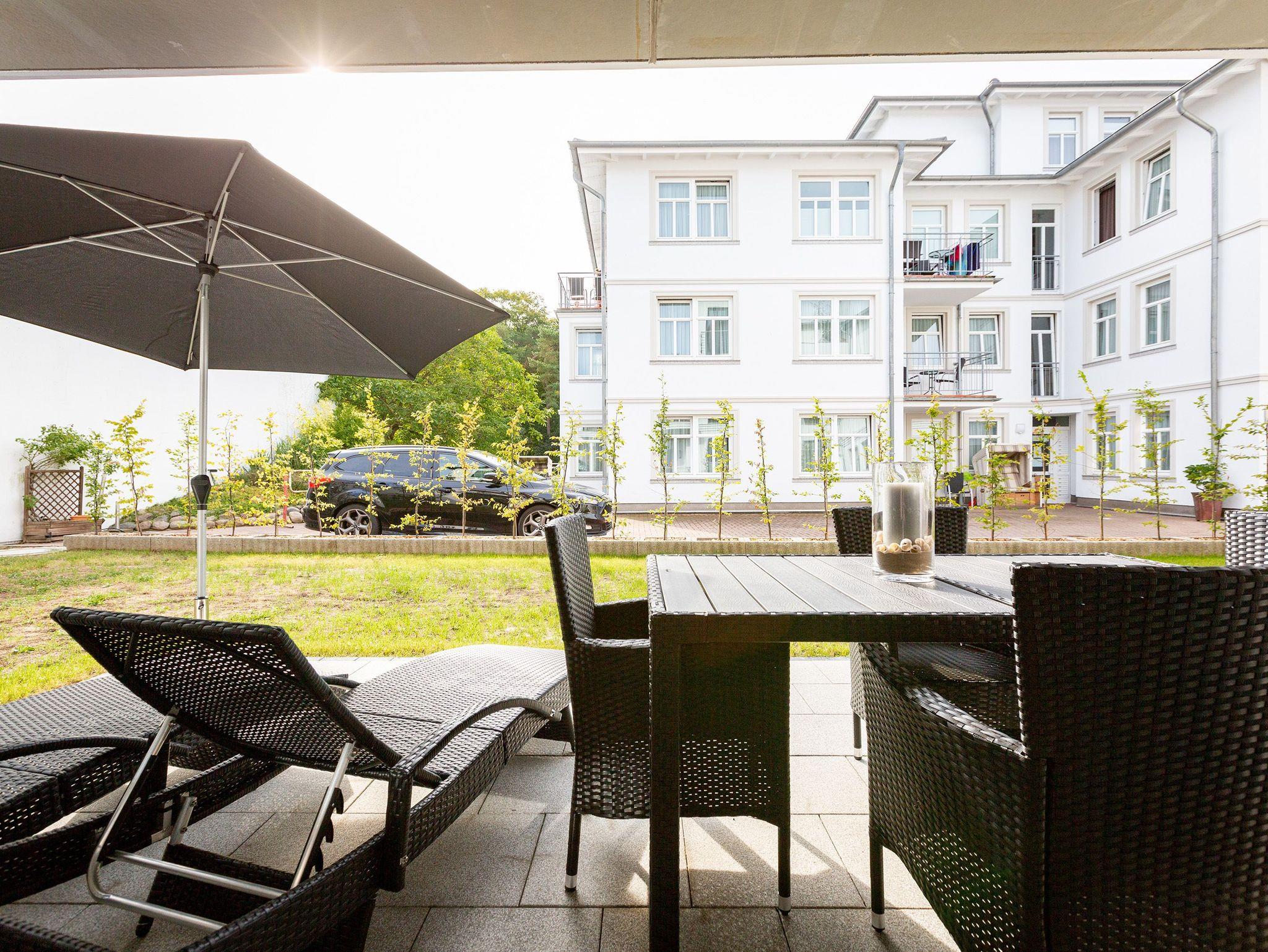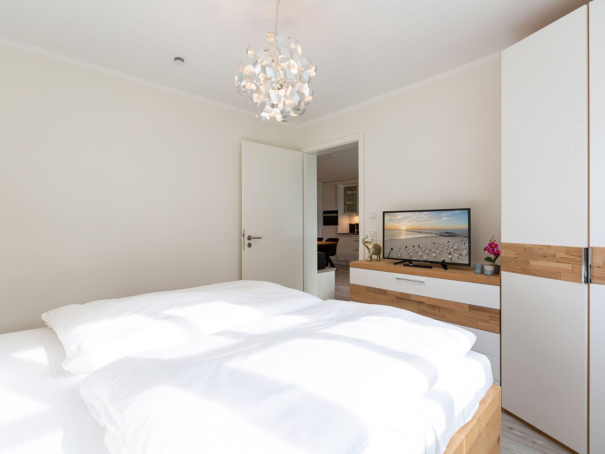 Der Urlaub kann kommen. Denn in diesem Dreizimmer-Appartement im Erdgeschoss des Quartiers Frohsinn werden Urlaubsträume wahr. Bis zu vier Personen und ein Kleinkind (im Kinderreisebett) werden sich hier auf den geräumigen 76 Quadratmetern rundum wohlfühlen. Modernes Design, viel Gemütlichkeit und alles, was man für einen erholsamen Urlaub an der Ostsee braucht, werden Sie hier vorfinden. Das große und helle Wohnzimmer ist mit einer bequemen Sitzlandschaft ausgestattet. Es hat einen Flat-TV, einen DVD- und einen CD-Player sowie einen Essplatz mit Holztisch und vier urigen Stühlen. Durch die Fußbodenheizung ist das Appartement an kühleren Tagen angenehm warm. Auch für diejenigen, die sonst eher zu Eisfüssen neigen. Eine große Sonnenterrasse (Süd-Ost-Ausrichtung) mit Gartenmöbeln, Sonnenliegen und Sonnenschirm lädt zum Entspannen an der frischen Luft ein. Es geht doch nichts über ein Frühstück unter freiem Himmel. Eine hochwertig ausgestattete Küchenzeile öffnet sich zum Wohnzimmer hin. Ob Herd, Spülmaschine, Mikrowelle, Toaster, Kaffeemaschine oder Wasserkocher ? es ist alles vorhanden. Auch edles Geschirr und ausreichend Pfannen und Töpfe finden Sie in den Schränken vor. Die beiden Schlafzimmer warten mit jeweils einem traumhaften Doppelbett (1,80 m x 2,00 m) und einem Flat-TV auf. Hier finden Sie garantiert den erholsamen Schlaf, nach dem Sie sich sehnen. Die Betten sind bei der Anreise bereits bezogen. Ihr Urlaubsdomizil verfügt über zwei Bäder. Das eine Bad hat eine Dusche, einen Waschtisch, ein WC und eine Infrarotsauna ? die schonendere Variante der Sauna. Sie kurbelt den Stoffwechsel an und lindert Beschwerden wie Muskelverspannungen und Entzündungen. Also nichts wie rein in die eigene, private Wellnessoase. Das zweite Bad verfügt ebenfalls über Dusche, Waschtisch und WC sowie über eine Waschmaschine. Handtücher liegen bereit. In der Tiefgarage ist ein Stellplatz zu der Wohnung reserviert. Es gibt einen separaten Fahrradraum im Keller. Das WLAN im Appartement kann kostenfrei genutzt werden.