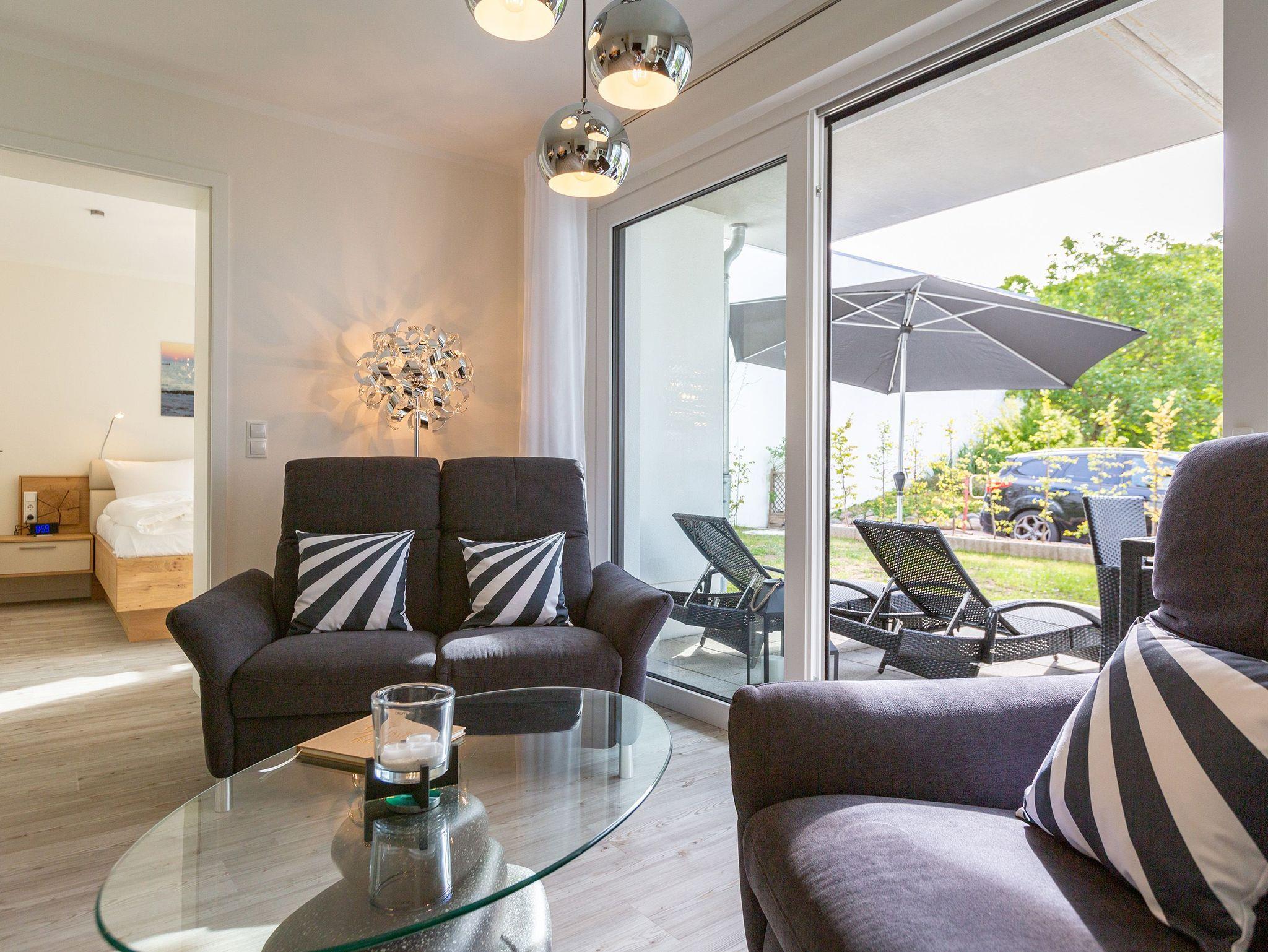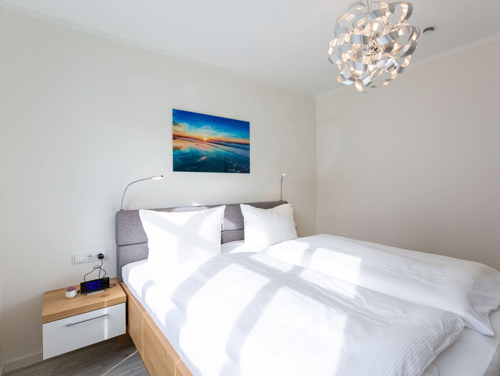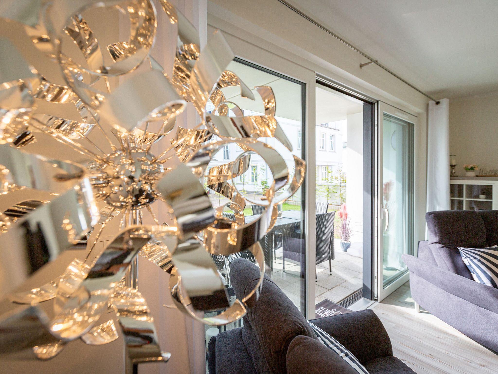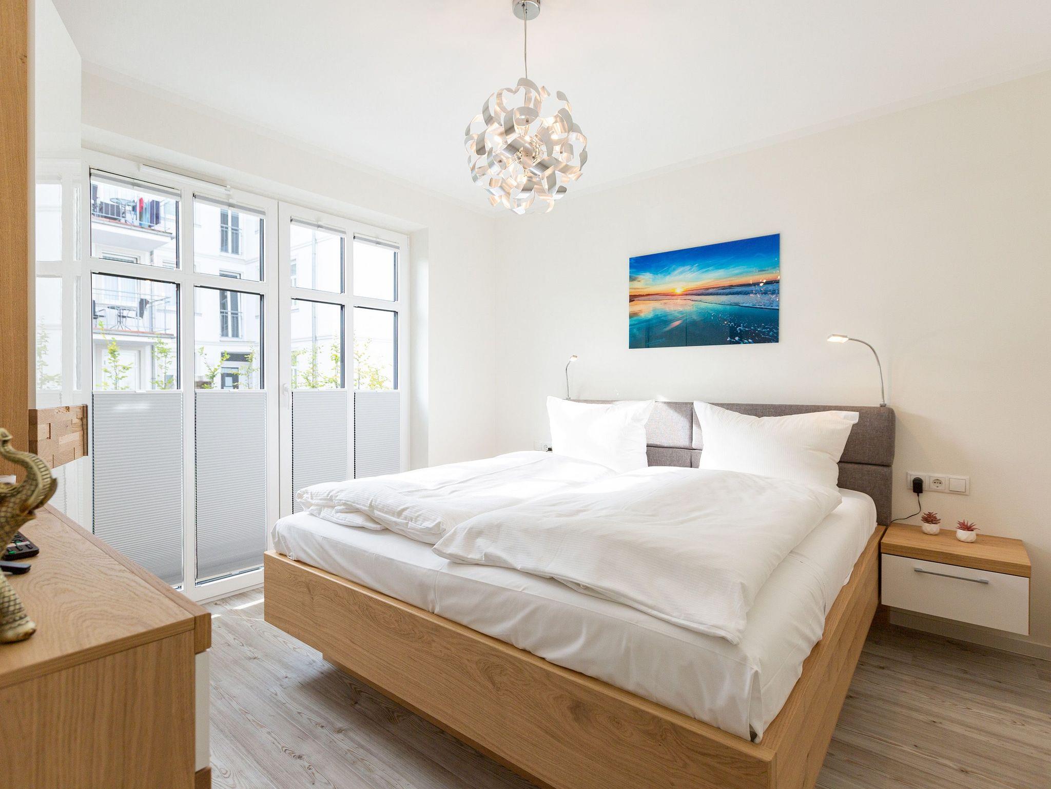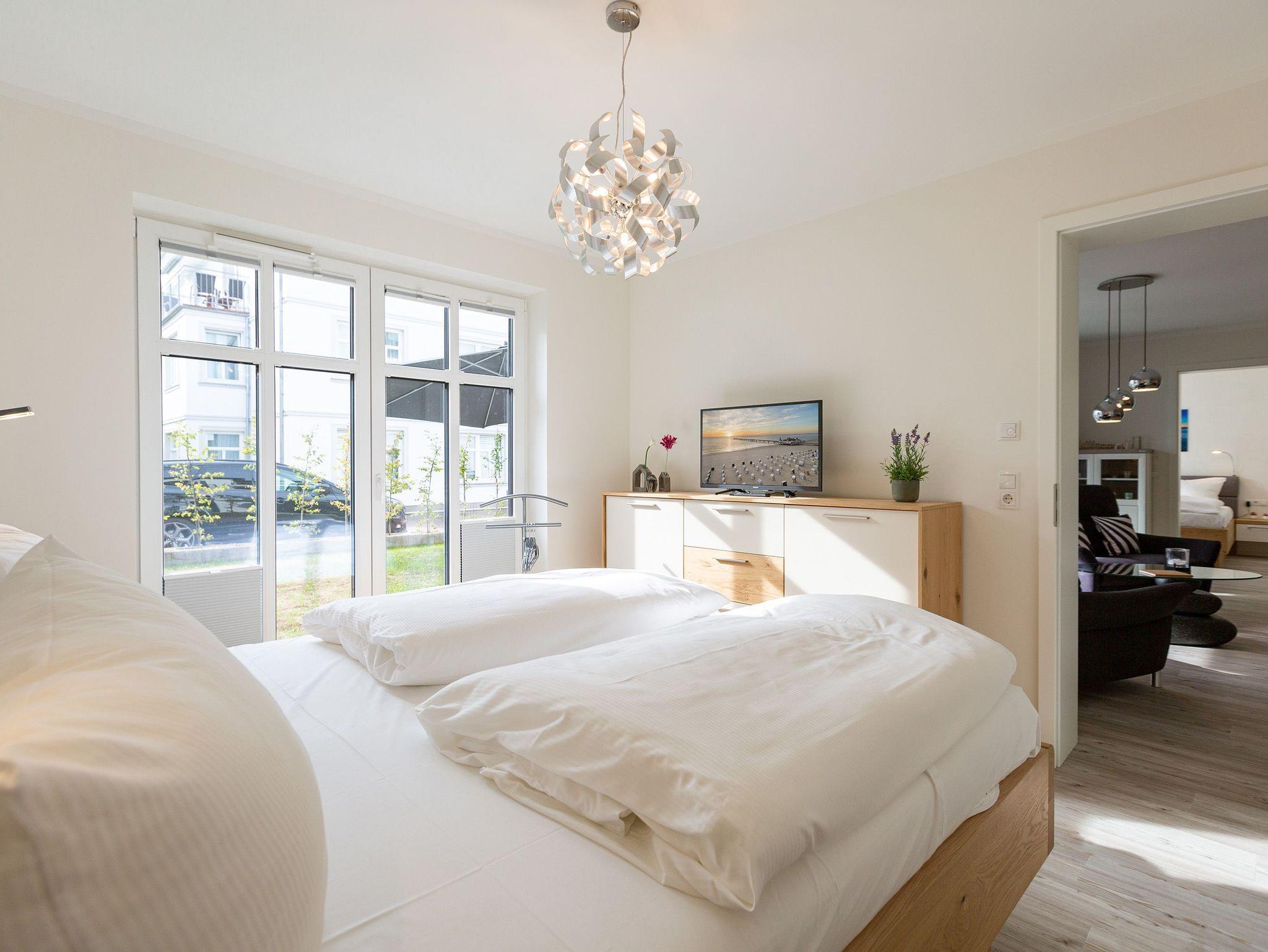 Der Urlaub kann kommen. Denn in diesem Dreizimmer-Appartement im Erdgeschoss des Quartiers Frohsinn werden Urlaubsträume wahr. Bis zu vier Personen und ein Kleinkind (im Kinderreisebett) werden sich hier auf den geräumigen 76 Quadratmetern rundum wohlfühlen. Modernes Design, viel Gemütlichkeit und alles, was man für einen erholsamen Urlaub an der Ostsee braucht, werden Sie hier vorfinden. Das große und helle Wohnzimmer ist mit einer bequemen Sitzlandschaft ausgestattet. Es hat einen Flat-TV, einen DVD- und einen CD-Player sowie einen Essplatz mit Holztisch und vier urigen Stühlen. Durch die Fußbodenheizung ist das Appartement an kühleren Tagen angenehm warm. Auch für diejenigen, die sonst eher zu Eisfüssen neigen. Eine große Sonnenterrasse (Süd-Ost-Ausrichtung) mit Gartenmöbeln, Sonnenliegen und Sonnenschirm lädt zum Entspannen an der frischen Luft ein. Es geht doch nichts über ein Frühstück unter freiem Himmel. Eine hochwertig ausgestattete Küchenzeile öffnet sich zum Wohnzimmer hin. Ob Herd, Spülmaschine, Mikrowelle, Toaster, Kaffeemaschine oder Wasserkocher ? es ist alles vorhanden. Auch edles Geschirr und ausreichend Pfannen und Töpfe finden Sie in den Schränken vor. Die beiden Schlafzimmer warten mit jeweils einem traumhaften Doppelbett (1,80 m x 2,00 m) und einem Flat-TV auf. Hier finden Sie garantiert den erholsamen Schlaf, nach dem Sie sich sehnen. Die Betten sind bei der Anreise bereits bezogen. Ihr Urlaubsdomizil verfügt über zwei Bäder. Das eine Bad hat eine Dusche, einen Waschtisch, ein WC und eine Infrarotsauna ? die schonendere Variante der Sauna. Sie kurbelt den Stoffwechsel an und lindert Beschwerden wie Muskelverspannungen und Entzündungen. Also nichts wie rein in die eigene, private Wellnessoase. Das zweite Bad verfügt ebenfalls über Dusche, Waschtisch und WC sowie über eine Waschmaschine. Handtücher liegen bereit. In der Tiefgarage ist ein Stellplatz zu der Wohnung reserviert. Es gibt einen separaten Fahrradraum im Keller. Das WLAN im Appartement kann kostenfrei genutzt werden.