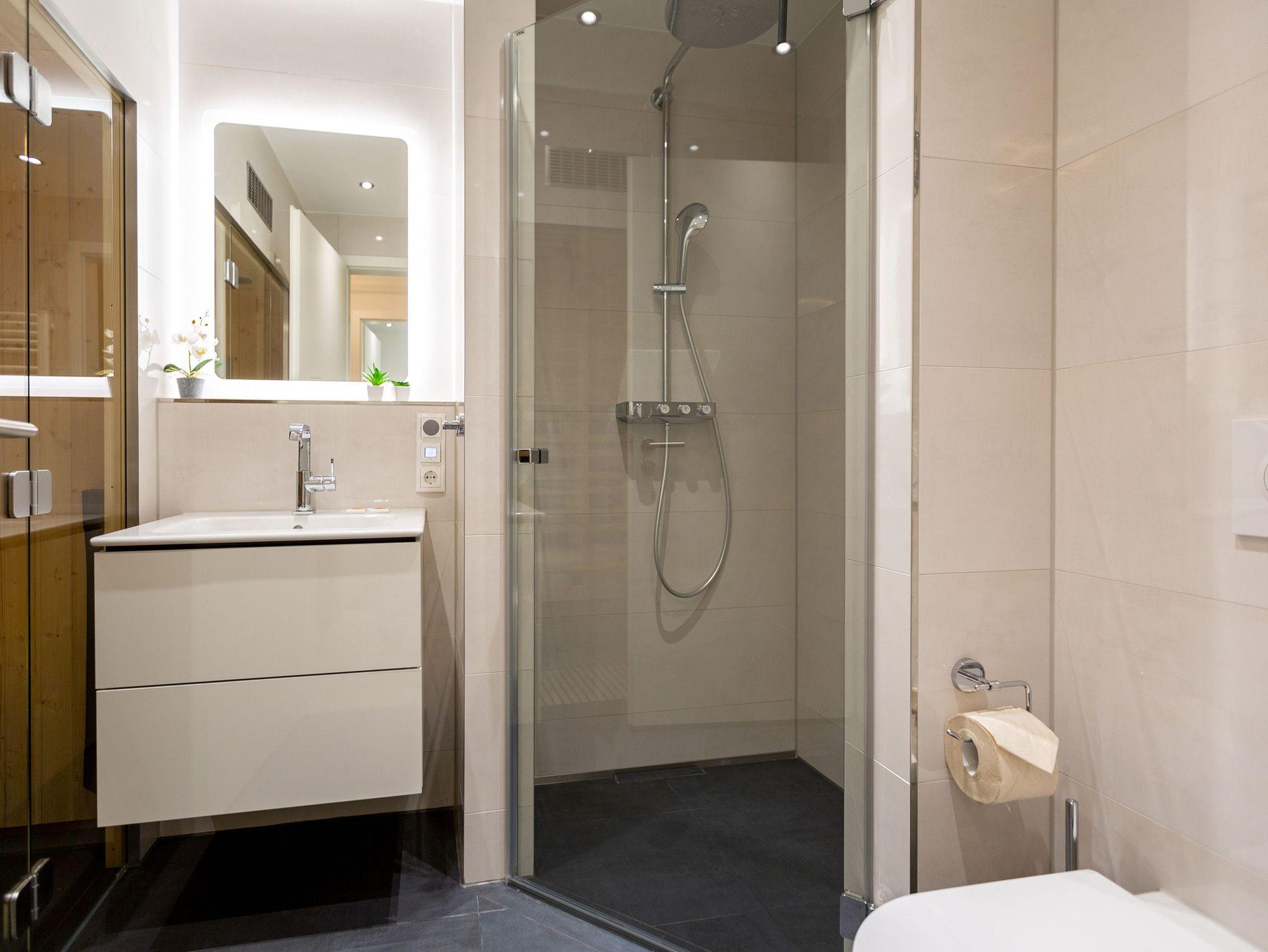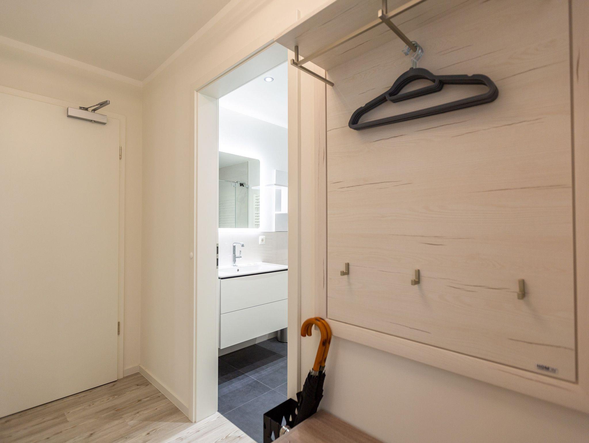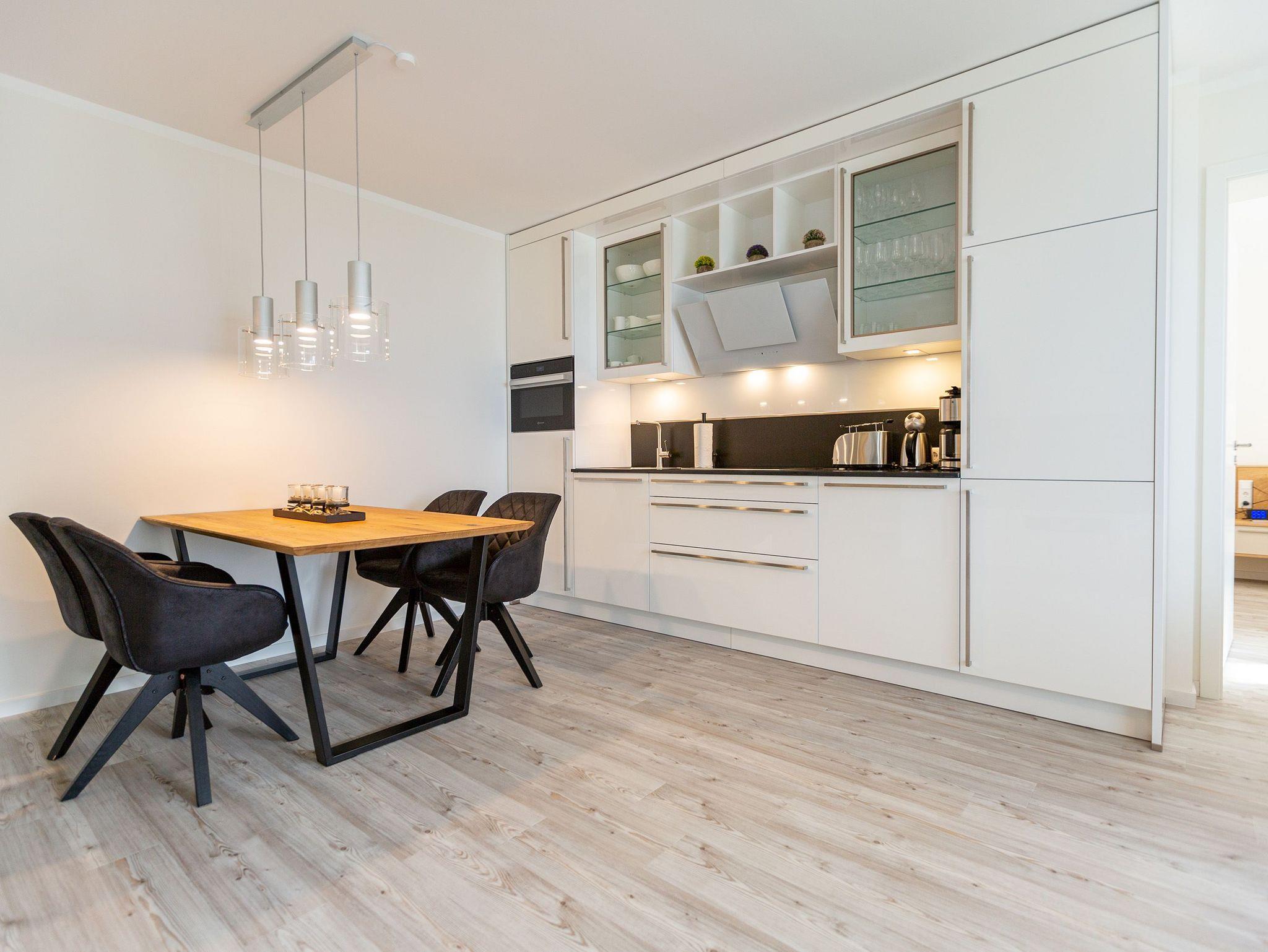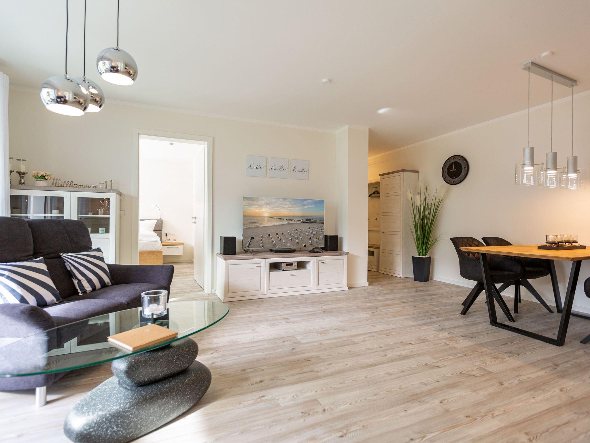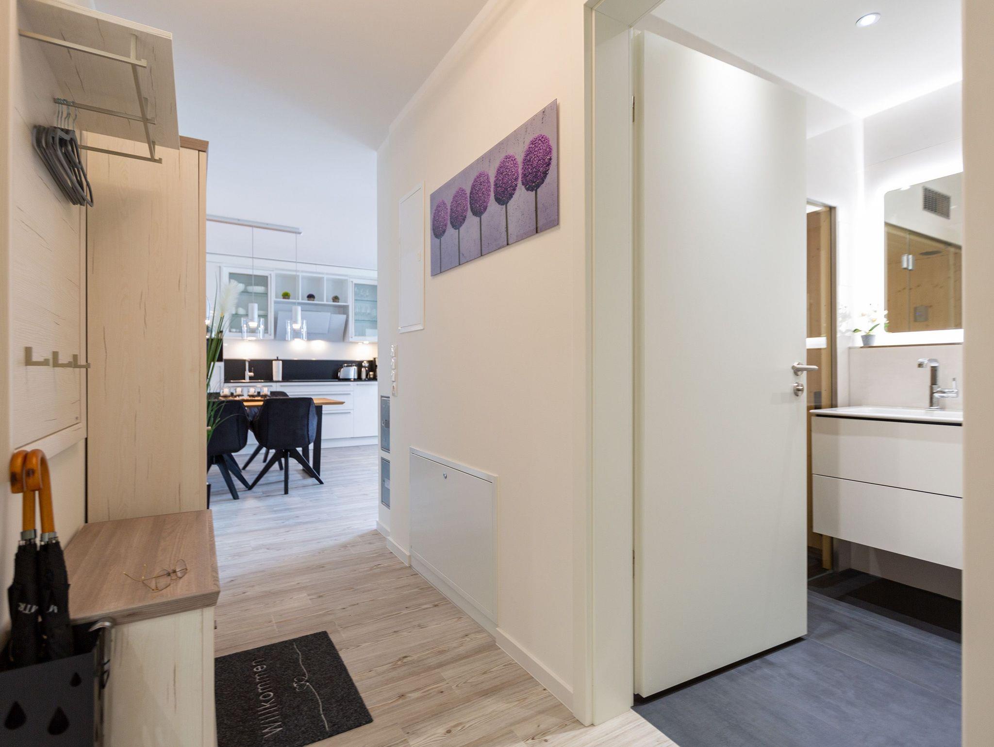 Der Urlaub kann kommen. Denn in diesem Dreizimmer-Appartement im Erdgeschoss des Quartiers Frohsinn werden Urlaubsträume wahr. Bis zu vier Personen und ein Kleinkind (im Kinderreisebett) werden sich hier auf den geräumigen 76 Quadratmetern rundum wohlfühlen. Modernes Design, viel Gemütlichkeit und alles, was man für einen erholsamen Urlaub an der Ostsee braucht, werden Sie hier vorfinden. Das große und helle Wohnzimmer ist mit einer bequemen Sitzlandschaft ausgestattet. Es hat einen Flat-TV, einen DVD- und einen CD-Player sowie einen Essplatz mit Holztisch und vier urigen Stühlen. Durch die Fußbodenheizung ist das Appartement an kühleren Tagen angenehm warm. Auch für diejenigen, die sonst eher zu Eisfüssen neigen. Eine große Sonnenterrasse (Süd-Ost-Ausrichtung) mit Gartenmöbeln, Sonnenliegen und Sonnenschirm lädt zum Entspannen an der frischen Luft ein. Es geht doch nichts über ein Frühstück unter freiem Himmel. Eine hochwertig ausgestattete Küchenzeile öffnet sich zum Wohnzimmer hin. Ob Herd, Spülmaschine, Mikrowelle, Toaster, Kaffeemaschine oder Wasserkocher ? es ist alles vorhanden. Auch edles Geschirr und ausreichend Pfannen und Töpfe finden Sie in den Schränken vor. Die beiden Schlafzimmer warten mit jeweils einem traumhaften Doppelbett (1,80 m x 2,00 m) und einem Flat-TV auf. Hier finden Sie garantiert den erholsamen Schlaf, nach dem Sie sich sehnen. Die Betten sind bei der Anreise bereits bezogen. Ihr Urlaubsdomizil verfügt über zwei Bäder. Das eine Bad hat eine Dusche, einen Waschtisch, ein WC und eine Infrarotsauna ? die schonendere Variante der Sauna. Sie kurbelt den Stoffwechsel an und lindert Beschwerden wie Muskelverspannungen und Entzündungen. Also nichts wie rein in die eigene, private Wellnessoase. Das zweite Bad verfügt ebenfalls über Dusche, Waschtisch und WC sowie über eine Waschmaschine. Handtücher liegen bereit. In der Tiefgarage ist ein Stellplatz zu der Wohnung reserviert. Es gibt einen separaten Fahrradraum im Keller. Das WLAN im Appartement kann kostenfrei genutzt werden.
