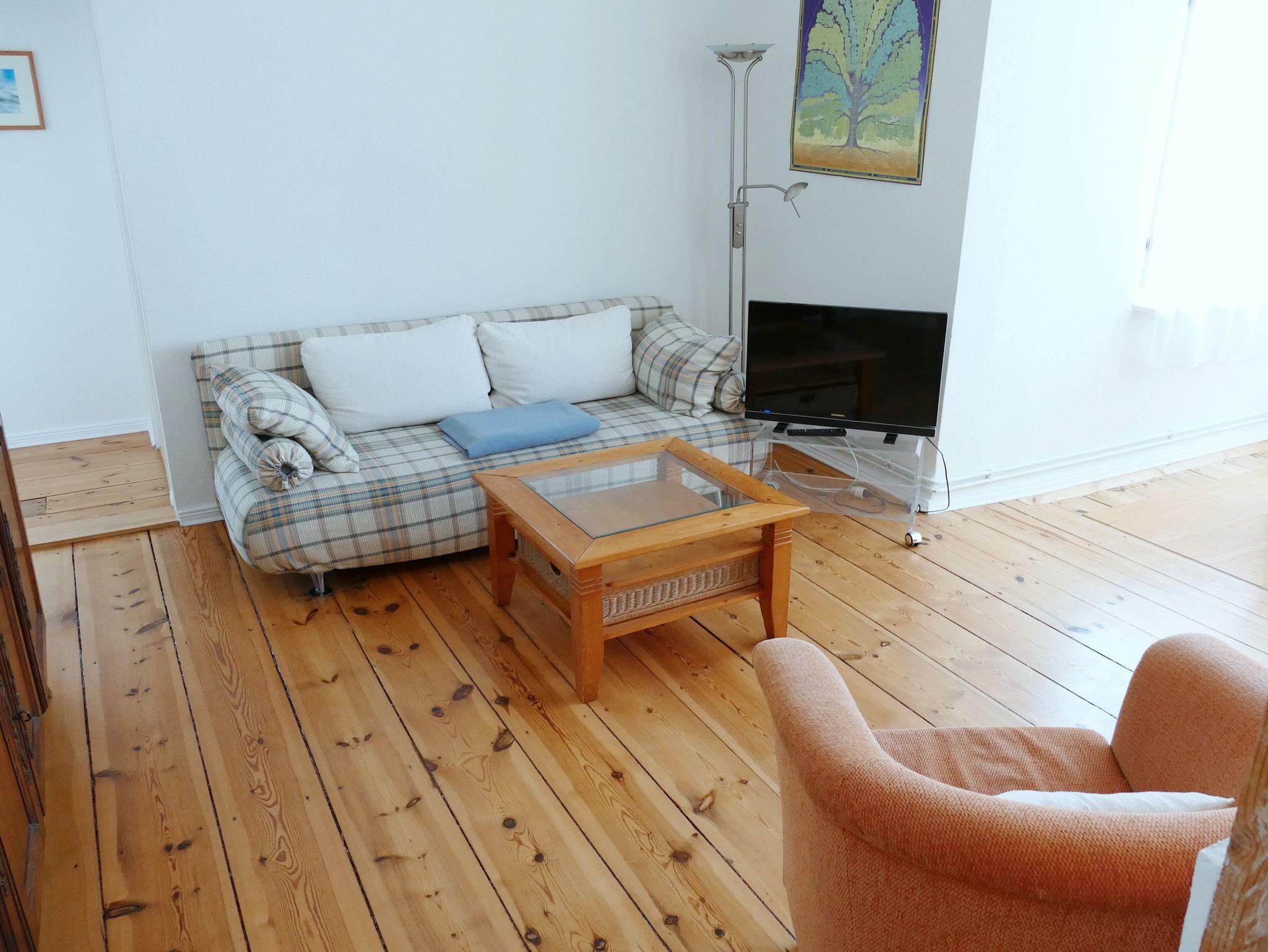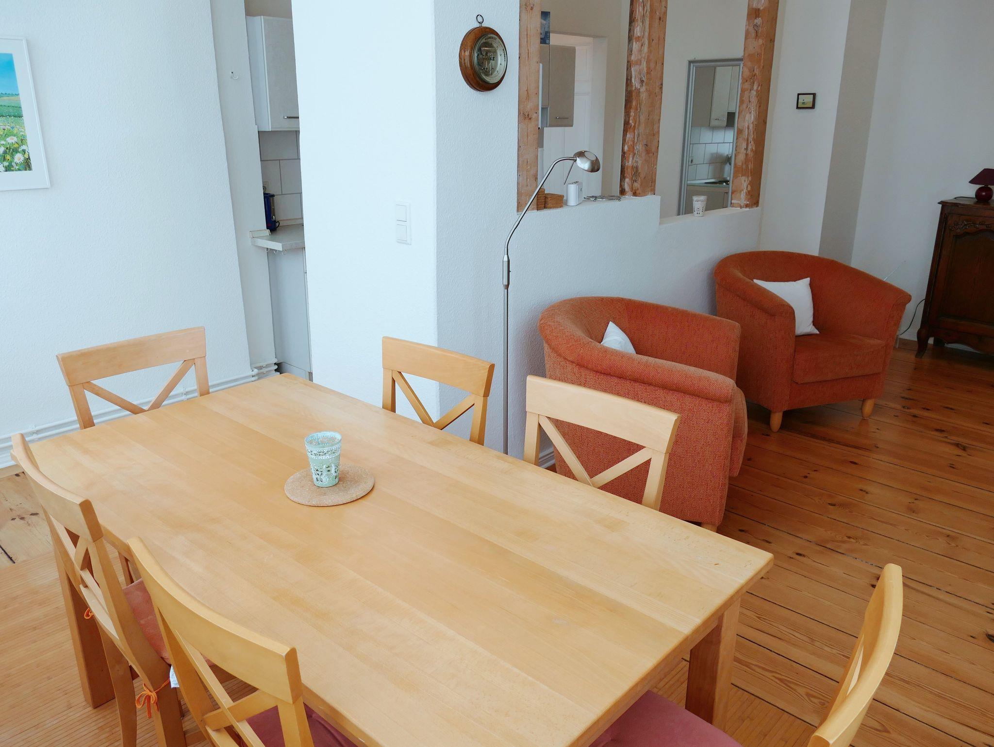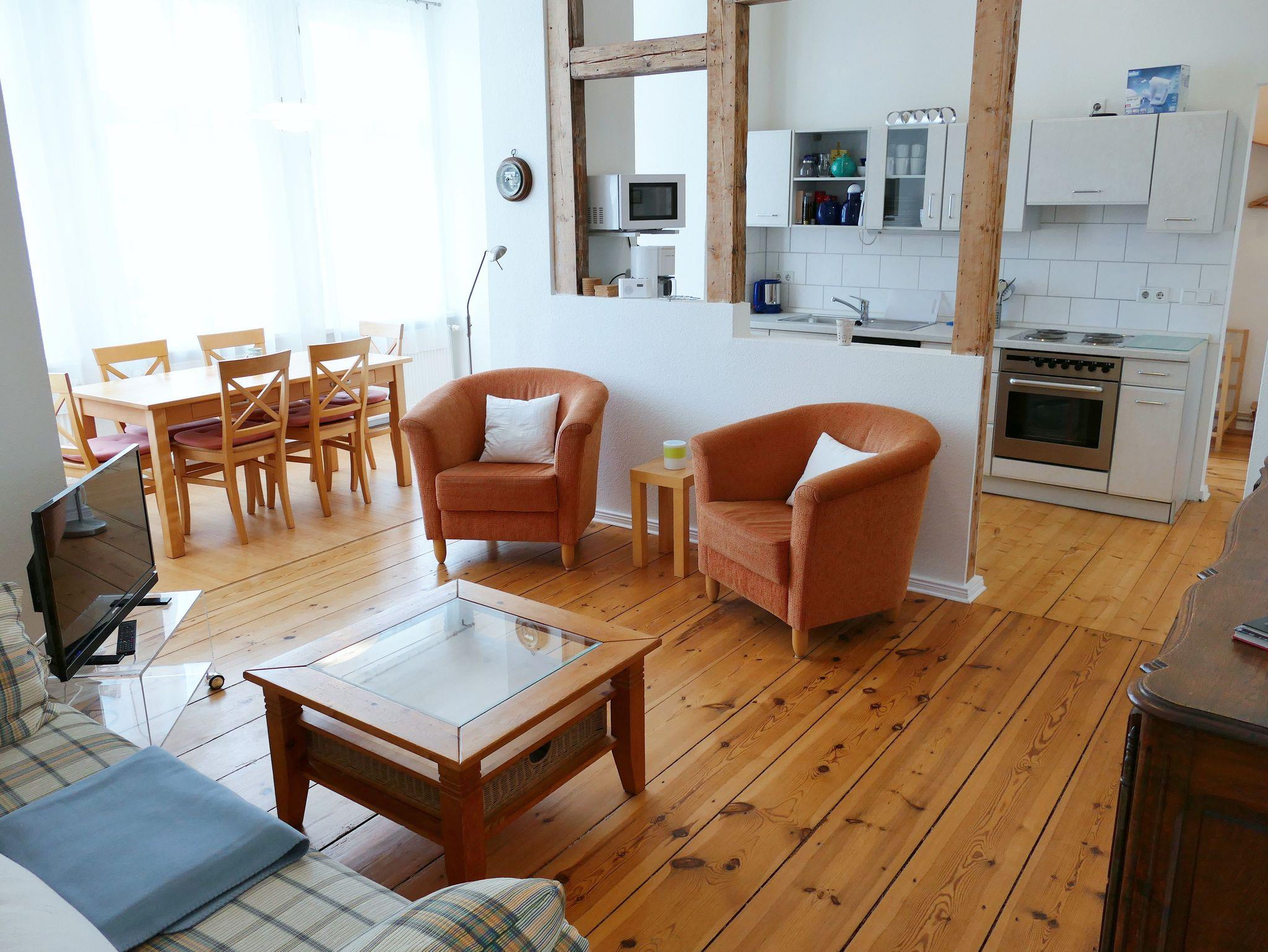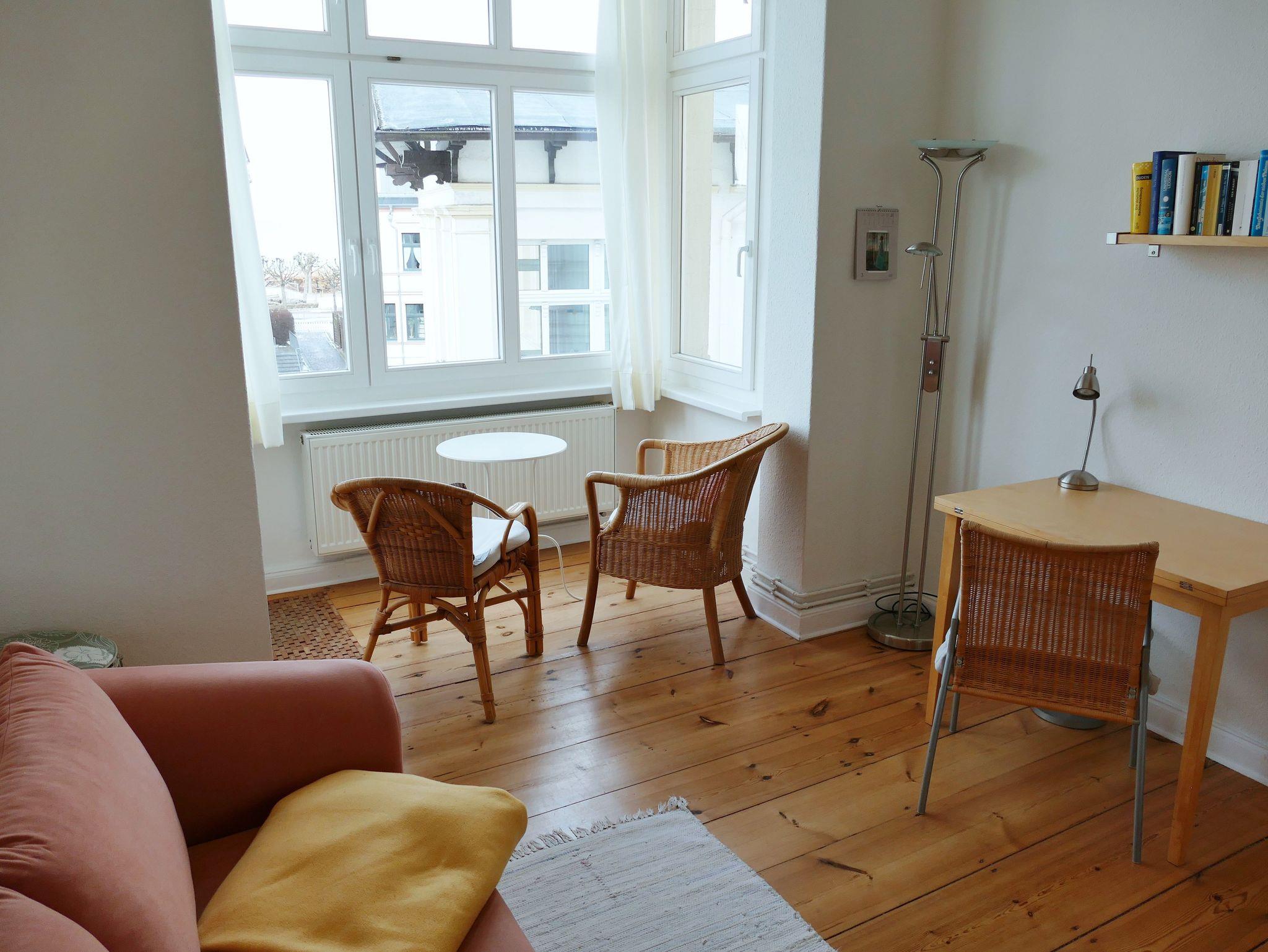 Die gemütliche Nichraucher-Wohnung im 1. Obergeschoss bietet Ihnen auf drei Zimmern - Wohnzimmer mit offener Küche, Schlafzimmer mit Doppelbett sowie Gästezimmer mit Schlafcouch - viel Platz für einen erholsamen Urlaub. Das Badezimmer ist mit einer Dusche ausgestattet. Der historische Charme der Wohnung zeigt sich in den originalen Holzdielen aus der Gründerzeit, kombiniert mit hochwertigen Massivholzmöbeln und stilvollen Rattan-Elementen. Die moderne Küchenzeile verfügt über Herd, Backofen, Spülmaschine, Kühlschrank und Mikrowelle - ideal für Selbstversorger. Zur weiteren Ausstattung gehören Fernseher, CD-Player und eine eigene Waschmaschine. Ein Parkplatz steht Ihnen direkt am Haus zur Verfügung. Auf Wunsch stellen wir Ihnen kostenfrei ein Kinderbett und einen Hochstuhl bereit. Bettwäsche und Handtücher können gegen Aufpreis hinzugebucht werden.