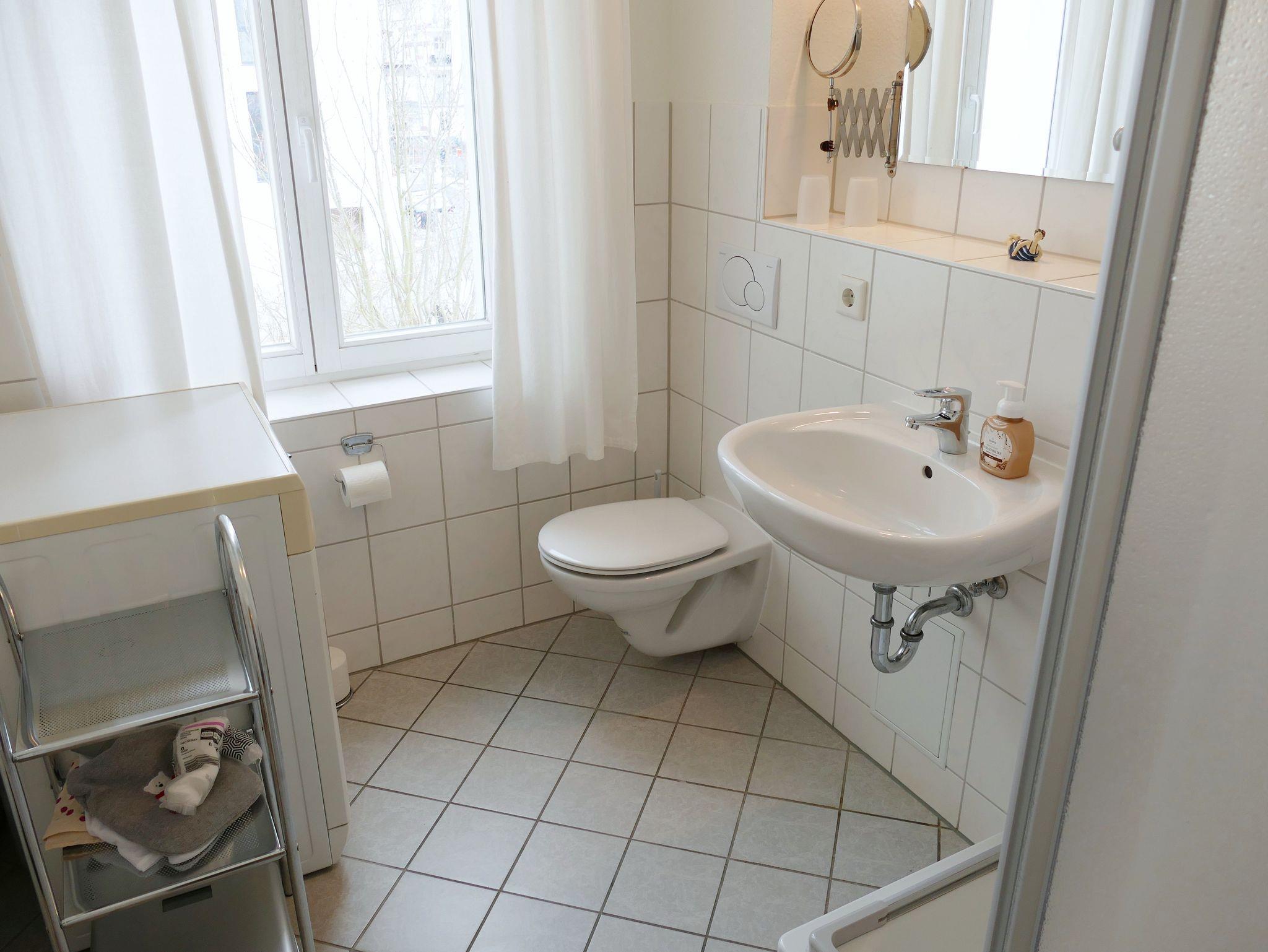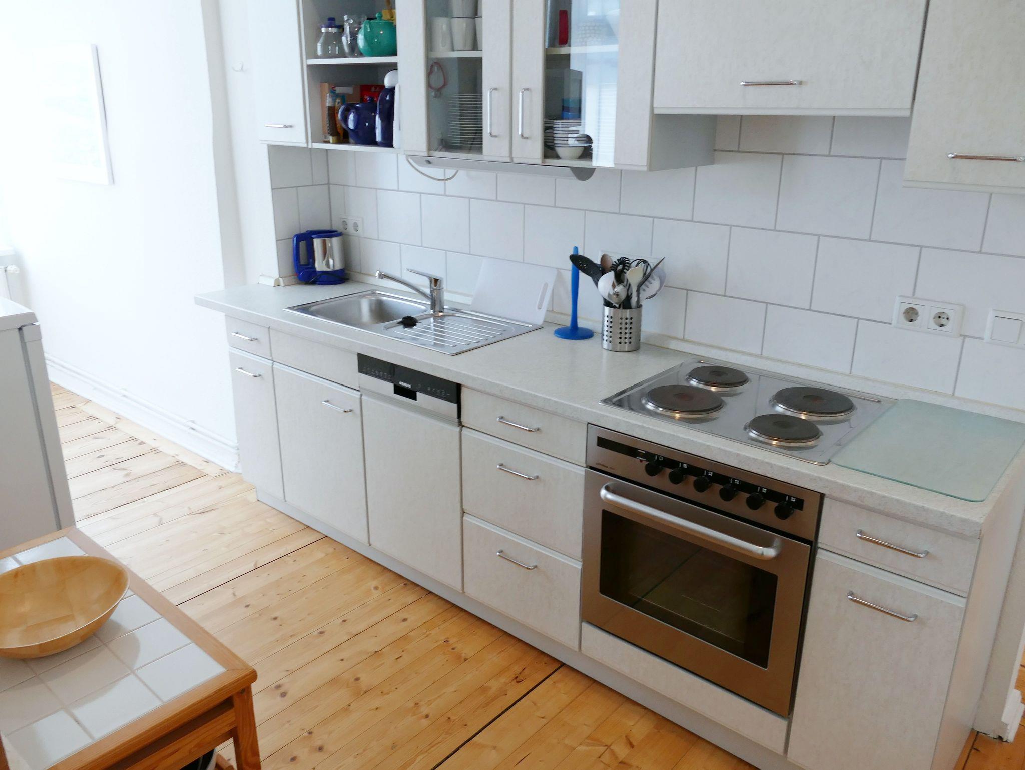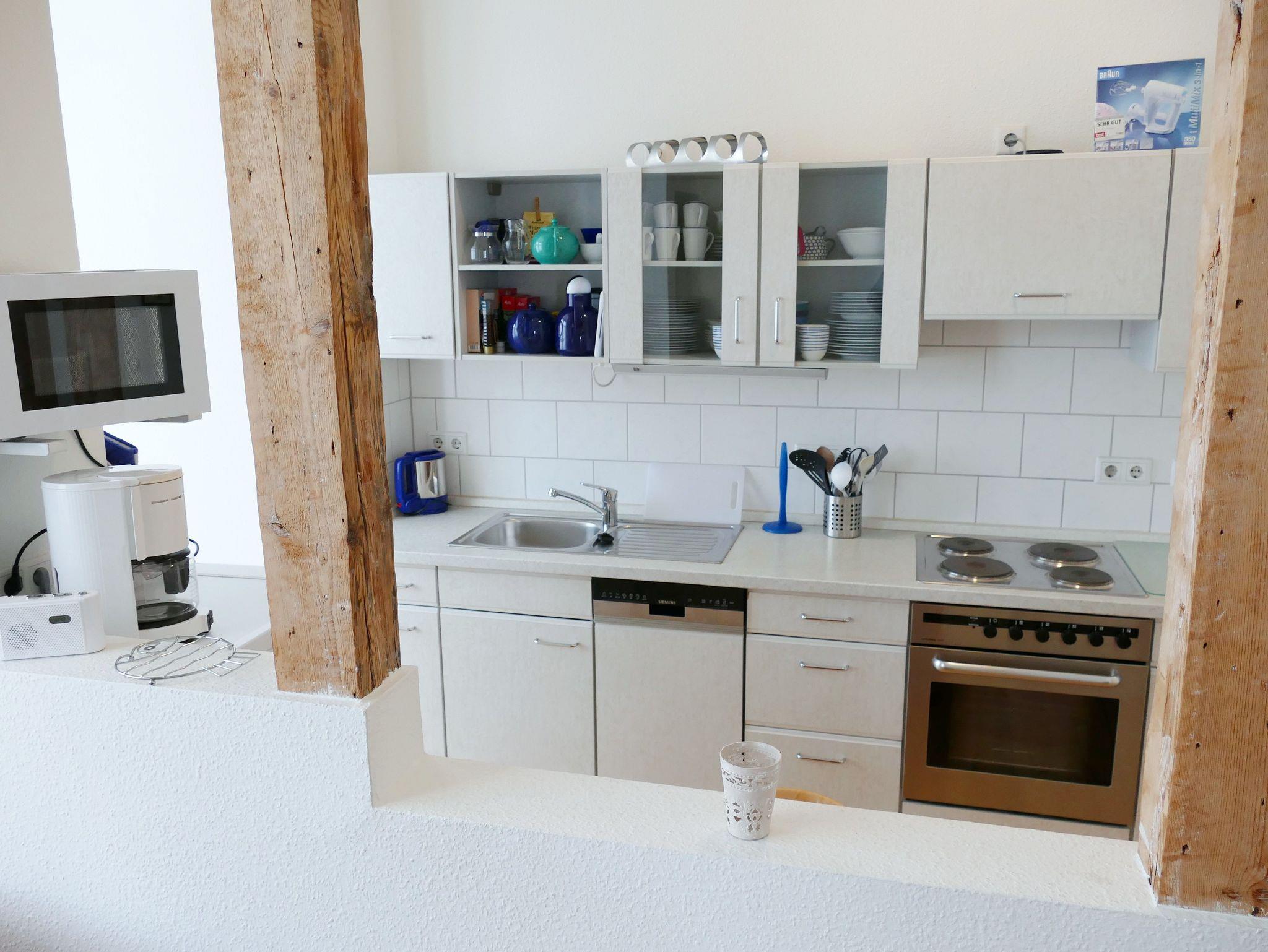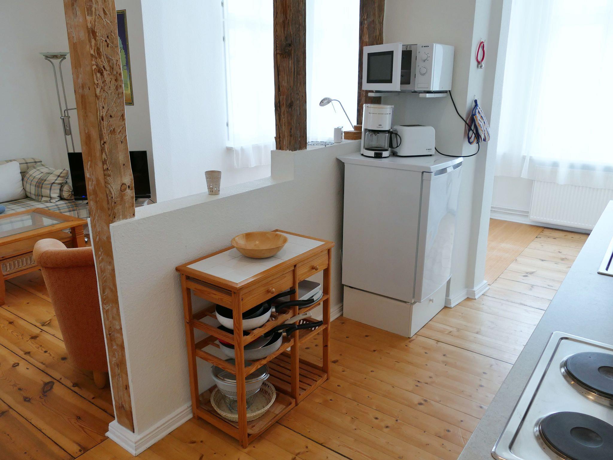 Die gemütliche Nichraucher-Wohnung im 1. Obergeschoss bietet Ihnen auf drei Zimmern - Wohnzimmer mit offener Küche, Schlafzimmer mit Doppelbett sowie Gästezimmer mit Schlafcouch - viel Platz für einen erholsamen Urlaub. Das Badezimmer ist mit einer Dusche ausgestattet. Der historische Charme der Wohnung zeigt sich in den originalen Holzdielen aus der Gründerzeit, kombiniert mit hochwertigen Massivholzmöbeln und stilvollen Rattan-Elementen. Die moderne Küchenzeile verfügt über Herd, Backofen, Spülmaschine, Kühlschrank und Mikrowelle - ideal für Selbstversorger. Zur weiteren Ausstattung gehören Fernseher, CD-Player und eine eigene Waschmaschine. Ein Parkplatz steht Ihnen direkt am Haus zur Verfügung. Auf Wunsch stellen wir Ihnen kostenfrei ein Kinderbett und einen Hochstuhl bereit. Bettwäsche und Handtücher können gegen Aufpreis hinzugebucht werden.