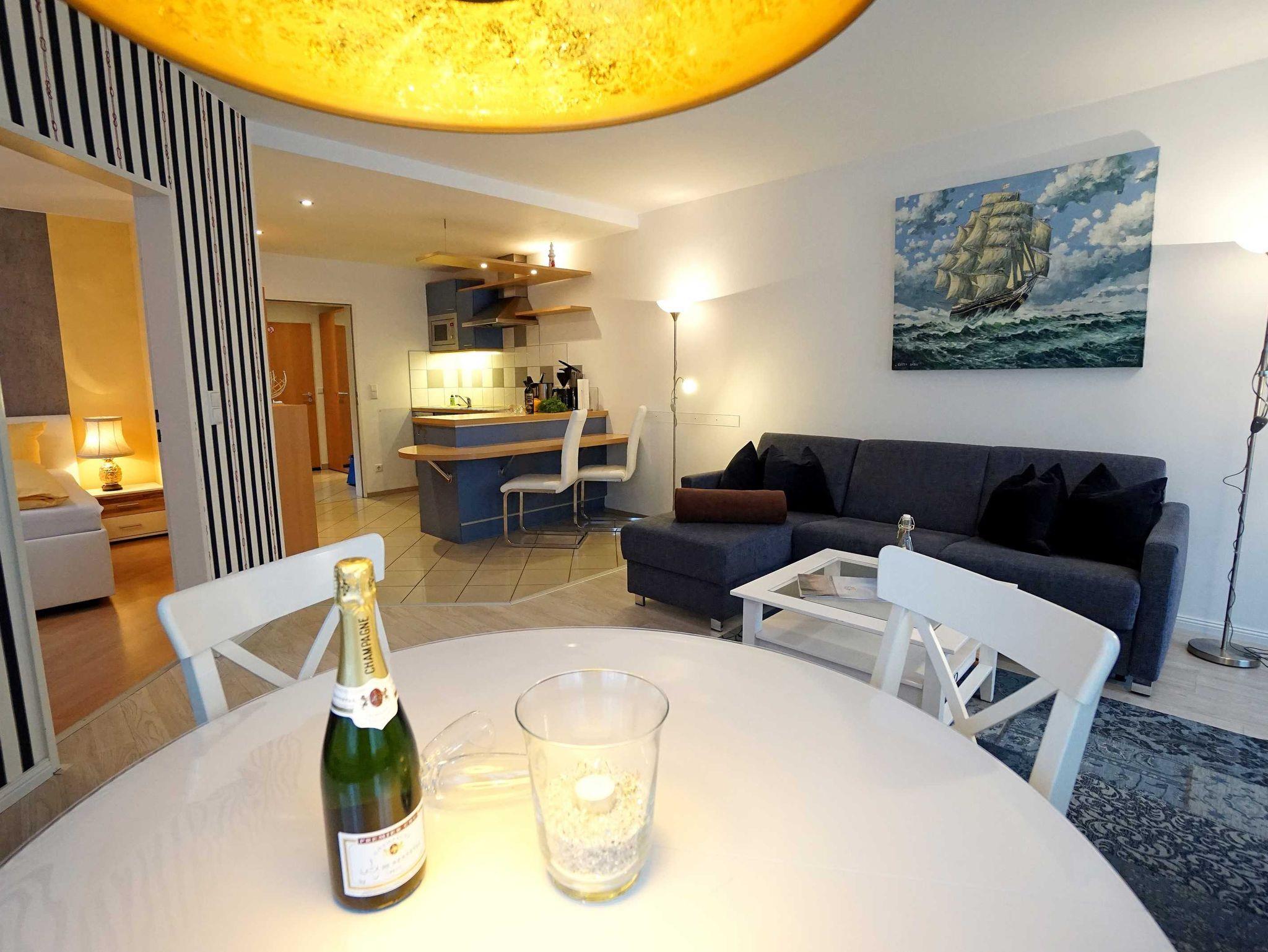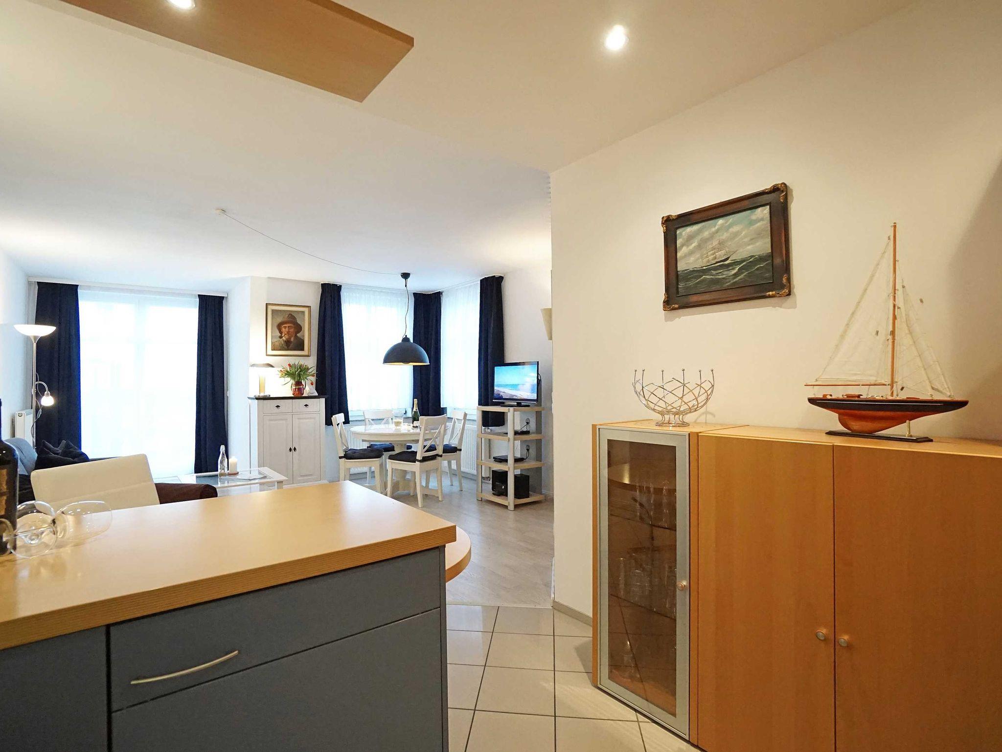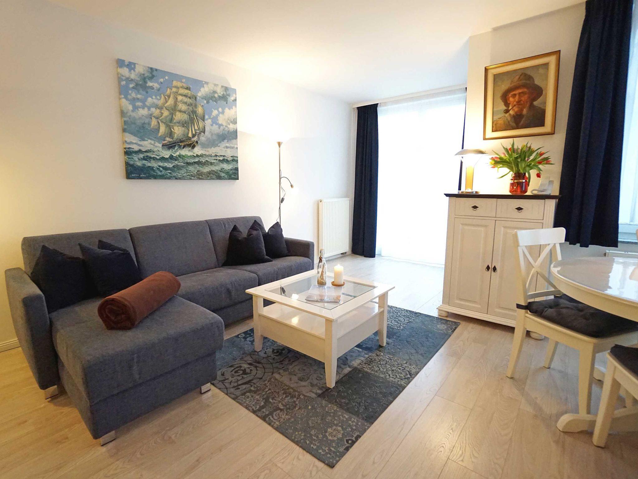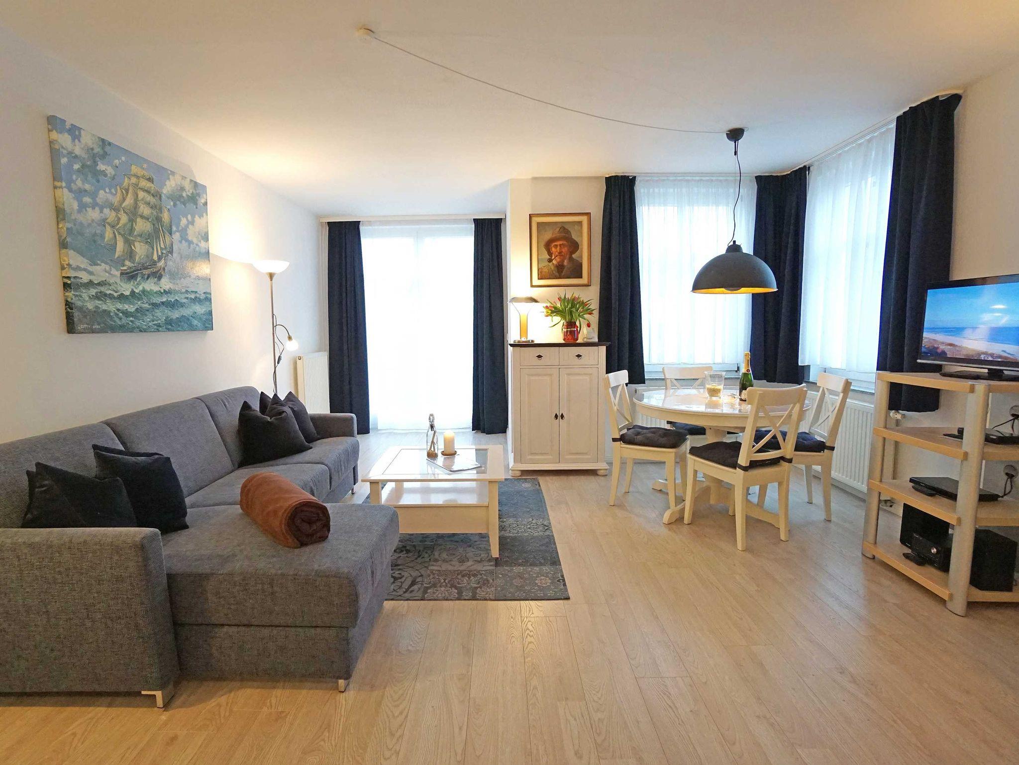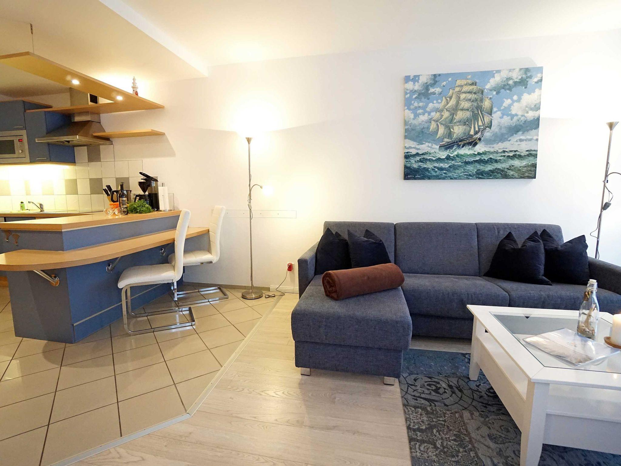 Diese sehr helle und gut geschnittene Wohnung im Erdgeschoss (52 m²) bietet alles, was Sie für einen entspannten Aufenthalt auf der Insel Usedom benötigen. An den großzügigen Wohnraum mit komfortabler Schlafcouch schließt sich direkt die offene, vollausgestattete Küche mit Tresen an. Das Schlafzimmer mit der breiten Fensterfront (Boxspingbett) ist vom Wohnzimmer zu begehen. Ein modernes Duschbad mit Fenster sowie die Eingangsdiele komplettieren die Wohnung. Genießen Sie den Sonnenuntergang auf der großen, nach Westen ausgerichteten Terrasse.