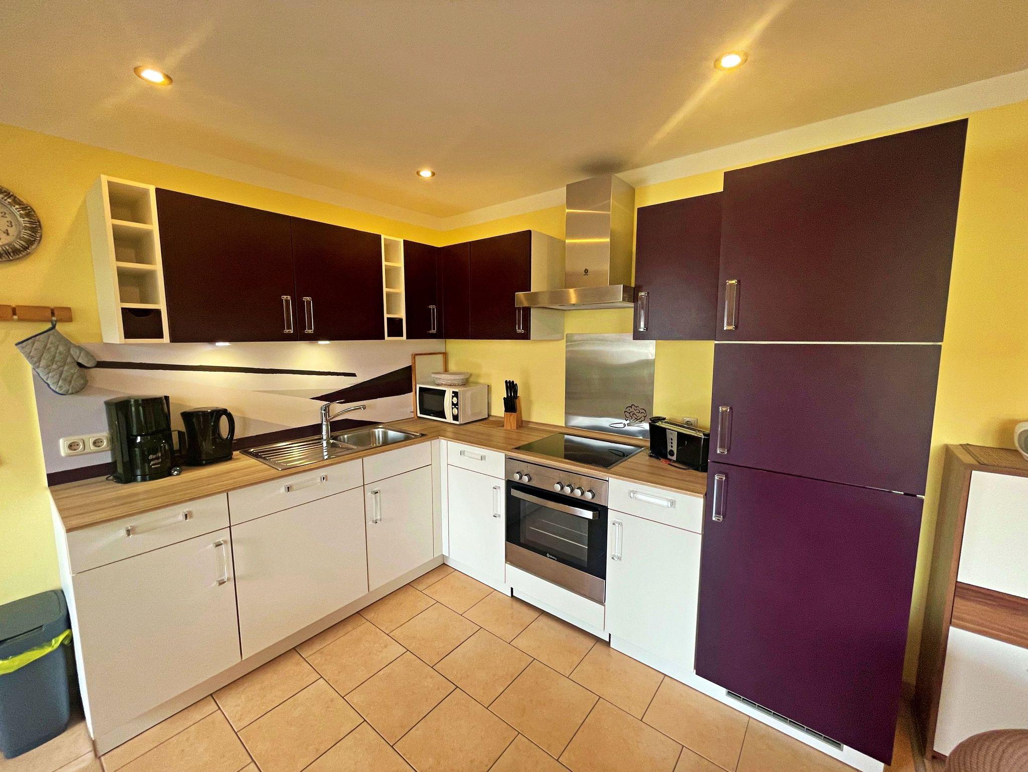 ? der Küchenbereich im Obergeschoss ist mit einer Einbauküche mit Herd, Backofen, Spüle, Spülmaschine, Kühlschrank mit Gefrierfach, Kaffeemaschine, Toaster, Wasserkocher, Eierkocher, Mikrowelle und Geschirr ausgestattet,