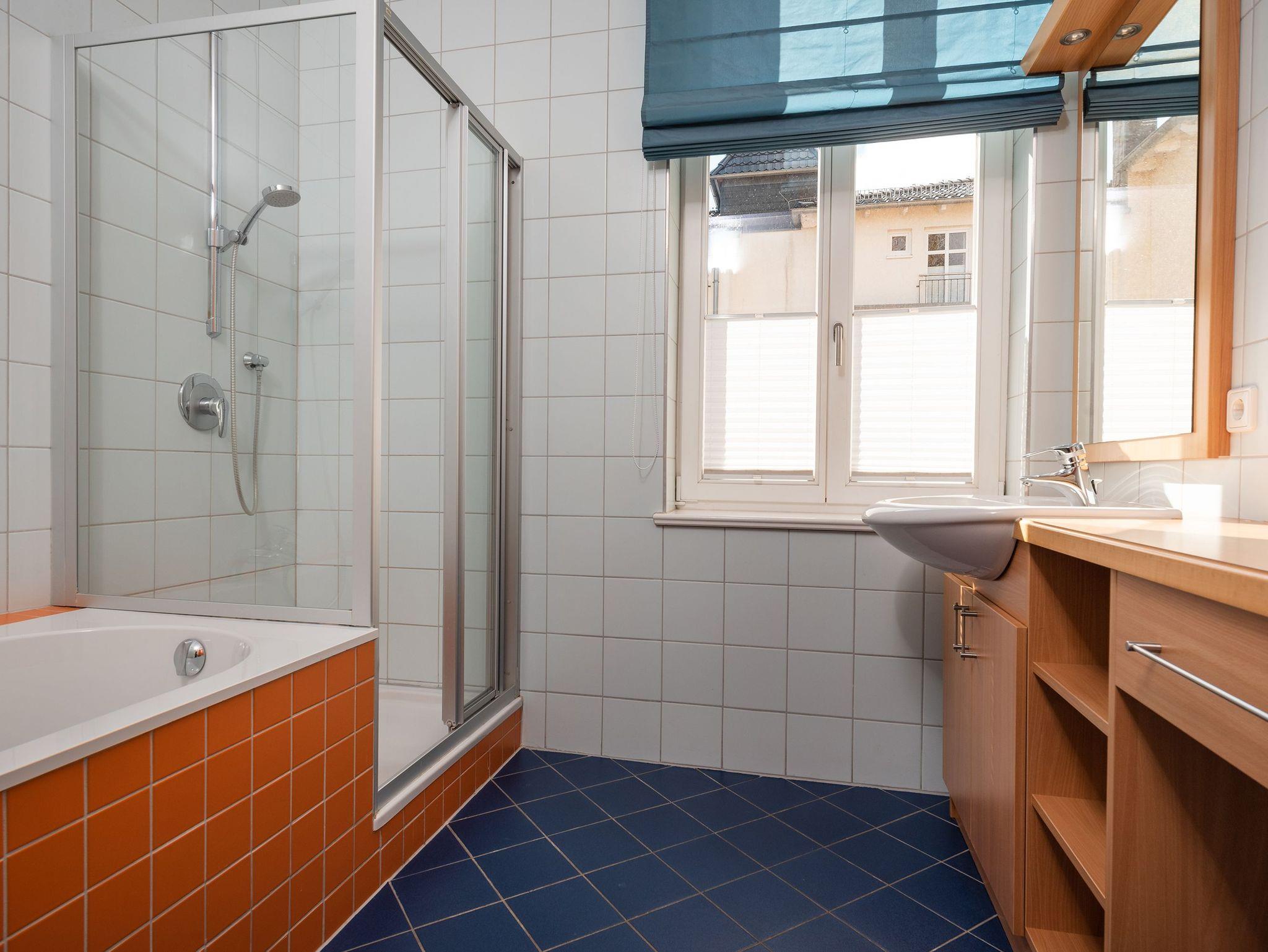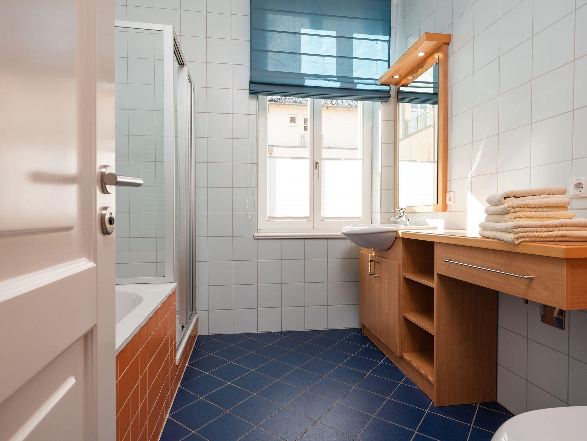 • Das Badezimmer ist mit einer Badewanne, einer Dusche, WC und einem Waschtisch ausgestattet. Zusätzlich stehen eine Waschmaschine und ein Trockner im Nebengebäude zur Verfügung.