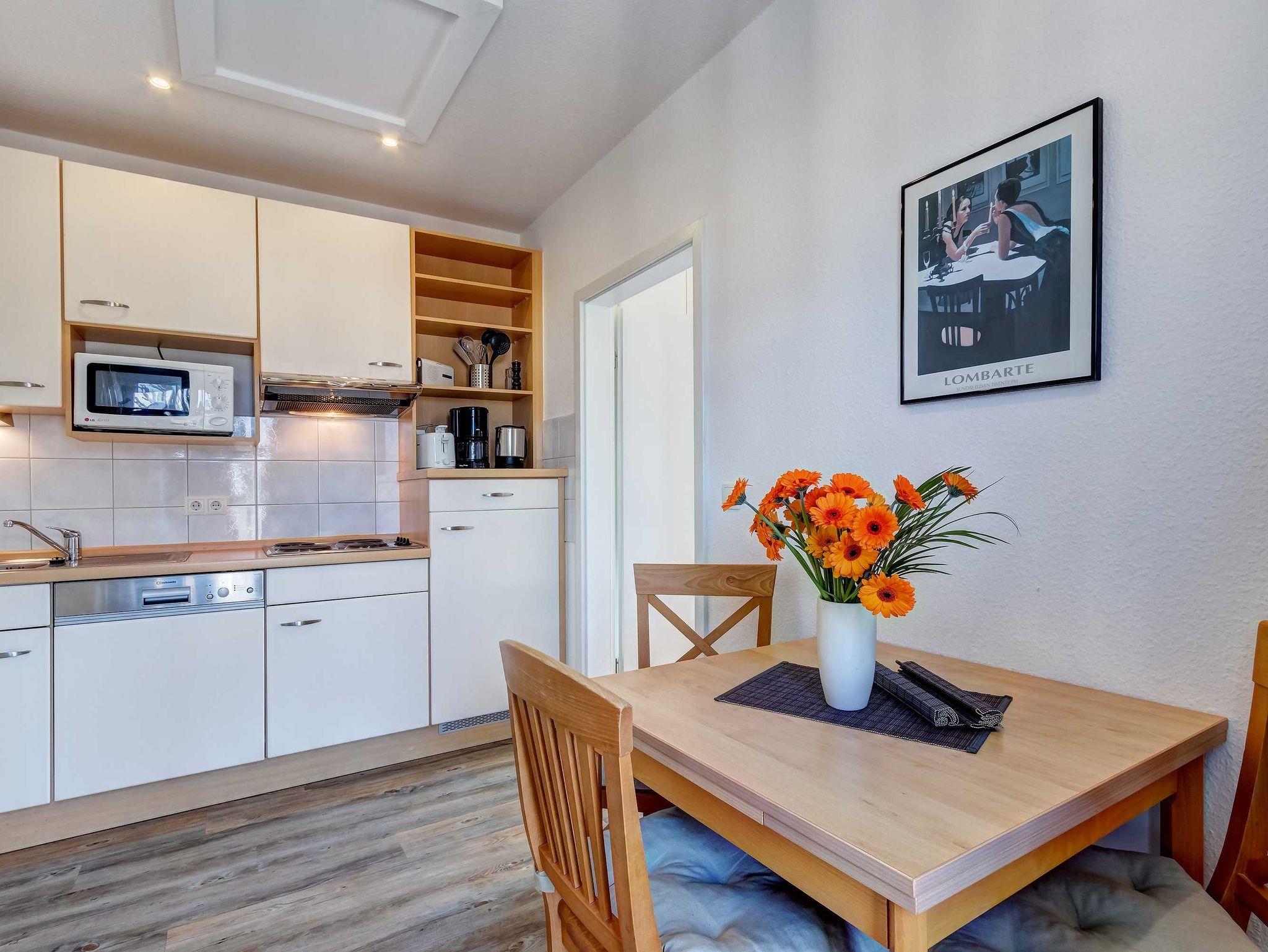 1. Reihe an der Strandpromenade mit DACHTERRASSE und FAHRSTUHL im Haus! Chices 1-Zimmer-Apartment mit moderner guter Ausstattung. Kombinierter Wohn-/Schlafraum, separate Küche mit Essplatz, Duschbad, Dachterrasse nach Süden mit Sonne bis abends. Die Wohnung verfügt über einen Pkw-Stellplatz. In der Garage können auch Fahrräder und ähnliches untergestellt werden. In unserer Villa Germania nebenan gibt es eine Sauna. Von der Villa Aquamarina sind es zum Ortszentrum und der Seebrücke ca. 3 Minuten zu Fuß. Zum Strand sind es 50 m.
