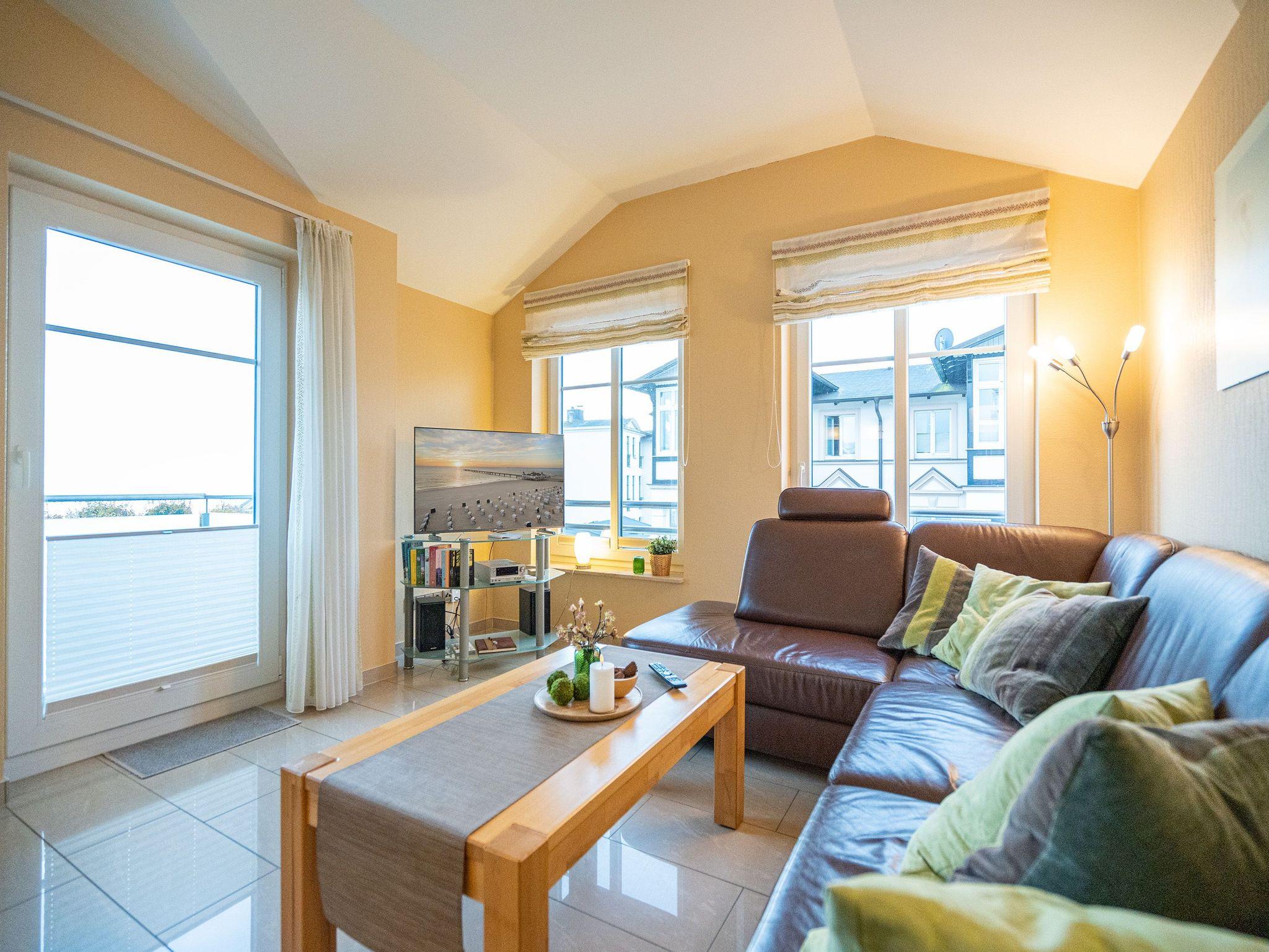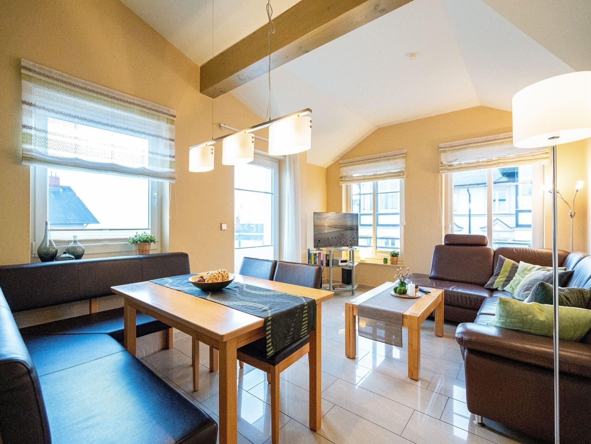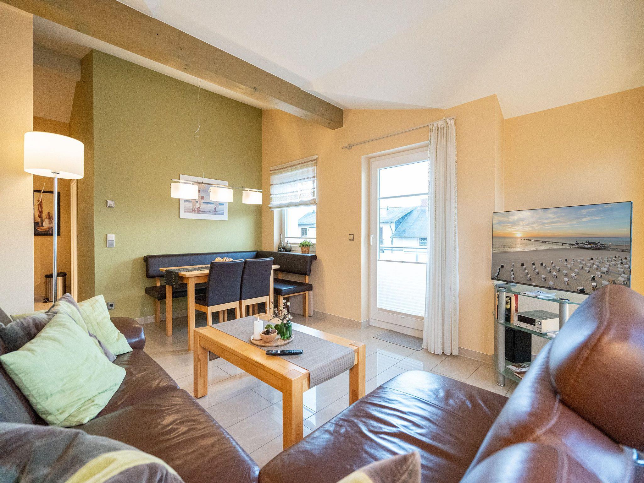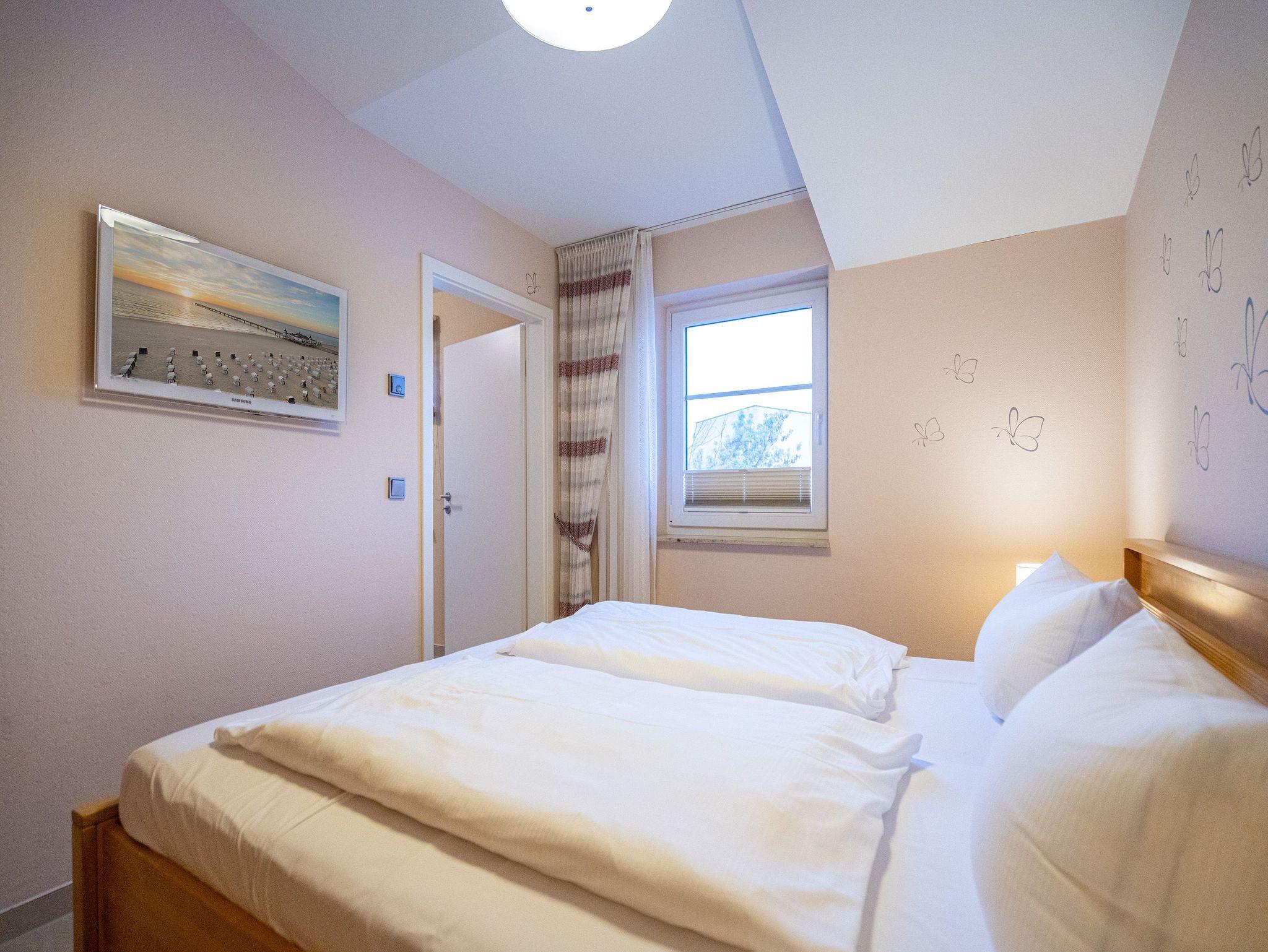 Wohnen mit Meerblick ? dieses 50?qm große Appartement im Dachgeschoss bietet Platz für 2 Personen und punktet mit moderner Ausstattung und direktem Ostseeblick. Die helle 2-Zimmer-Wohnung verfügt über einen Wohn-Essbereich mit einer Sitzgruppe inklusive Schlaffunktion (als Ausweichmöglichkeit nutzbar) sowie einem 43-Zoll Flat-TV mit Smart-TV. Eine Essecke und der Nordost-Balkon (2,5?qm) mit freiem Blick auf das Meer machen diesen Bereich besonders attraktiv. Die voll ausgestattete Küche bietet Herd, Backofen, Spülmaschine, Kühlschrank mit Gefrierfach, Mikrowelle und verschiedene Kleinküchengeräte ? ideal für Selbstversorger. Im separaten Schlafzimmer sorgt ein Doppelbett (1,80?m x 2,00?m) für erholsamen Schlaf. Ein zusätzlicher Flat-TV sowie ausreichend Stauraum für Ihre Garderobe stehen ebenfalls zur Verfügung. Das Bad ist mit Dusche, Waschtisch, WC und Fön ausgestattet. Zum Appartement gehört der Tiefgaragenstellplatz Nr. W12. Fahrräder können Sie am Fahrradständer am Haus abstellen. WLAN ist kostenfrei nutzbar. Bei Ihrer Anreise sind die Betten bezogen und Handtücher liegen bereit. Als besonderes Extra steht Ihnen von Mitte Mai bis September (je nach Witterung) ein Strandkorb am Strand kostenlos zur Verfügung.