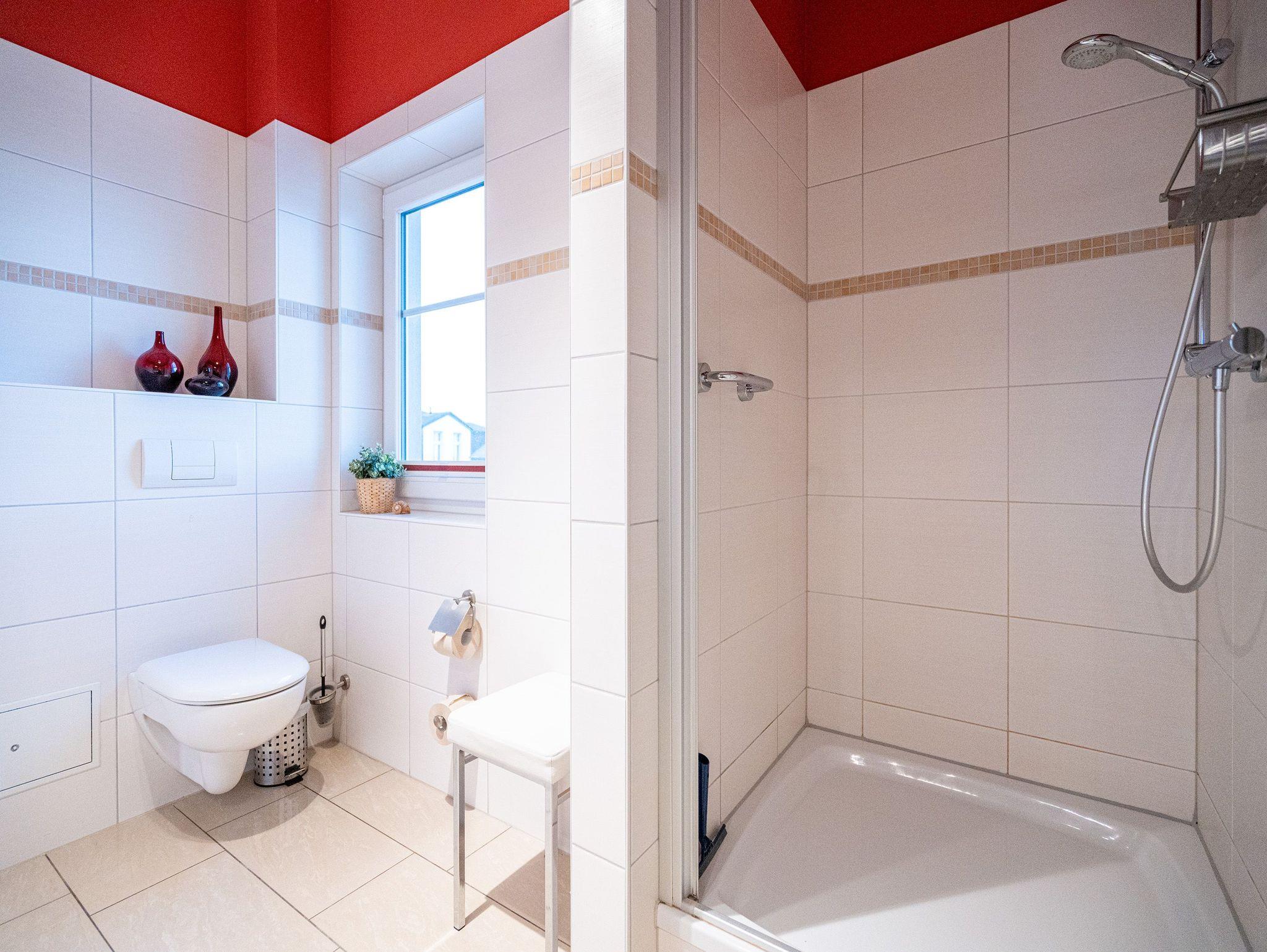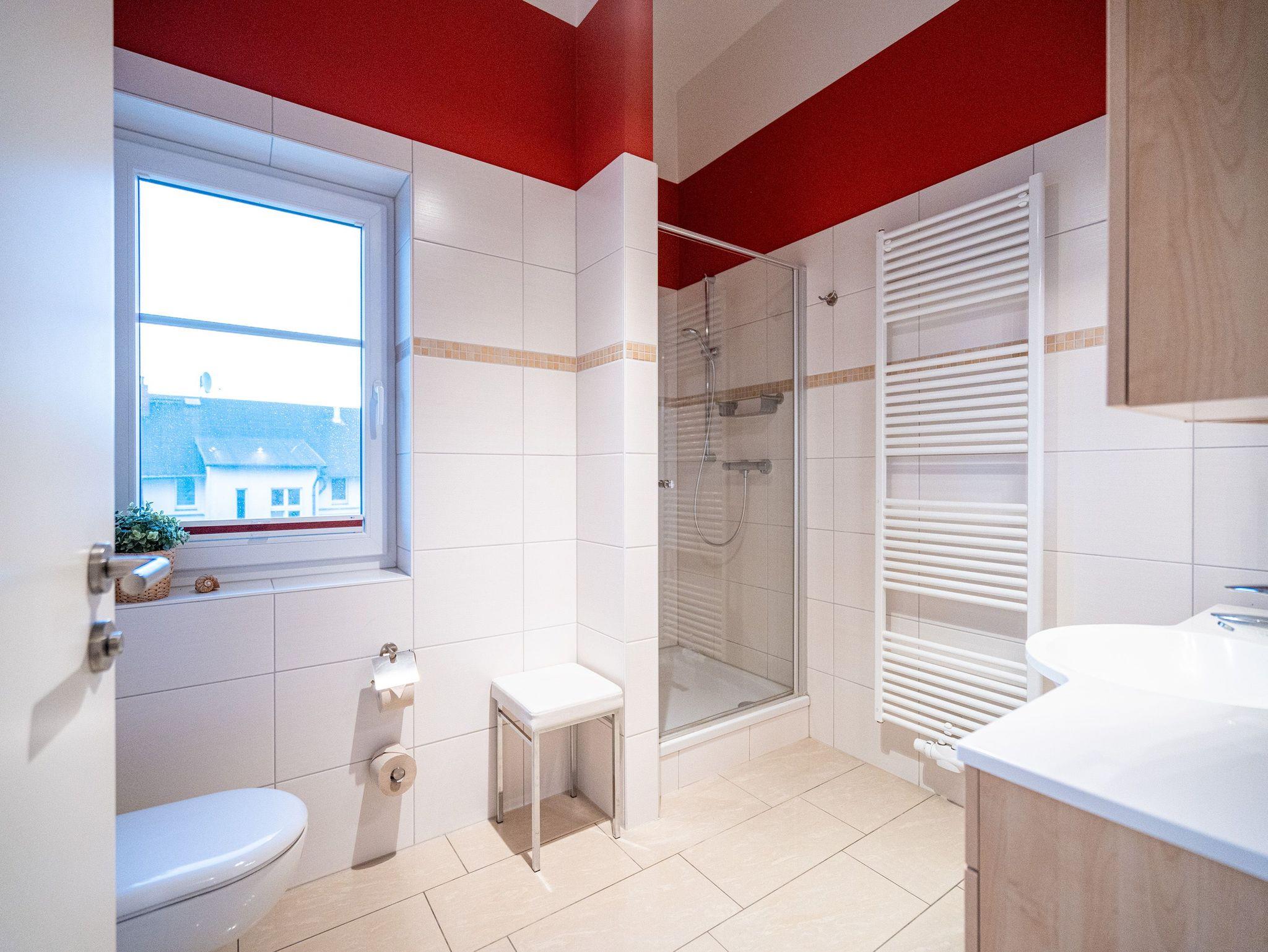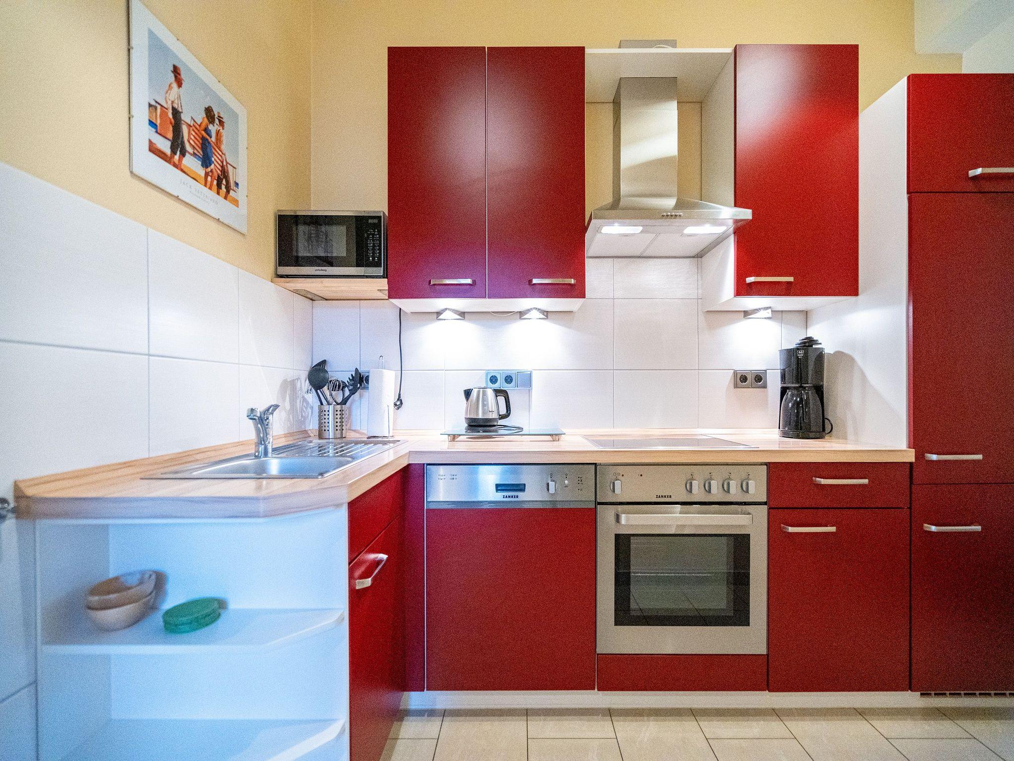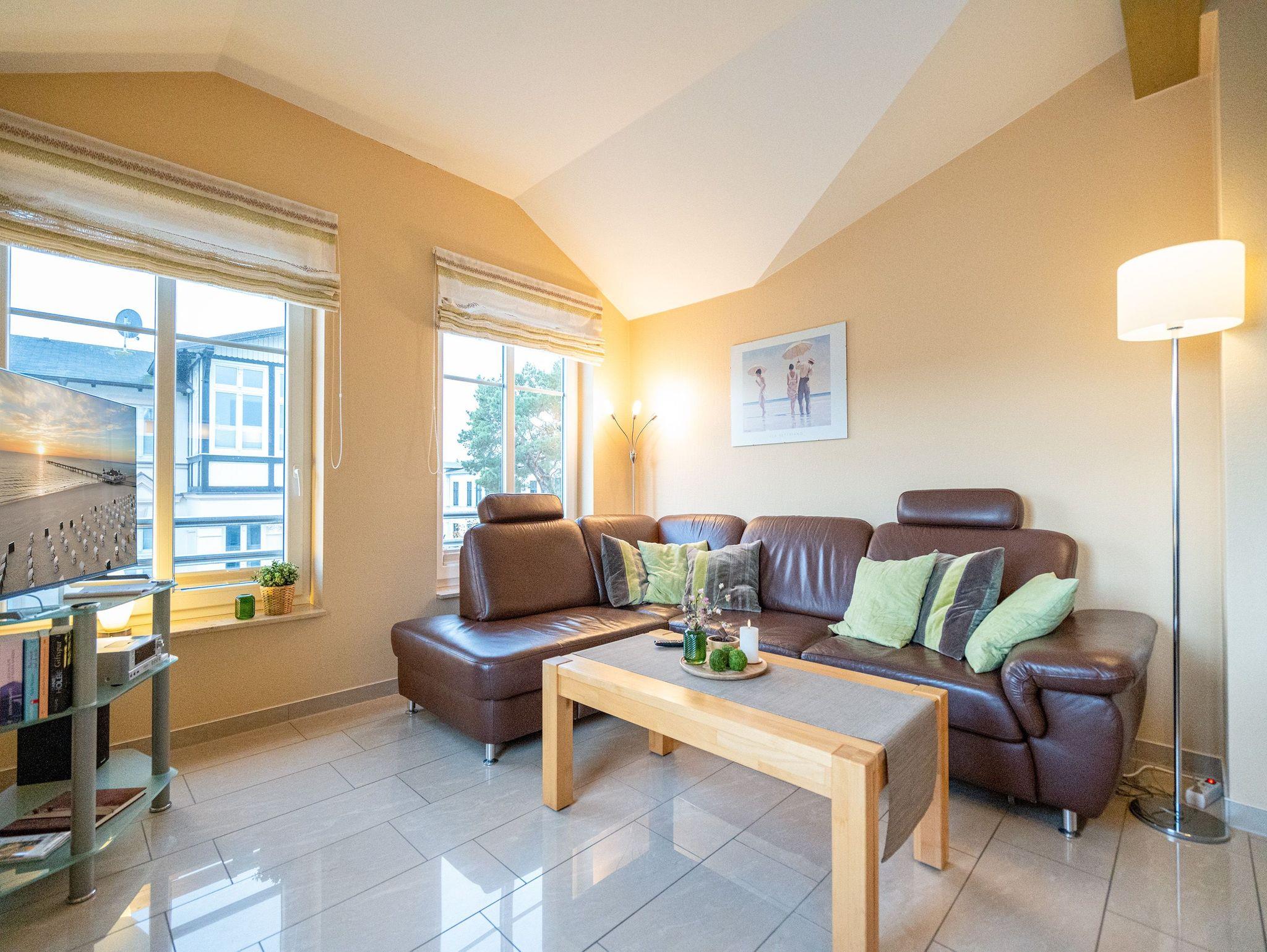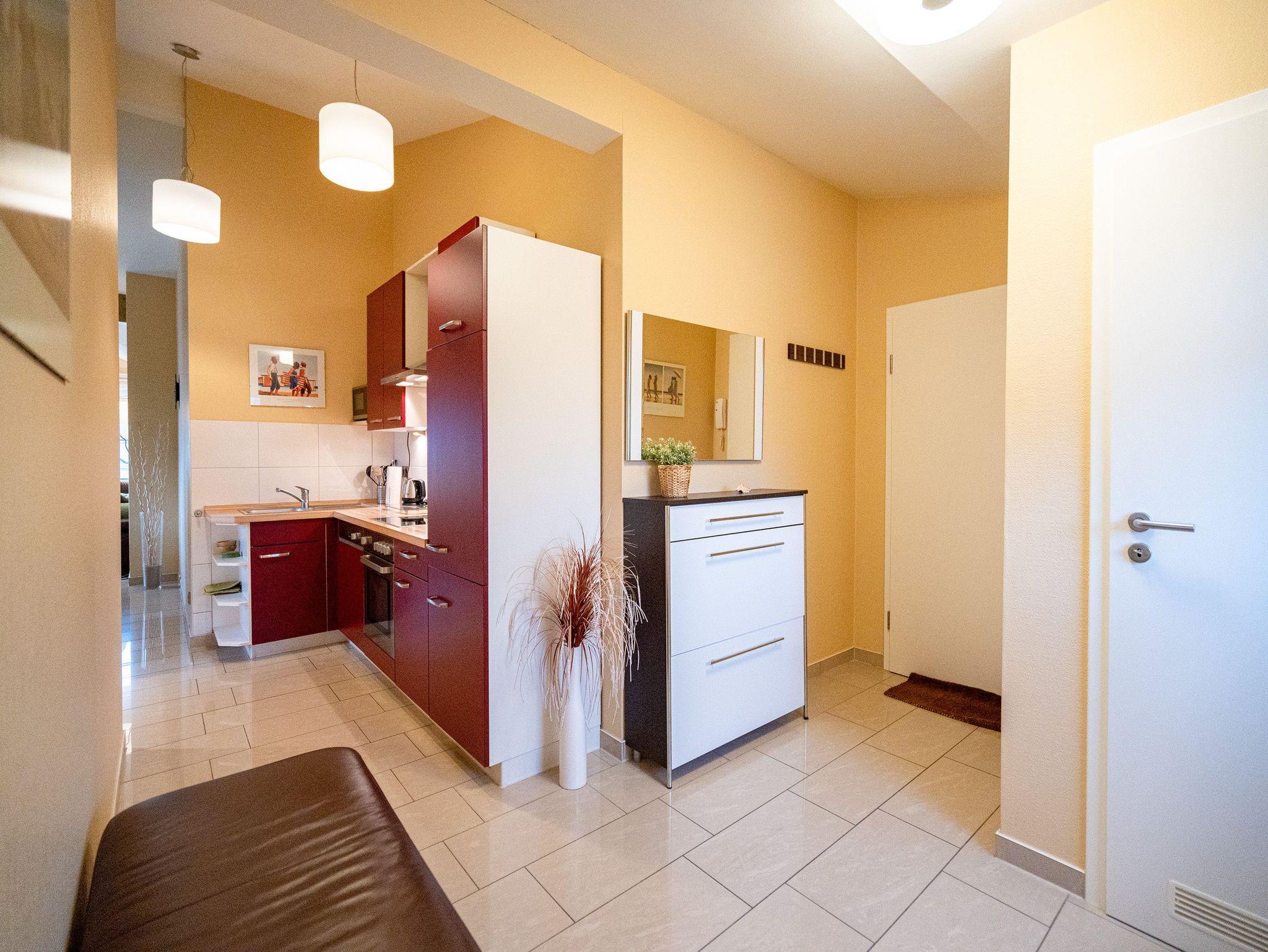 Wohnen mit Meerblick ? dieses 50?qm große Appartement im Dachgeschoss bietet Platz für 2 Personen und punktet mit moderner Ausstattung und direktem Ostseeblick. Die helle 2-Zimmer-Wohnung verfügt über einen Wohn-Essbereich mit einer Sitzgruppe inklusive Schlaffunktion (als Ausweichmöglichkeit nutzbar) sowie einem 43-Zoll Flat-TV mit Smart-TV. Eine Essecke und der Nordost-Balkon (2,5?qm) mit freiem Blick auf das Meer machen diesen Bereich besonders attraktiv. Die voll ausgestattete Küche bietet Herd, Backofen, Spülmaschine, Kühlschrank mit Gefrierfach, Mikrowelle und verschiedene Kleinküchengeräte ? ideal für Selbstversorger. Im separaten Schlafzimmer sorgt ein Doppelbett (1,80?m x 2,00?m) für erholsamen Schlaf. Ein zusätzlicher Flat-TV sowie ausreichend Stauraum für Ihre Garderobe stehen ebenfalls zur Verfügung. Das Bad ist mit Dusche, Waschtisch, WC und Fön ausgestattet. Zum Appartement gehört der Tiefgaragenstellplatz Nr. W12. Fahrräder können Sie am Fahrradständer am Haus abstellen. WLAN ist kostenfrei nutzbar. Bei Ihrer Anreise sind die Betten bezogen und Handtücher liegen bereit. Als besonderes Extra steht Ihnen von Mitte Mai bis September (je nach Witterung) ein Strandkorb am Strand kostenlos zur Verfügung.
