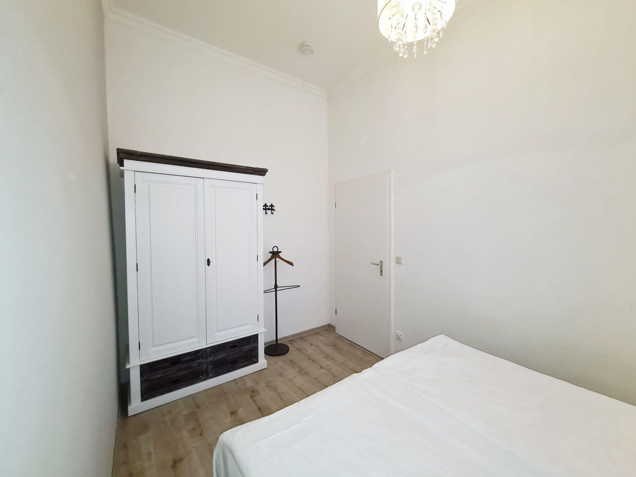 Das geräumige Apartment 11 liegt im Hochparterre der historischen Villa Schloss Hohenzollern und hat einen eigenen Eingang. Das Treppenpodest vor dem Wohnungseingang kann als Balkon genutzt werden, wo den ganzen Vormittag das Sonnenlicht ist. Der kostenlose Privatparkplatz befindet sich vor dem Haus. Der Stellplatz ist durch einen Baum etwas beengt und nur für Klein- und Kompaktwagen geeignet. Kostenloses WLAN ist in der ganzen Unterkunft verfügbar.