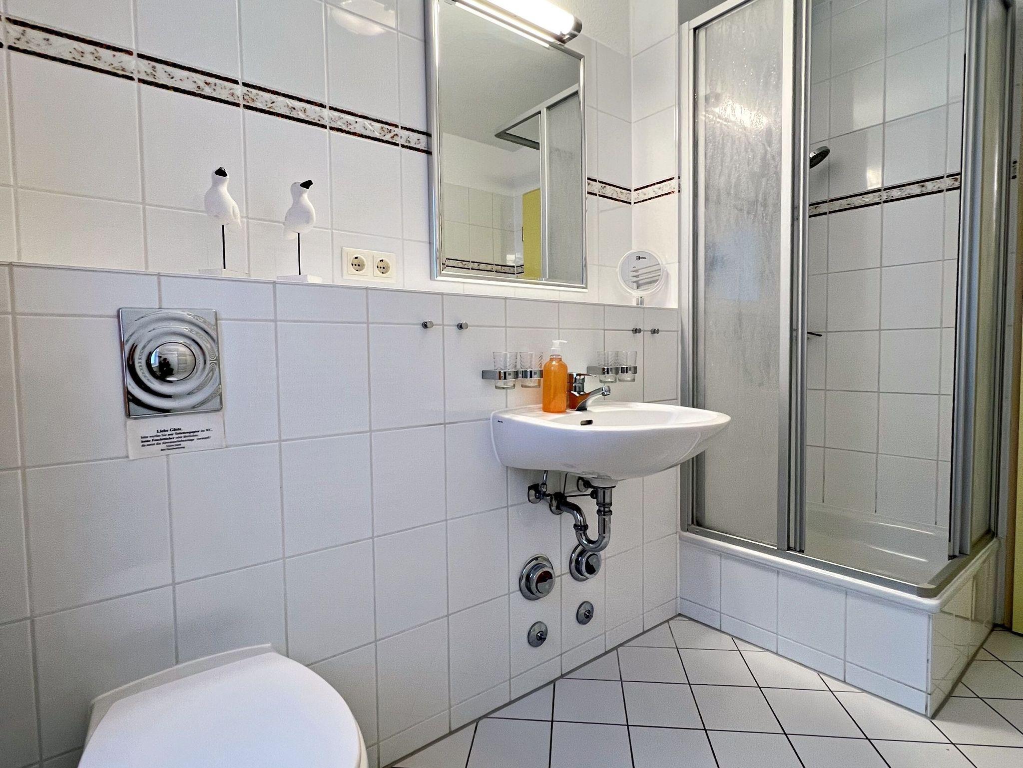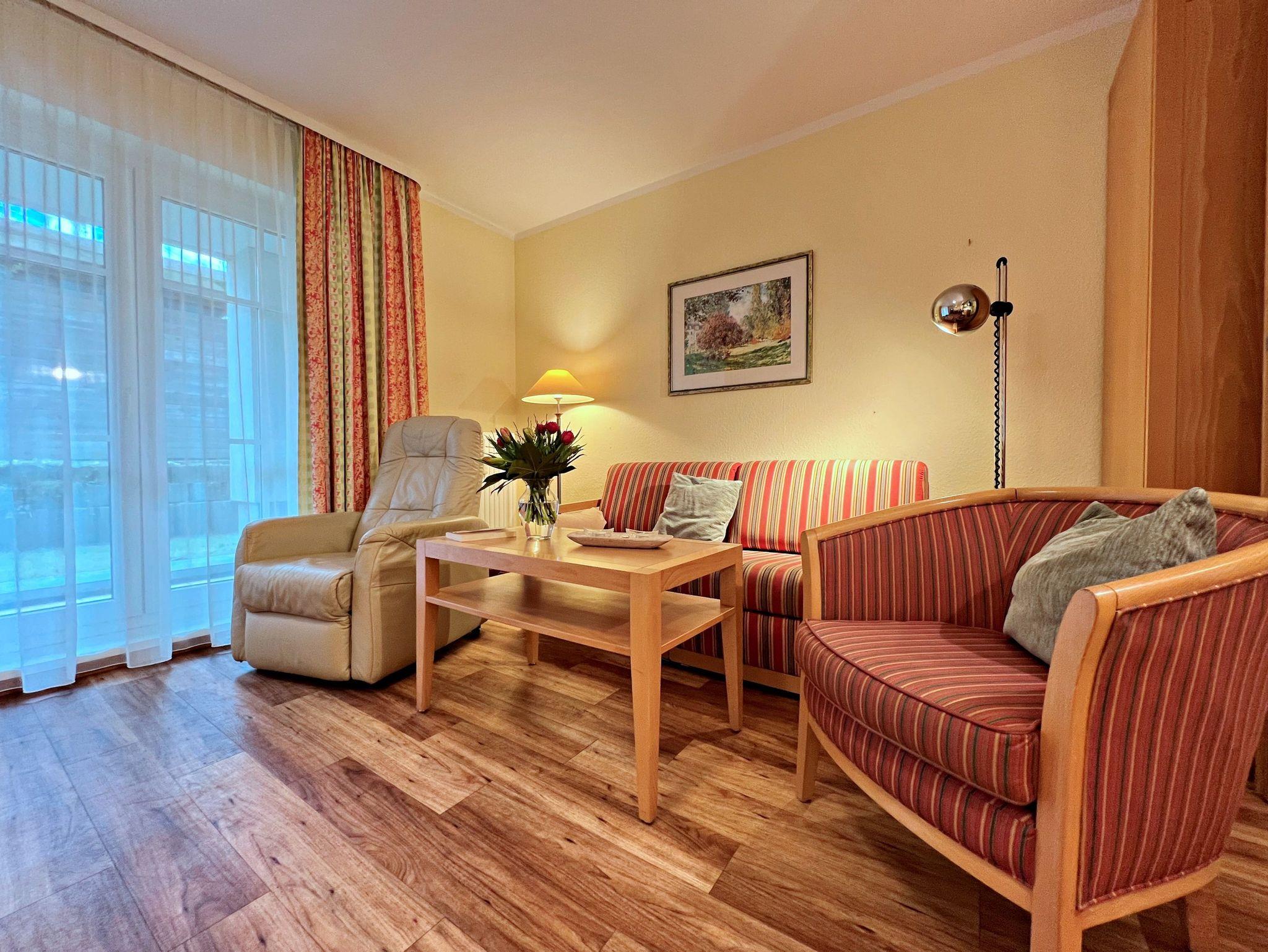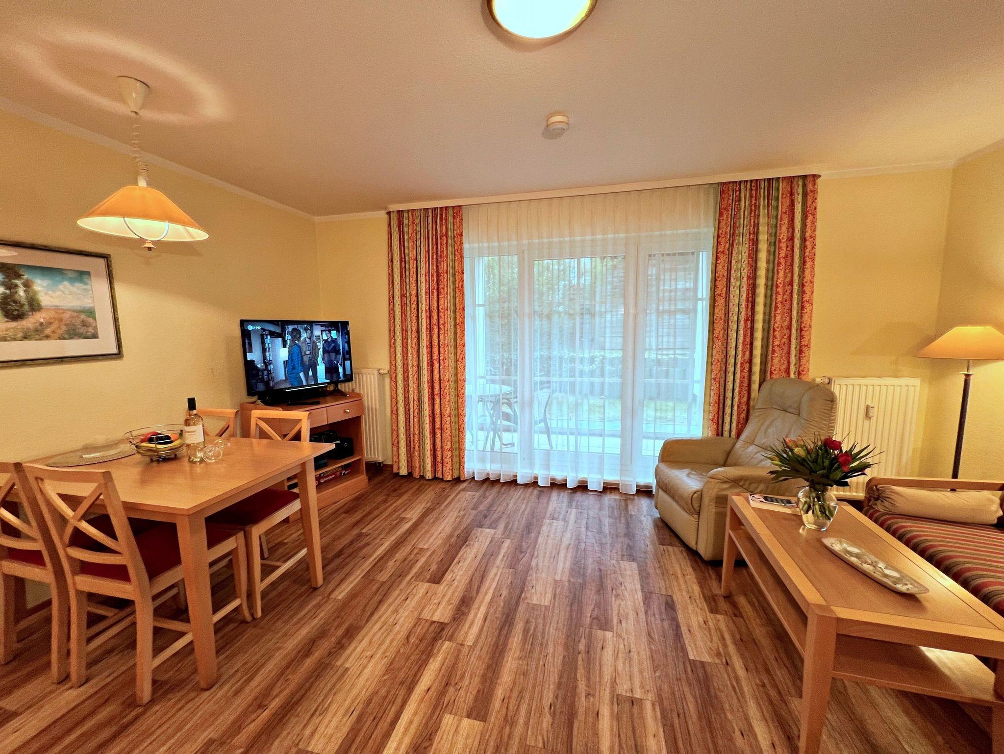 Diese 46 qm große helle und freundliche 2-Raum-Ferienwohnung befindet sich im Erdgeschoss (Süd-Ostlage) der Appartementanlage und hier können bis zu 4 Personen einen erholsamen Urlaub verleben. Die Wohnung verfügt über ein Wohnzimmer mit einem gemütlichen Sofa, welches auch zum Schlafen geeignet ist. Für die Unterhaltung sorgt ein Flachbild-TV und eine Stereo-Anlage. Die vollständig ausgestattete Küche mit Ceranherd, Backofen, Mikrowelle, Kühlschrank mit Gefrierfach und Spülmaschine lässt keine Wünsche offen. Im gemütlichen Schlafzimmer befindet sich ein Doppelbett (2,10 m lang) sowie ein zweiter Flachbild-TV. Das Tageslicht-Bad ist mit Dusche/WC, Haarfön nebst Kosmetikspiegel ausgestattet. Eine Terrasse lädt zum Sitzen und Verweilen ein. Hier können Sie bei schönstem Wetter schon morgens Ihren Kaffee genießen oder den Tag bei Glas Wein ausklingen lassen. WLAN steht Ihnen in der gesamten Wohnung kostenfrei zur Verfügung. Ein Kinderbett mit Wäsche sowie ein Hochstuhl können auf Anfrage gegen eine Gebühr von einmalig 50 € vom Verwalter zur Verfügung gestellt werden. In der Zeit vom 15.04. bis 15.10. steht ein Strandkorb am Strand zur Nutzung zur Verfügung.
