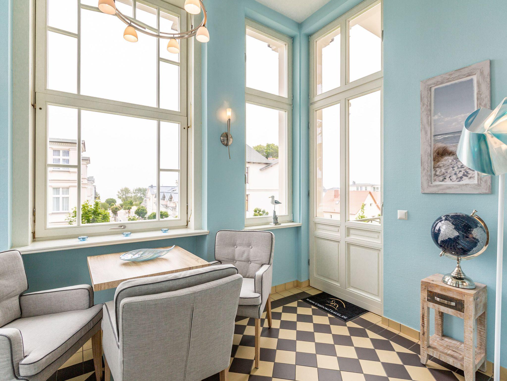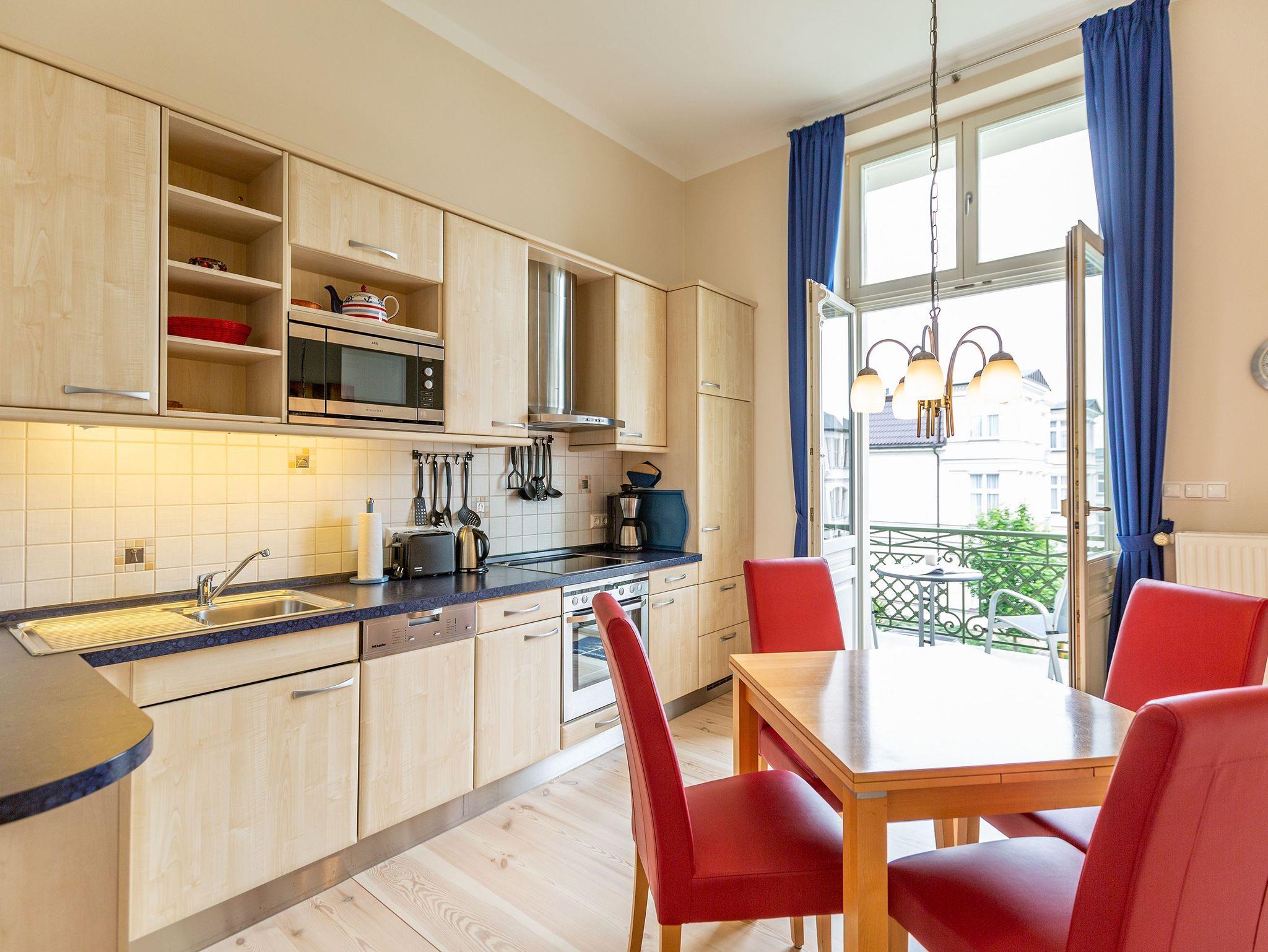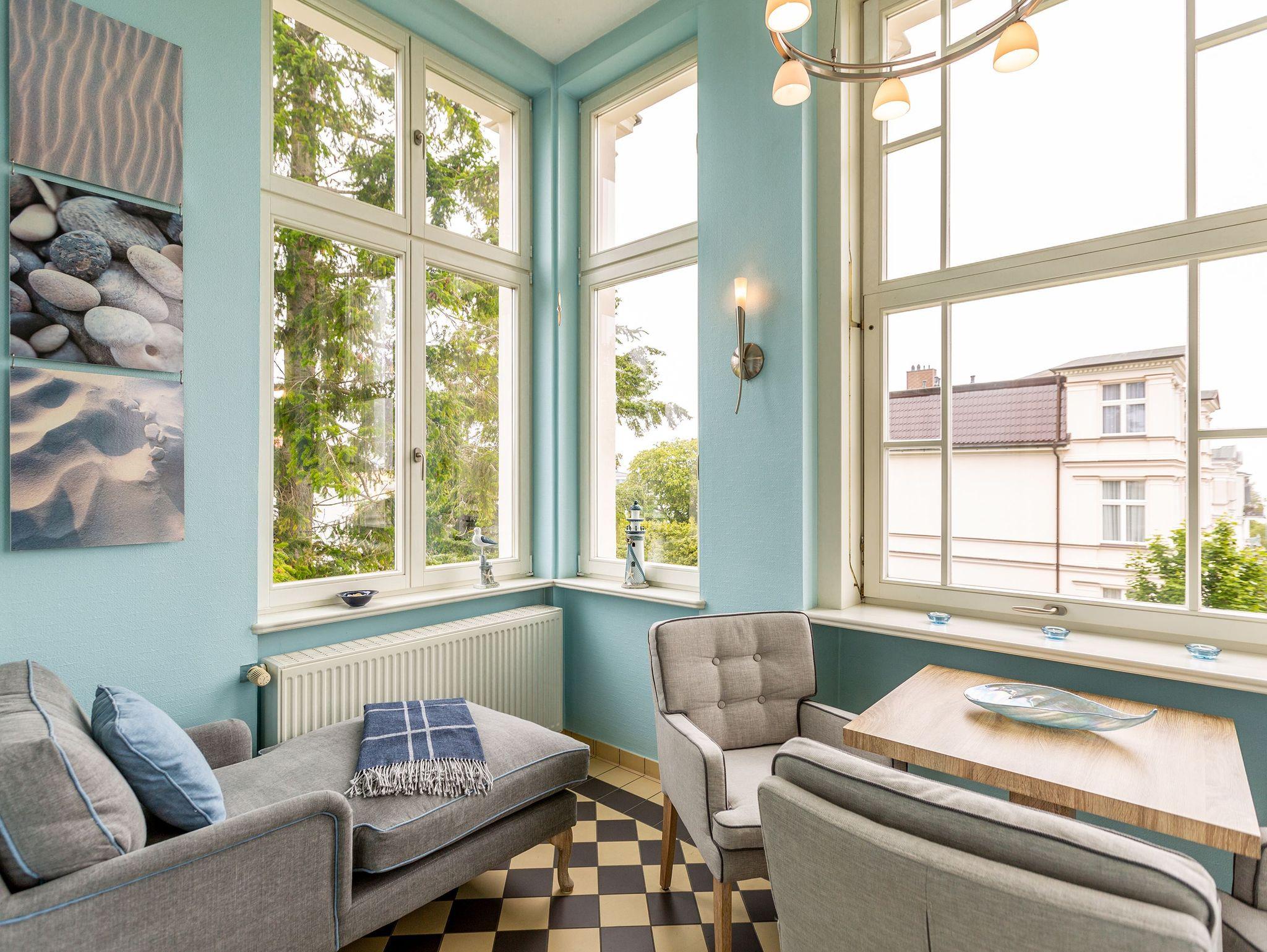 Mit diesem Domizil entscheiden Sie sich für eine exklusive Möglichkeit, Ihren Urlaub in den Kaiserbädern zu verbringen. Die 1898, im wilhelminischen Baustil errichtete Villa, präsentiert Ihnen seit Januar 2005 hochherrschaftliches Wohnen in ruhiger Lage. Großzügige Räumlichkeiten, historische Veranden und Balkone sorgen für rundherum gelungene Urlaubstage. Der große Saunabereich (kostenfrei) im Untergeschoss der Villa bietet Ihnen an kälteren Tagen eine angenehme Abwechslung. Für jede Wohnung steht ein PKW-Stellplatz am Haus zur Verfügung (größtenteils überdacht), für Fahrräder gibt es teilweise separate Abstellräume (abschließbar). Waschmaschine und Trockner (im Untergeschoss) im Haus sind gegen eine Gebühr nutzbar. Das WLAN-Netz steht kostenfrei zur Verfügung.