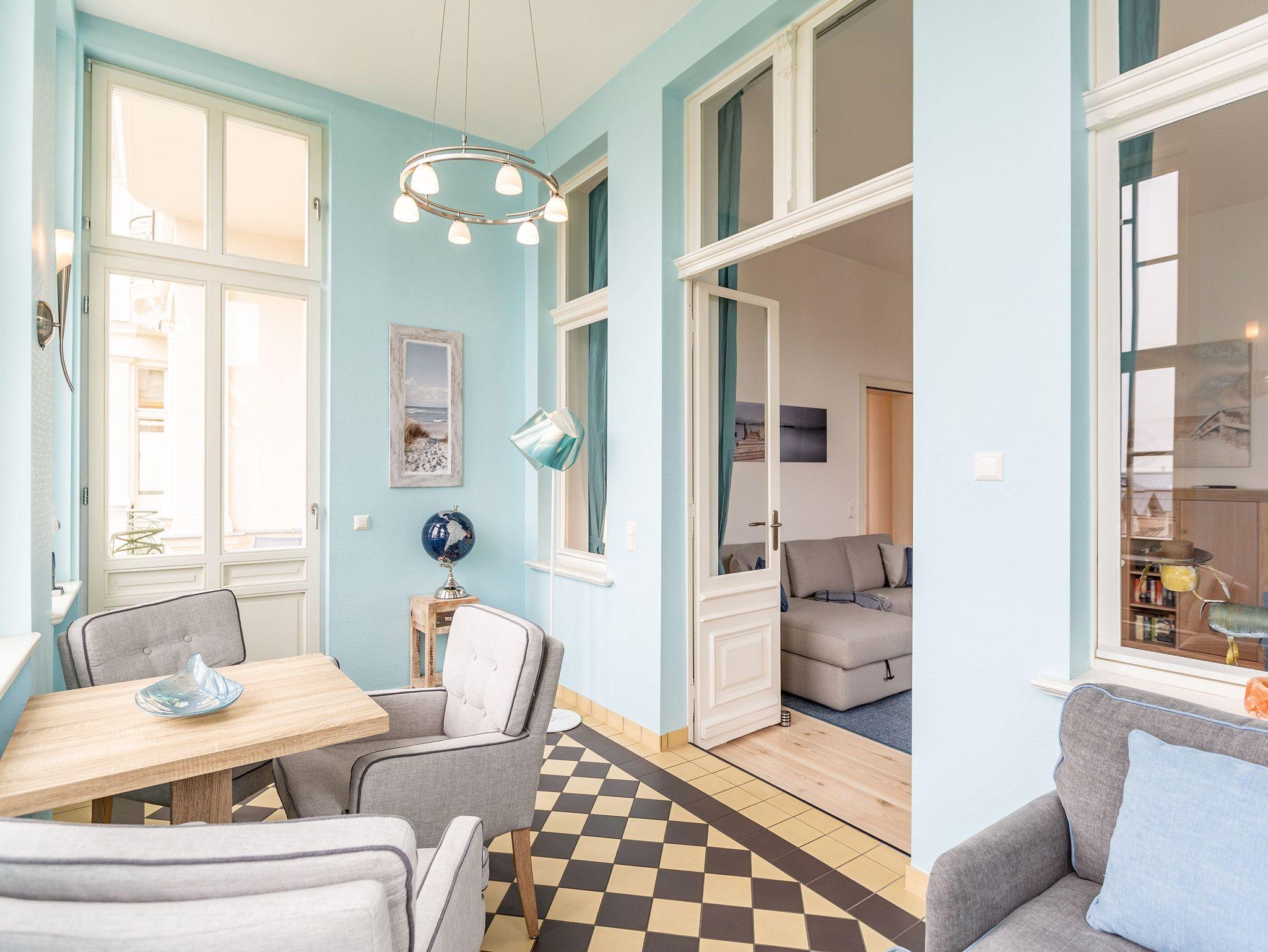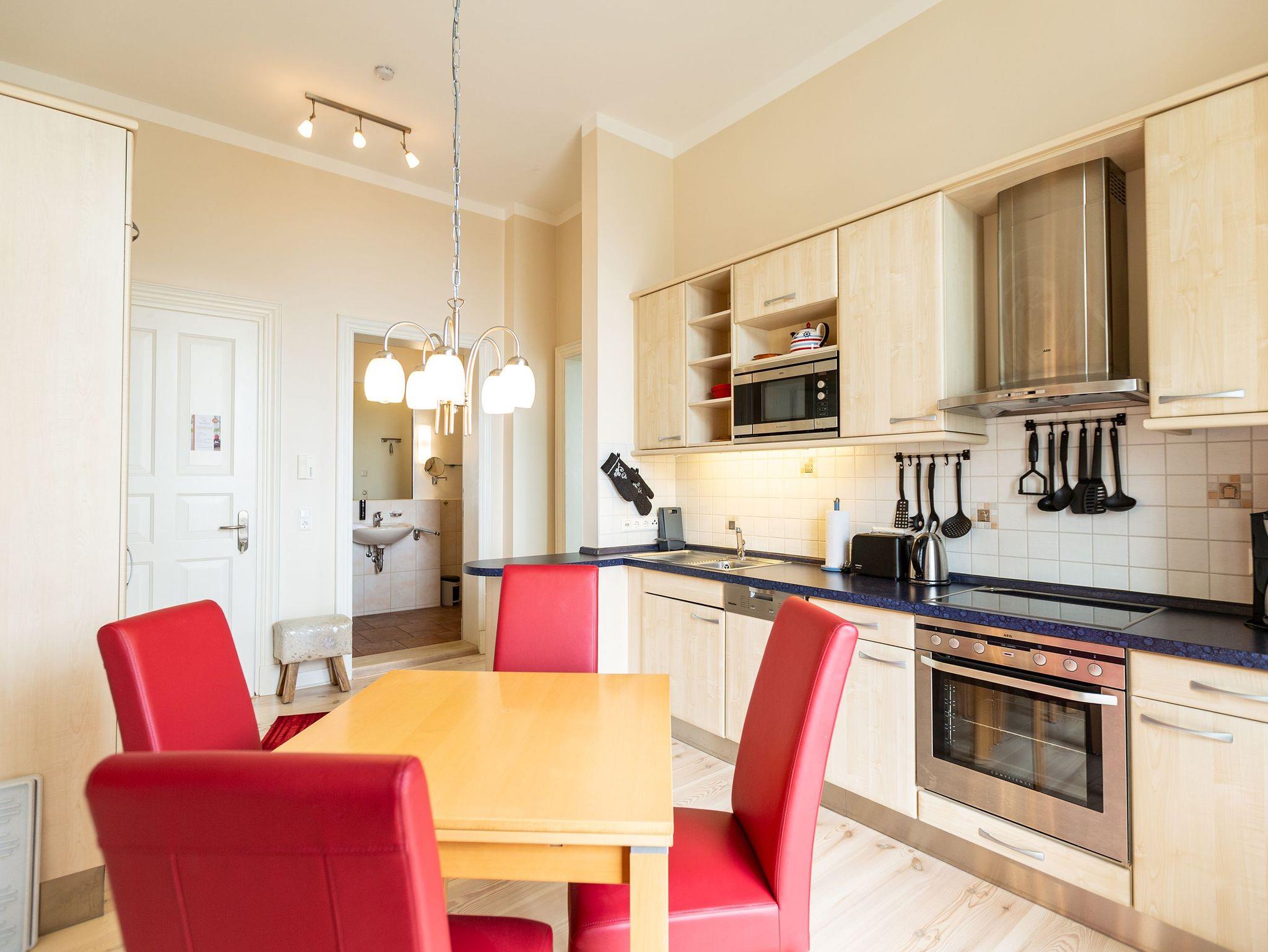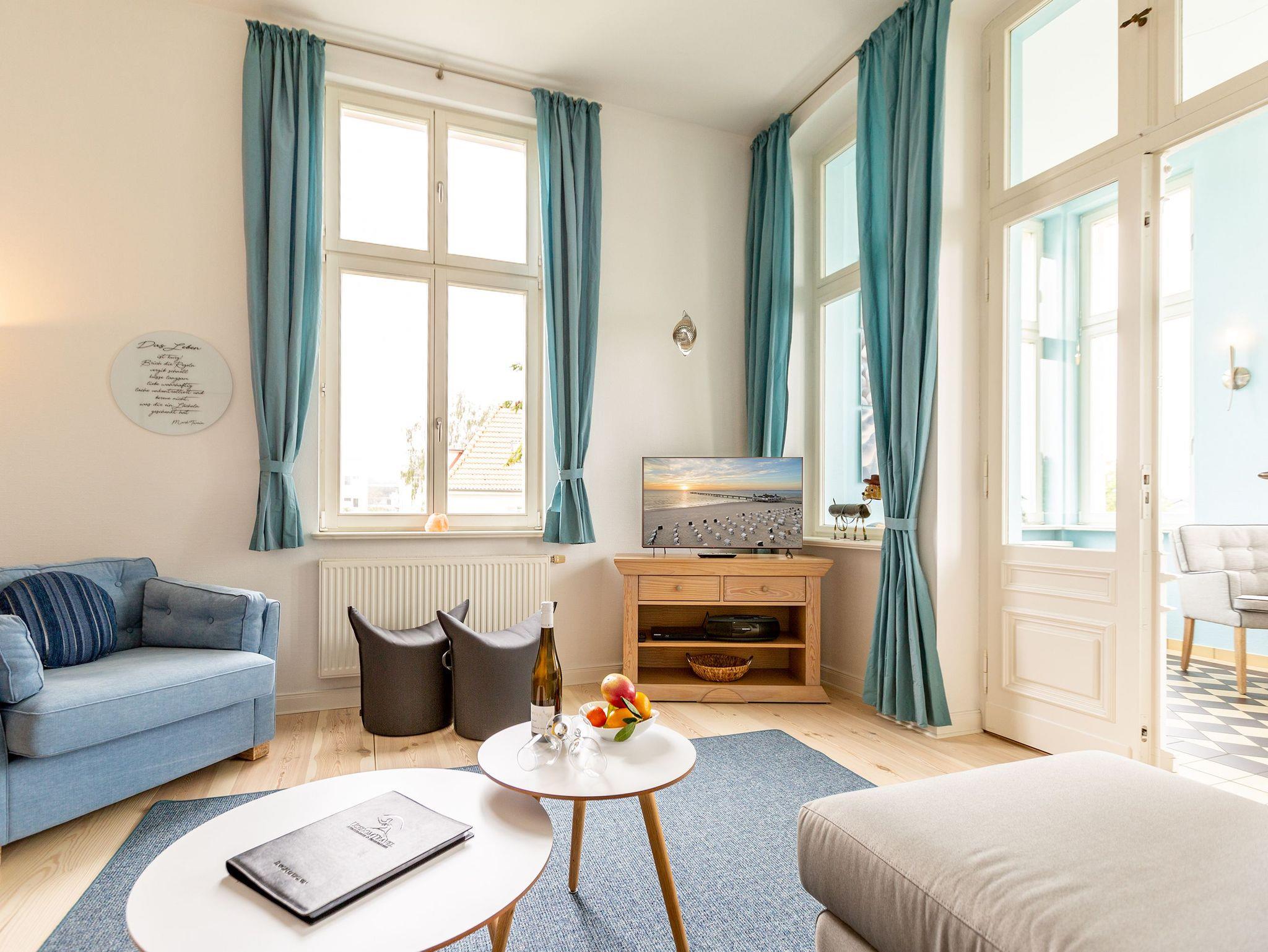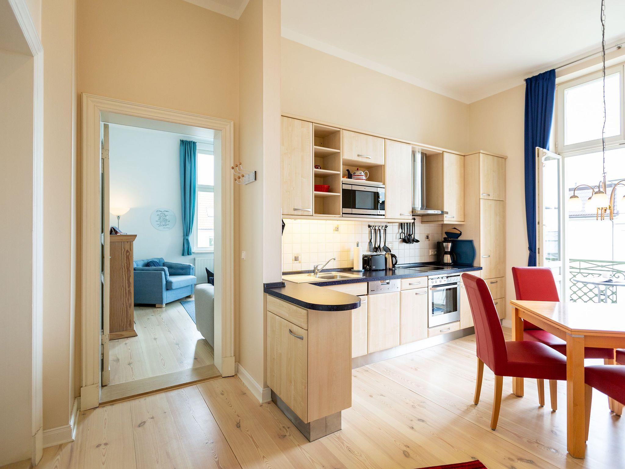 Ihre großzügige Ferienwohnung im 1. Obergeschoss der Villa verwöhnt sie mit moderner Möblierung und farblich gekonnt kombinierten Farben und Stoffen angelehnt an die Prinzipien von Feng Shui. Lichte hohe Räume, ein aufwendig sanierter Dielenboden und die geschmackvollen Dekorationen lassen keine Wünsche offen. Eine große Wohnküche, das Wohnzimmer mit bequemer Schlafcouch (1,20 m x 2,00m), die historische Veranda mit originalen Schiebefenstern, ein Schlafzimmer mit Doppelbett (1,80m x 2m) und zwei, zum Meer ausgerichtete Balkone bieten Platz für 3 Personen und 1 Kleinkind (bis 2 Jahre). Für Ihren Komfort sind die Betten bei der Anreise bezogen und Handtücher liegen bereit. Auf Wunsch stellen wir für unsere kleinen Gäste ein Kinderreisebett und einen Kinderhochstuhl ( gegen einen Aufpreis) zur Verfügung. Ein Pkw-Stellplatz steht am Haus unter dem Carport zur Verfügung.