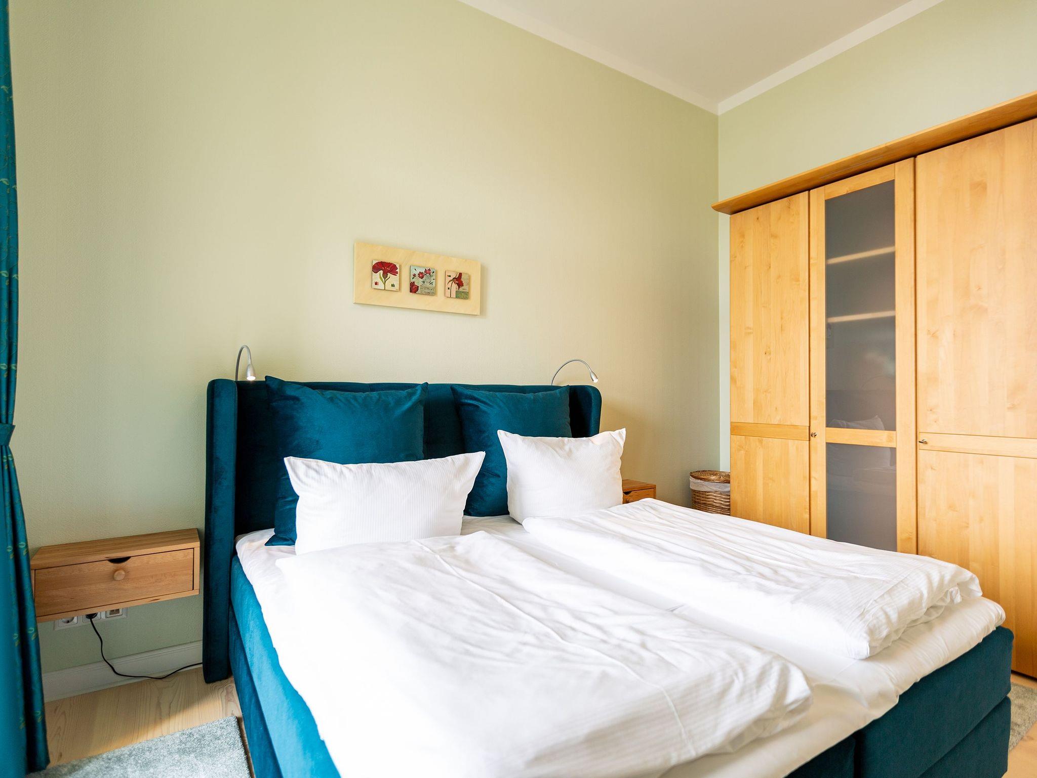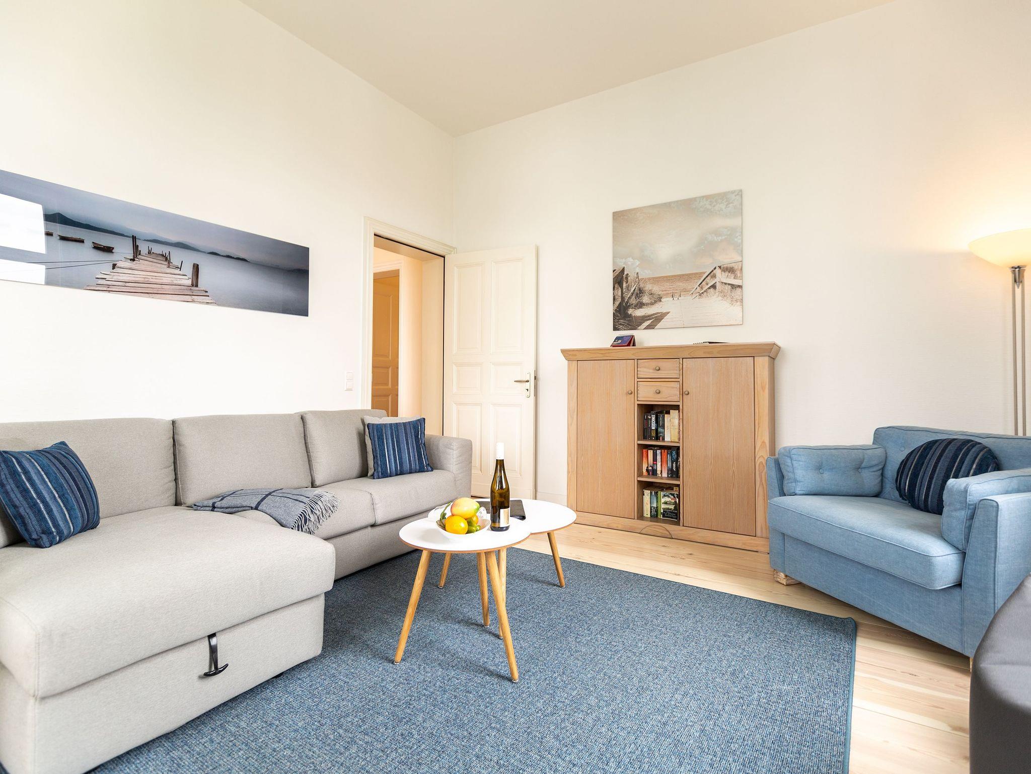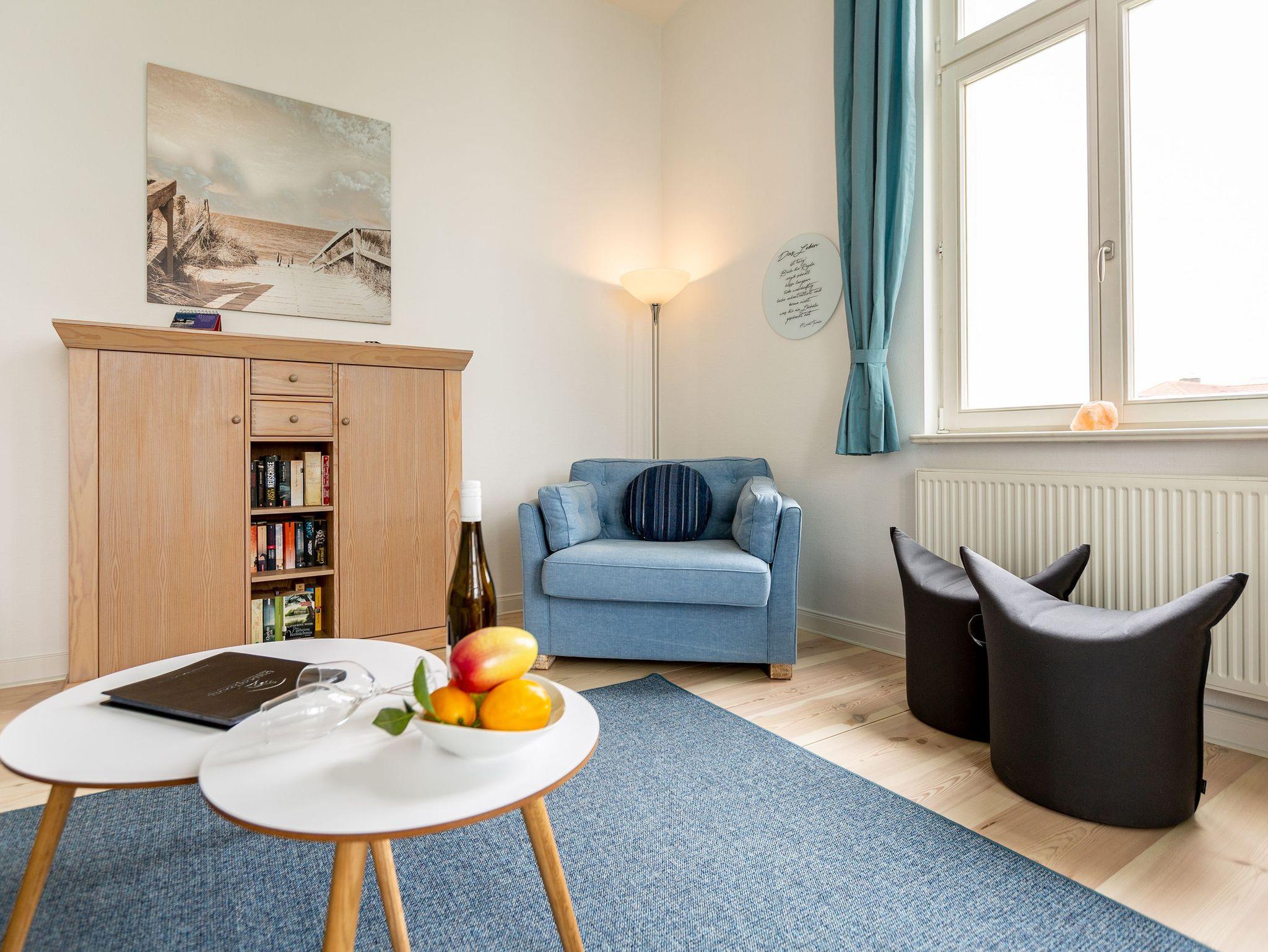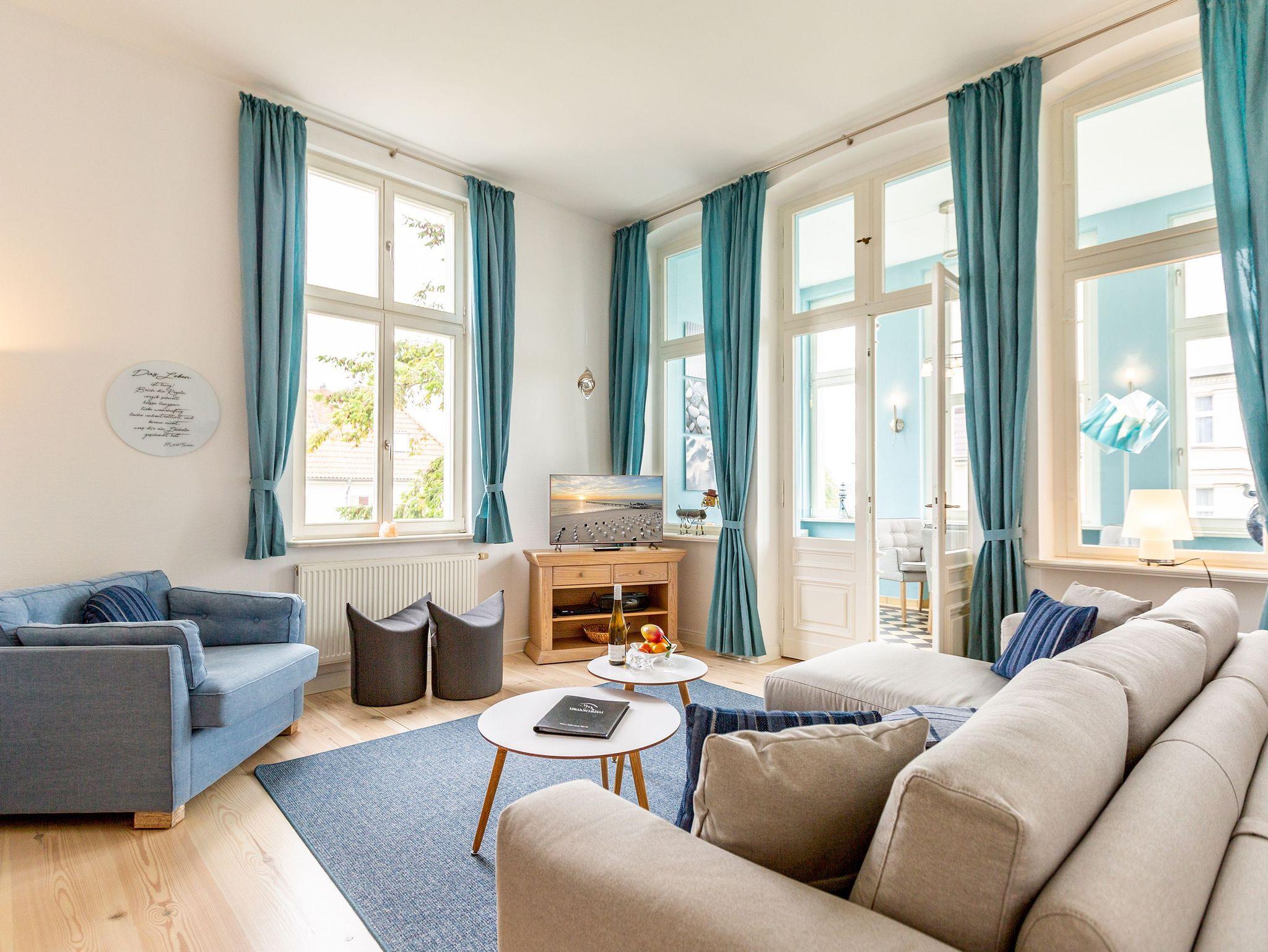Ihre großzügige Ferienwohnung im 1. Obergeschoss der Villa verwöhnt sie mit moderner Möblierung und farblich gekonnt kombinierten Farben und Stoffen angelehnt an die Prinzipien von Feng Shui. Lichte hohe Räume, ein aufwendig sanierter Dielenboden und die geschmackvollen Dekorationen lassen keine Wünsche offen. Eine große Wohnküche, das Wohnzimmer mit bequemer Schlafcouch (1,20 m x 2,00m), die historische Veranda mit originalen Schiebefenstern, ein Schlafzimmer mit Doppelbett (1,80m x 2m) und zwei, zum Meer ausgerichtete Balkone bieten Platz für 3 Personen und 1 Kleinkind (bis 2 Jahre). Für Ihren Komfort sind die Betten bei der Anreise bezogen und Handtücher liegen bereit. Auf Wunsch stellen wir für unsere kleinen Gäste ein Kinderreisebett und einen Kinderhochstuhl ( gegen einen Aufpreis) zur Verfügung. Ein Pkw-Stellplatz steht am Haus unter dem Carport zur Verfügung.