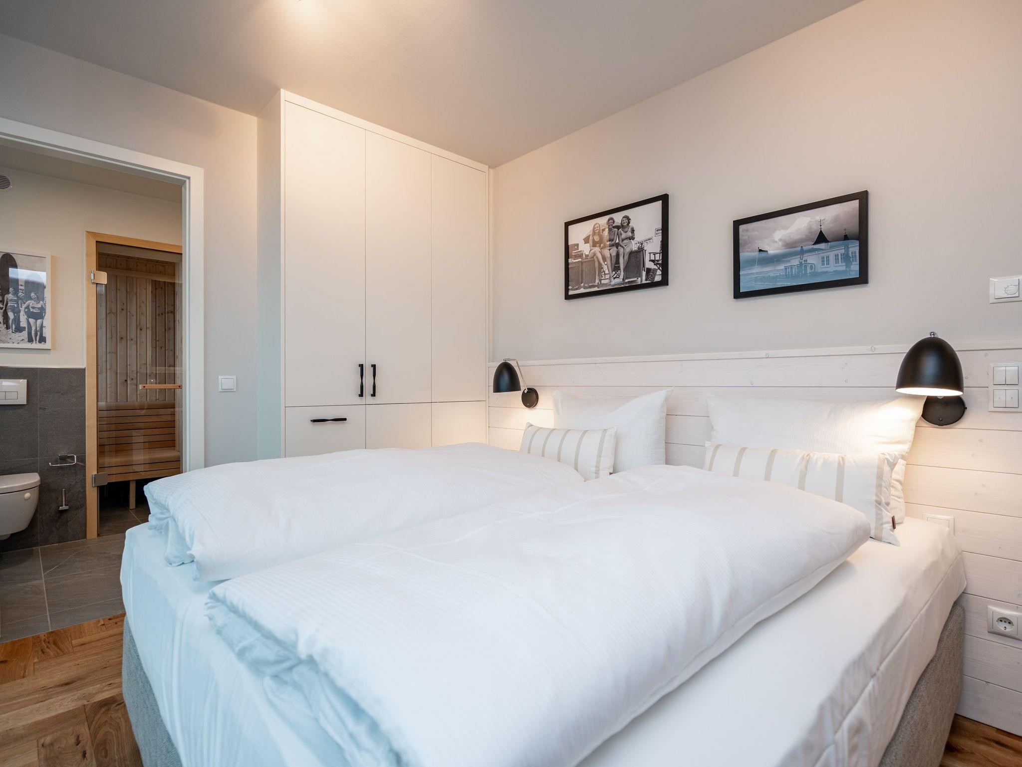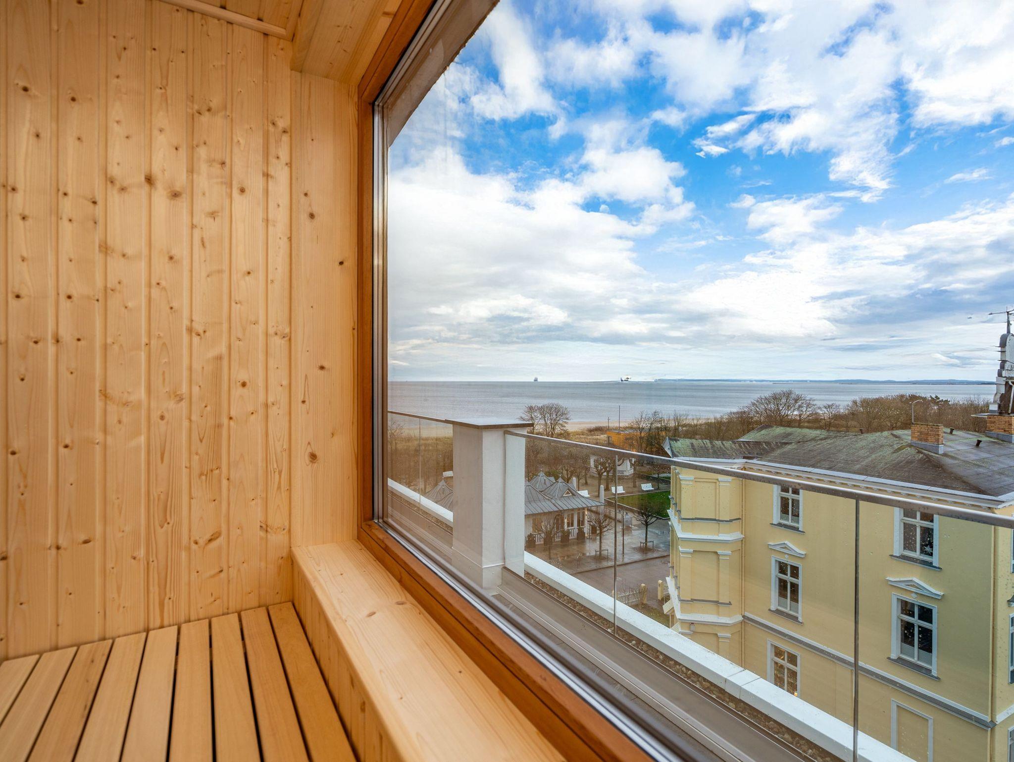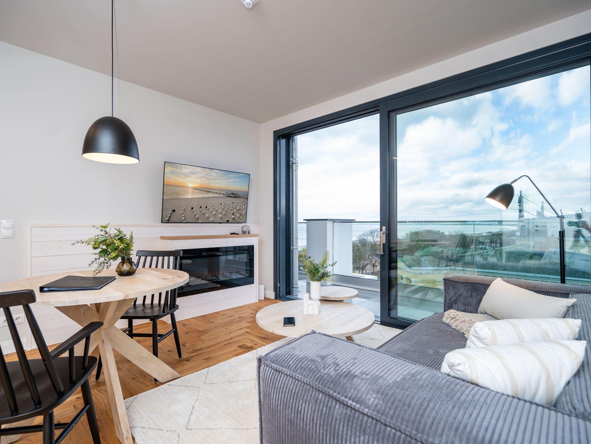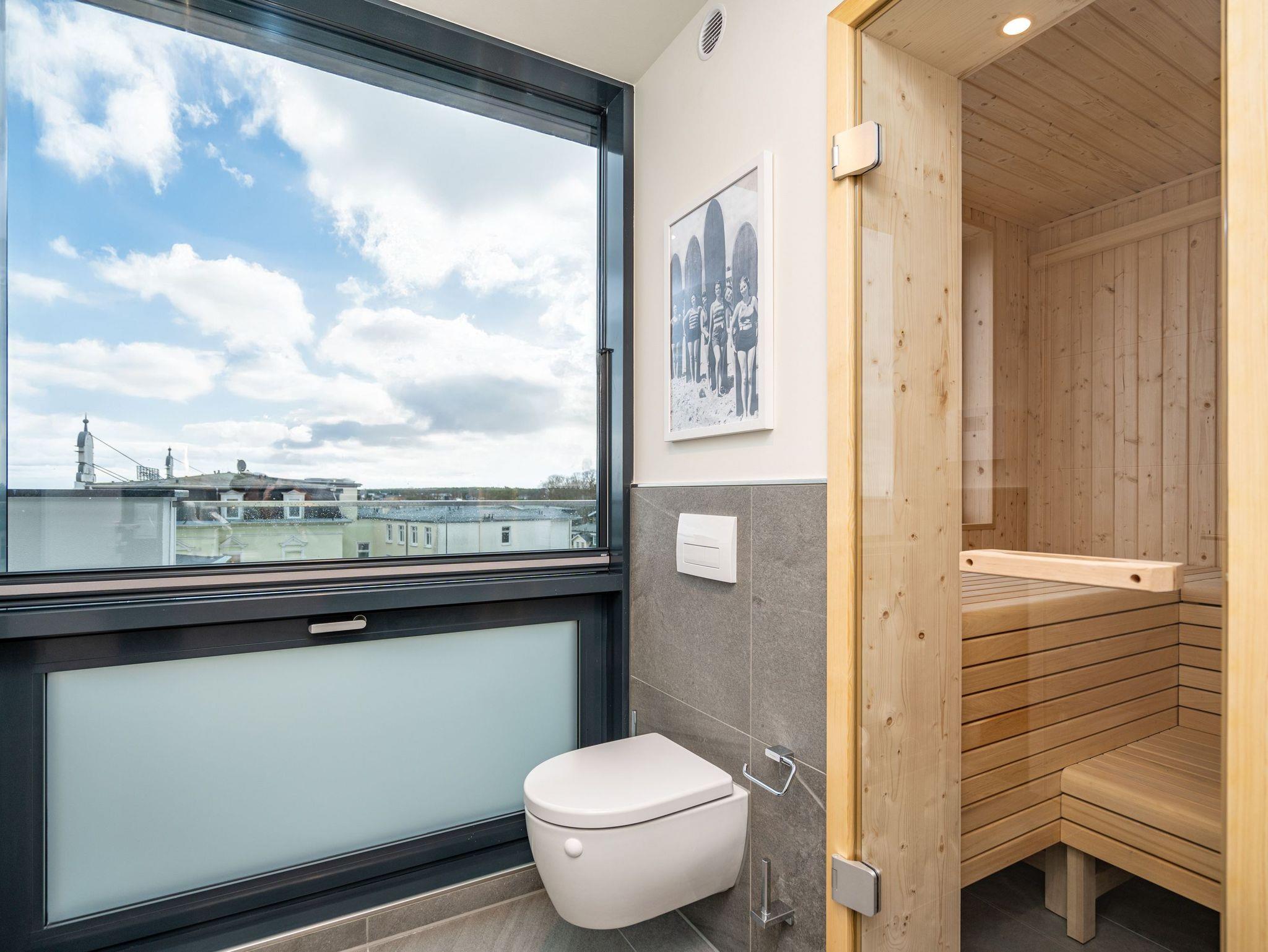 Herzlich willkommen im exklusiven Penthouse-Appartement 4.3 ? Ihrem stilvollen Rückzugsort im Penthouse von Haus A in der 4. Etage mit unvergleichlichem Meerblick. Auf großzügigen 61 m² erwartet zwei Personen ein harmonischer Mix aus modernem Komfort, eleganter Ausstattung und maritimer Wohlfühlatmosphäre. Der lichtdurchflutete Wohnbereich begeistert mit edlem Echtholzparkett, einer gemütlichen Couch, einem stimmungsvollen Elektrokamin und einem beeindruckenden 55-Zoll-Flat-TV. Direkt daneben lädt der Essplatz für zwei Personen dazu ein, köstliche Mahlzeiten in entspannter Atmosphäre zu genießen ? ob beim romantischen Abendessen oder beim gemütlichen Frühstück. Die angrenzende, voll ausgestattete Küchenzeile erfüllt mit einem Kombibackofen mit Mikrowellenfunktion, einem 3-Platten-Induktionskochfeld, einer Spülmaschine und einem Kühlschrank mit Gefrierfach höchste Ansprüche. Das separate Schlafzimmer lässt mit einem komfortablen Boxspringbett (1,80 m x 2,00 m), einem geräumigen Kleiderschrank und einem 43-Zoll-Flat-TV keine Wünsche offen. Ein besonderes Highlight ist die großzügige Dachterrasse, die Sie sowohl vom Wohn- als auch vom Schlafbereich betreten können ? perfekt für entspannte Stunden an der frischen Luft. Das Badezimmer ist Ihre ganz persönliche Wellnessoase: eine großzügige Dusche und eine finnische Sauna mit atemberaubendem Meerblick laden zum Entspannen ein. Ein eleganter Waschtisch, eine Toilette sowie ein separates Gäste-WC ergänzen das moderne Raumangebot. Für zusätzlichen Komfort stehen Ihnen kostenfreies WLAN und ein eigener PKW-Stellplatz in der Tiefgarage zur Verfügung. Freuen Sie sich auf unvergessliche Urlaubstage in der Strandterrasse App. 4.3 ? der perfekte Ort, um die Seele baumeln zu lassen und das Beste aus Ihrem Aufenthalt zu machen. Wir heißen Sie herzlich willkommen!