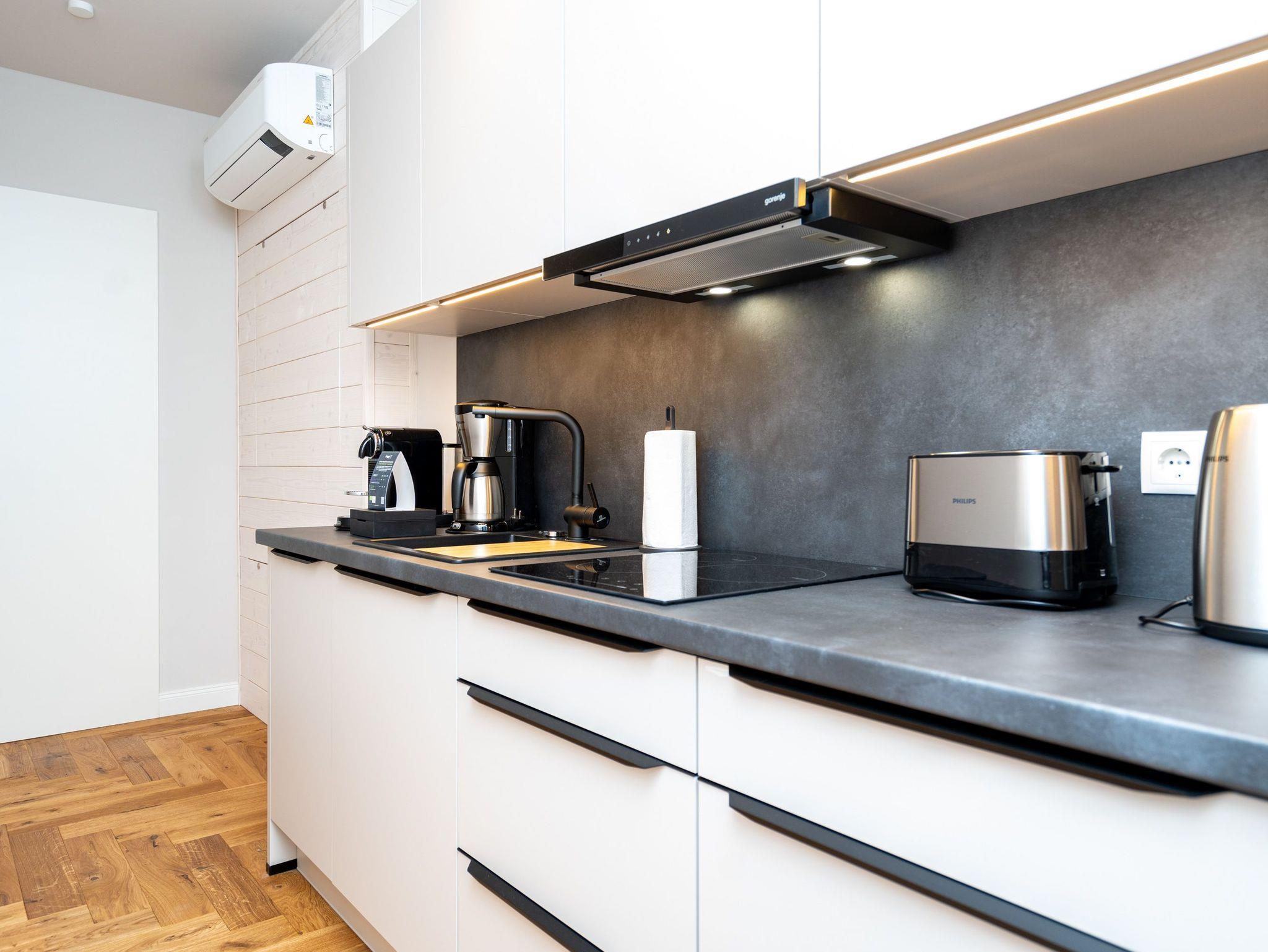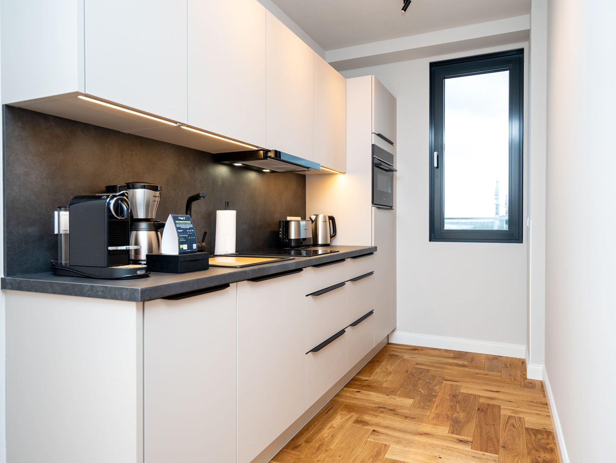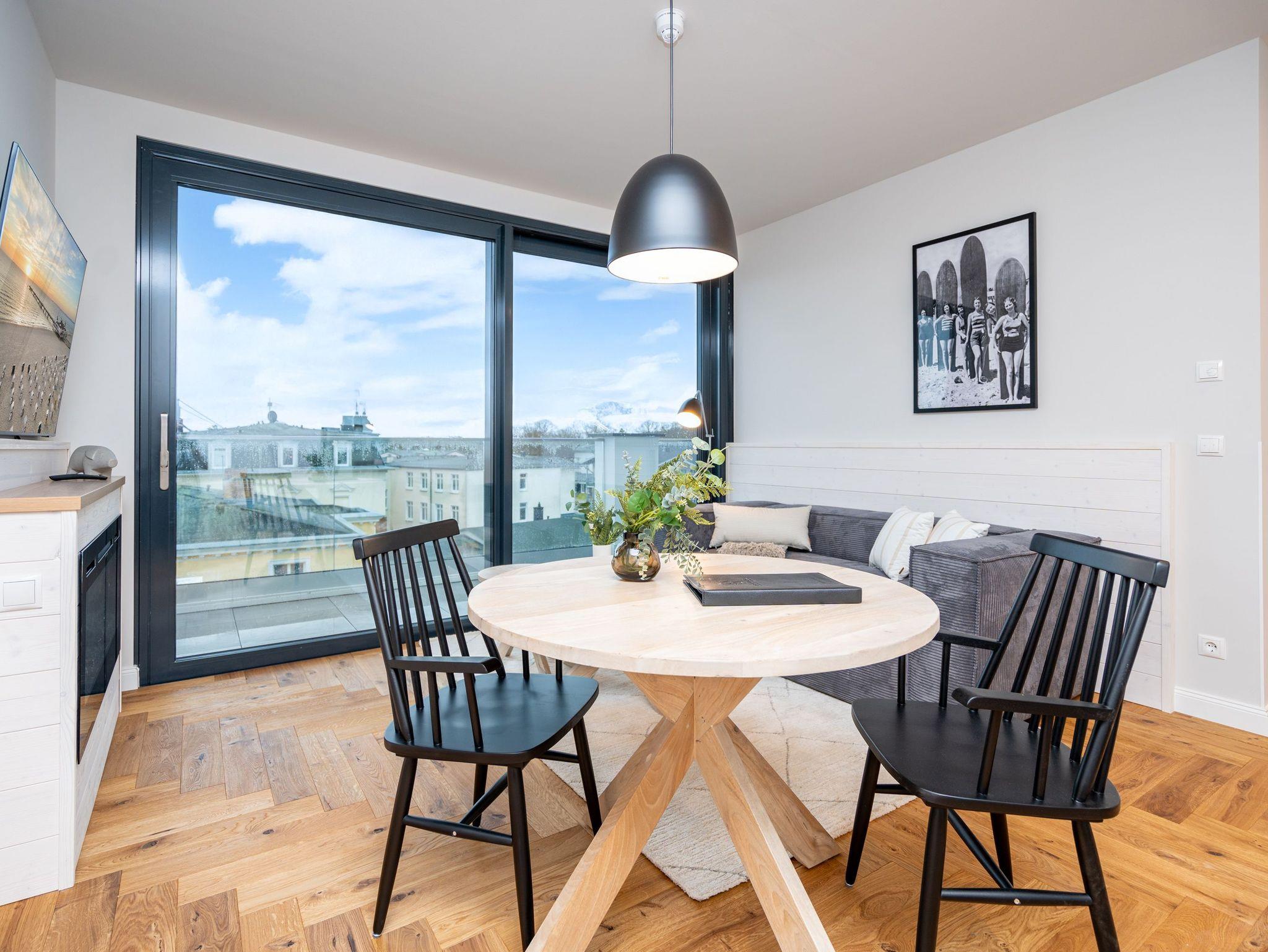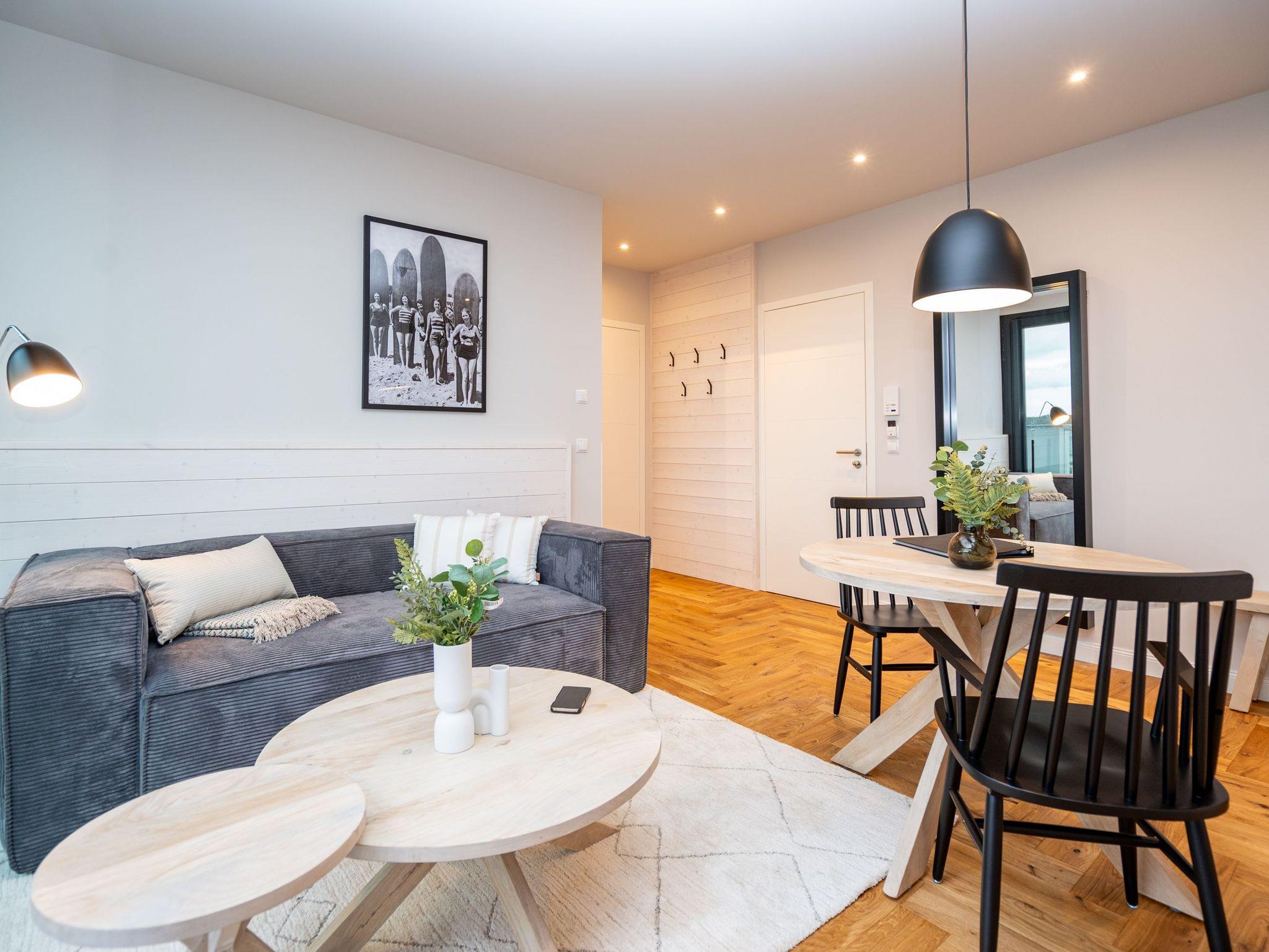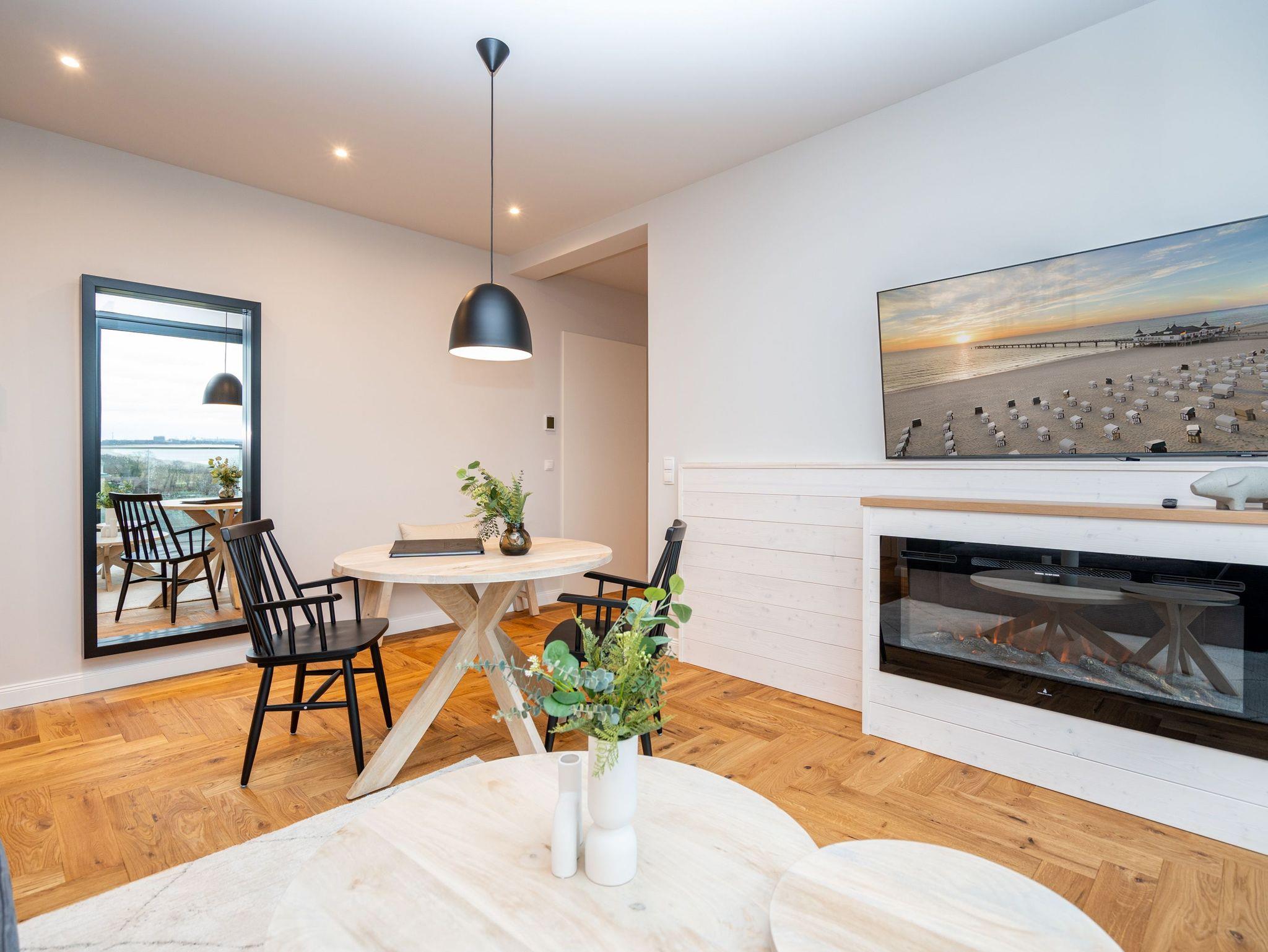 Herzlich willkommen im exklusiven Penthouse-Appartement 4.3 ? Ihrem stilvollen Rückzugsort im Penthouse von Haus A in der 4. Etage mit unvergleichlichem Meerblick. Auf großzügigen 61 m² erwartet zwei Personen ein harmonischer Mix aus modernem Komfort, eleganter Ausstattung und maritimer Wohlfühlatmosphäre. Der lichtdurchflutete Wohnbereich begeistert mit edlem Echtholzparkett, einer gemütlichen Couch, einem stimmungsvollen Elektrokamin und einem beeindruckenden 55-Zoll-Flat-TV. Direkt daneben lädt der Essplatz für zwei Personen dazu ein, köstliche Mahlzeiten in entspannter Atmosphäre zu genießen ? ob beim romantischen Abendessen oder beim gemütlichen Frühstück. Die angrenzende, voll ausgestattete Küchenzeile erfüllt mit einem Kombibackofen mit Mikrowellenfunktion, einem 3-Platten-Induktionskochfeld, einer Spülmaschine und einem Kühlschrank mit Gefrierfach höchste Ansprüche. Das separate Schlafzimmer lässt mit einem komfortablen Boxspringbett (1,80 m x 2,00 m), einem geräumigen Kleiderschrank und einem 43-Zoll-Flat-TV keine Wünsche offen. Ein besonderes Highlight ist die großzügige Dachterrasse, die Sie sowohl vom Wohn- als auch vom Schlafbereich betreten können ? perfekt für entspannte Stunden an der frischen Luft. Das Badezimmer ist Ihre ganz persönliche Wellnessoase: eine großzügige Dusche und eine finnische Sauna mit atemberaubendem Meerblick laden zum Entspannen ein. Ein eleganter Waschtisch, eine Toilette sowie ein separates Gäste-WC ergänzen das moderne Raumangebot. Für zusätzlichen Komfort stehen Ihnen kostenfreies WLAN und ein eigener PKW-Stellplatz in der Tiefgarage zur Verfügung. Freuen Sie sich auf unvergessliche Urlaubstage in der Strandterrasse App. 4.3 ? der perfekte Ort, um die Seele baumeln zu lassen und das Beste aus Ihrem Aufenthalt zu machen. Wir heißen Sie herzlich willkommen!
