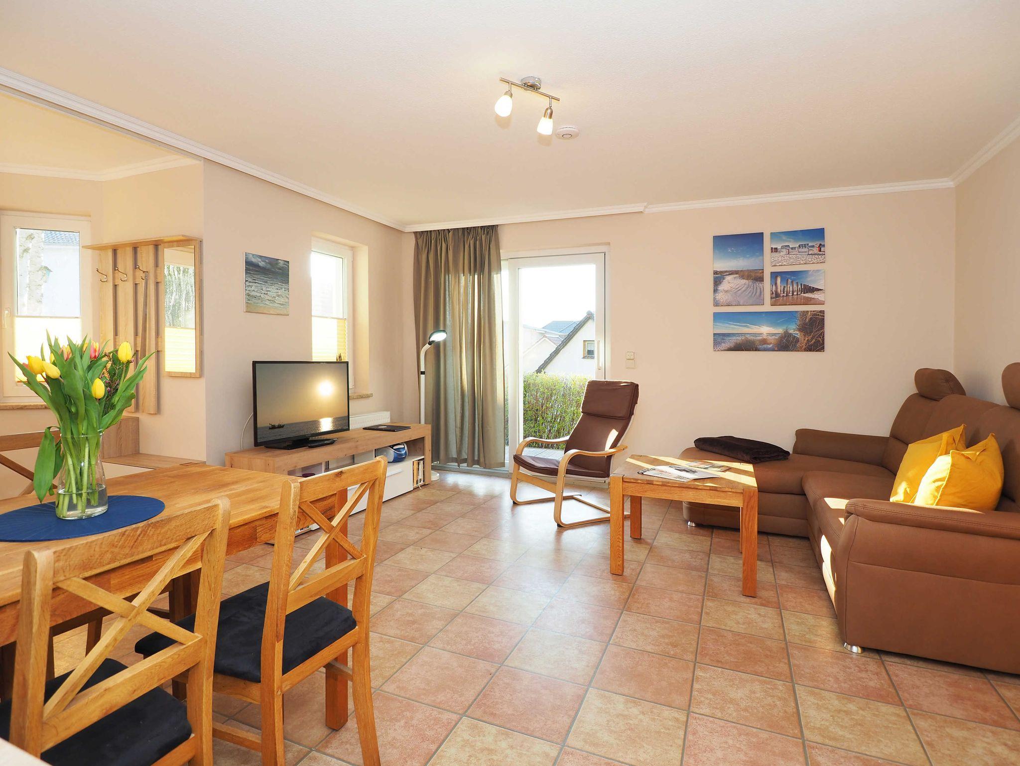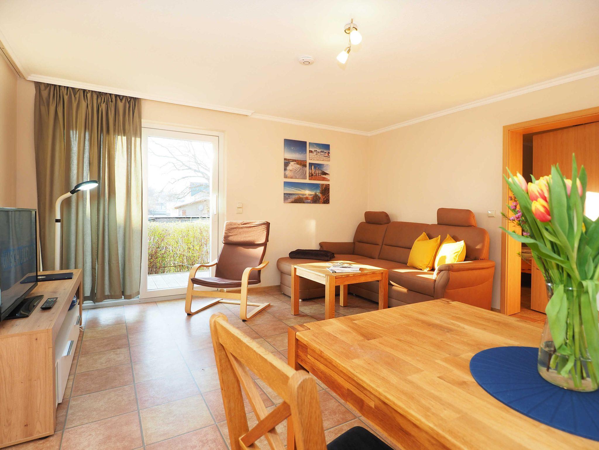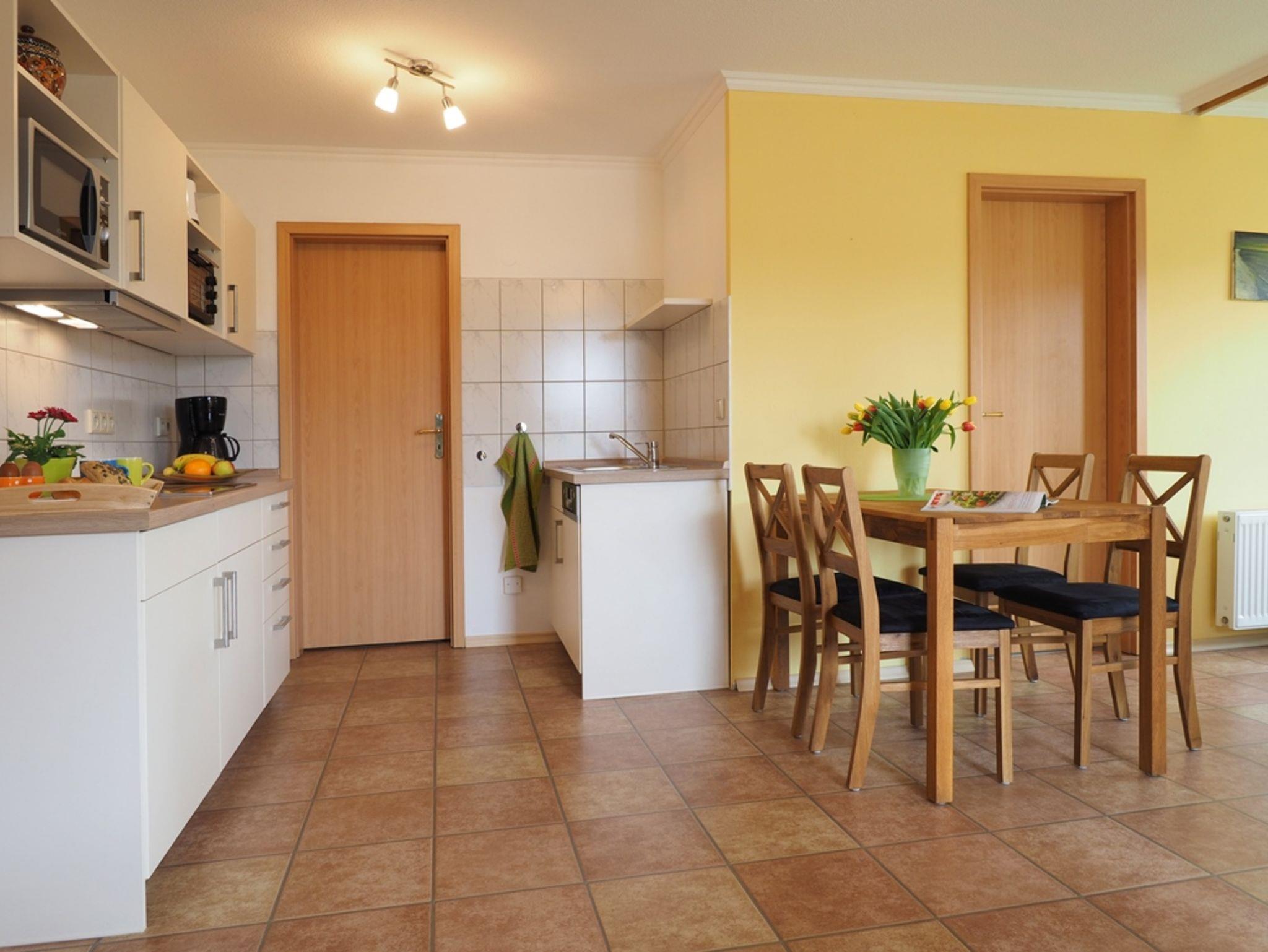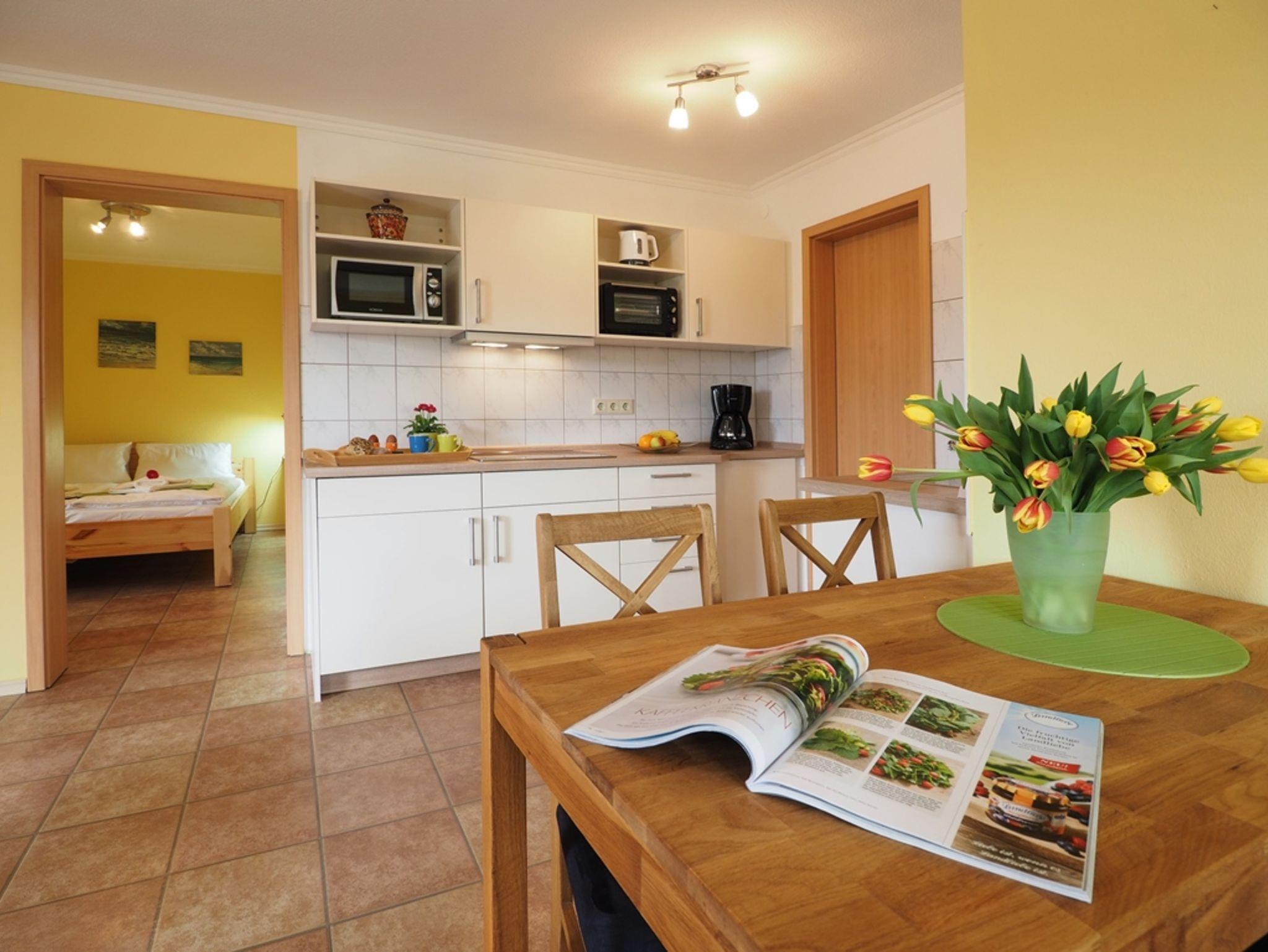 In unserer schönen 2-Raum-Ferienwohnung erwartet Sie auf 40 m² Wohnfläche eine liebevolle Einrichtung. Im Wohnraum mit großem TV und bequeme Sitzecke befindet sich eine moderne Einbauküche mit Geschirrspüler, Mikrowelle, Toaster, Kaffeemaschine, Wasserkocher und kleinem Backofen. Hier können Sie gemeinsam kochen, die Urlaubsausflüge bei einem gemeinsamen Frühstück planen oder den Tag bei einem Gläschen Wein ausklingen lassen.